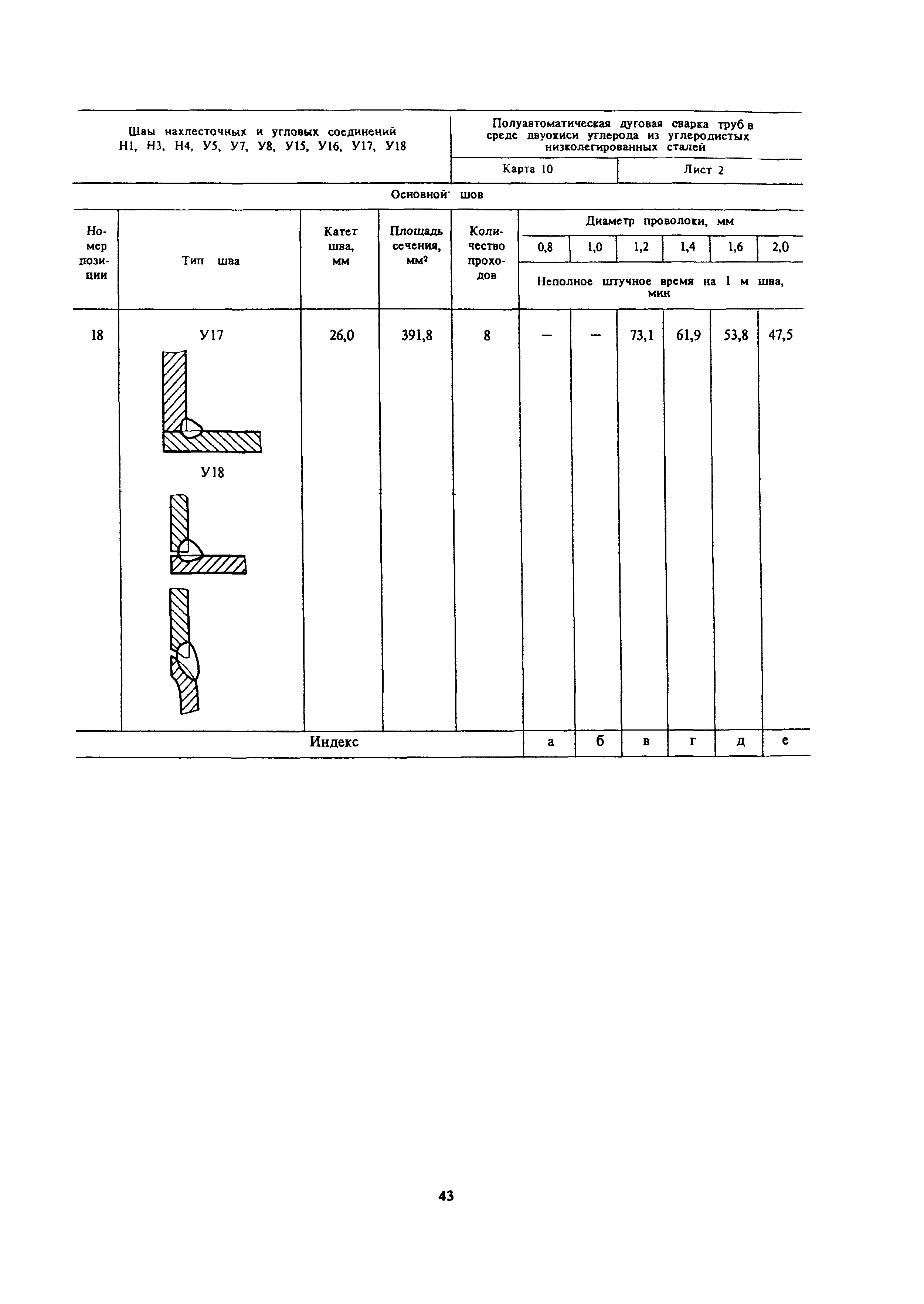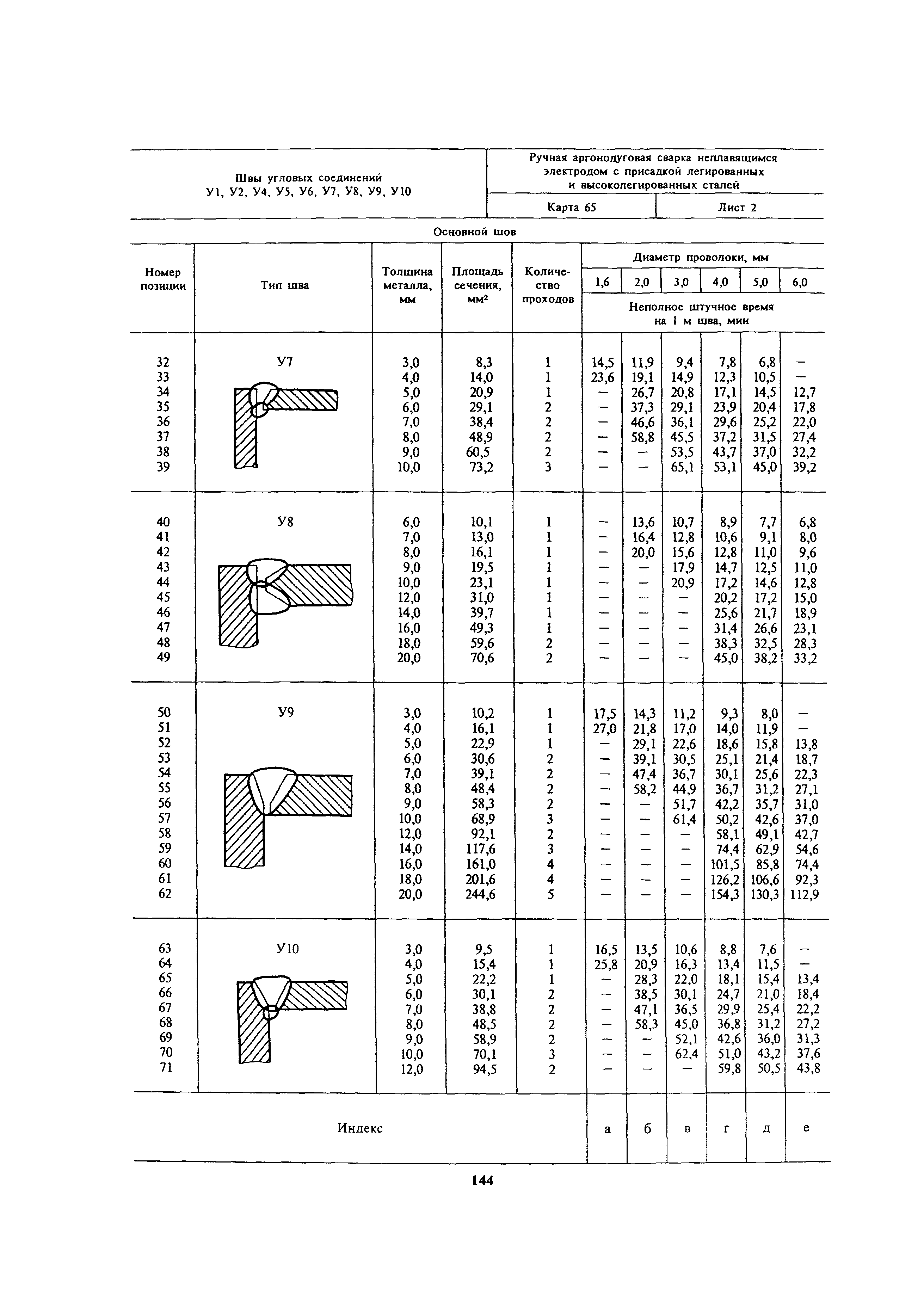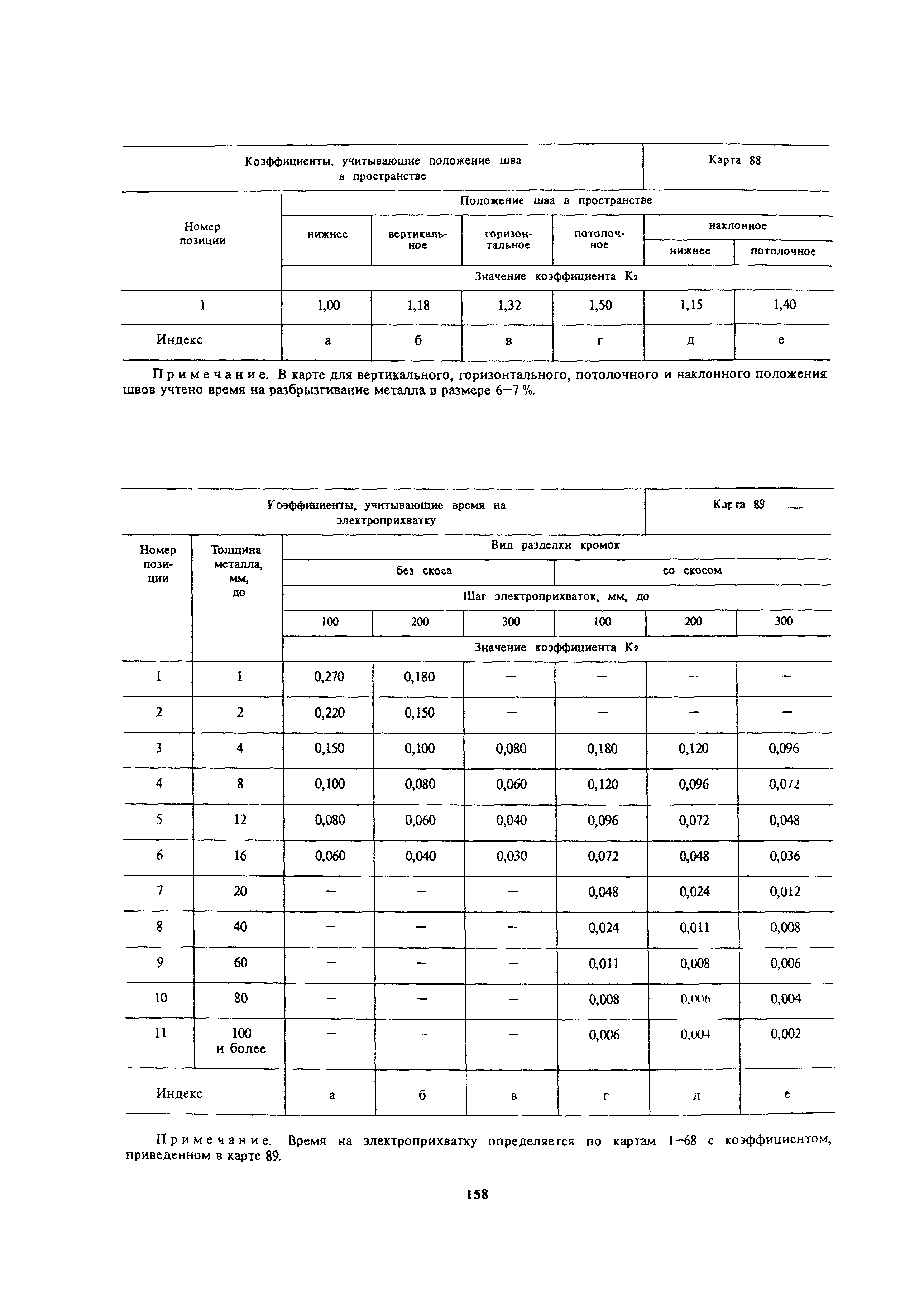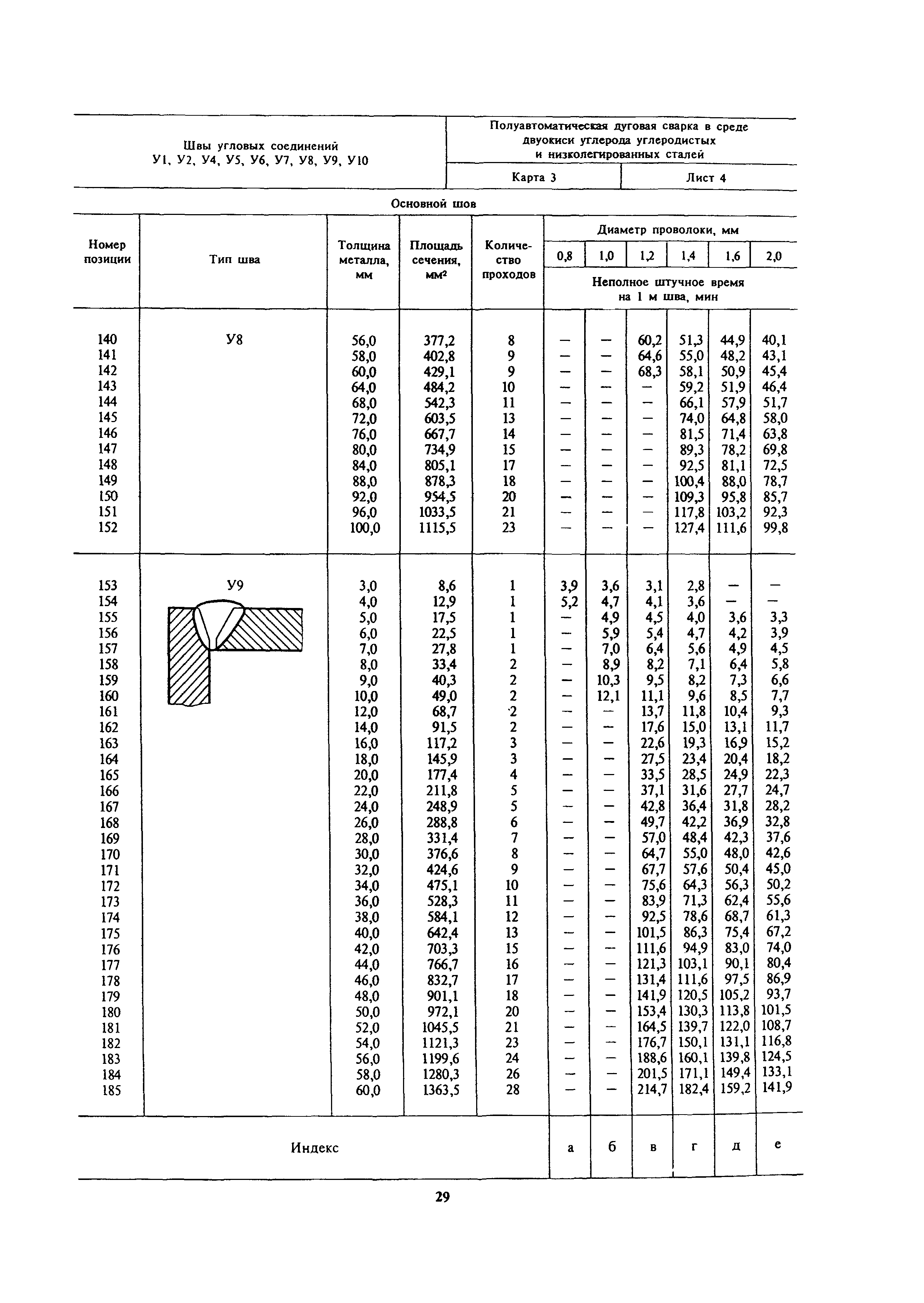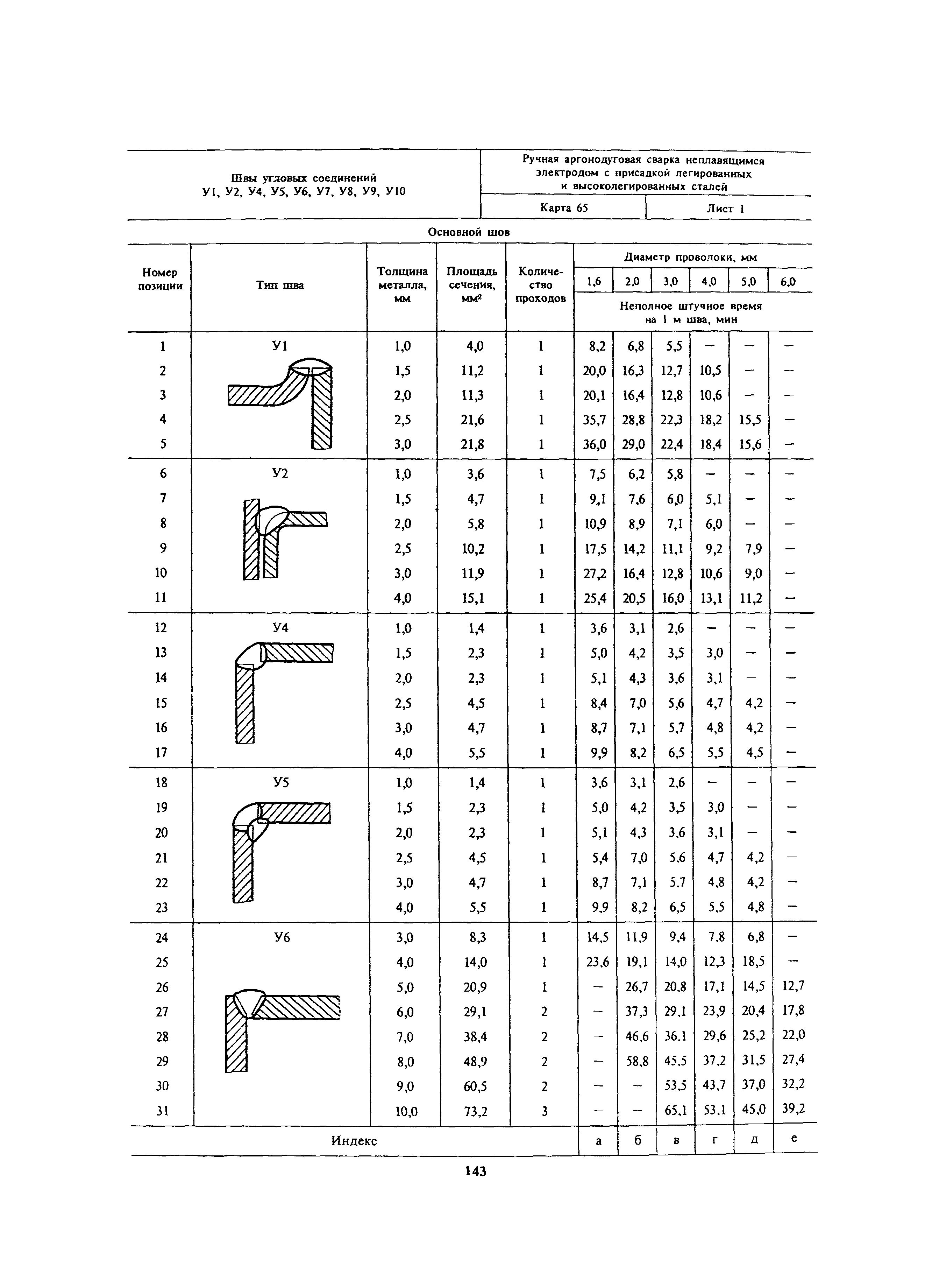 | Оглавление: | 1. Общая часть 2. Наименование оборудования и технология работы 3. Организация труда 4. Нормативная часть 4.1. Неполное штучное время на дуговую сварку 4.2. Вспомогательное время, связанное со сваркой шва. Автоматическая, полуавтоматическая и ручная дуговая сварка 4.3. Вспомогательное время, связанное с изделием и типом оборудования. Автоматическая, полуавтоматическая и ручная дуговая сварка 4.4. Поправочные коэффициенты к картам неполного штучного времени на измененные условия работы. Автоматическая, полуавтоматическая и ручная дуговая сварка 4.5. Приложения Приложения 1. Площадь поперечного сечения шва для расчета количества проходов сварки Приложение 2. Значение коэффициента наплавки металла Приложение 3. Значение коэффициента плотности наплавленного металла Приложение 4. Расчетное значение силы тока в зависимости от толщины металла и диаметра сварочной проволоки для полуавтоматической сварки стыков труб из меди и медно-никелевых сплавов Приложение 6. Расчетное значение скорости сварки в зависимости от диаметра сварочной проволоки и катета шва для автоматической дуговой сварки алюминия и алюминиевых сплавов плавящимся электродом Приложение 7. Расчетное значение скорости сварки в зависимости от диаметра сварочной проволоки и толщины металла при автоматической сварке Приложение 8. Расчетное значение скорости сварки в зависимости от диаметра присадочной проволоки и катета шва при автоматической аргонодуговой сварке алюминия и алюминиевых сплавов неплавящимся электродом Приложение 9. Расчетное значение скорости сварки в зависимости от диаметра присадочной проволоки и толщины металла при автоматической дуговой сварке алюминиевых сплавов неплавящимся электродом Приложение 10. Расчетное значение силы тока в зависимости от диаметра присадочной проволоки и толщины металла при ручной аргонодуговой сварке алюминия и алюминиевых сплавов неплавящимся электродом Приложение 11. Расчетное значение силы тока в зависимости от диаметра присадочной проволоки и толщины металла при ручной аргонодуговой сварке меди и медно-никелевых сплавов неплавящимся электродом Приложение 12. Расчетное значение силы тока в зависимости от диаметра присадочной проволоки и толщины металла при ручной аргонодуговой сварке легированных и высоколегированных сталей плавящимся электродом Приложение 13. Значение длины кольцевого стыка в зависимости от его диаметра Приложение 14. Наименование, индекс, вид шва и формулы расчета площади поперечного сечения швов |