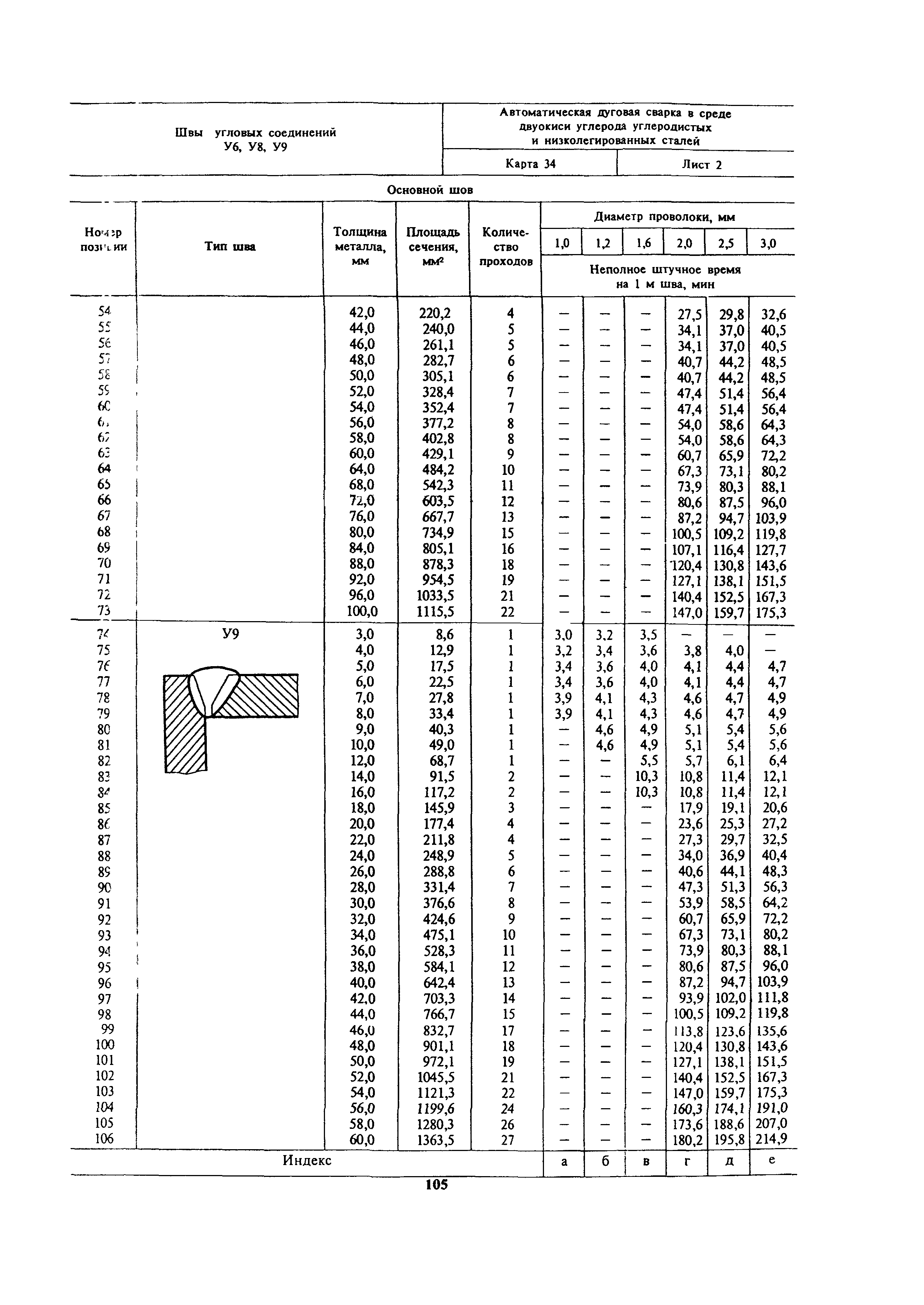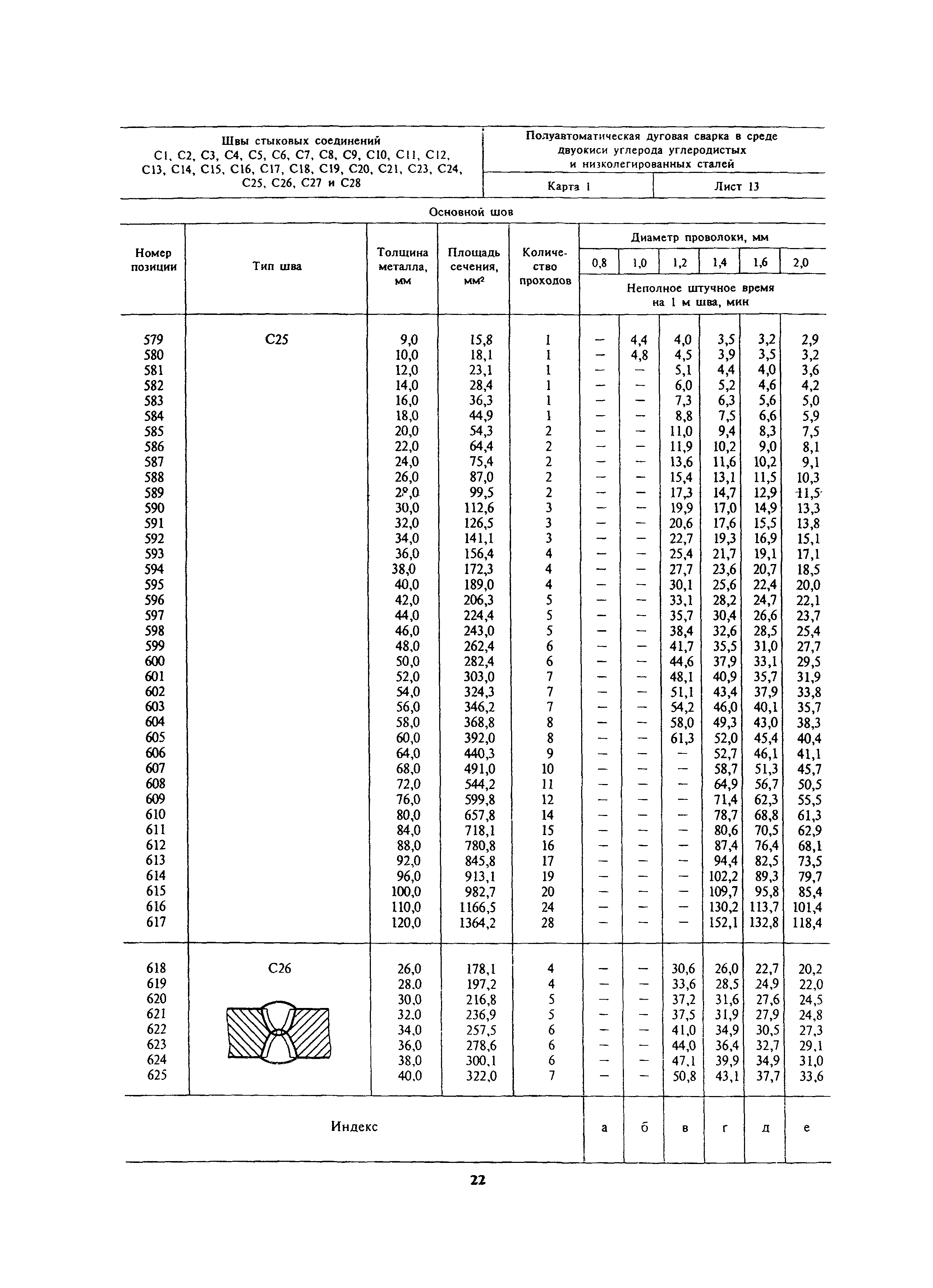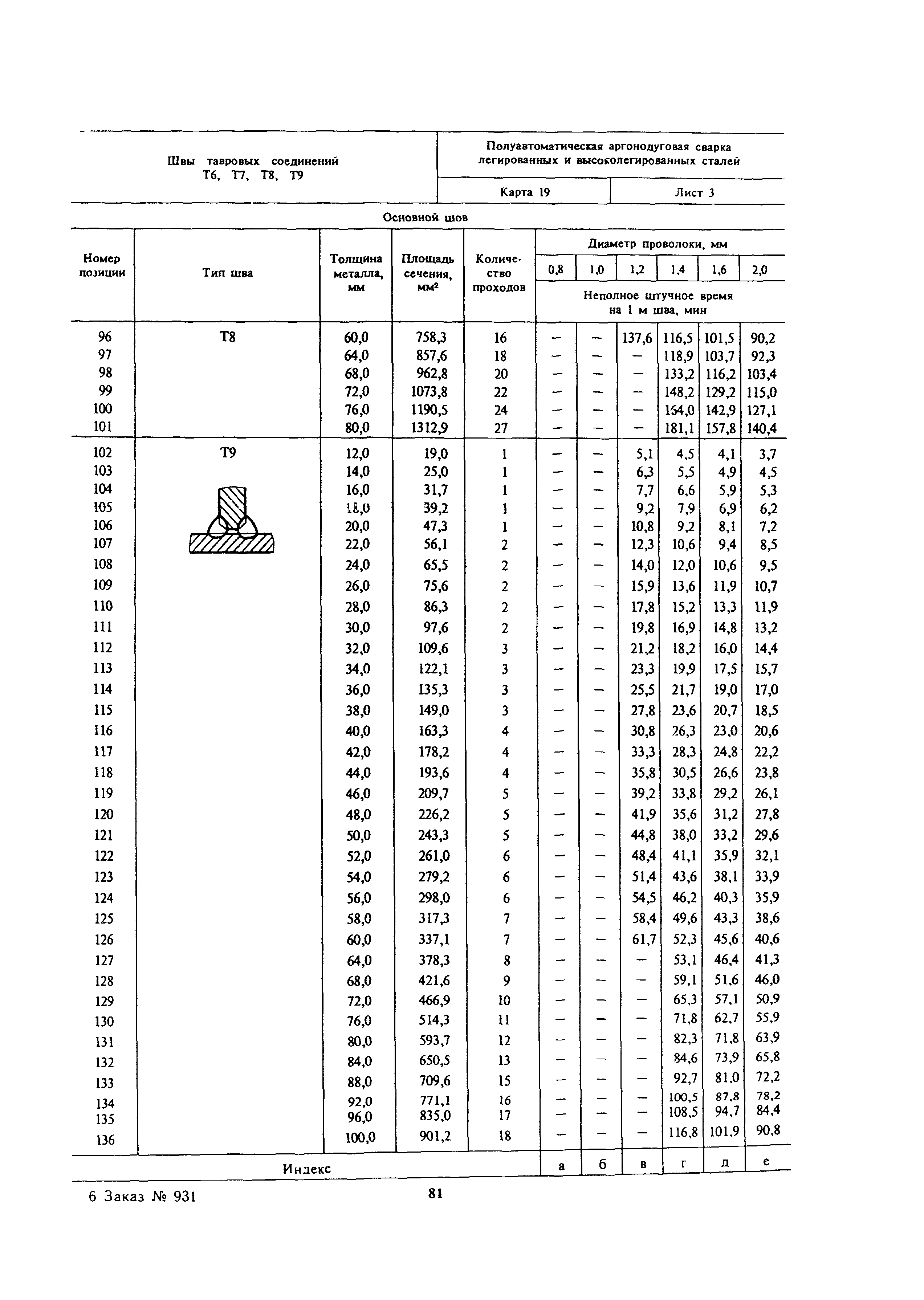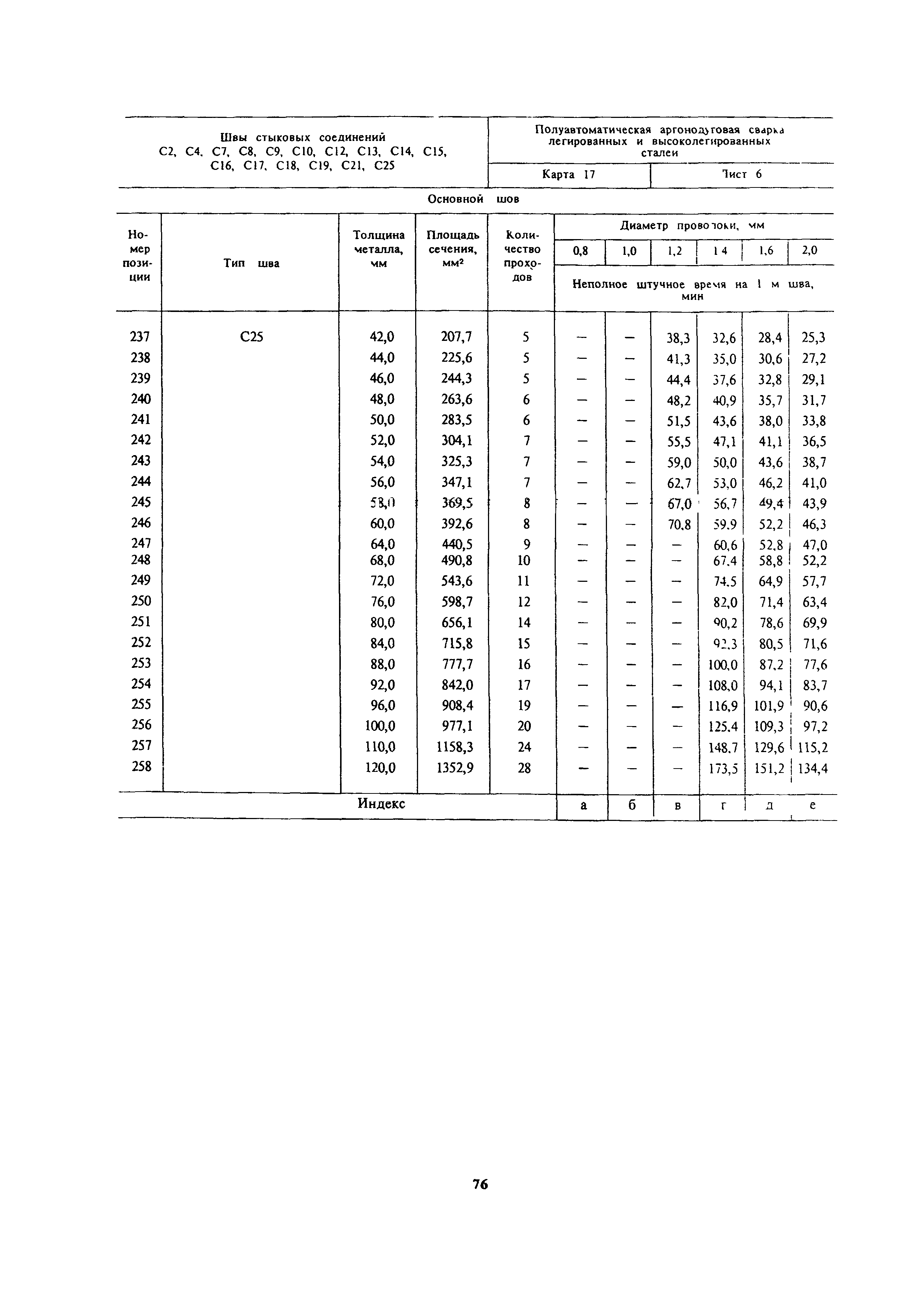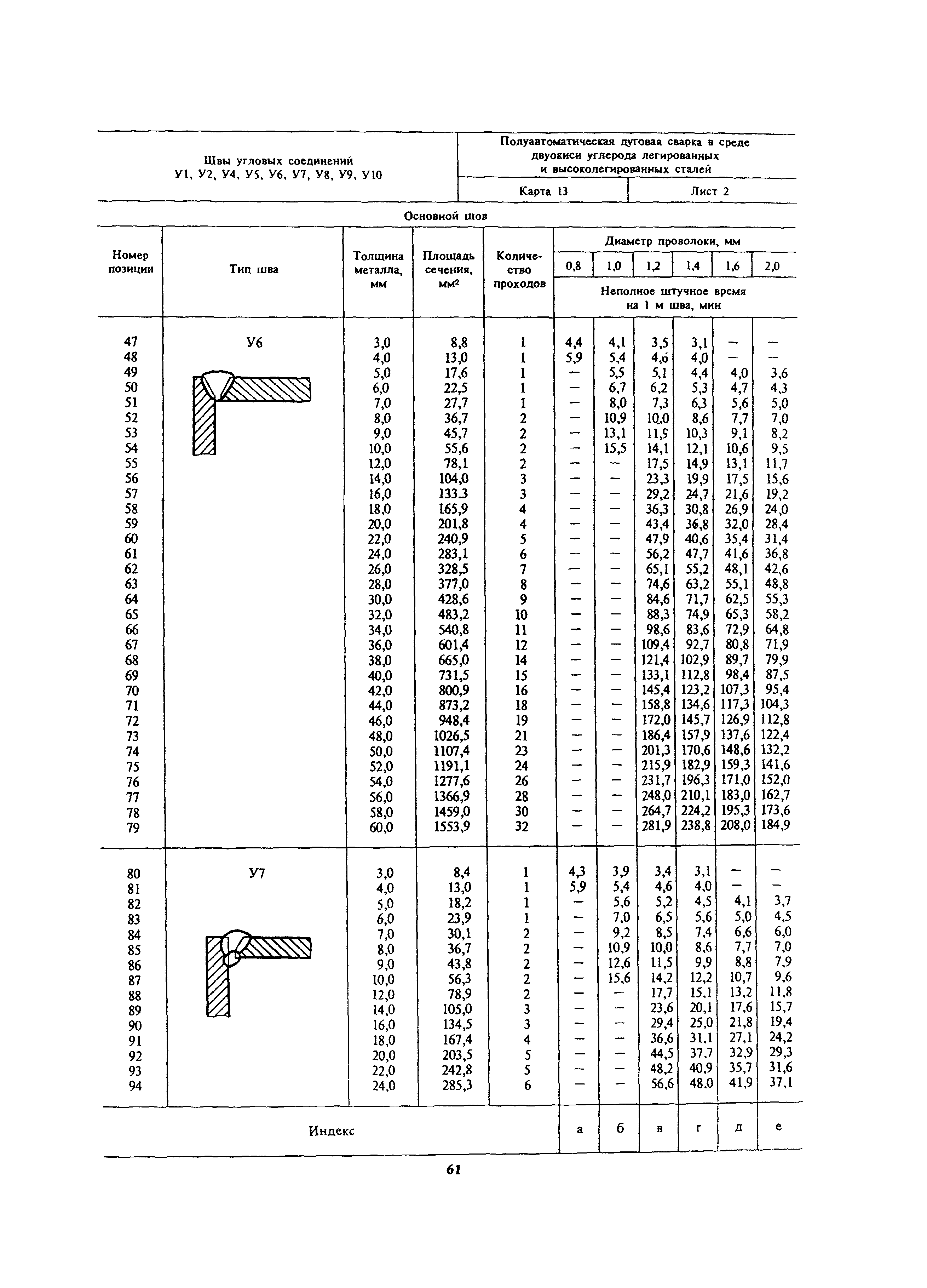 | Оглавление: | 1. Общая часть 2. Наименование оборудования и технология работы 3. Организация труда 4. Нормативная часть 4.1. Неполное штучное время на дуговую сварку 4.2. Вспомогательное время, связанное со сваркой шва. Автоматическая, полуавтоматическая и ручная дуговая сварка 4.3. Вспомогательное время, связанное с изделием и типом оборудования. Автоматическая, полуавтоматическая и ручная дуговая сварка 4.4. Поправочные коэффициенты к картам неполного штучного времени на измененные условия работы. Автоматическая, полуавтоматическая и ручная дуговая сварка 4.5. Приложения Приложения 1. Площадь поперечного сечения шва для расчета количества проходов сварки Приложение 2. Значение коэффициента наплавки металла Приложение 3. Значение коэффициента плотности наплавленного металла Приложение 4. Расчетное значение силы тока в зависимости от толщины металла и диаметра сварочной проволоки для полуавтоматической сварки стыков труб из меди и медно-никелевых сплавов Приложение 6. Расчетное значение скорости сварки в зависимости от диаметра сварочной проволоки и катета шва для автоматической дуговой сварки алюминия и алюминиевых сплавов плавящимся электродом Приложение 7. Расчетное значение скорости сварки в зависимости от диаметра сварочной проволоки и толщины металла при автоматической сварке Приложение 8. Расчетное значение скорости сварки в зависимости от диаметра присадочной проволоки и катета шва при автоматической аргонодуговой сварке алюминия и алюминиевых сплавов неплавящимся электродом Приложение 9. Расчетное значение скорости сварки в зависимости от диаметра присадочной проволоки и толщины металла при автоматической дуговой сварке алюминиевых сплавов неплавящимся электродом Приложение 10. Расчетное значение силы тока в зависимости от диаметра присадочной проволоки и толщины металла при ручной аргонодуговой сварке алюминия и алюминиевых сплавов неплавящимся электродом Приложение 11. Расчетное значение силы тока в зависимости от диаметра присадочной проволоки и толщины металла при ручной аргонодуговой сварке меди и медно-никелевых сплавов неплавящимся электродом Приложение 12. Расчетное значение силы тока в зависимости от диаметра присадочной проволоки и толщины металла при ручной аргонодуговой сварке легированных и высоколегированных сталей плавящимся электродом Приложение 13. Значение длины кольцевого стыка в зависимости от его диаметра Приложение 14. Наименование, индекс, вид шва и формулы расчета площади поперечного сечения швов |