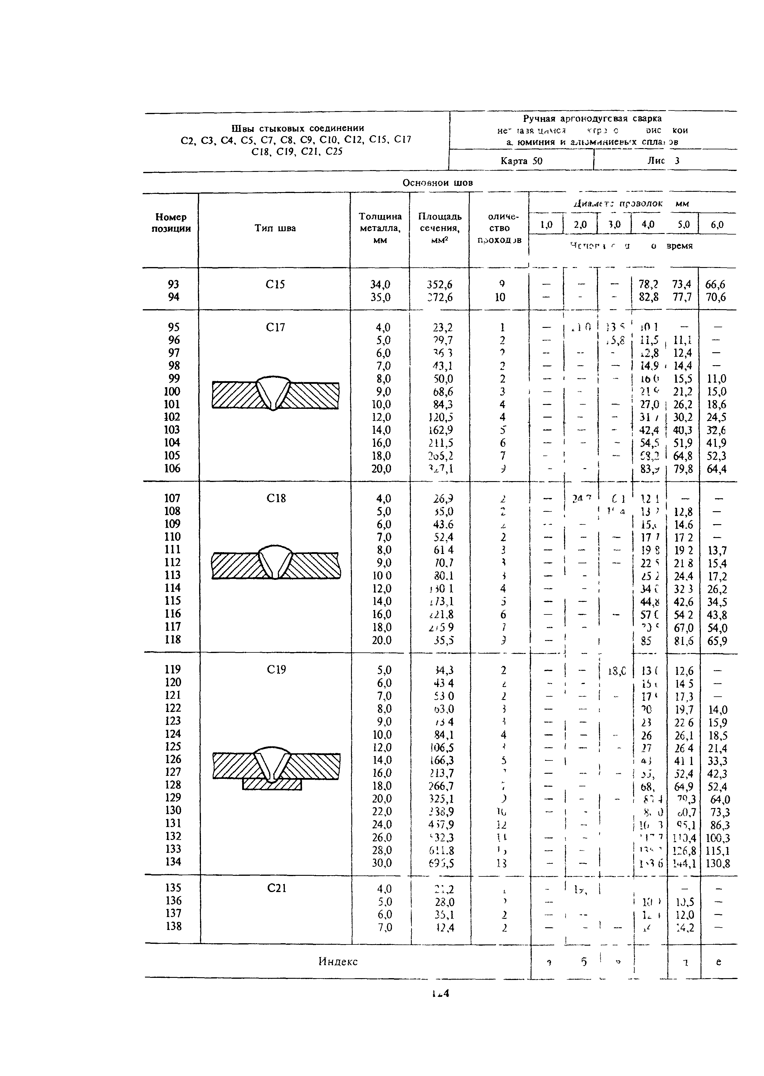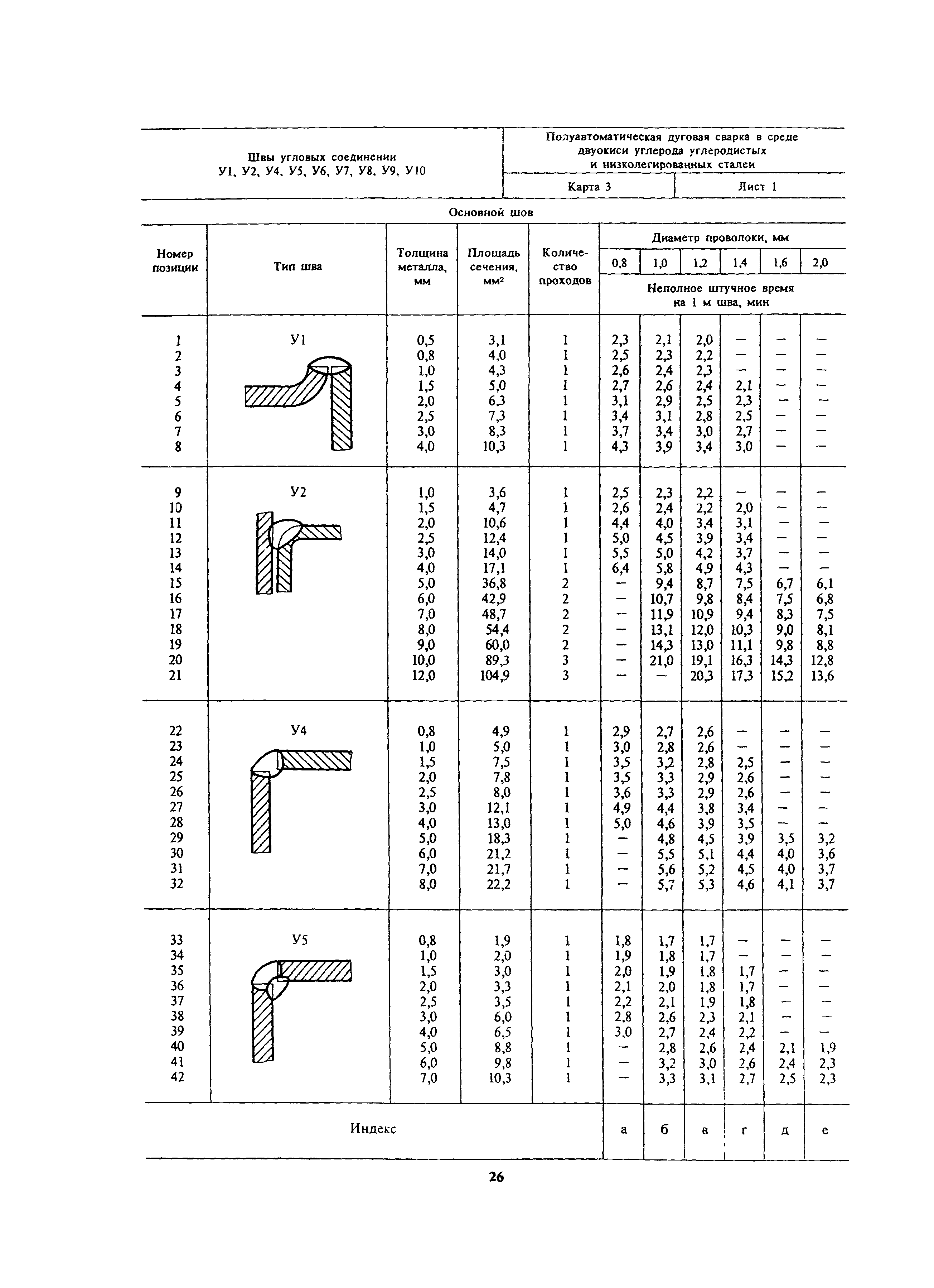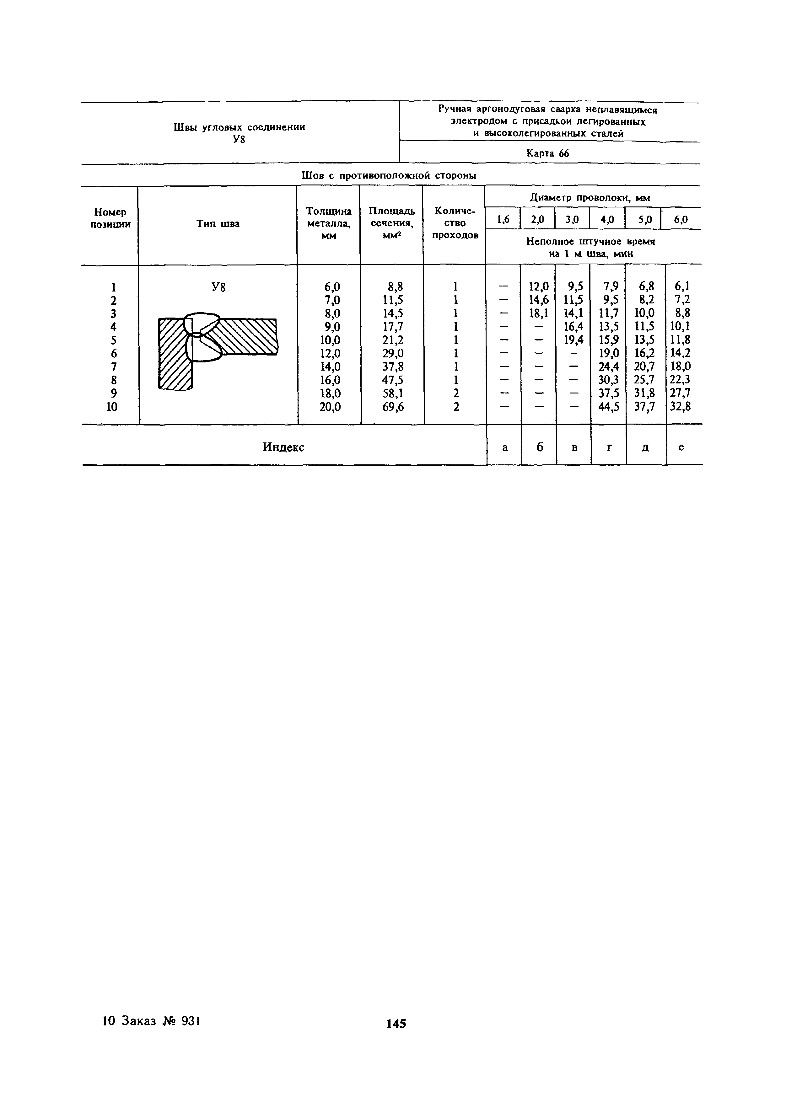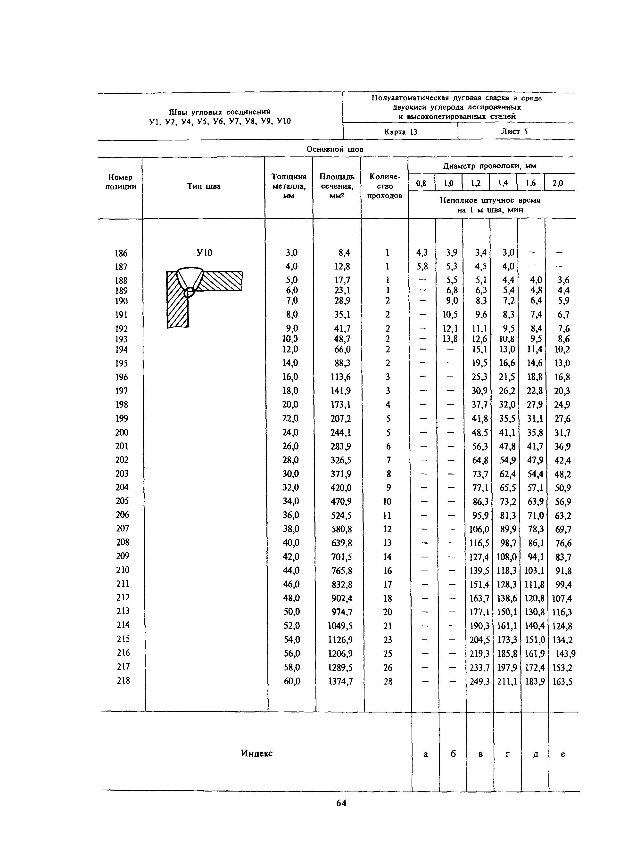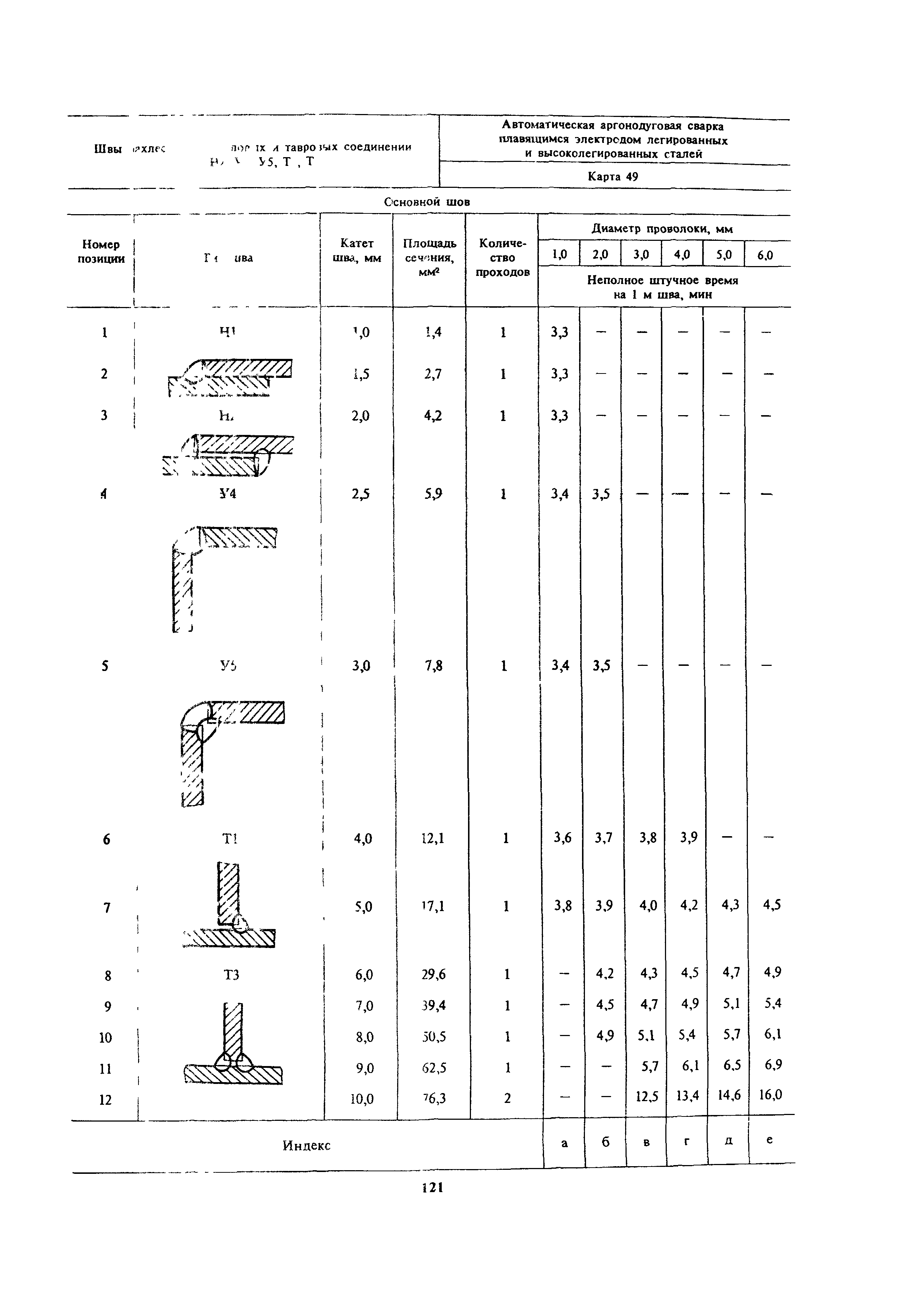 | Оглавление: | 1. Общая часть 2. Наименование оборудования и технология работы 3. Организация труда 4. Нормативная часть 4.1. Неполное штучное время на дуговую сварку 4.2. Вспомогательное время, связанное со сваркой шва. Автоматическая, полуавтоматическая и ручная дуговая сварка 4.3. Вспомогательное время, связанное с изделием и типом оборудования. Автоматическая, полуавтоматическая и ручная дуговая сварка 4.4. Поправочные коэффициенты к картам неполного штучного времени на измененные условия работы. Автоматическая, полуавтоматическая и ручная дуговая сварка 4.5. Приложения Приложения 1. Площадь поперечного сечения шва для расчета количества проходов сварки Приложение 2. Значение коэффициента наплавки металла Приложение 3. Значение коэффициента плотности наплавленного металла Приложение 4. Расчетное значение силы тока в зависимости от толщины металла и диаметра сварочной проволоки для полуавтоматической сварки стыков труб из меди и медно-никелевых сплавов Приложение 6. Расчетное значение скорости сварки в зависимости от диаметра сварочной проволоки и катета шва для автоматической дуговой сварки алюминия и алюминиевых сплавов плавящимся электродом Приложение 7. Расчетное значение скорости сварки в зависимости от диаметра сварочной проволоки и толщины металла при автоматической сварке Приложение 8. Расчетное значение скорости сварки в зависимости от диаметра присадочной проволоки и катета шва при автоматической аргонодуговой сварке алюминия и алюминиевых сплавов неплавящимся электродом Приложение 9. Расчетное значение скорости сварки в зависимости от диаметра присадочной проволоки и толщины металла при автоматической дуговой сварке алюминиевых сплавов неплавящимся электродом Приложение 10. Расчетное значение силы тока в зависимости от диаметра присадочной проволоки и толщины металла при ручной аргонодуговой сварке алюминия и алюминиевых сплавов неплавящимся электродом Приложение 11. Расчетное значение силы тока в зависимости от диаметра присадочной проволоки и толщины металла при ручной аргонодуговой сварке меди и медно-никелевых сплавов неплавящимся электродом Приложение 12. Расчетное значение силы тока в зависимости от диаметра присадочной проволоки и толщины металла при ручной аргонодуговой сварке легированных и высоколегированных сталей плавящимся электродом Приложение 13. Значение длины кольцевого стыка в зависимости от его диаметра Приложение 14. Наименование, индекс, вид шва и формулы расчета площади поперечного сечения швов |