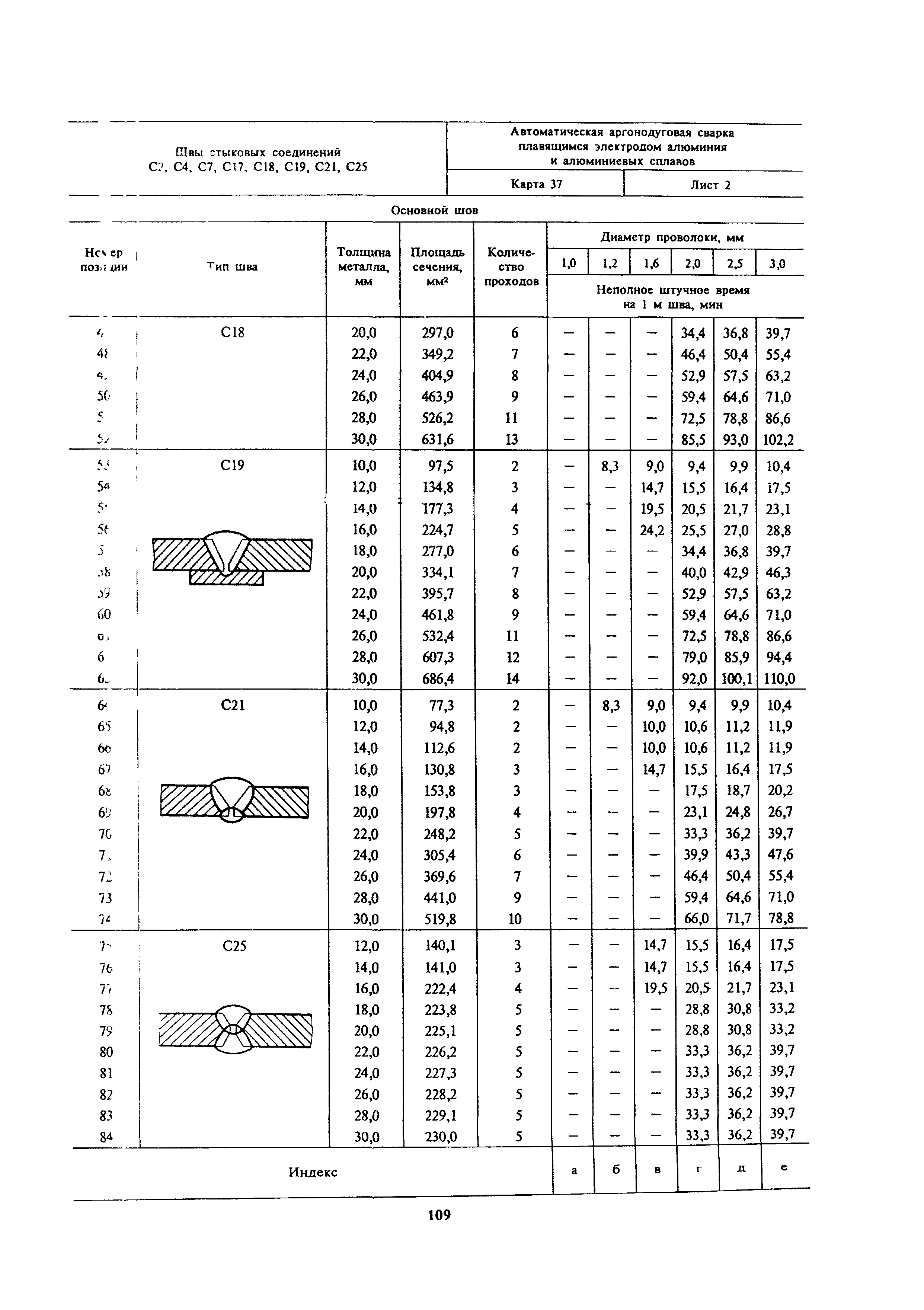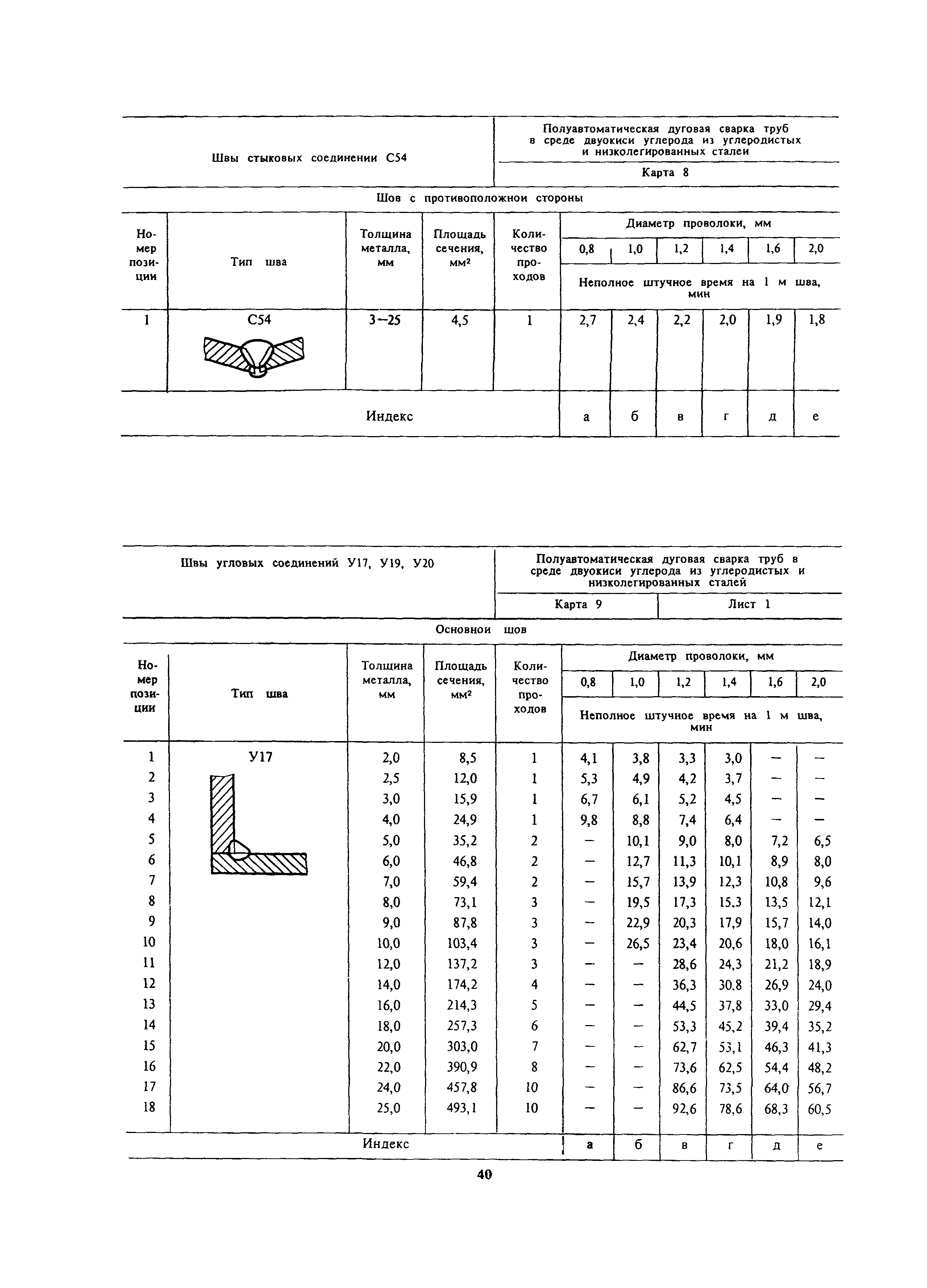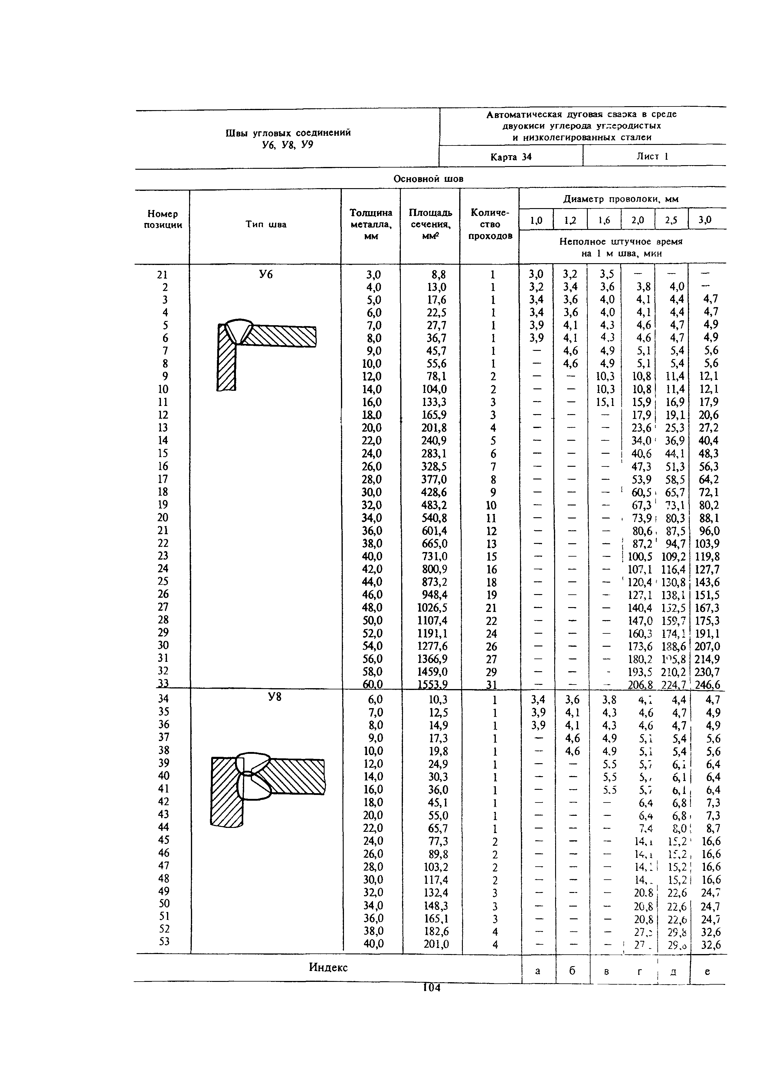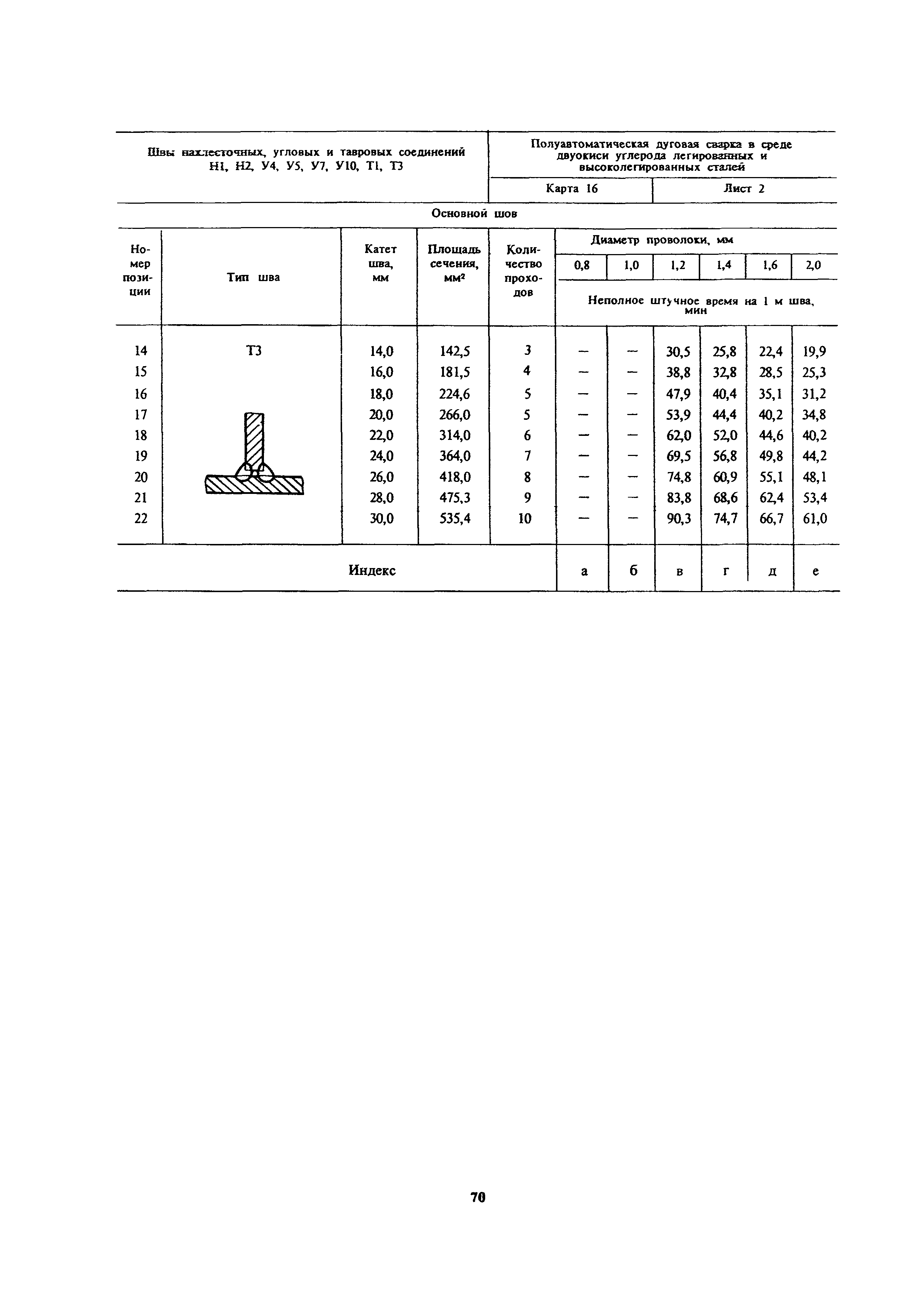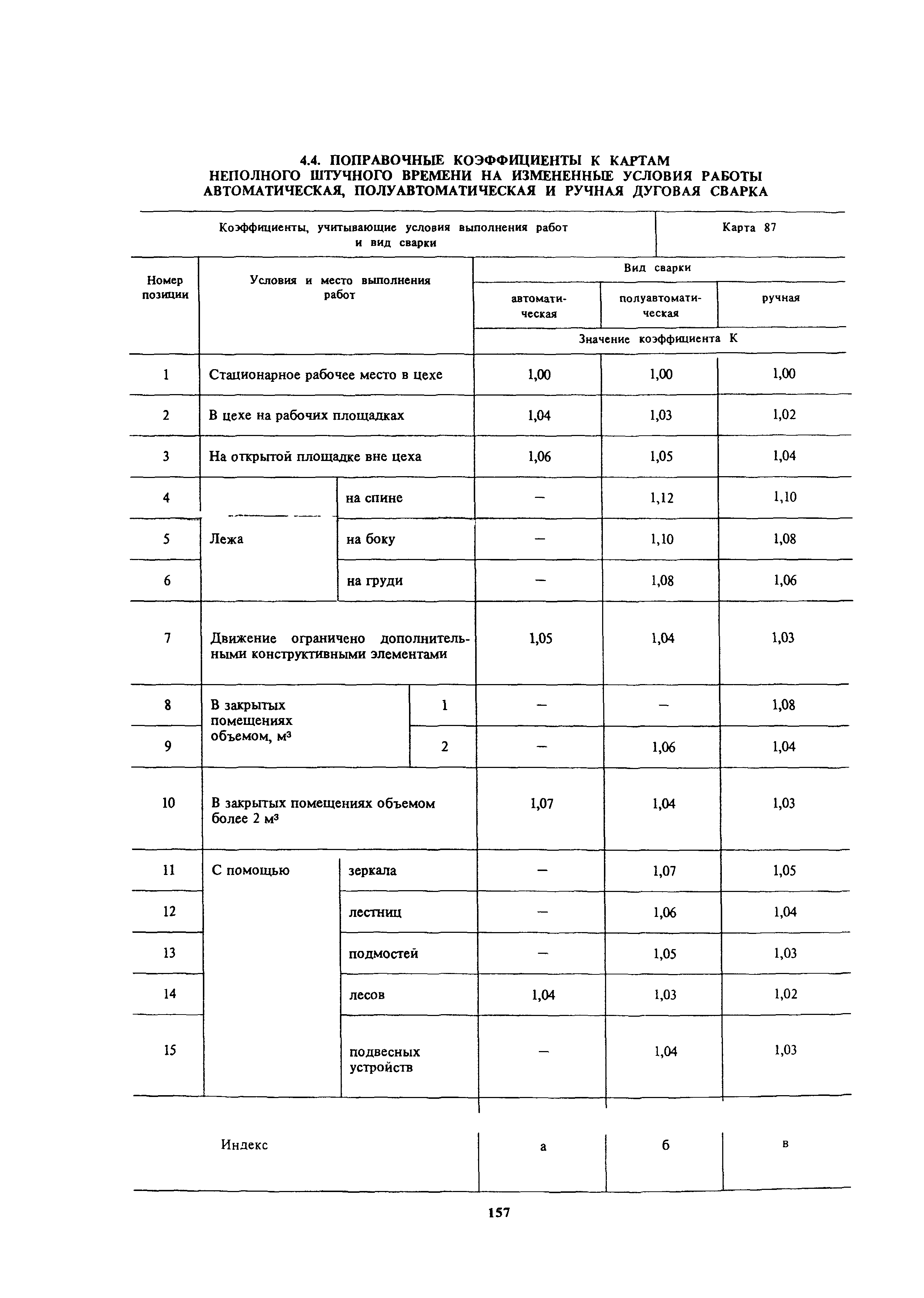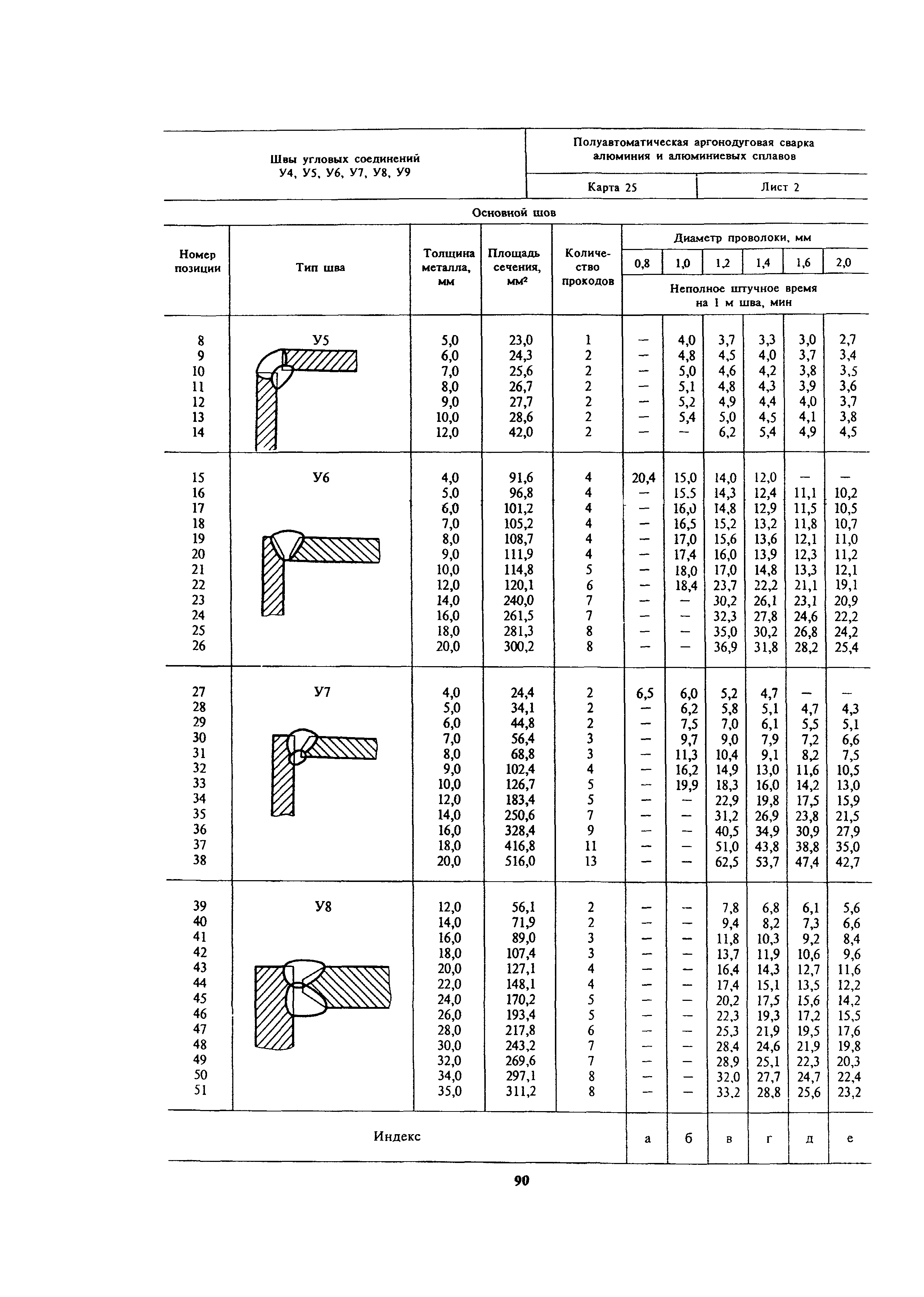 | Оглавление: | 1. Общая часть 2. Наименование оборудования и технология работы 3. Организация труда 4. Нормативная часть 4.1. Неполное штучное время на дуговую сварку 4.2. Вспомогательное время, связанное со сваркой шва. Автоматическая, полуавтоматическая и ручная дуговая сварка 4.3. Вспомогательное время, связанное с изделием и типом оборудования. Автоматическая, полуавтоматическая и ручная дуговая сварка 4.4. Поправочные коэффициенты к картам неполного штучного времени на измененные условия работы. Автоматическая, полуавтоматическая и ручная дуговая сварка 4.5. Приложения Приложения 1. Площадь поперечного сечения шва для расчета количества проходов сварки Приложение 2. Значение коэффициента наплавки металла Приложение 3. Значение коэффициента плотности наплавленного металла Приложение 4. Расчетное значение силы тока в зависимости от толщины металла и диаметра сварочной проволоки для полуавтоматической сварки стыков труб из меди и медно-никелевых сплавов Приложение 6. Расчетное значение скорости сварки в зависимости от диаметра сварочной проволоки и катета шва для автоматической дуговой сварки алюминия и алюминиевых сплавов плавящимся электродом Приложение 7. Расчетное значение скорости сварки в зависимости от диаметра сварочной проволоки и толщины металла при автоматической сварке Приложение 8. Расчетное значение скорости сварки в зависимости от диаметра присадочной проволоки и катета шва при автоматической аргонодуговой сварке алюминия и алюминиевых сплавов неплавящимся электродом Приложение 9. Расчетное значение скорости сварки в зависимости от диаметра присадочной проволоки и толщины металла при автоматической дуговой сварке алюминиевых сплавов неплавящимся электродом Приложение 10. Расчетное значение силы тока в зависимости от диаметра присадочной проволоки и толщины металла при ручной аргонодуговой сварке алюминия и алюминиевых сплавов неплавящимся электродом Приложение 11. Расчетное значение силы тока в зависимости от диаметра присадочной проволоки и толщины металла при ручной аргонодуговой сварке меди и медно-никелевых сплавов неплавящимся электродом Приложение 12. Расчетное значение силы тока в зависимости от диаметра присадочной проволоки и толщины металла при ручной аргонодуговой сварке легированных и высоколегированных сталей плавящимся электродом Приложение 13. Значение длины кольцевого стыка в зависимости от его диаметра Приложение 14. Наименование, индекс, вид шва и формулы расчета площади поперечного сечения швов |