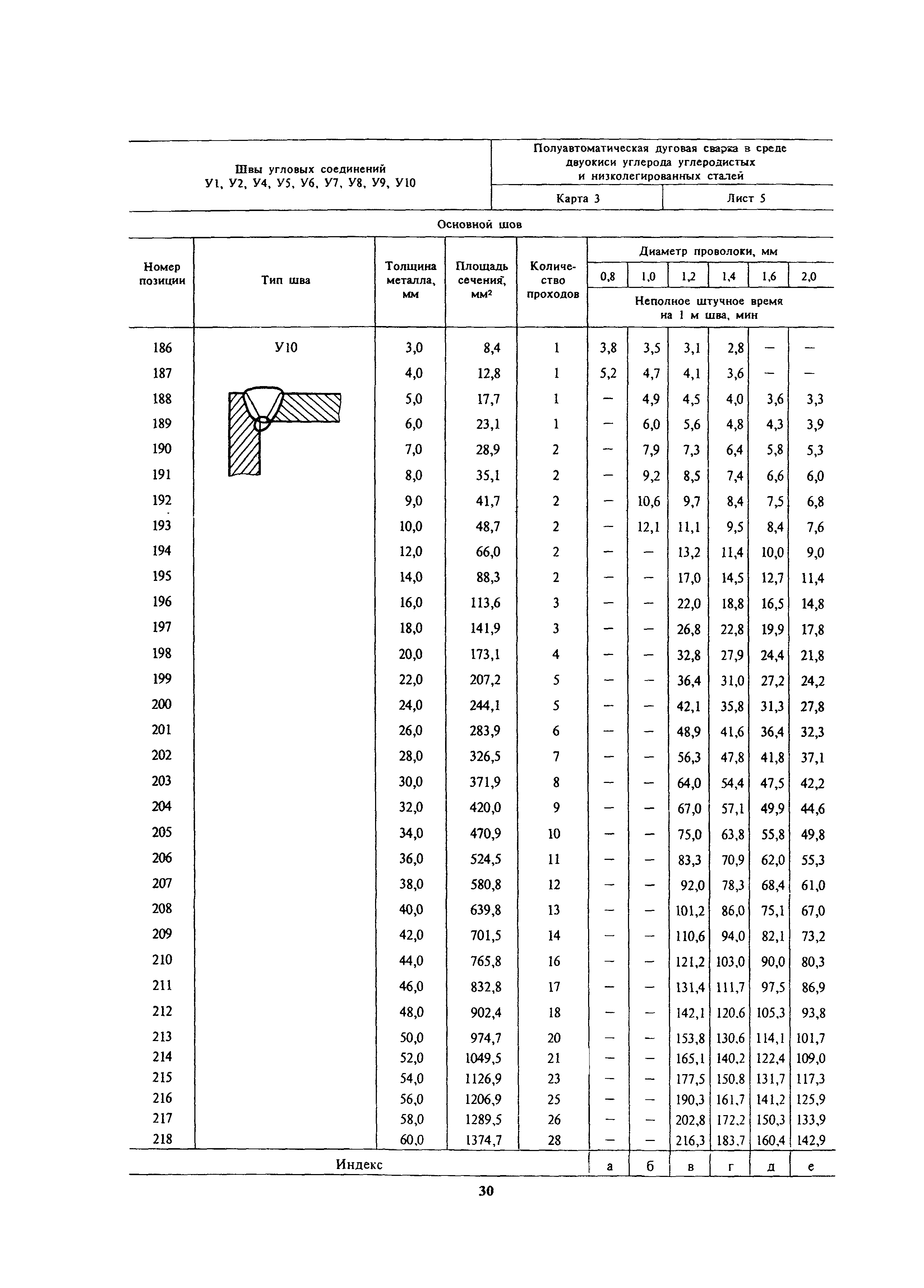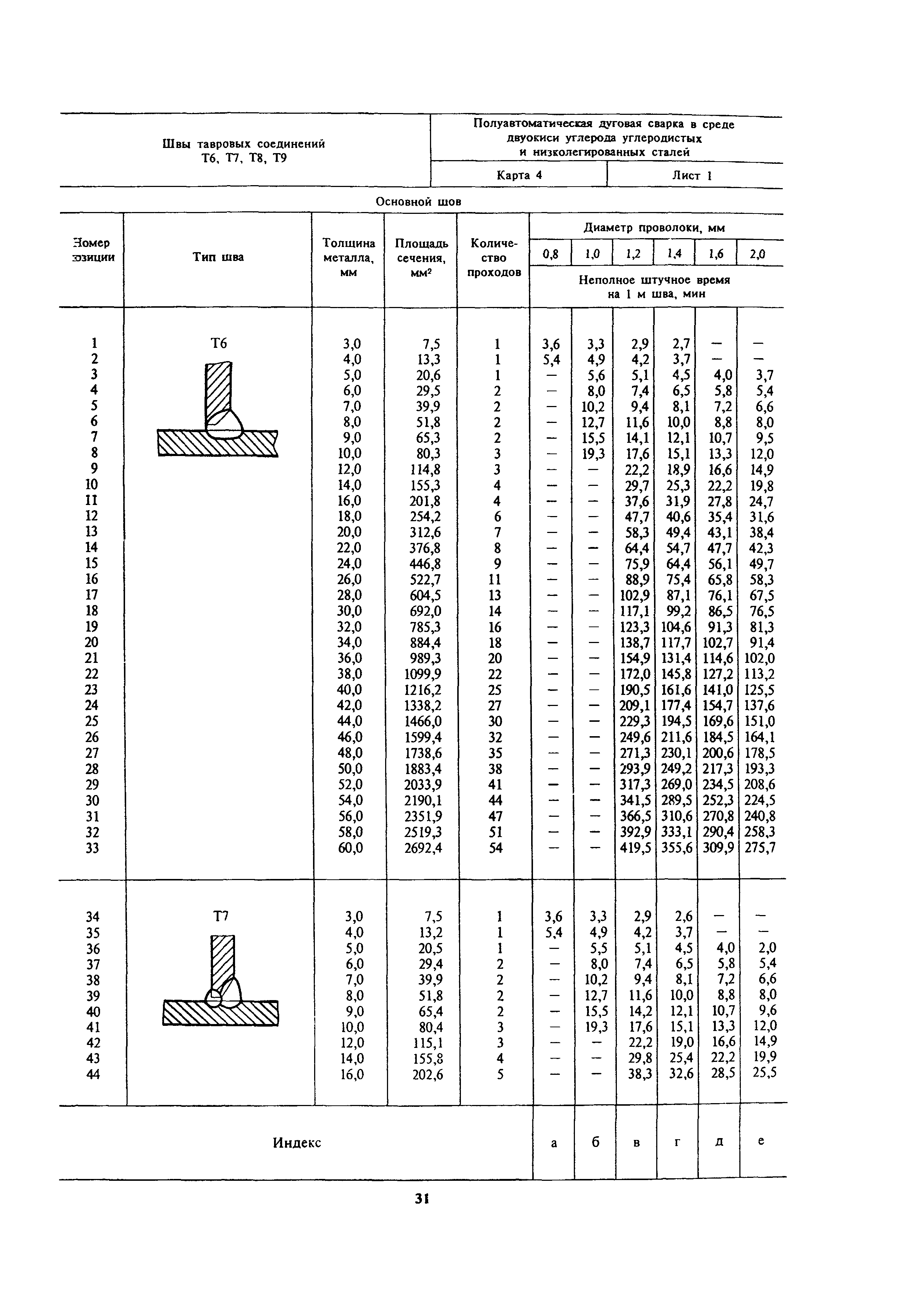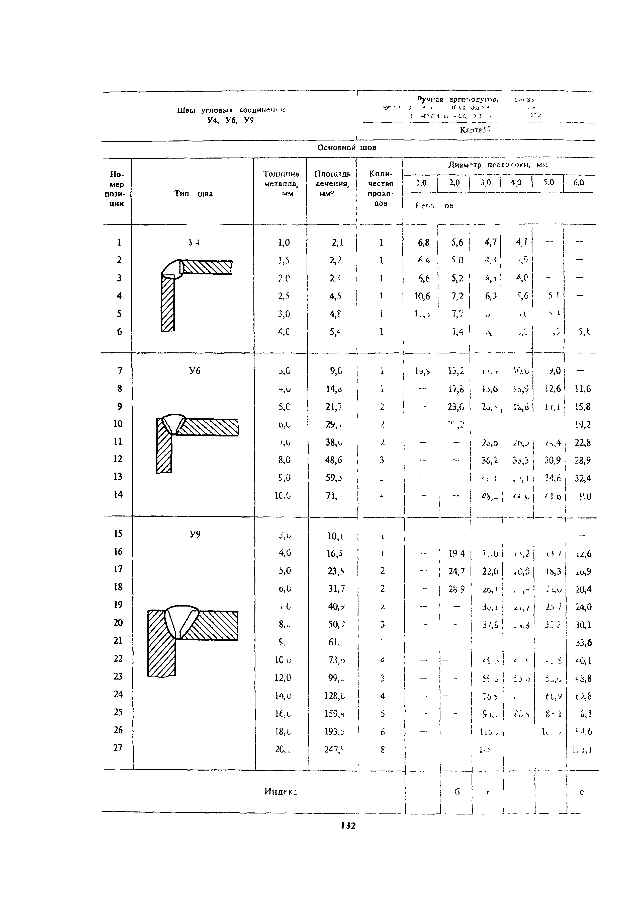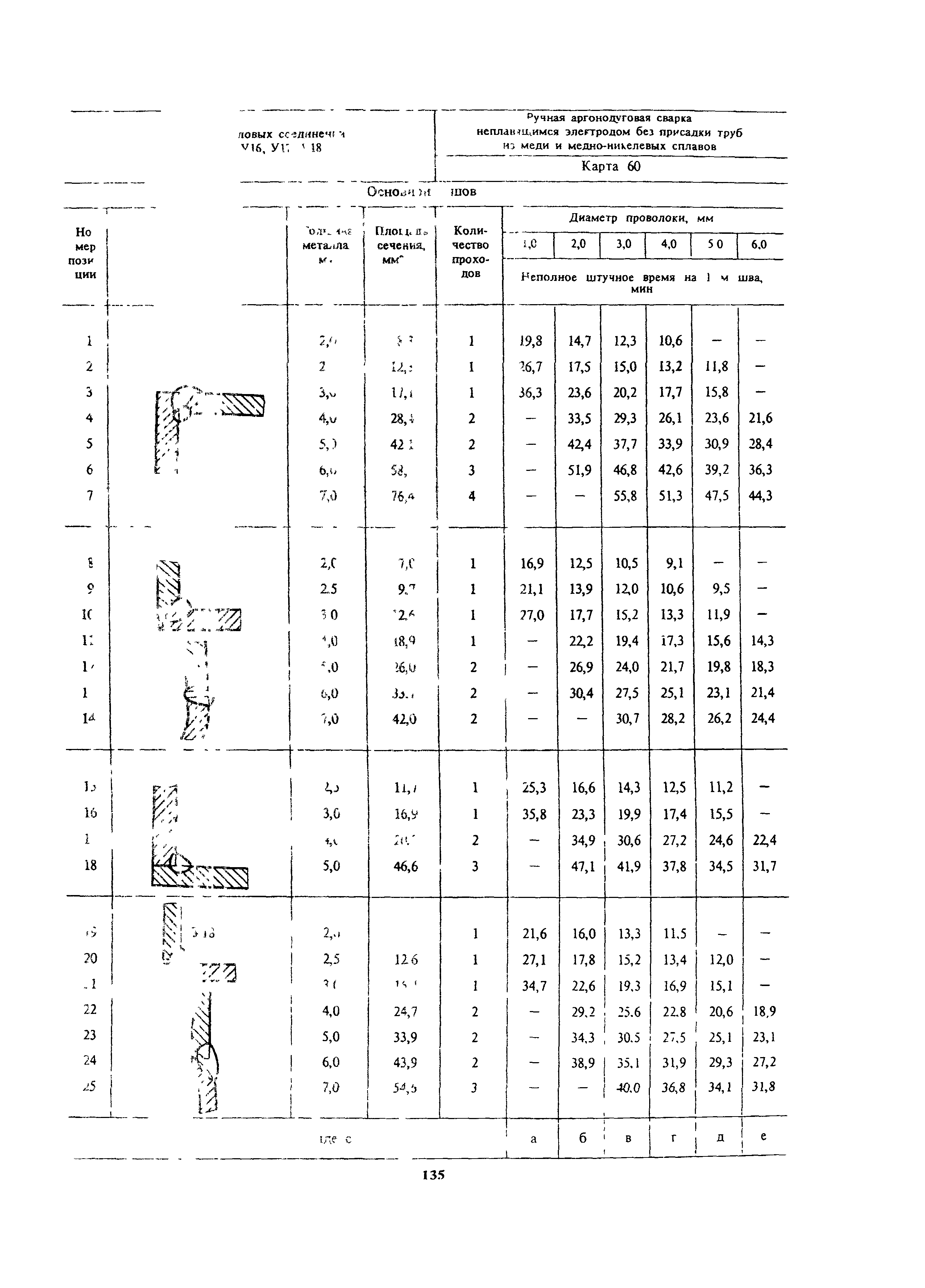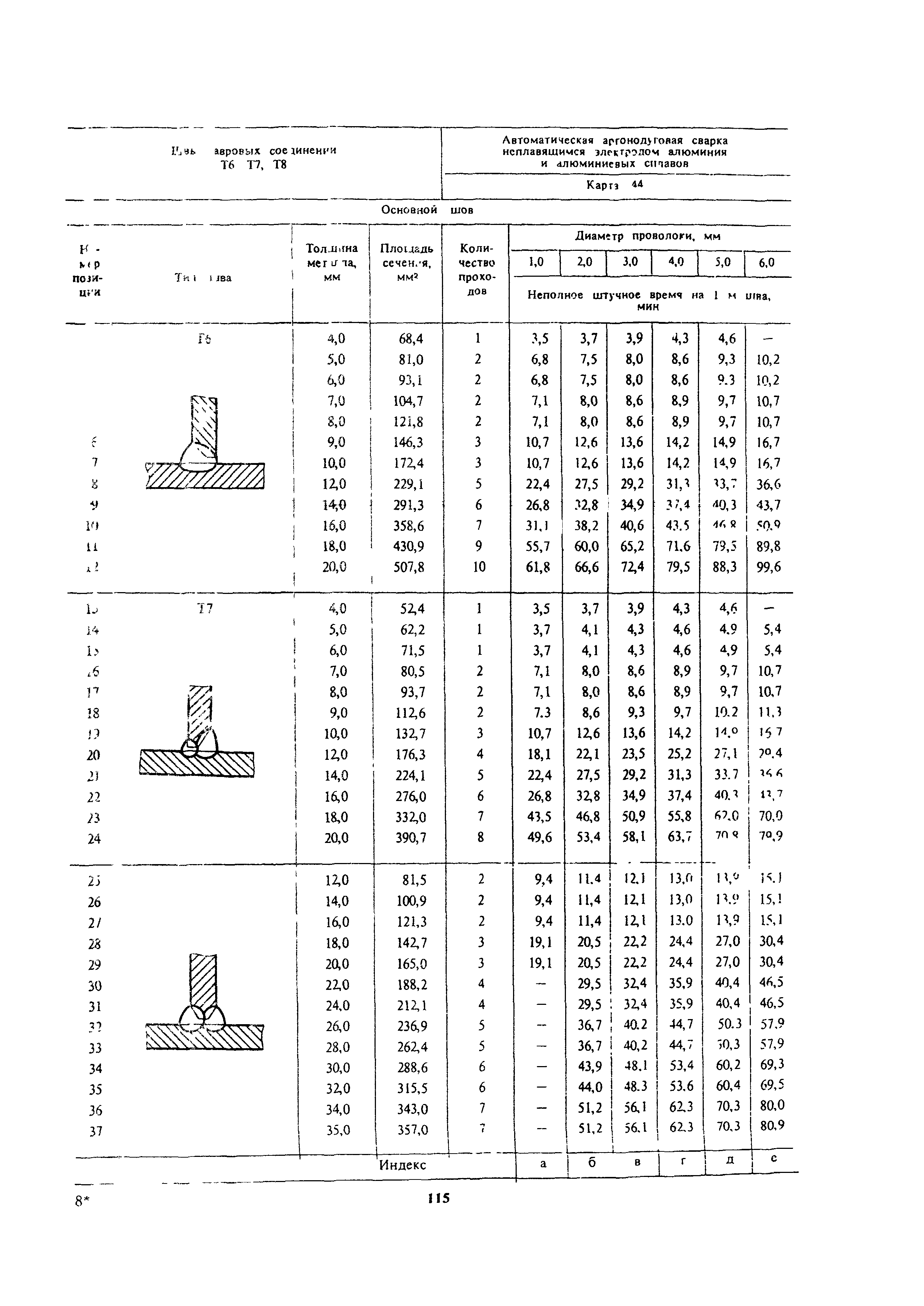 | Оглавление: | 1. Общая часть 2. Наименование оборудования и технология работы 3. Организация труда 4. Нормативная часть 4.1. Неполное штучное время на дуговую сварку 4.2. Вспомогательное время, связанное со сваркой шва. Автоматическая, полуавтоматическая и ручная дуговая сварка 4.3. Вспомогательное время, связанное с изделием и типом оборудования. Автоматическая, полуавтоматическая и ручная дуговая сварка 4.4. Поправочные коэффициенты к картам неполного штучного времени на измененные условия работы. Автоматическая, полуавтоматическая и ручная дуговая сварка 4.5. Приложения Приложения 1. Площадь поперечного сечения шва для расчета количества проходов сварки Приложение 2. Значение коэффициента наплавки металла Приложение 3. Значение коэффициента плотности наплавленного металла Приложение 4. Расчетное значение силы тока в зависимости от толщины металла и диаметра сварочной проволоки для полуавтоматической сварки стыков труб из меди и медно-никелевых сплавов Приложение 6. Расчетное значение скорости сварки в зависимости от диаметра сварочной проволоки и катета шва для автоматической дуговой сварки алюминия и алюминиевых сплавов плавящимся электродом Приложение 7. Расчетное значение скорости сварки в зависимости от диаметра сварочной проволоки и толщины металла при автоматической сварке Приложение 8. Расчетное значение скорости сварки в зависимости от диаметра присадочной проволоки и катета шва при автоматической аргонодуговой сварке алюминия и алюминиевых сплавов неплавящимся электродом Приложение 9. Расчетное значение скорости сварки в зависимости от диаметра присадочной проволоки и толщины металла при автоматической дуговой сварке алюминиевых сплавов неплавящимся электродом Приложение 10. Расчетное значение силы тока в зависимости от диаметра присадочной проволоки и толщины металла при ручной аргонодуговой сварке алюминия и алюминиевых сплавов неплавящимся электродом Приложение 11. Расчетное значение силы тока в зависимости от диаметра присадочной проволоки и толщины металла при ручной аргонодуговой сварке меди и медно-никелевых сплавов неплавящимся электродом Приложение 12. Расчетное значение силы тока в зависимости от диаметра присадочной проволоки и толщины металла при ручной аргонодуговой сварке легированных и высоколегированных сталей плавящимся электродом Приложение 13. Значение длины кольцевого стыка в зависимости от его диаметра Приложение 14. Наименование, индекс, вид шва и формулы расчета площади поперечного сечения швов |