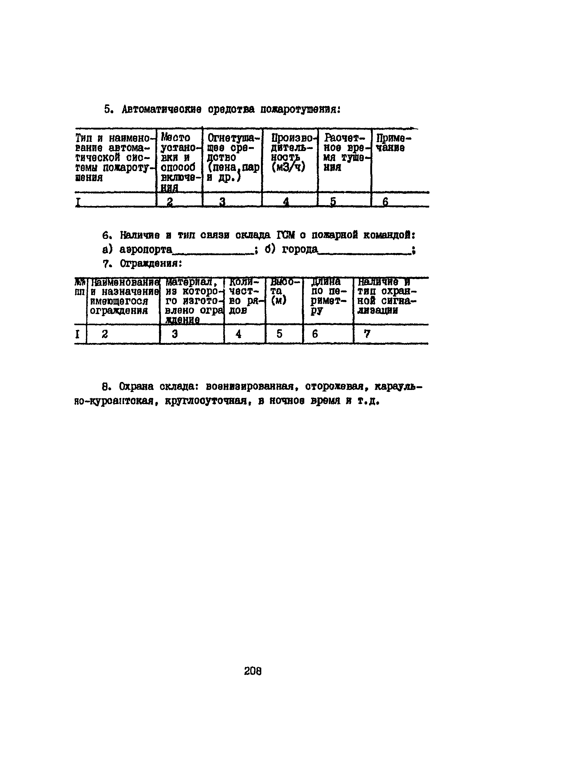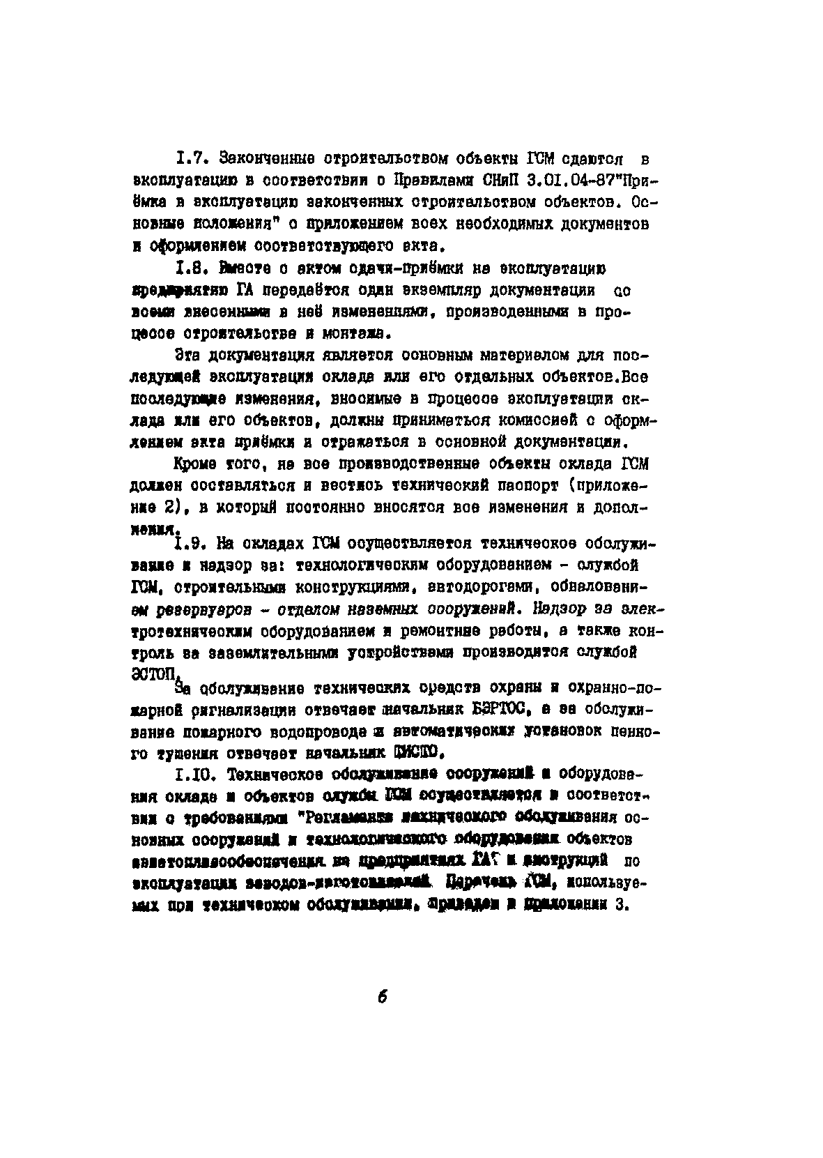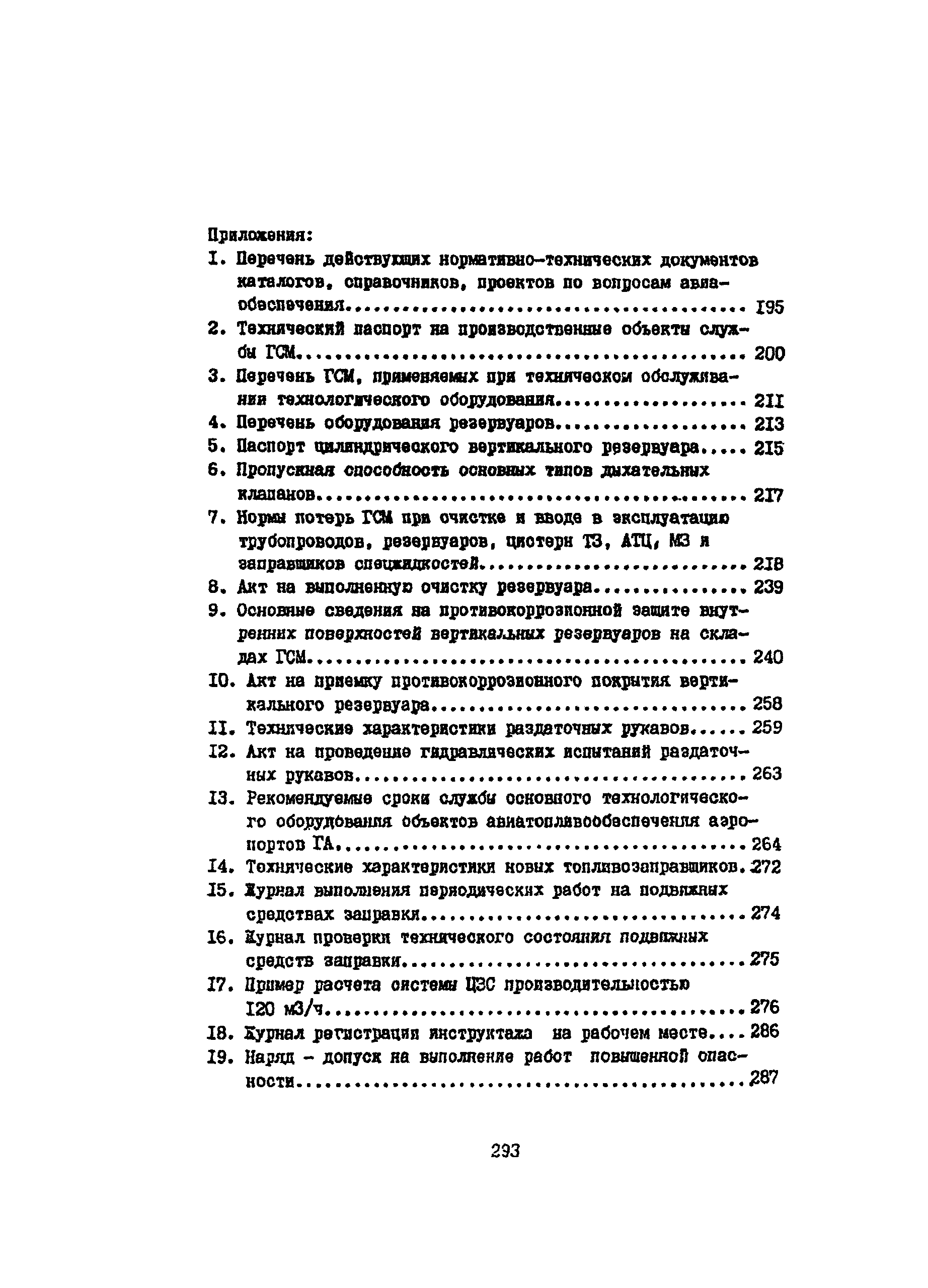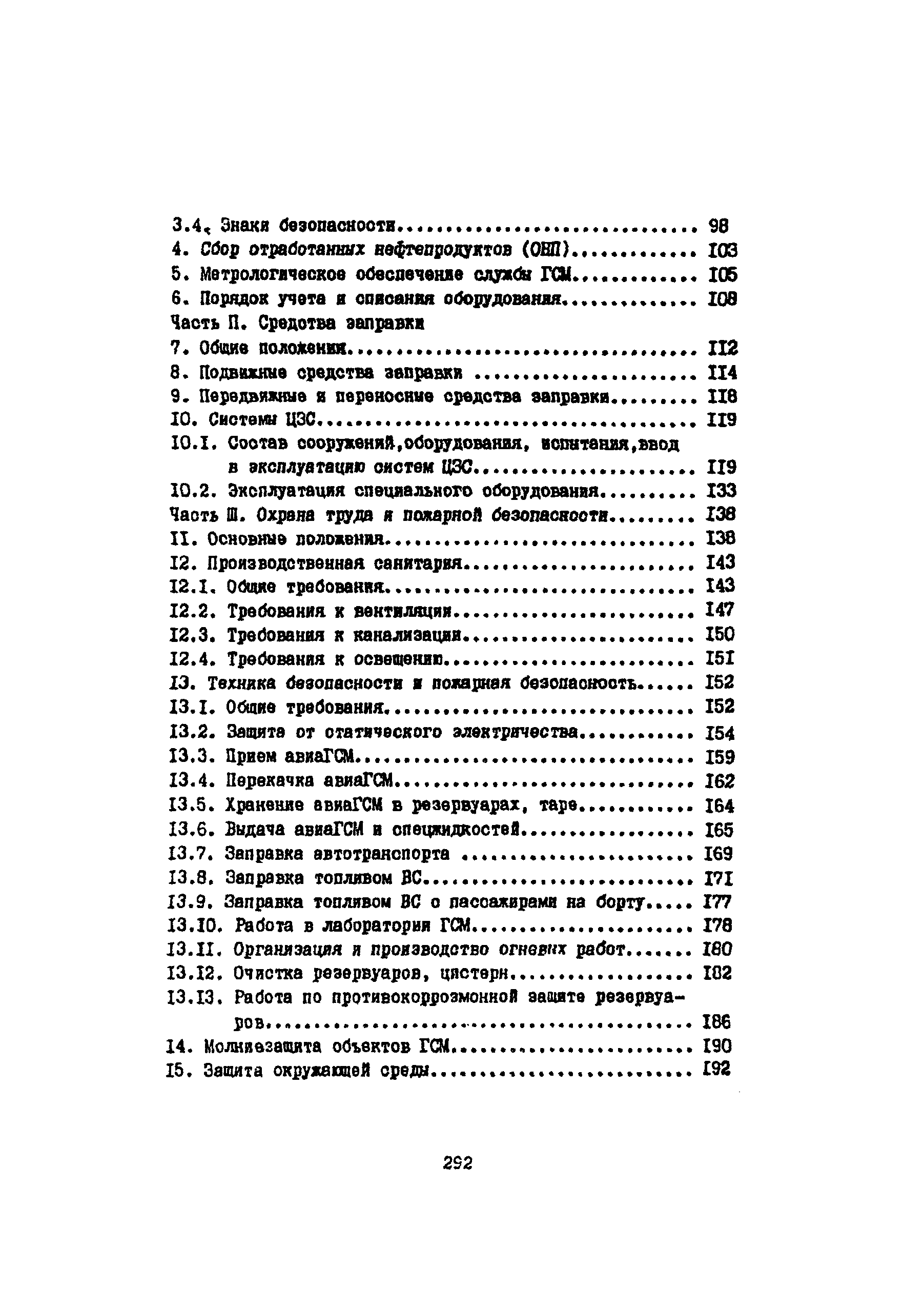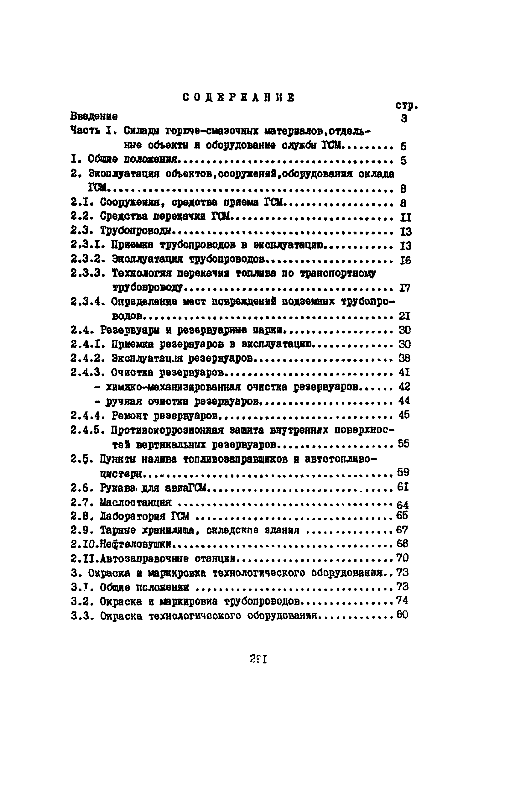 Введение Часть I. Склады горюче-смазочных материалов, отдельные объекты и оборудование службы ГСМ 1 Общие положения 2 Эксплуатация объектов, сооружений, оборудования склада ГСМ 3 Окраска и маркировка технологического оборудования 4 Сбор отработанных нефтепродуктов (ОНП) 5 Метрологическое обеспечение службы ГСМ 6 Порядок учета и описания оборудования Часть II. Средства заправки 7 Общие положения 8 Подвижные средства заправки 9 Передвижные и переносные средства заправки 10 Системы ЦЭС Часть III. Охрана труда и пожарной безопасности 11 Основные положения 12 Производственная санитария 13 Техника безопасности 14 Молниезащита объектов ГСМ 15 Защита окружающей среды Приложения