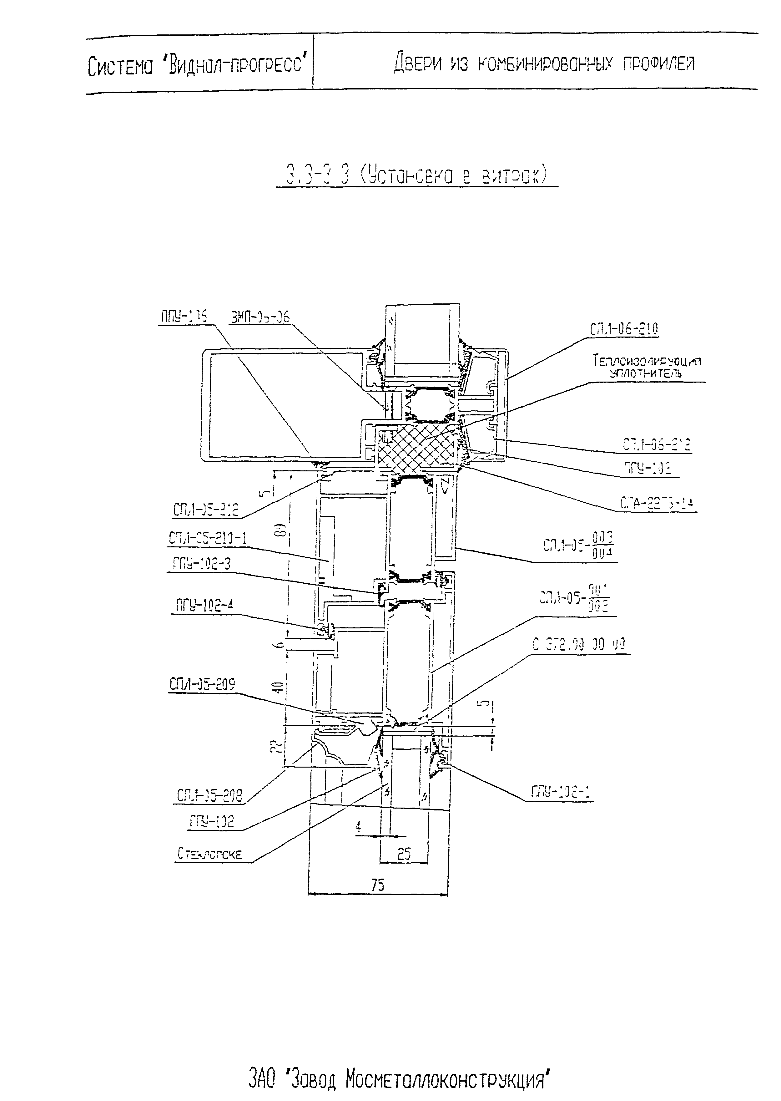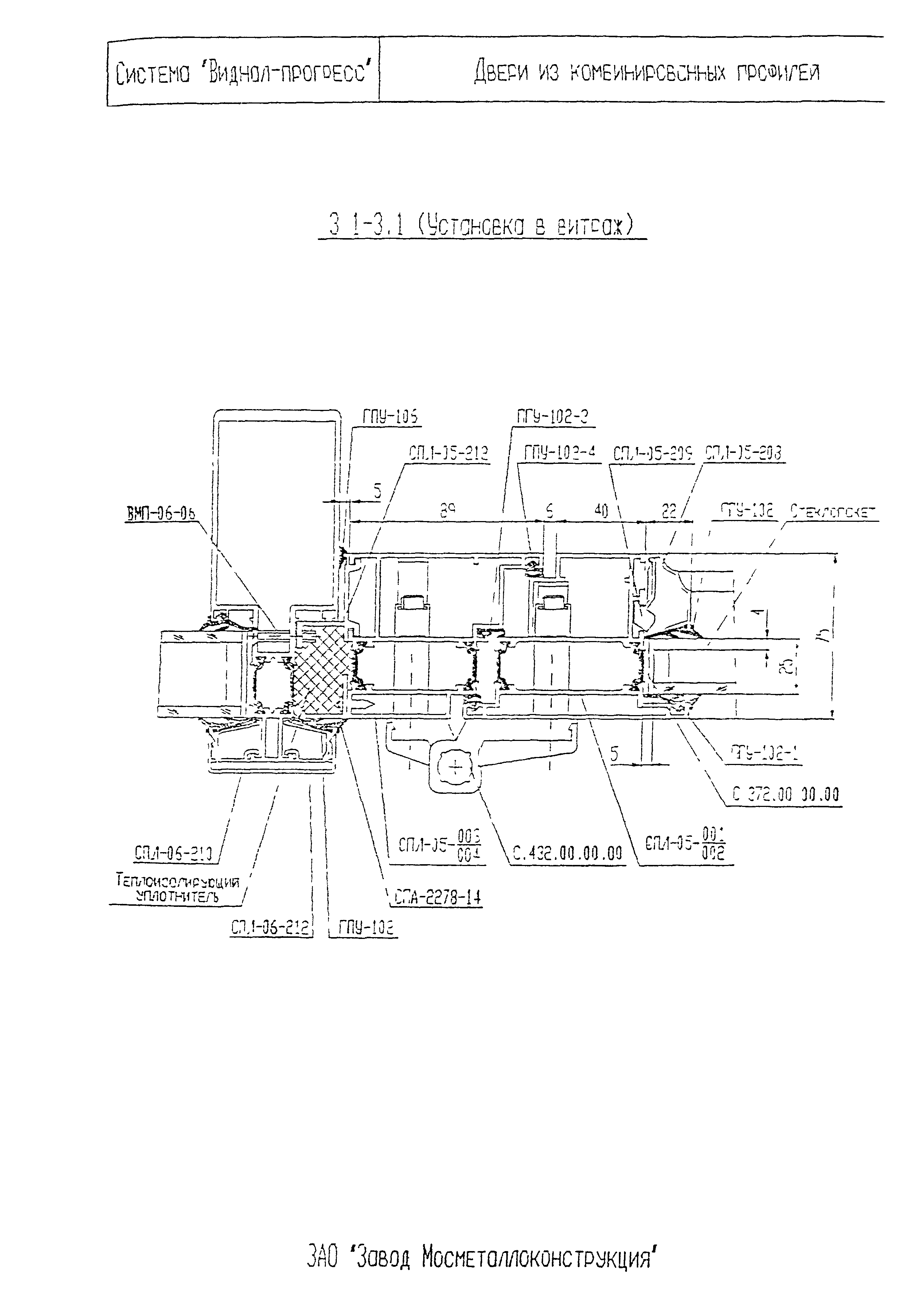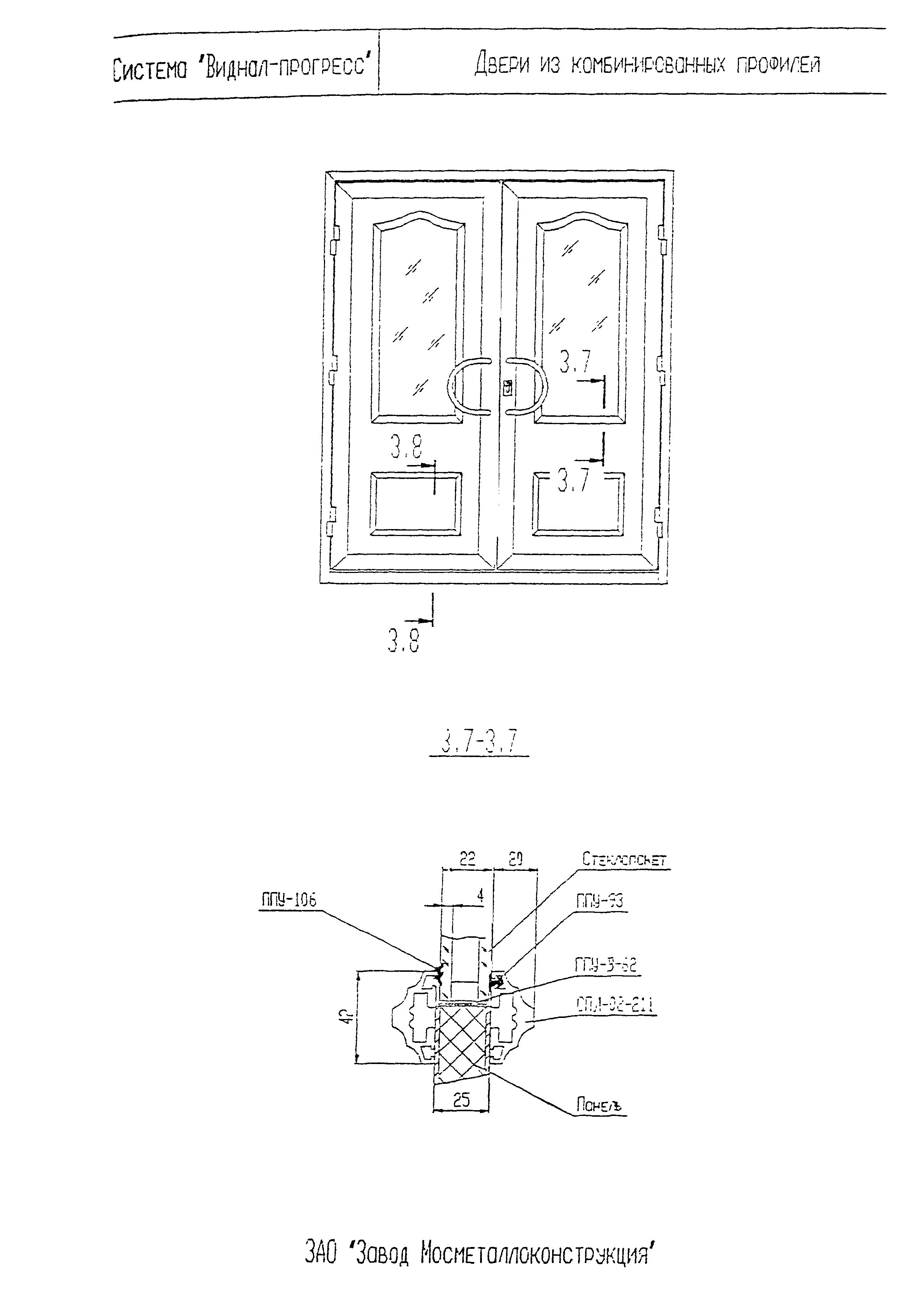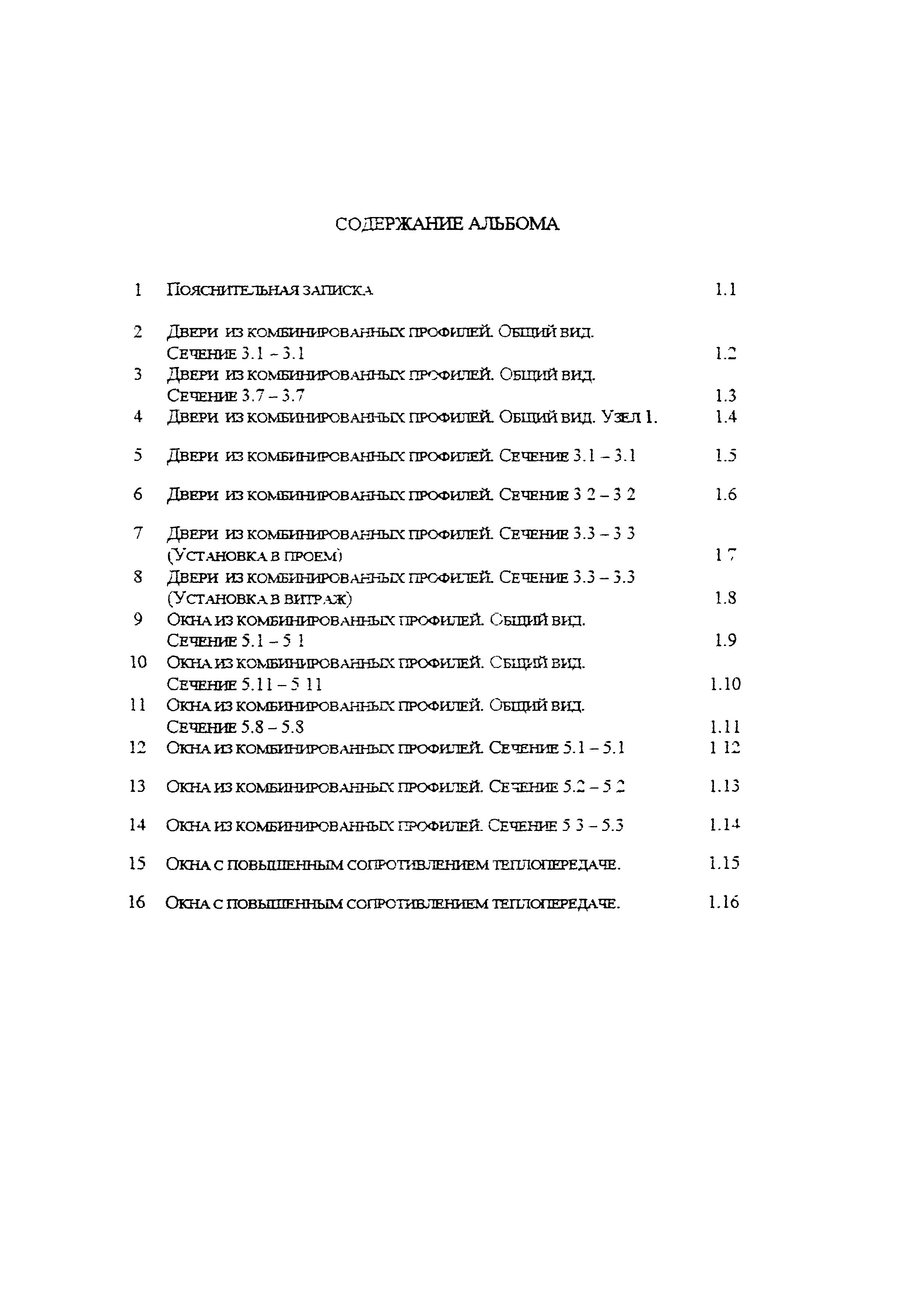 | Оглавление: | 1. Пояснительная записка 2. Двери из комбинированных профилей. Общий вид. Сечение 3.1 - 3.1 3. Двери из комбинированных профилей. Общий вид. Сечение 3.7 - 3.7 4. Двери из комбинированных профилей. Общий вид. Узел 1 5. Двери из комбинированных профилей. Сечение 3.1 - 3.1 6. Двери из комбинированных профилей. Сечение 3.2 - 3.2 7. Двери из комбинированных профилей Сечение 3.3 - 3.3 (установка в проем) 8. Двери из комбинированных профилей. Сечение 3.3 - 3.3 (установка витраж) 9. Окна из комбинированных профилей. Общий вид. Сечение 5.1 - 5.1 10. Окна из комбинированных профилей. Общий вид. Сечение 5.11 - 5.11 11. Окна из комбинированных профилей. Общий вид. Сечение 5.8 - 5.8 12. Окна из комбинированных профилей. Сечение 5.1 - 5.1 13. Окна из комбинированных профилей. Сечение 5.2 - 5.2 14. Окна из комбинированных профилей. Сечение 5.3 - 5.3 15. Окна с повышенным сопротивлением теплопередаче 16. Окна с повышенным сопротивлением теплопередаче |