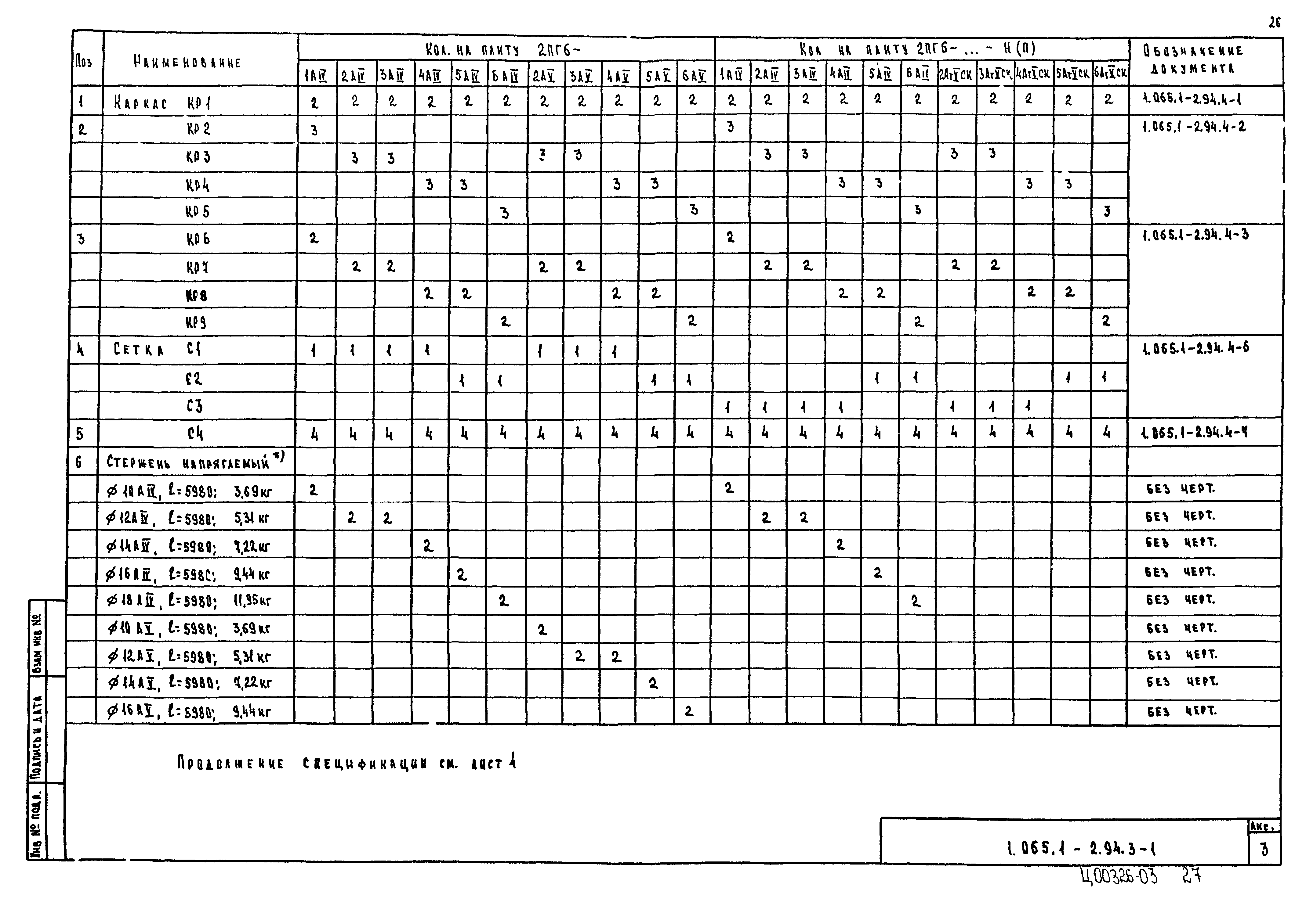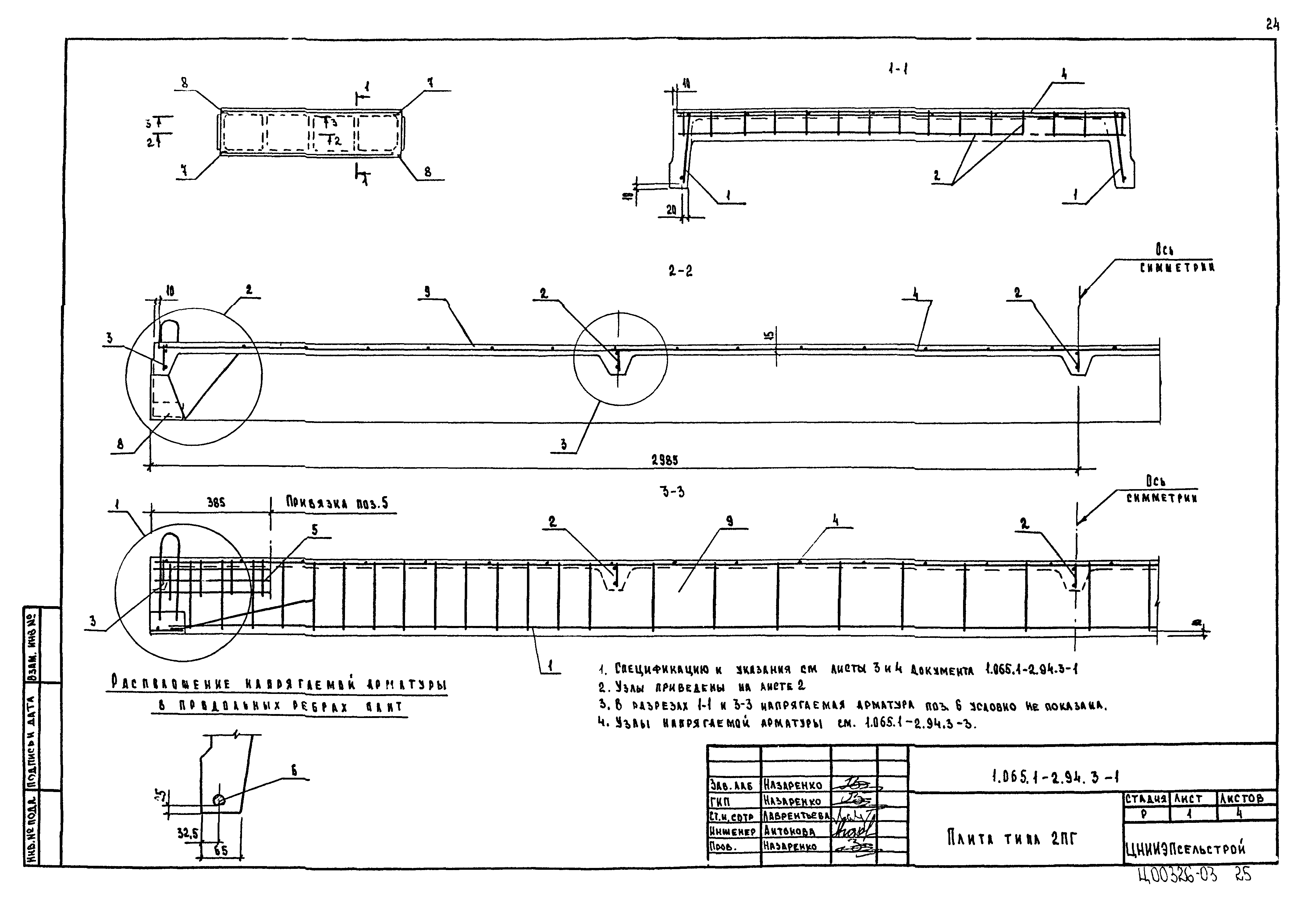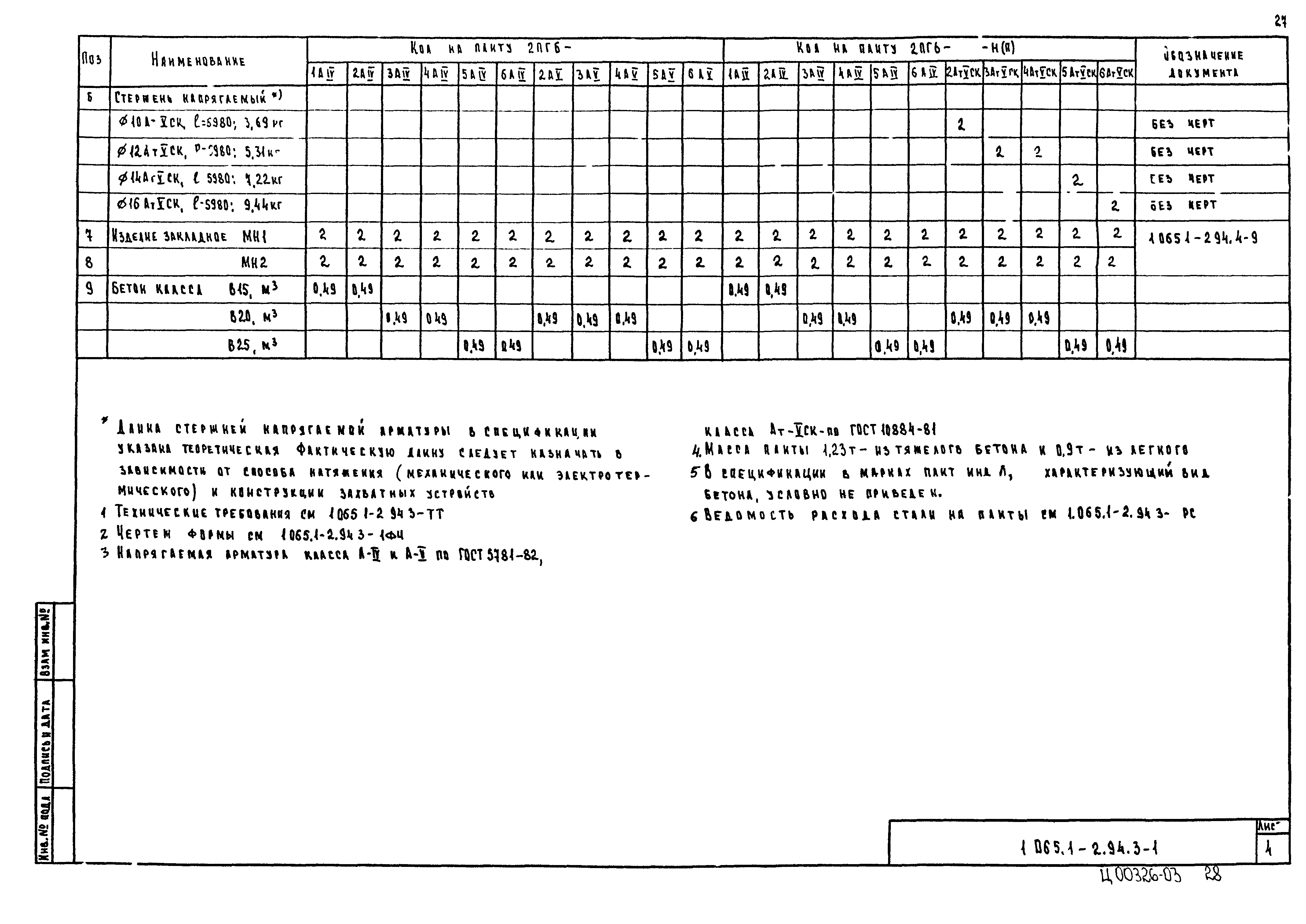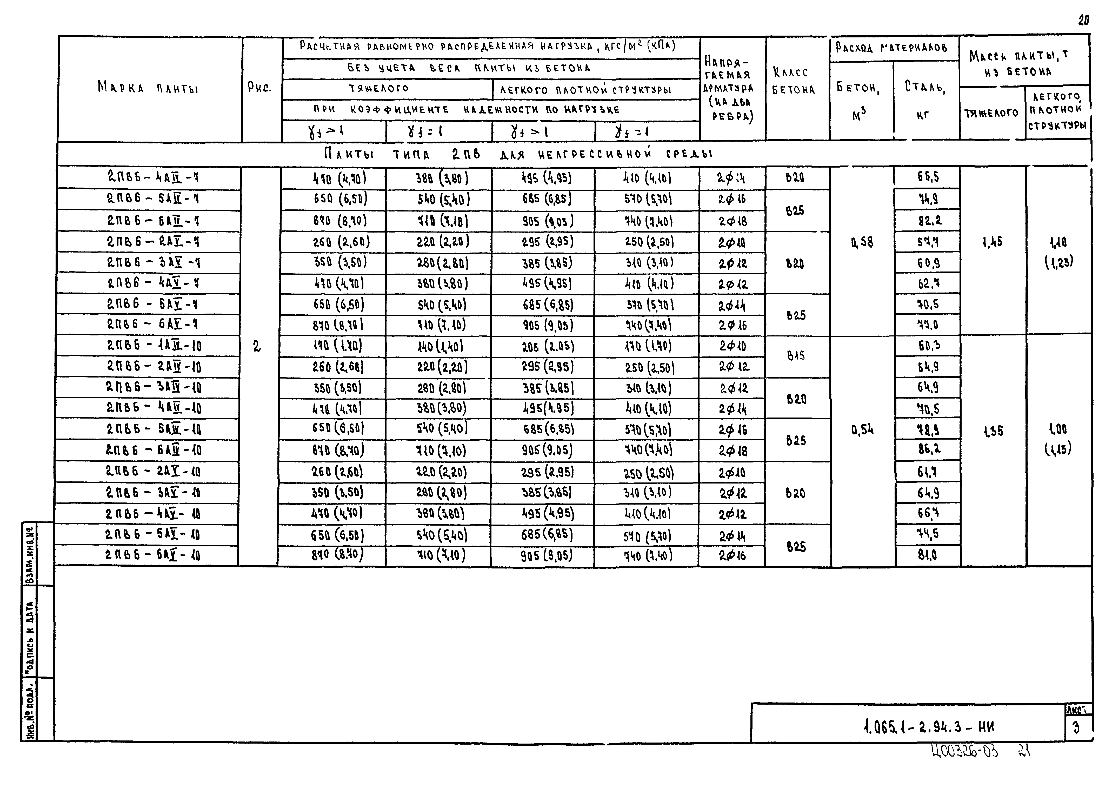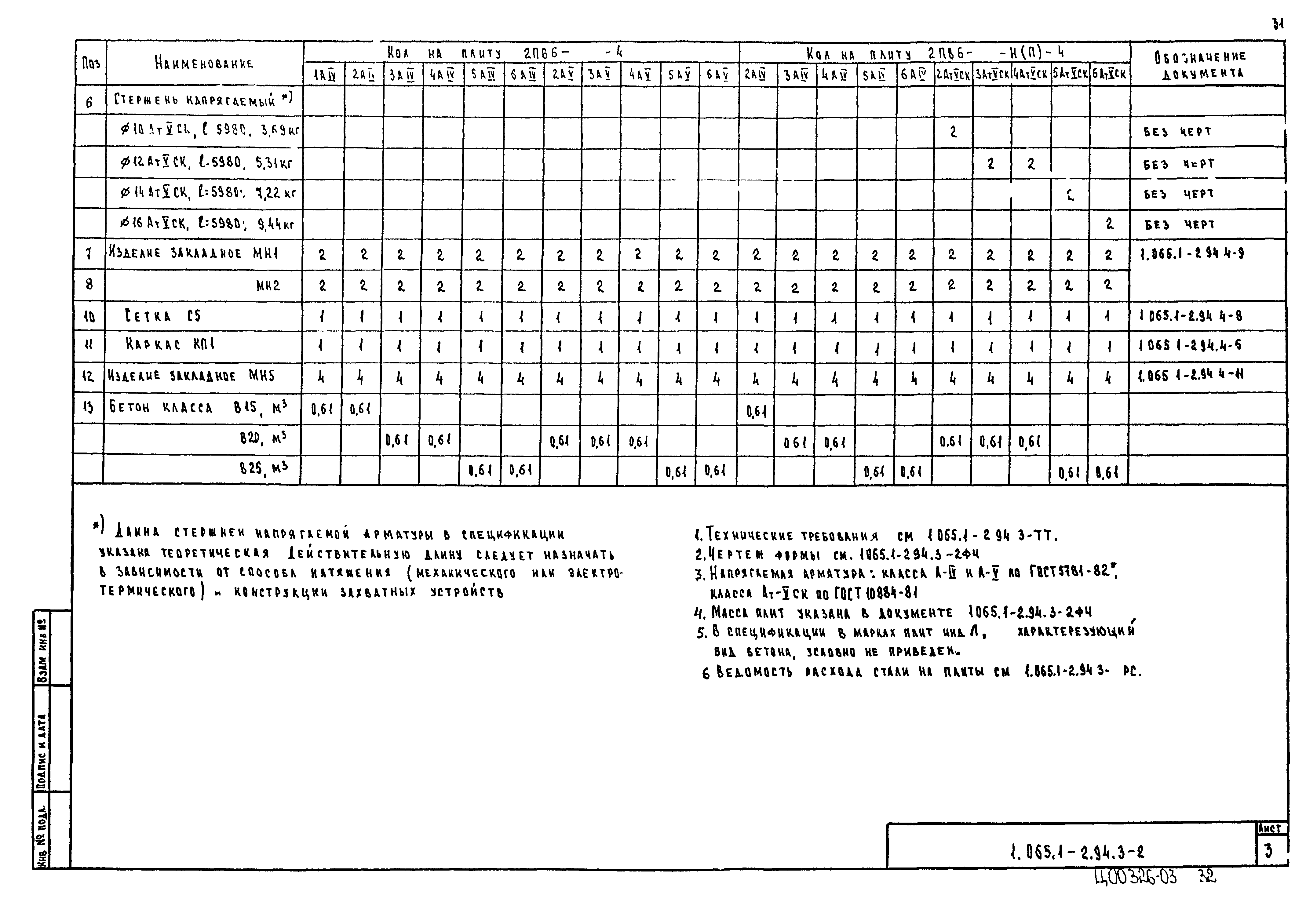 | Оглавление: | 1.065.1-2.94.3-ТТ Технические требования 1.065.1-2.94.3-СМ1 Схемы контрольных испытаний плит 1.065.1-2.94.3-НИ Номенклатура плит типа 2ПГ и 2ПВ 1.065.1-2.94.3-1ФЧ Плита типа 2ПГ. Чертеж формы 1.065.1-2.94.3-1 Плита типа 2ПГ 1.065.1-2.94.3-2ФЧ Плита типа 2ПВ. Чертеж формы 1.065.1-2.94.3-2 Плита типа 2ПВ 1.065.1-2.94.3-3 Узлы анкеровки напрягаемой арматуры 1.065.1-2.94.3-СМ2 Пример плиты для сейсмических районов 1.065.1-2.94.3-СМ3 Пример расположения в плитах дополнительных закладных изделий 1.065.1-2.94.3-СМ4 Расположение в плите дополнительных закладных изделий 1.065.1-2.94.3-СМ5 Расположение закладных изделий в плите покрытия для приварки стержней монолитного участка 1.065.1-2.94.3-РС Ведомость расхода стали |
