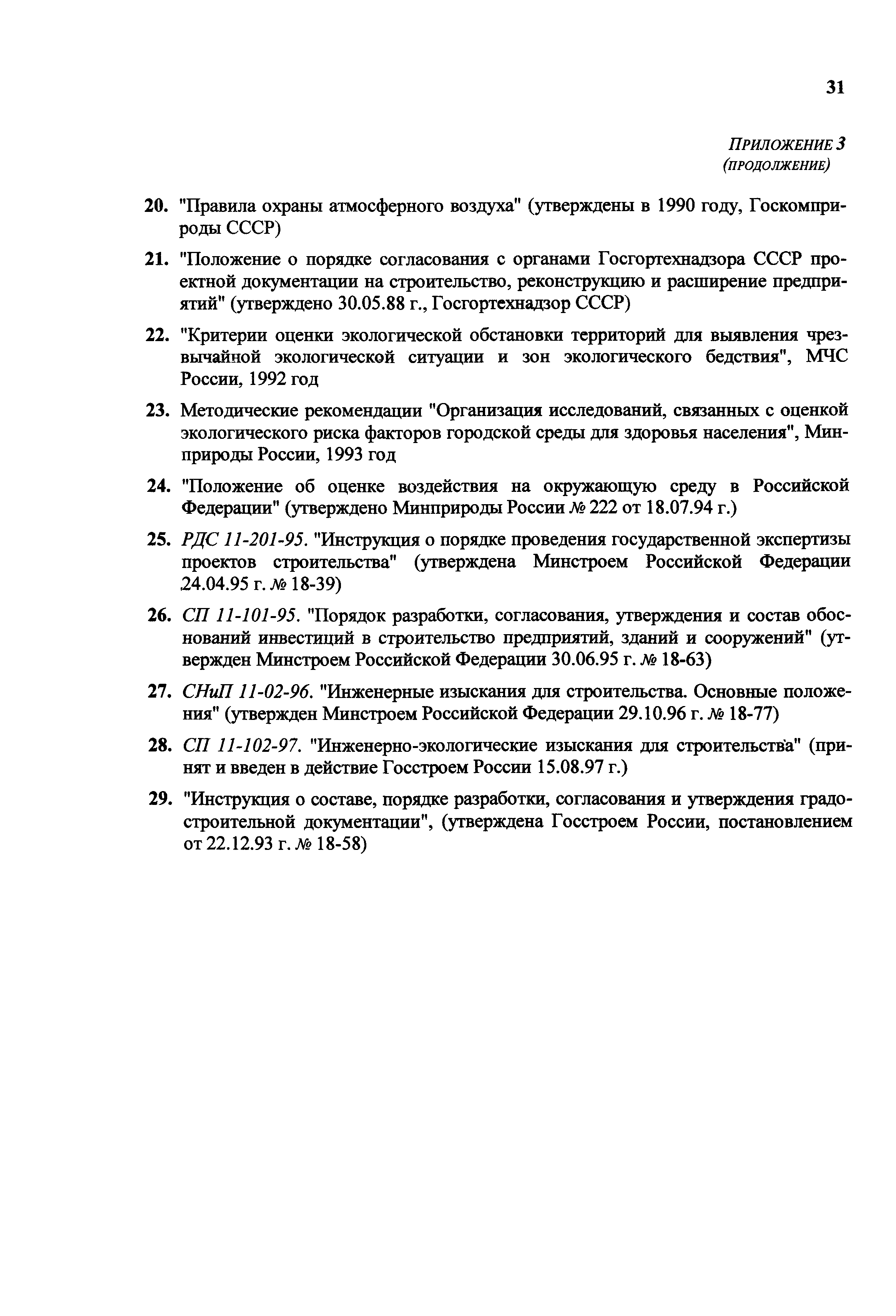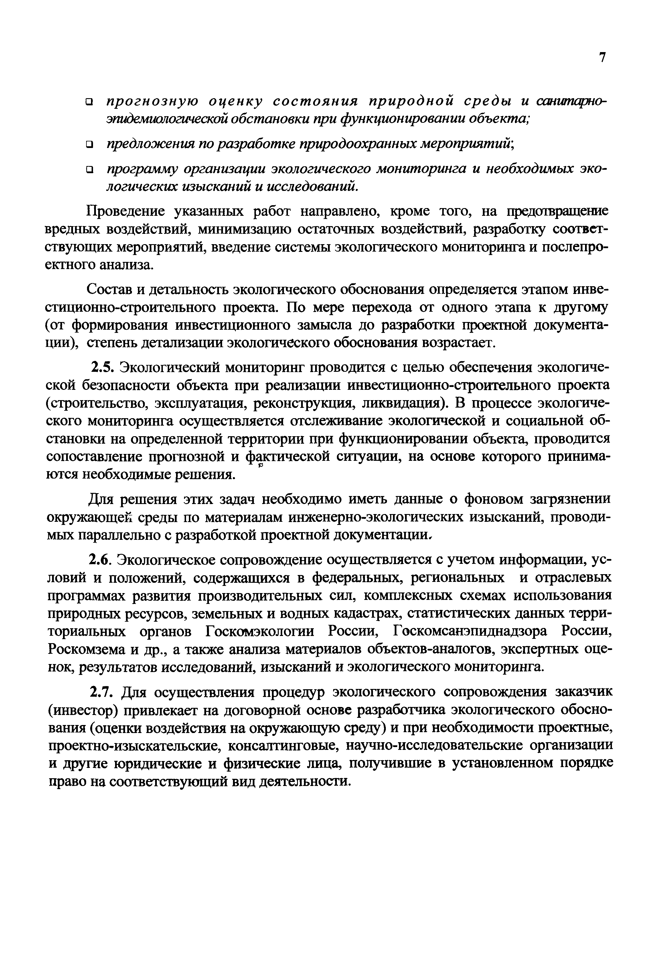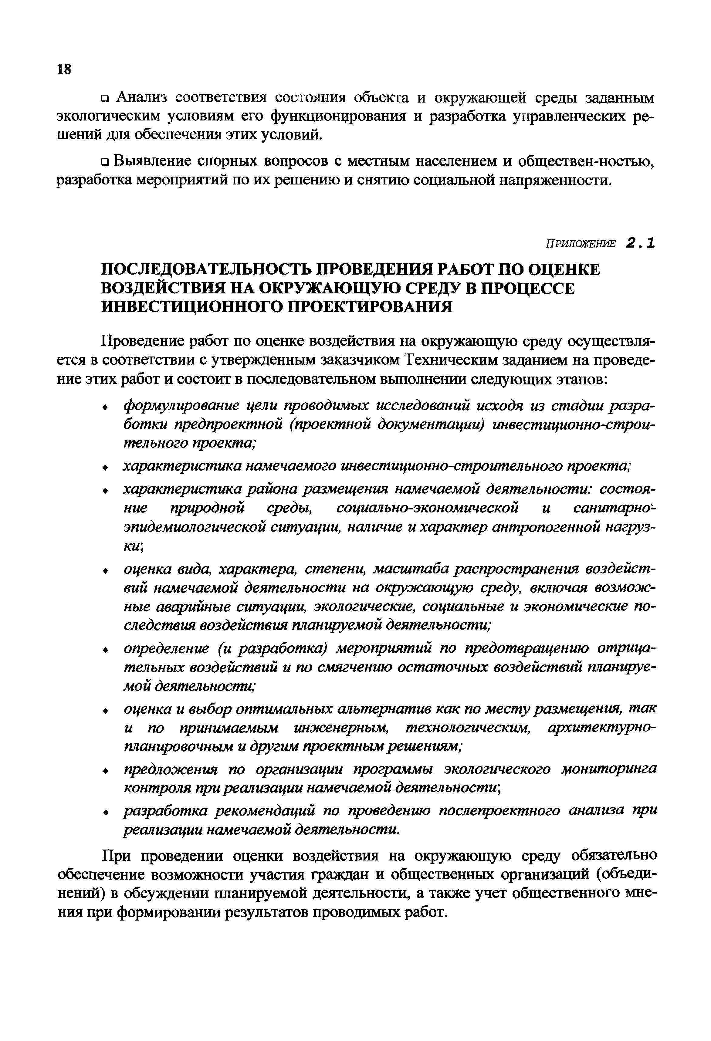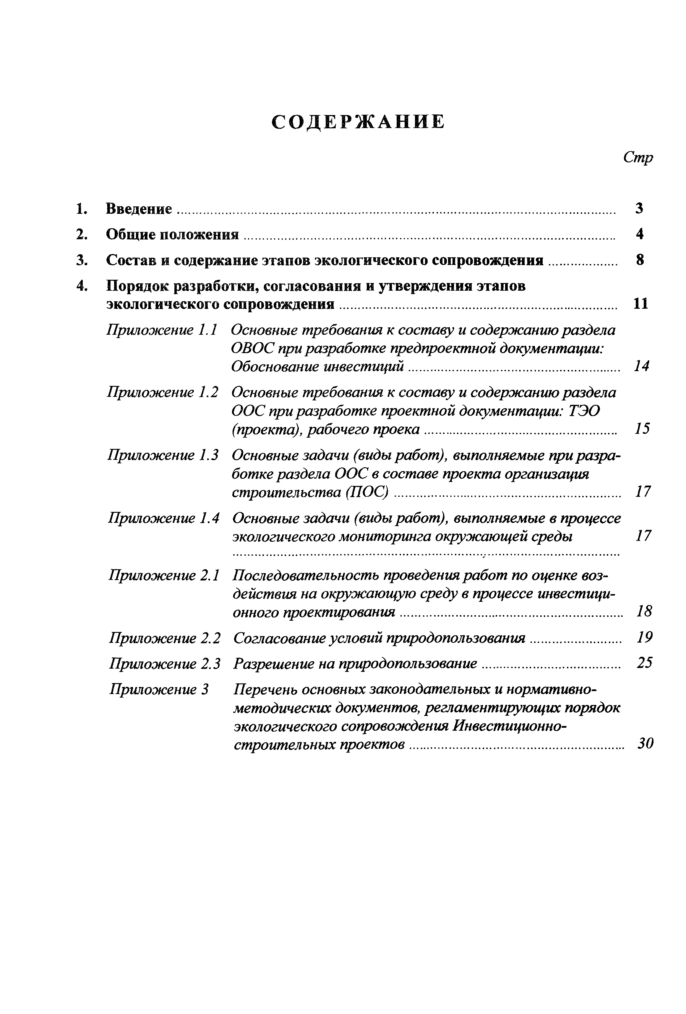 | Оглавление: | 1 Введение 2 Общие положения 3 Состав и содержание этапов экологического сопровождения 4 Порядок разработки, согласования и утверждения этапов экологического сопровождения Приложение 1.1 Основные требования к составу и содержанию раздела ОВОС при разработке предпроектной документации: Обоснование инвестиций Приложение 1.2 Основные требования к составу и содержанию раздела ООС при разработке предпроектной документации: ТЭО (проекта), рабочего проекта Приложение 1.3 Основные задачи (виды работ), выполняемые при разработке раздела ООС в составе проекта организация строительства (ПОС) Приложение 1.4 Основные задачи (виды работ), выполняемые в процессе экологического мониторинга окружающей среды Приложение 2.1 Последовательность проведения работ по оценке воздействия на окружающую среду в процессе инвестиционного проектирования Приложение 2.2 Согласование условий природопользования Приложение 2.3 Разре6шение на природопользование Приложение 3 Перечень основных законодательных и нормативно-методических документов, регламентирующих порядок экологического сопровождения Инвестиционно-строительных проектов |