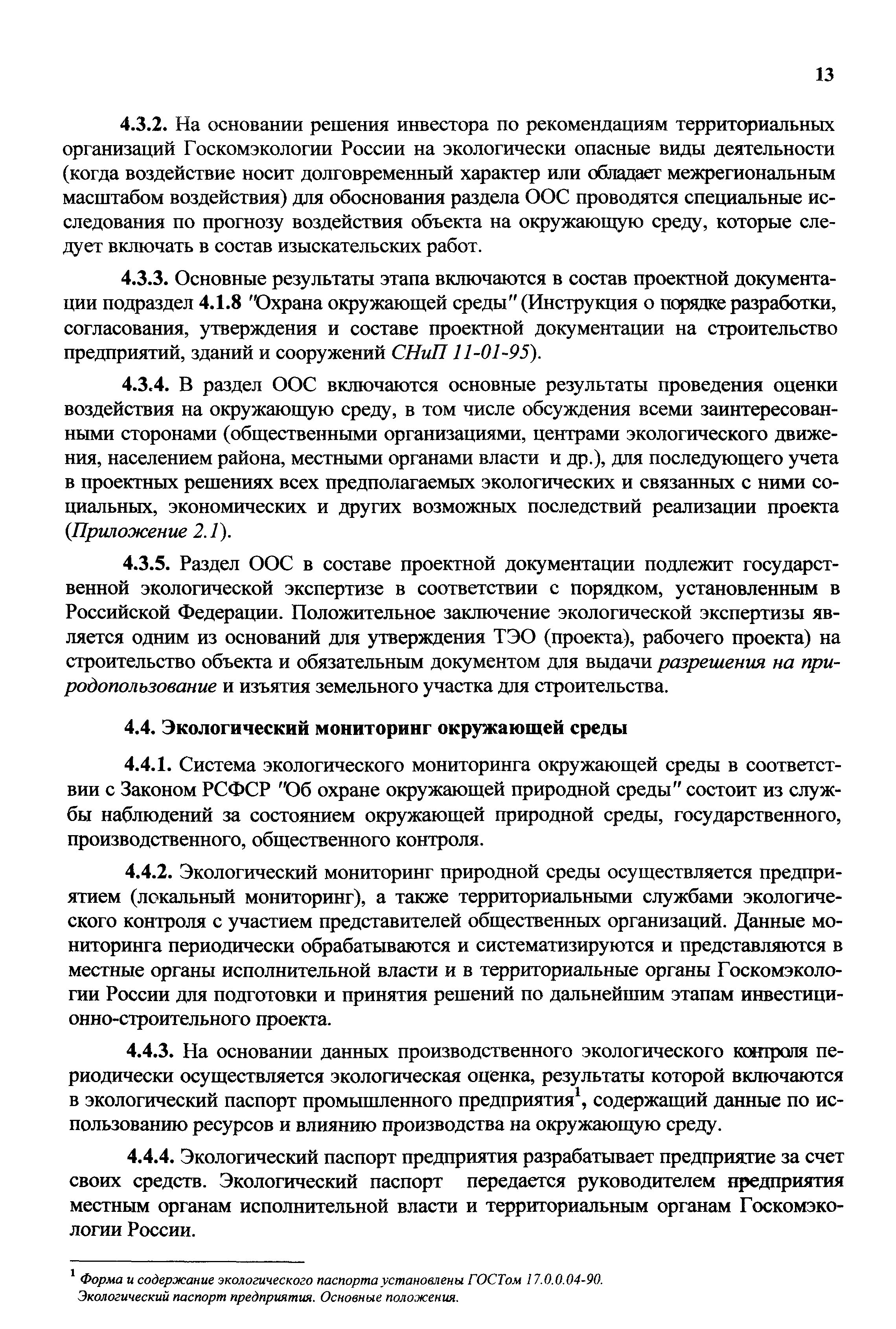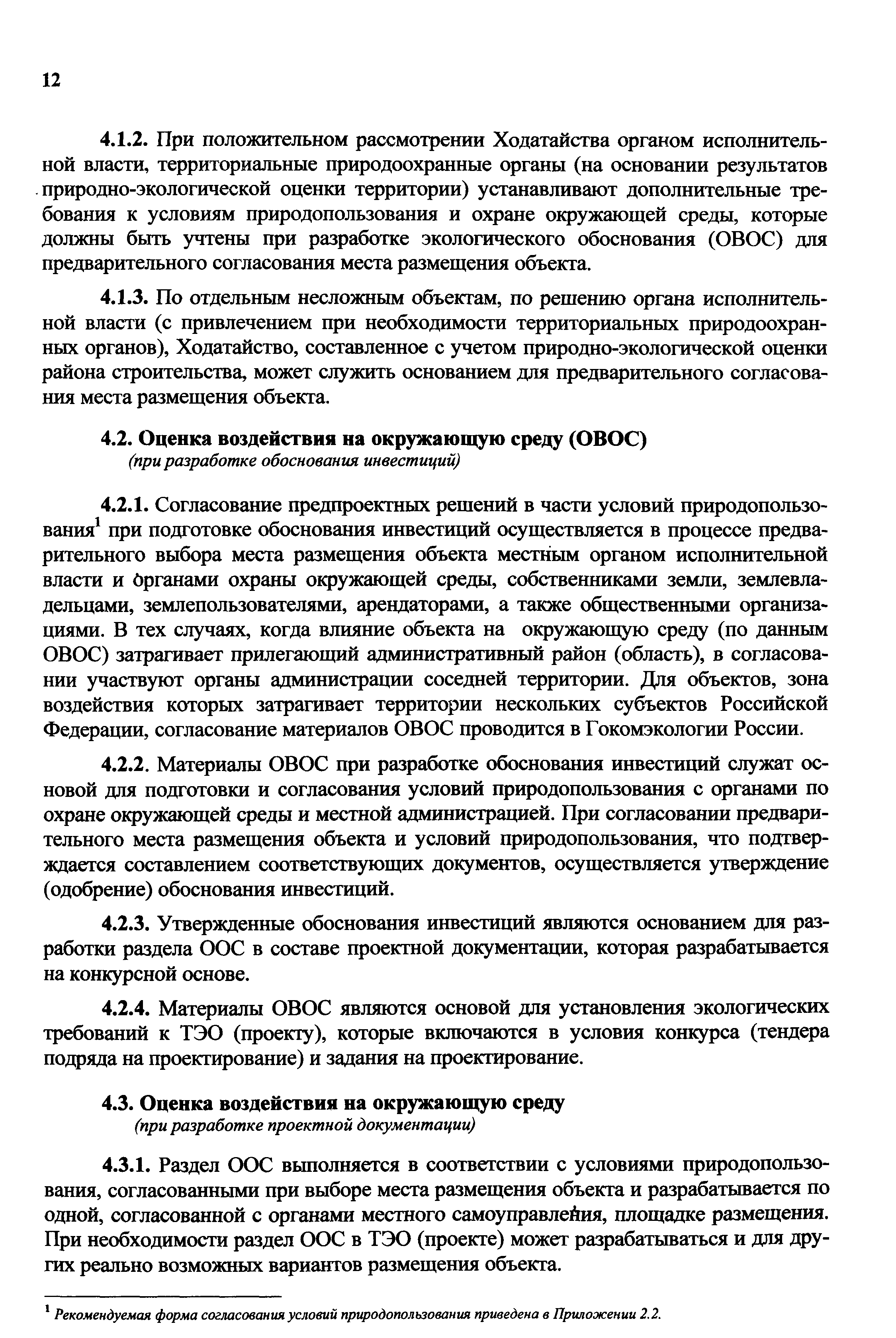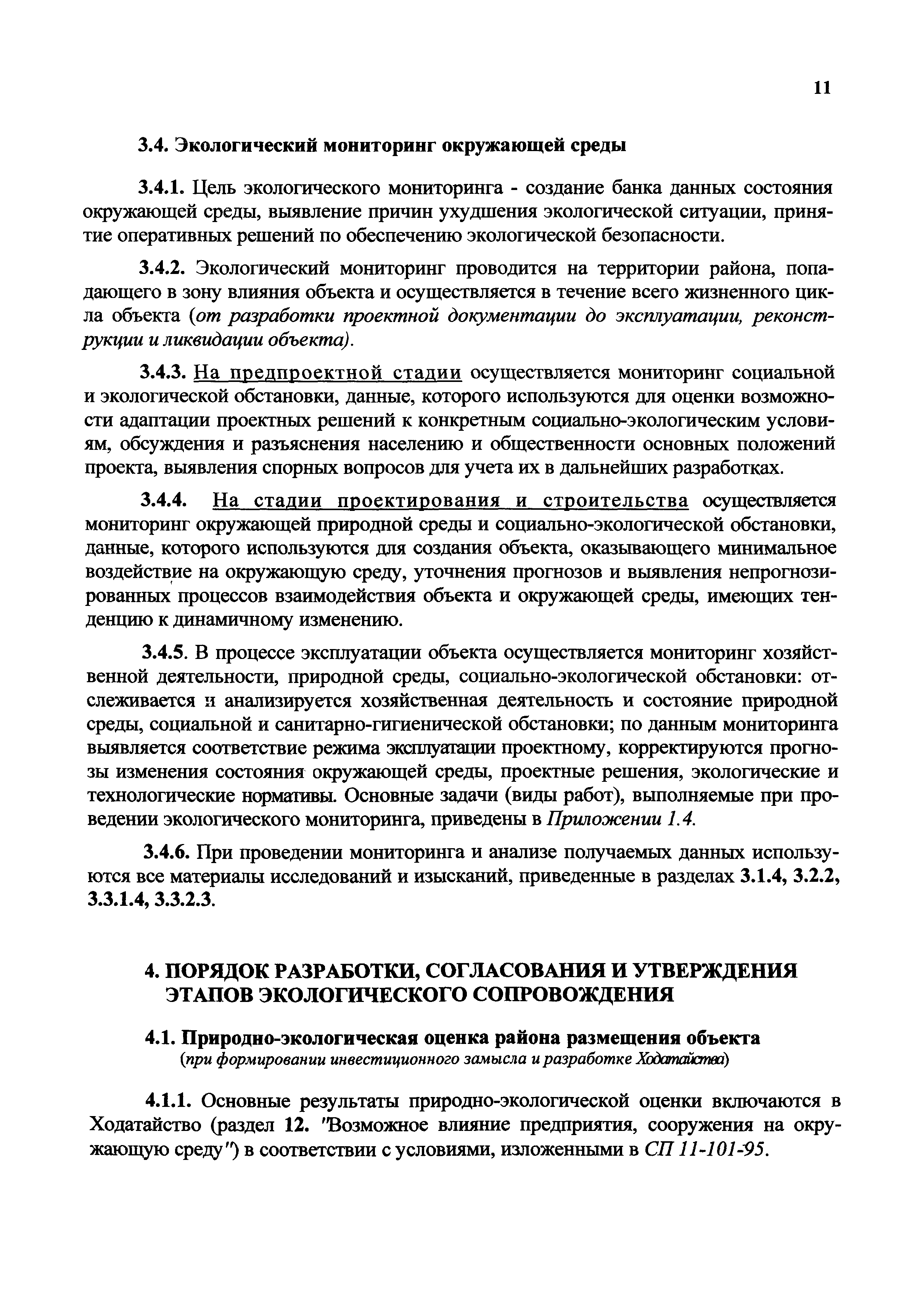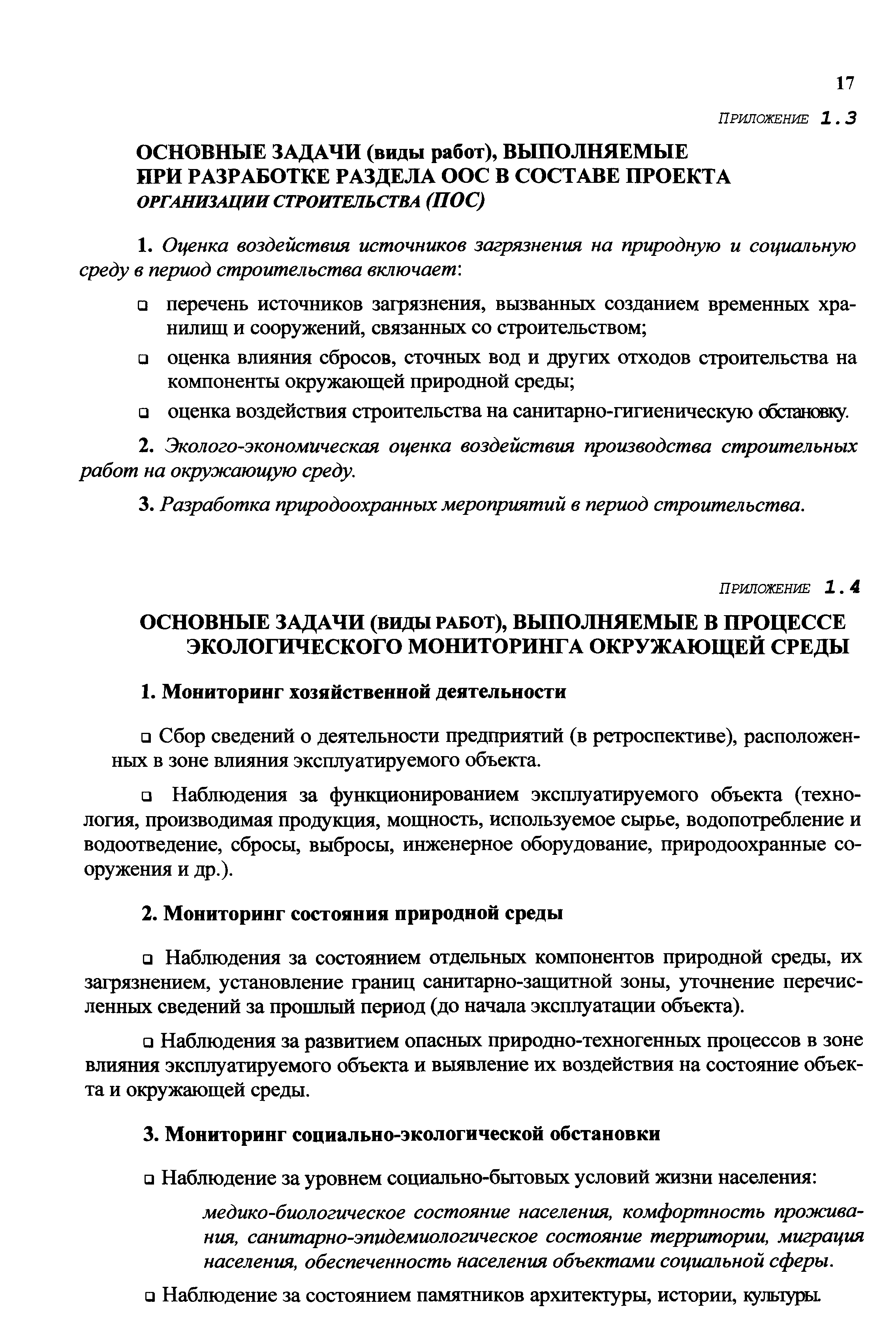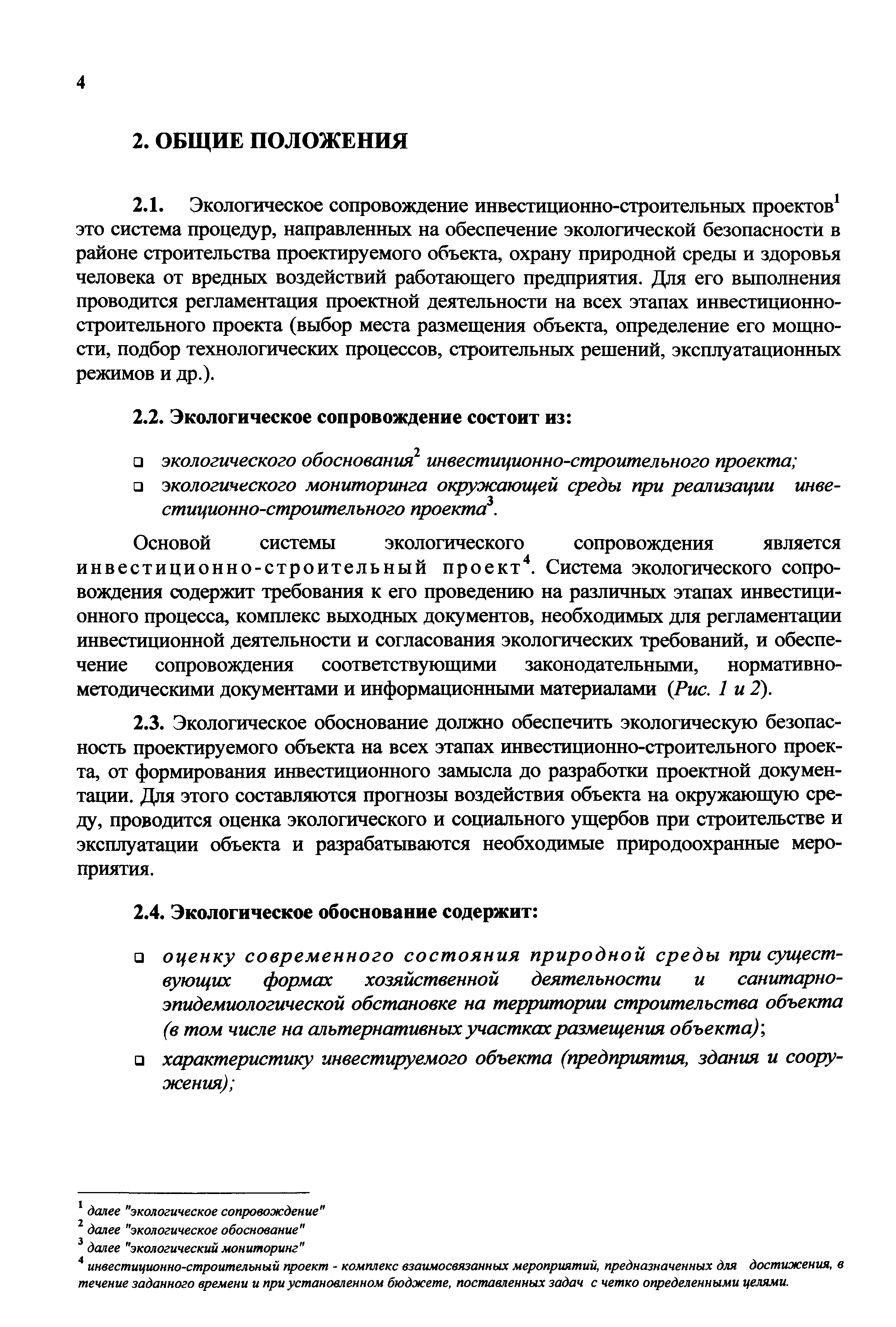 | Оглавление: | 1 Введение 2 Общие положения 3 Состав и содержание этапов экологического сопровождения 4 Порядок разработки, согласования и утверждения этапов экологического сопровождения Приложение 1.1 Основные требования к составу и содержанию раздела ОВОС при разработке предпроектной документации: Обоснование инвестиций Приложение 1.2 Основные требования к составу и содержанию раздела ООС при разработке предпроектной документации: ТЭО (проекта), рабочего проекта Приложение 1.3 Основные задачи (виды работ), выполняемые при разработке раздела ООС в составе проекта организация строительства (ПОС) Приложение 1.4 Основные задачи (виды работ), выполняемые в процессе экологического мониторинга окружающей среды Приложение 2.1 Последовательность проведения работ по оценке воздействия на окружающую среду в процессе инвестиционного проектирования Приложение 2.2 Согласование условий природопользования Приложение 2.3 Разре6шение на природопользование Приложение 3 Перечень основных законодательных и нормативно-методических документов, регламентирующих порядок экологического сопровождения Инвестиционно-строительных проектов |