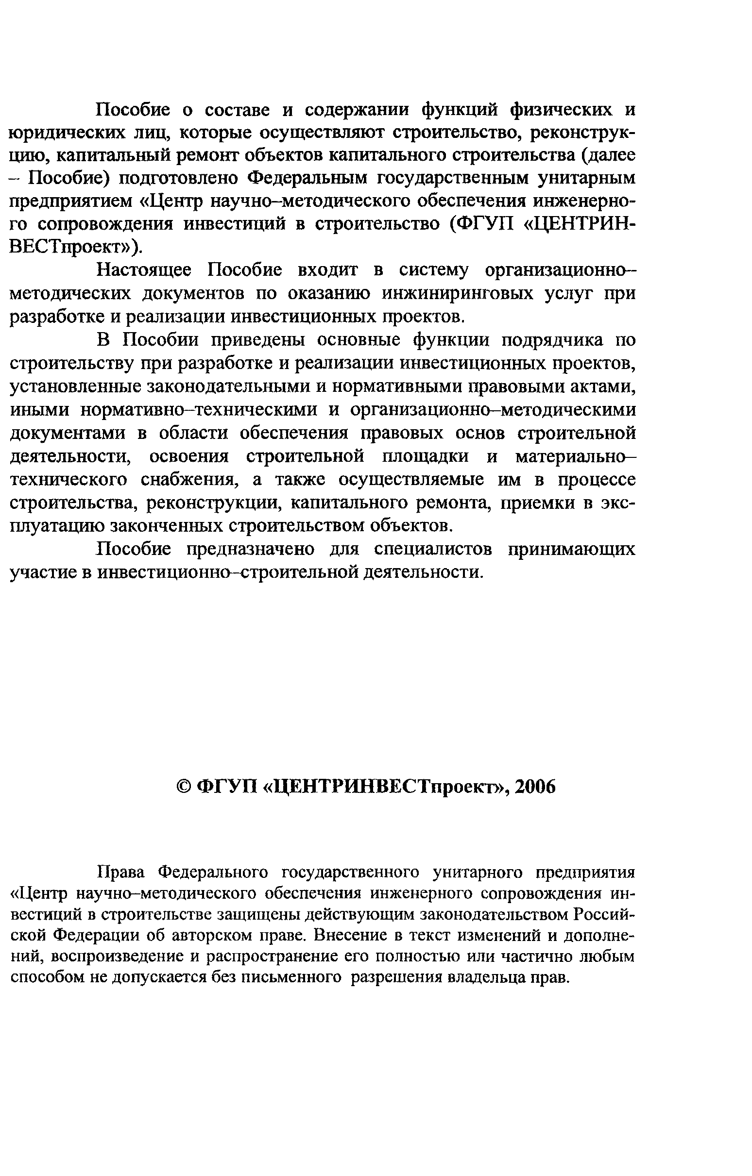 | Область применения: | Пособие содержит установленные законодательными и нормативными правовыми актами, а также иными нормативно-техническими документами основные функции физических или юридических лиц, осуществляющих строительство, реконструкцию, капитальный ремонт объектов капитального строительства при заключении договоров подряда, подготовки строительного производства и освоении строительной площадки, строительстве и вводе завершенных строительством объектов в эксплуатацию. |
