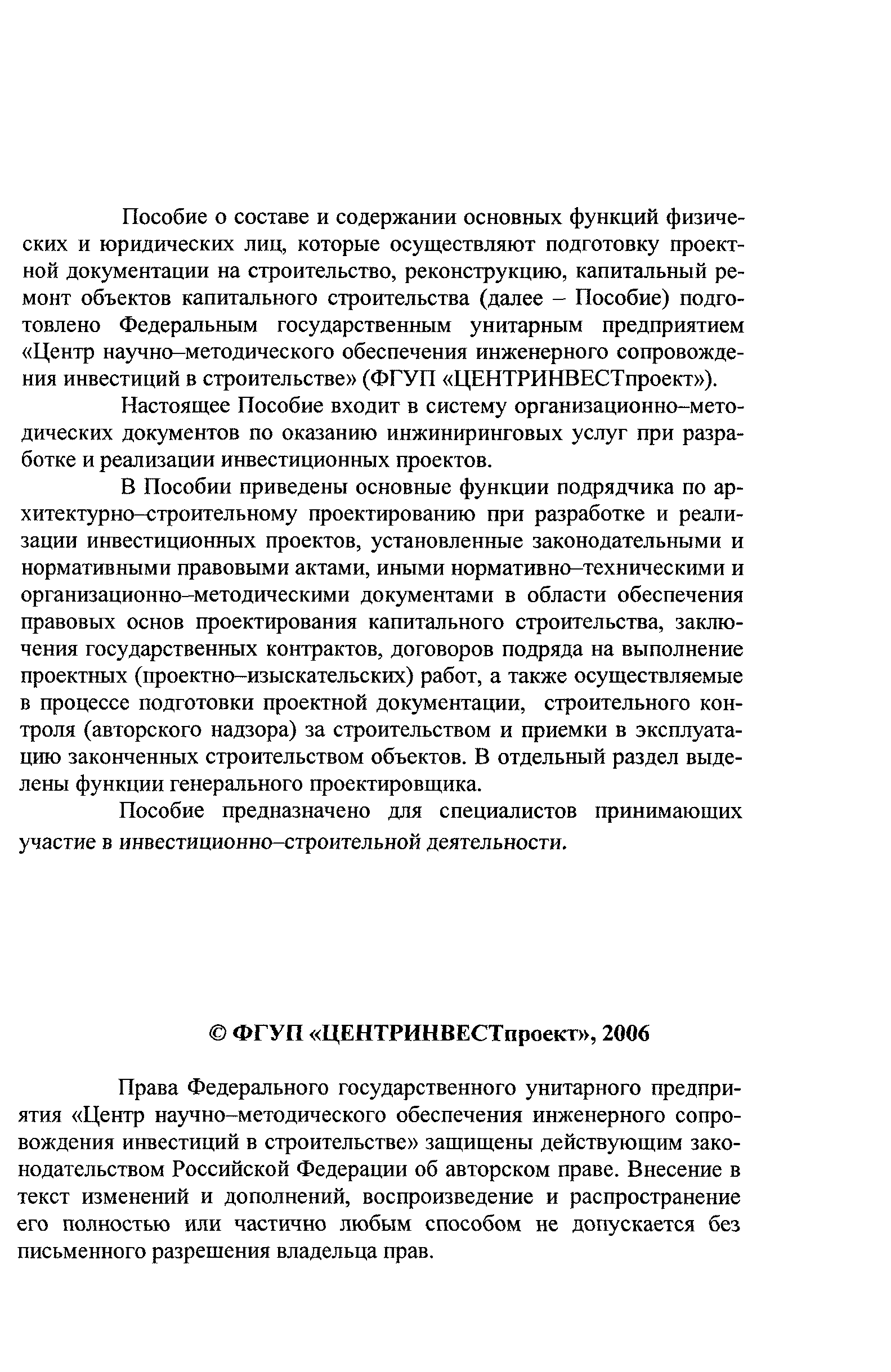 | Область применения: | Пособие содержит установленные законодательными и нормативными правовыми акткми основные функции физических или юридических лиц, осуществляющих архитектурно-строительное проектирование, строительный контроль (авторский надзор) в процессе строительства, реконструкции, капитального ремонта объекта и при вводе объекта в эксплуатацию. |
