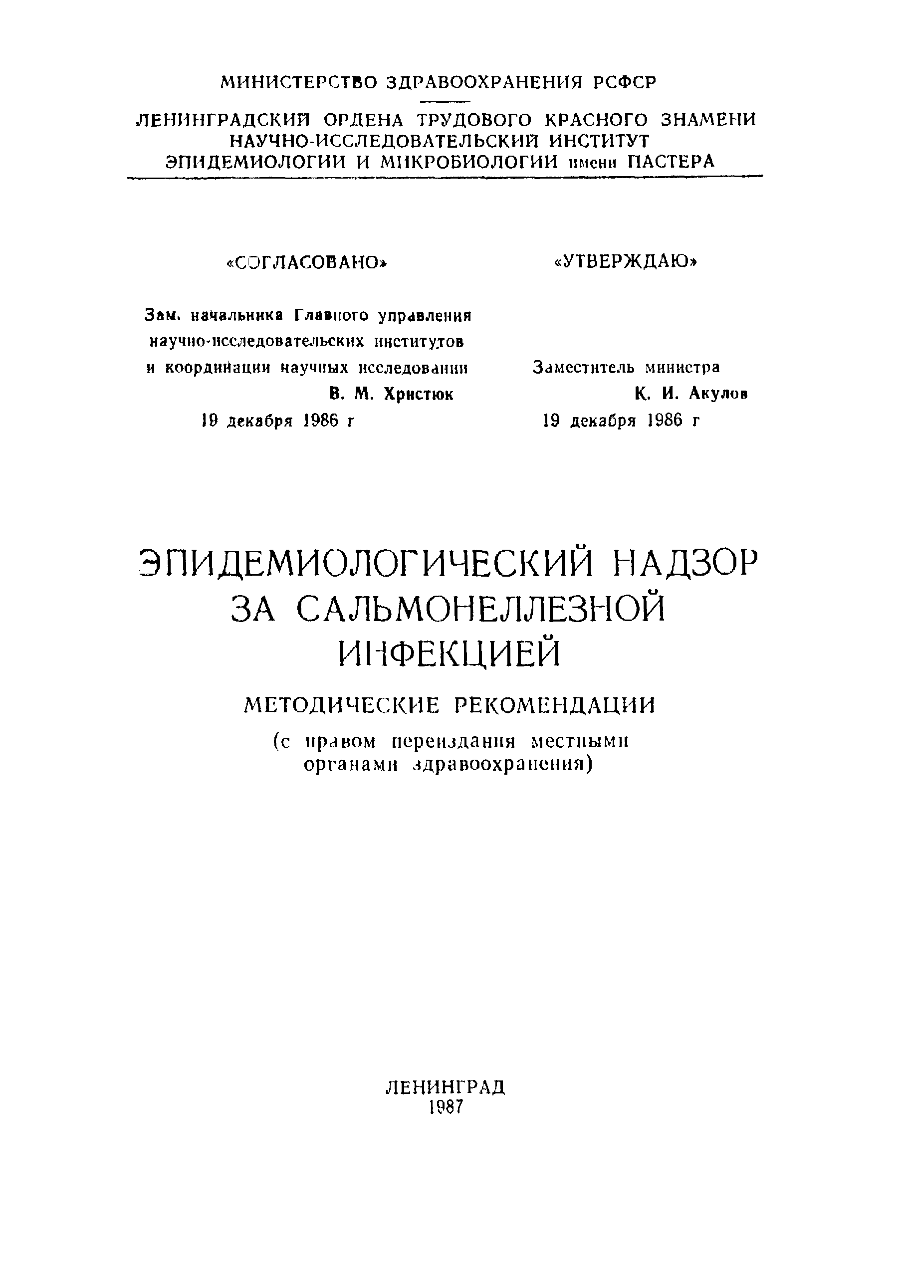 | Утверждён: | 19.12.1986 Министерство здравоохранения РСФСР (Russian Federation Ministry of Health Care )