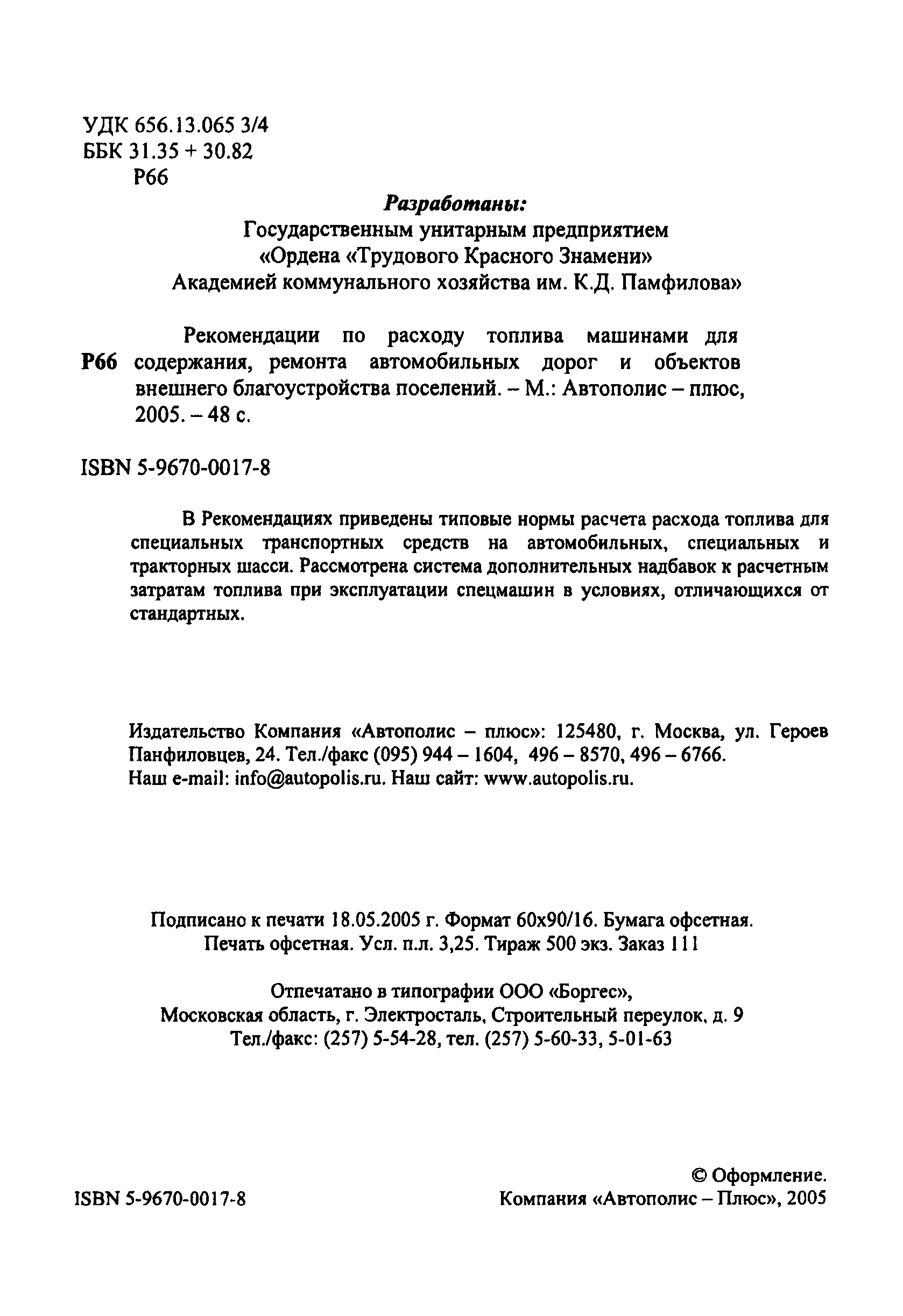 | Название рус.: | Рекомендации по расходу топлива машинами для содержания, ремонта автомобильных дорог и объектов внешнего благоустройства поселений |
