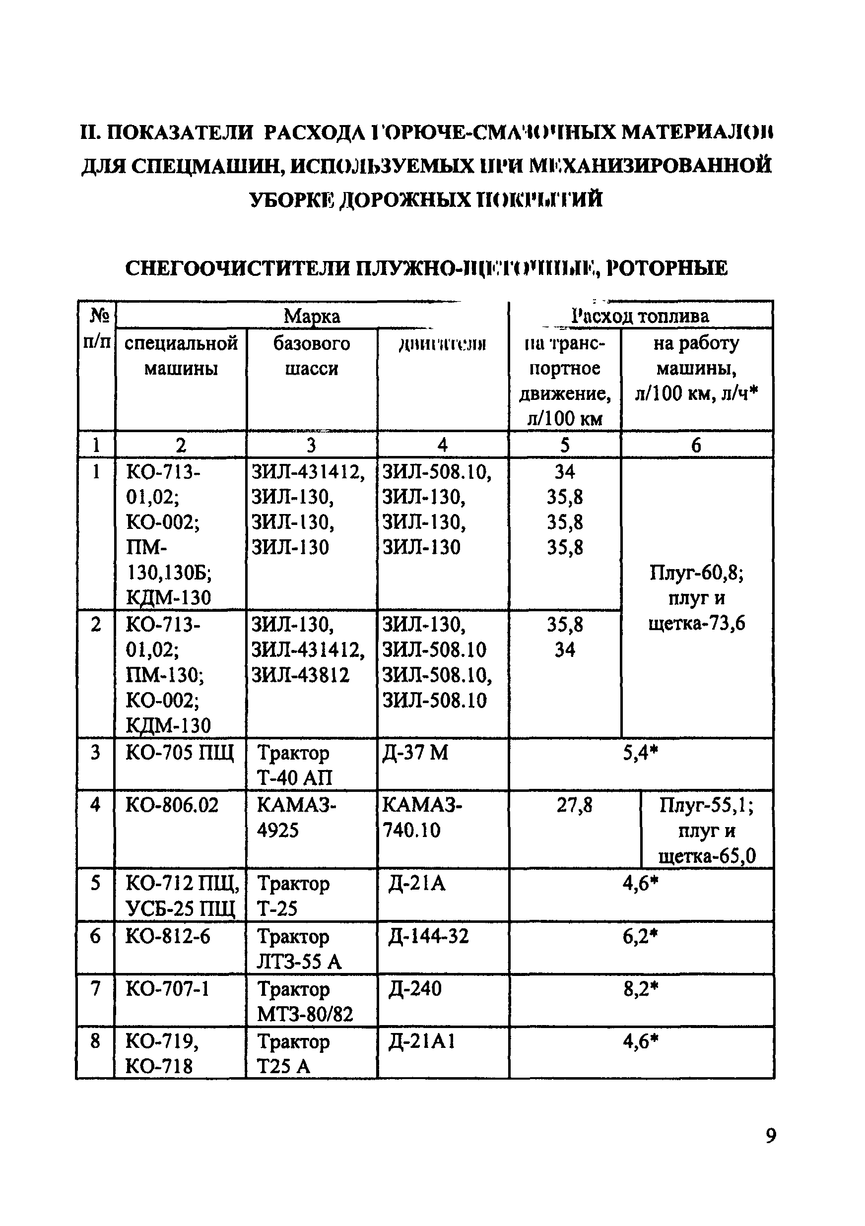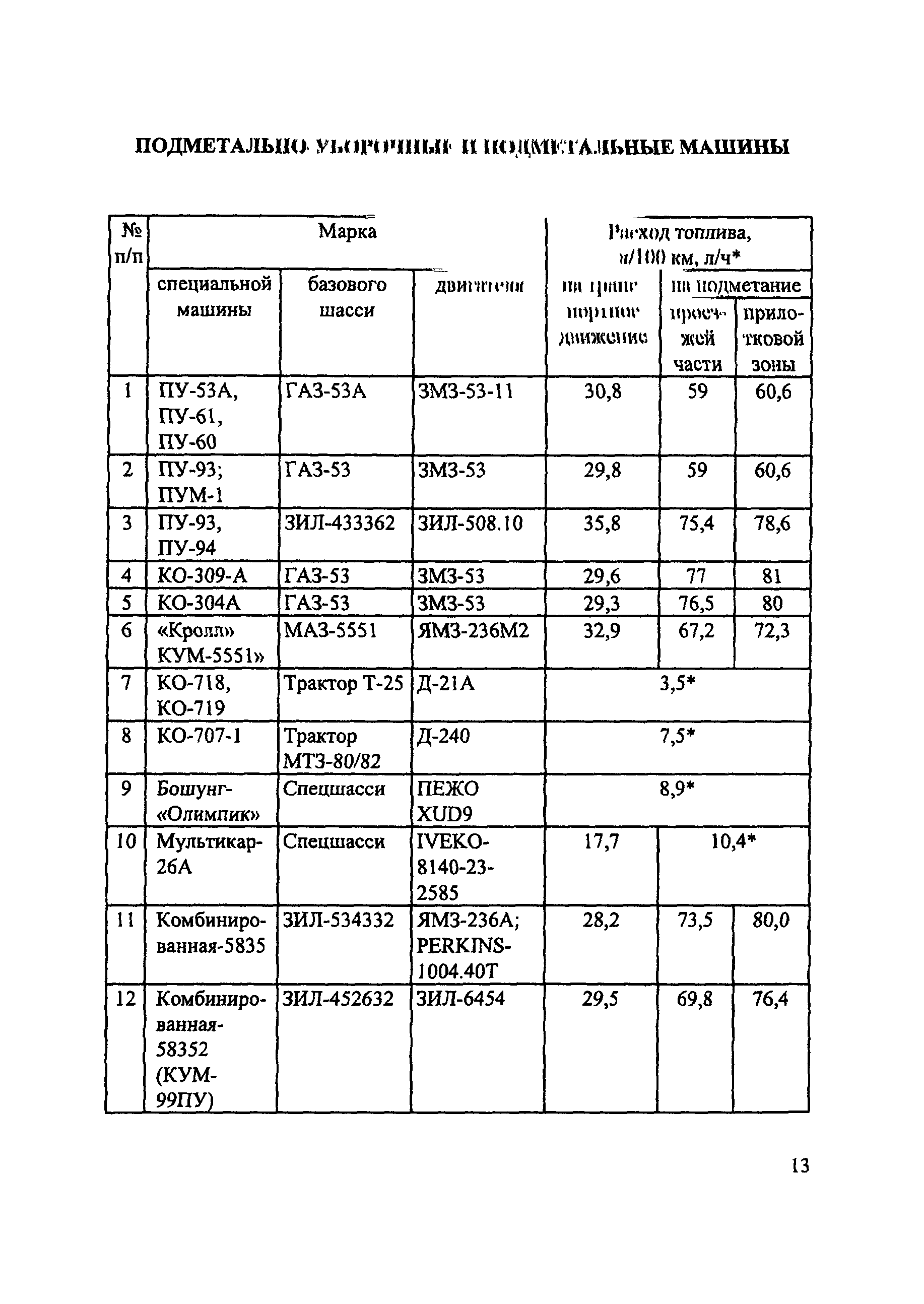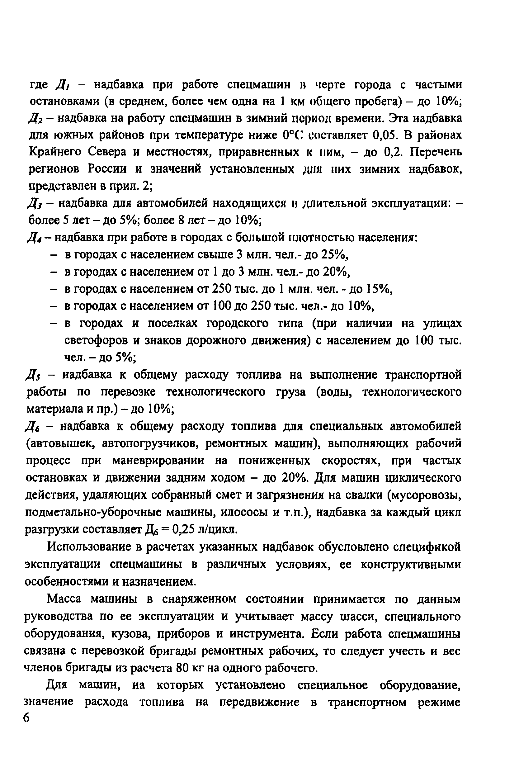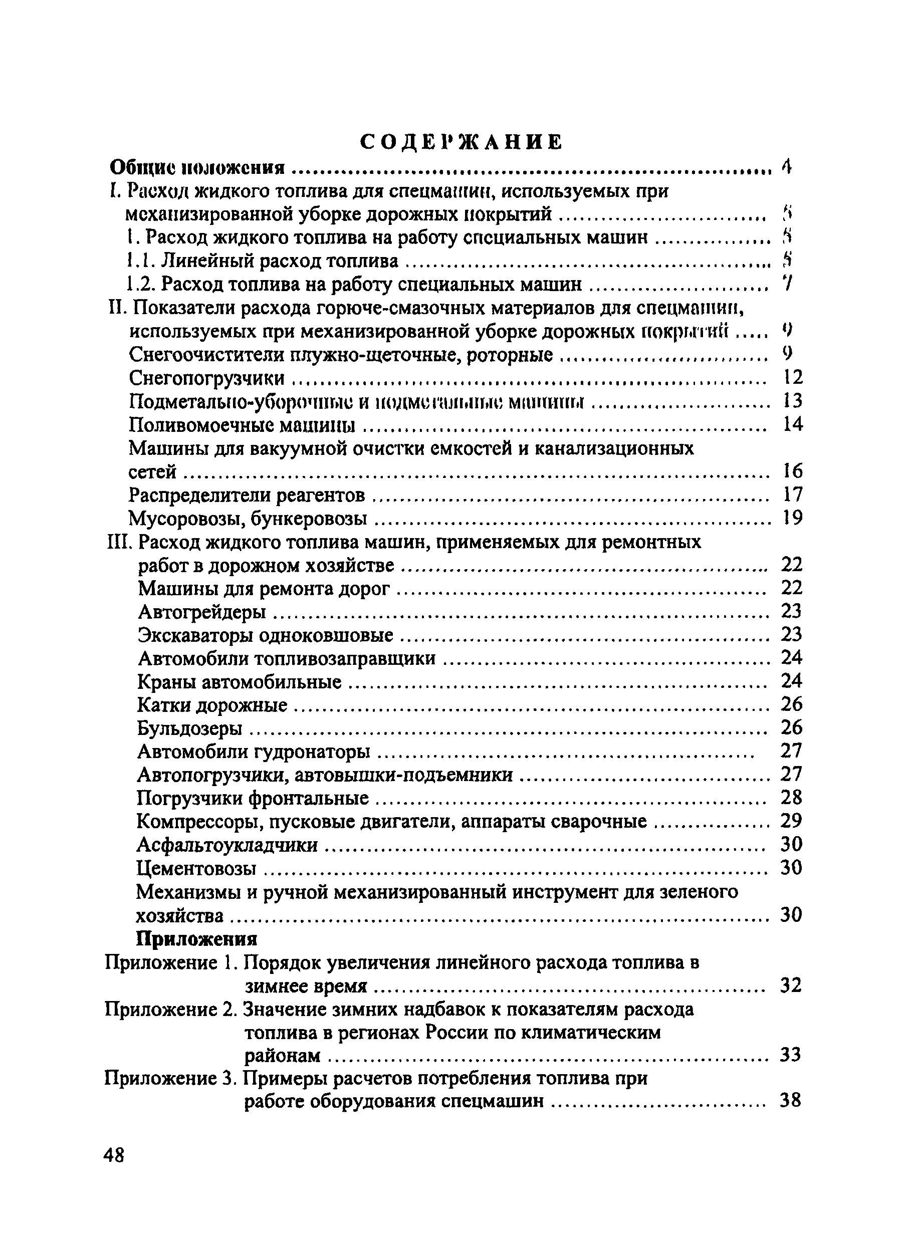 | Оглавление: | Общие положения 1 Расход жидкого топлива для спецмашин, используемых при механизированной уборке дорожных покрытий II Показатели расхода горюче-смазочных материалов для спецмашин, используемых при механизированной уборке дорожных покрытий III Расход жидкого топлива машин, применяемых для ремонтных работ в дорожном хозяйстве Приложение 1 Порядок увеличения линейного расхода топлива в зимнее время Приложение 2 Значение зимних надбавок к показателям расхода топлива в регионах России по климатическим районам Приложение 3 Примеры расчетов потребления топлива при работе оборудования спецмашин |