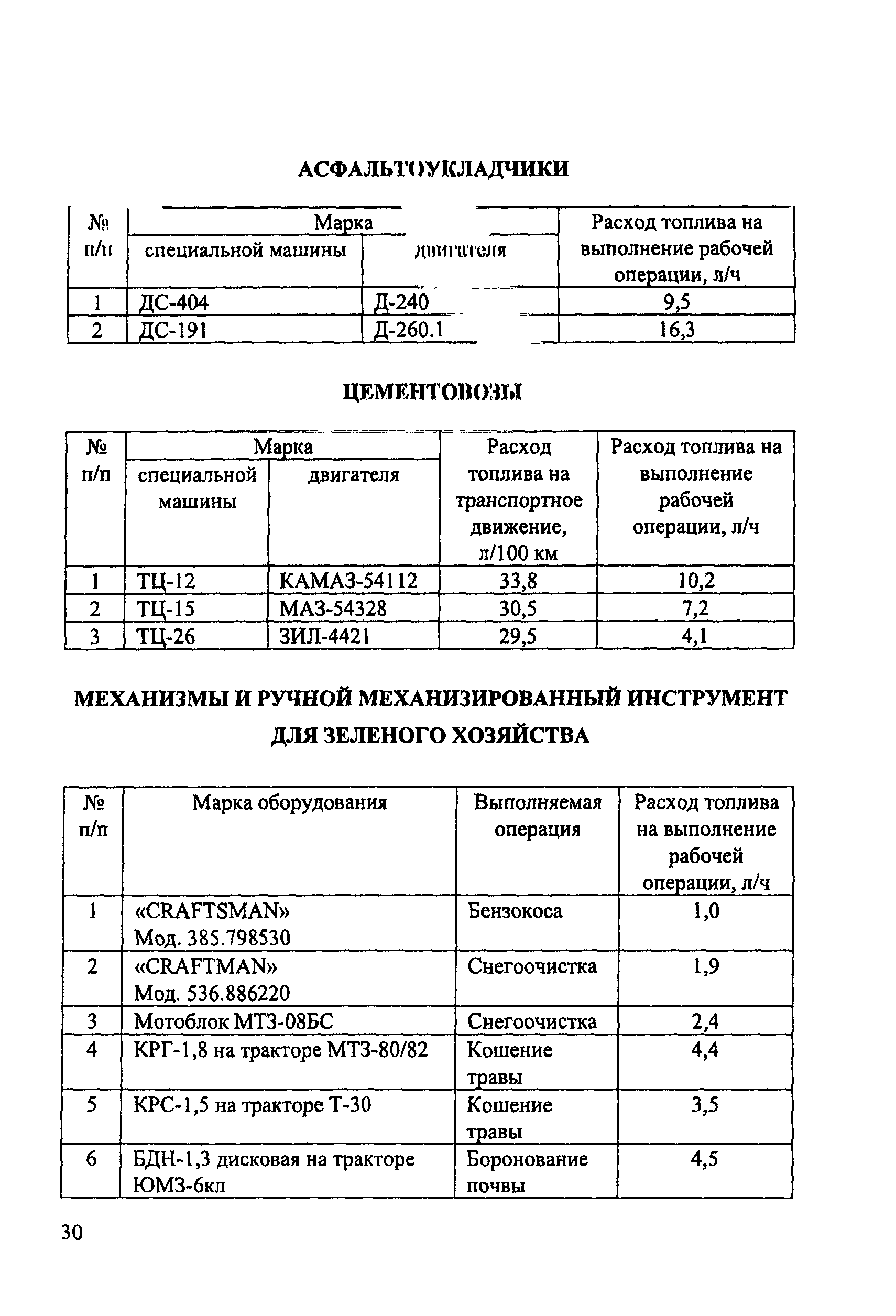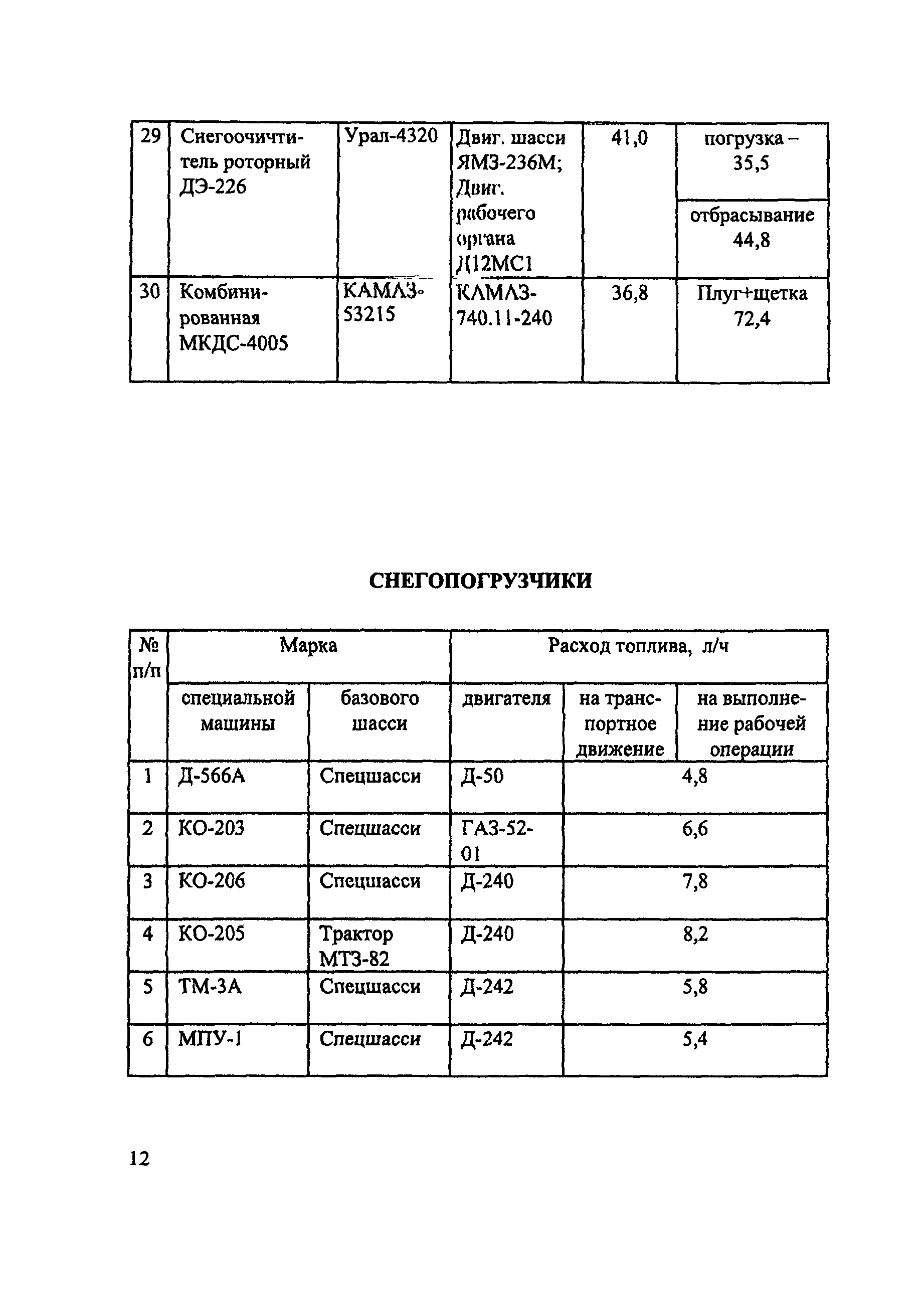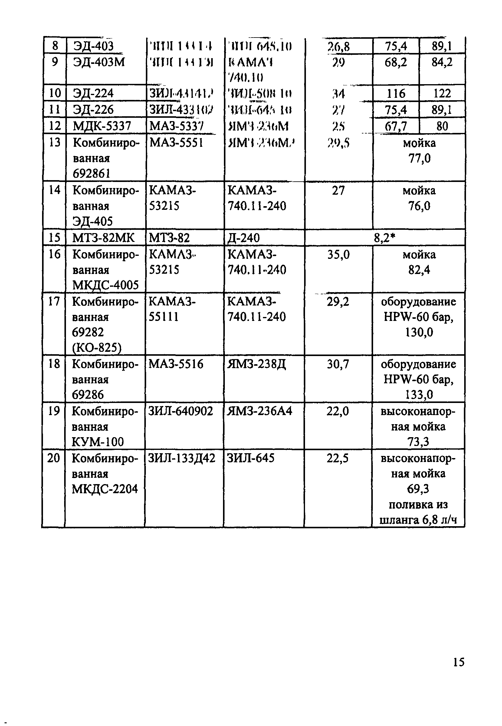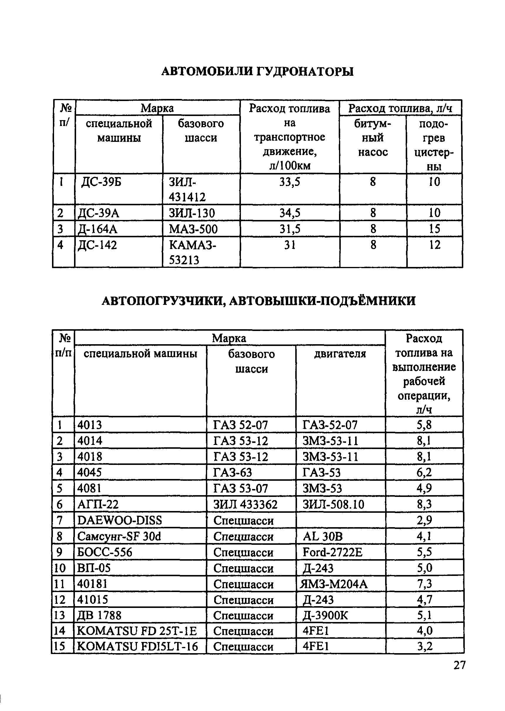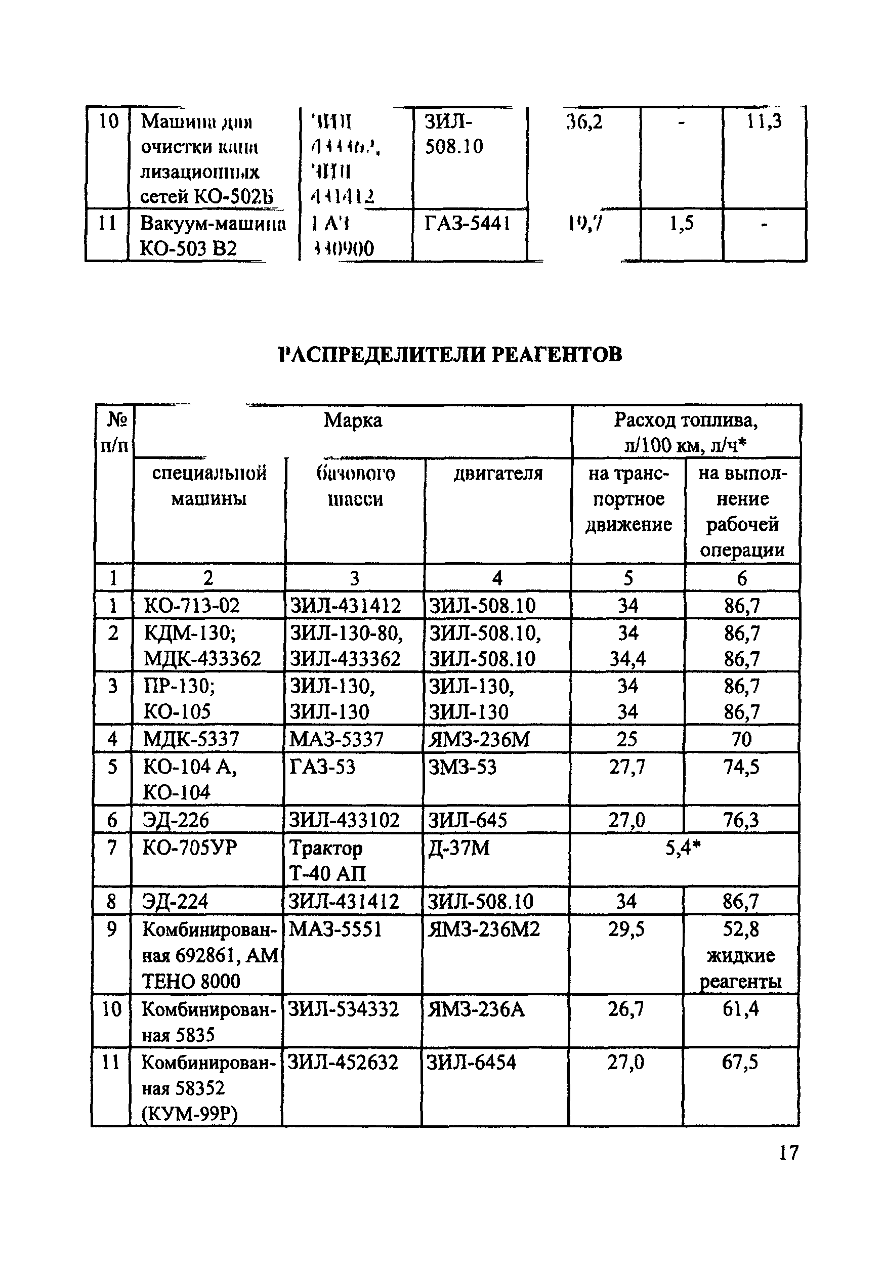 | Оглавление: | Общие положения 1 Расход жидкого топлива для спецмашин, используемых при механизированной уборке дорожных покрытий II Показатели расхода горюче-смазочных материалов для спецмашин, используемых при механизированной уборке дорожных покрытий III Расход жидкого топлива машин, применяемых для ремонтных работ в дорожном хозяйстве Приложение 1 Порядок увеличения линейного расхода топлива в зимнее время Приложение 2 Значение зимних надбавок к показателям расхода топлива в регионах России по климатическим районам Приложение 3 Примеры расчетов потребления топлива при работе оборудования спецмашин |