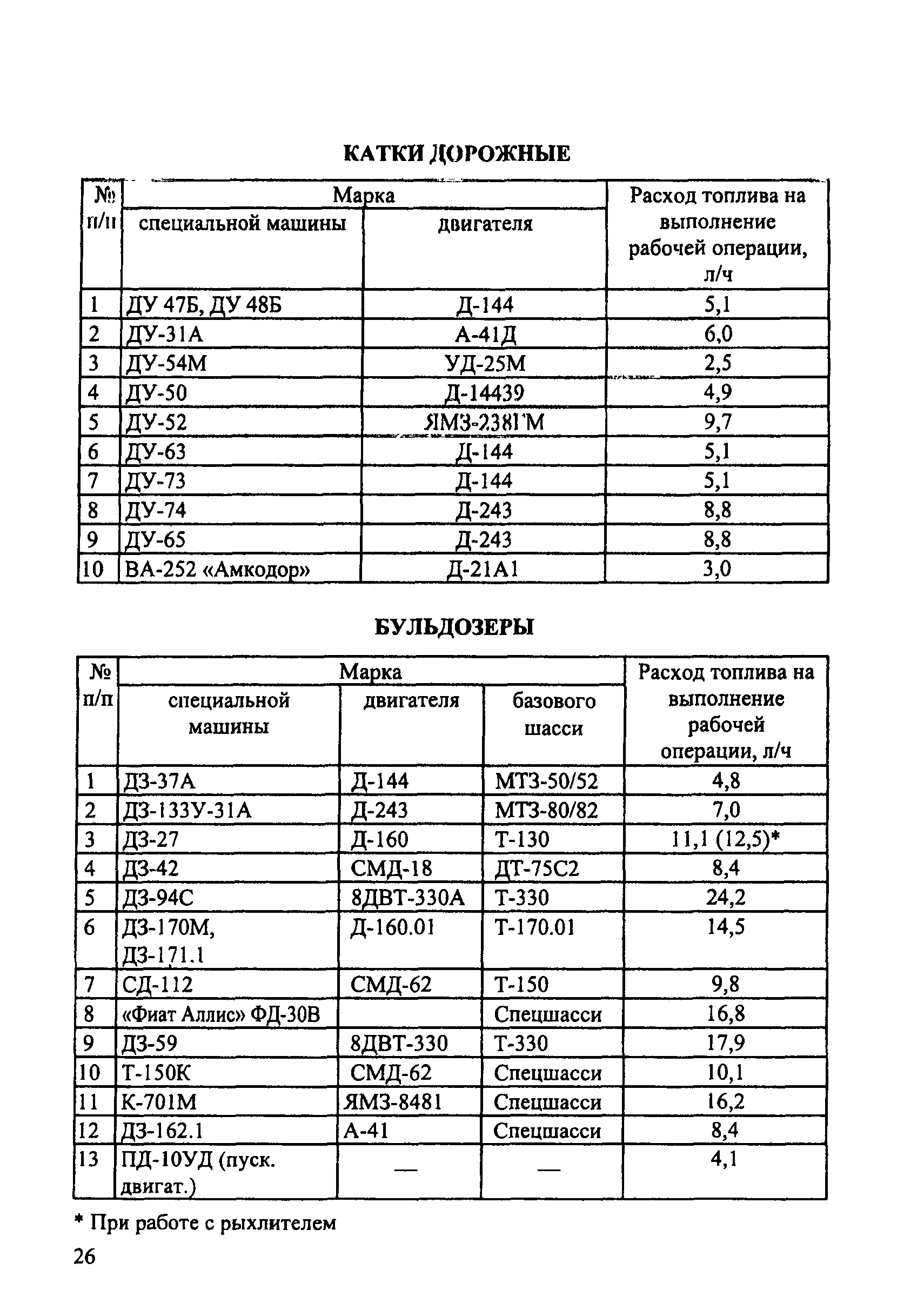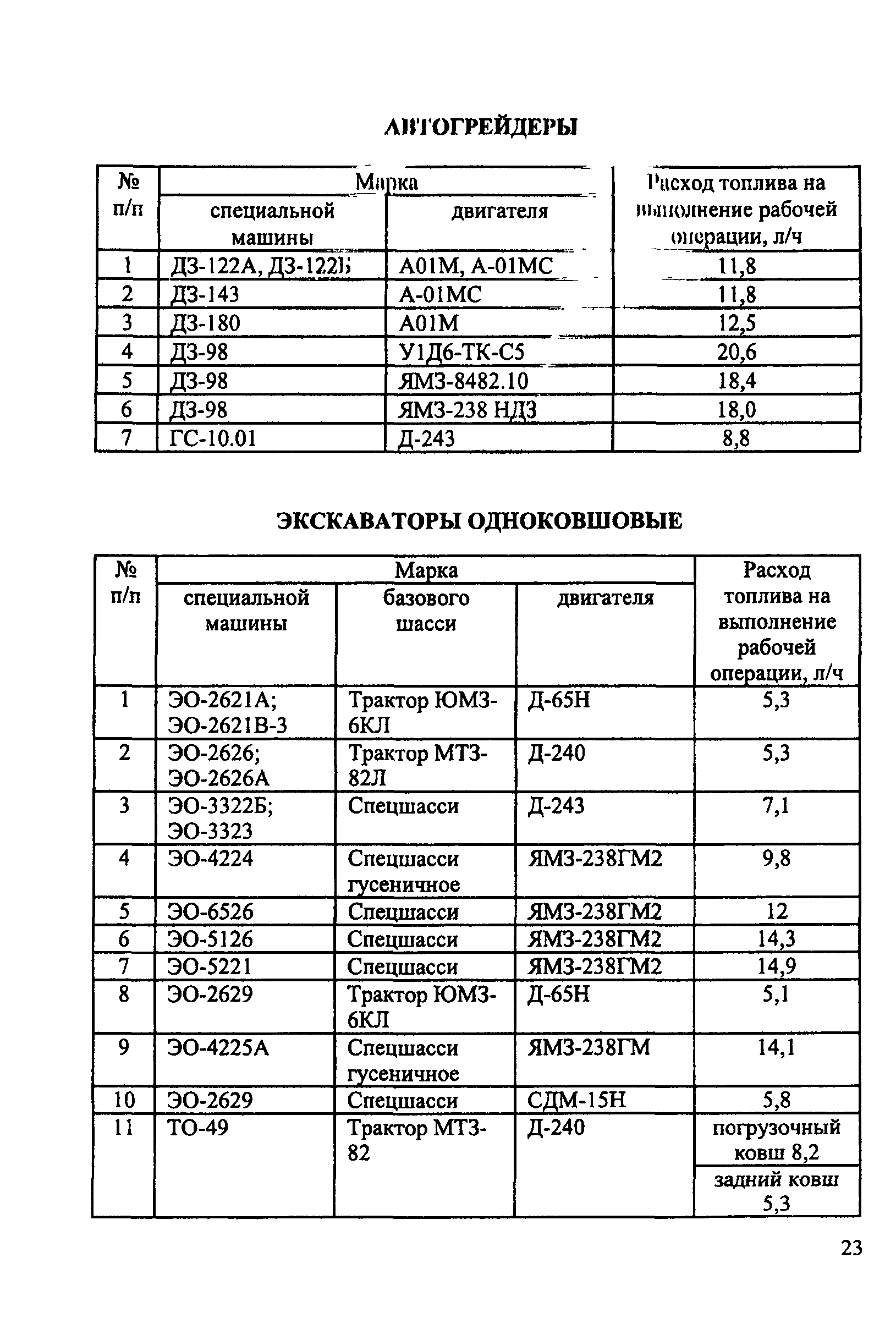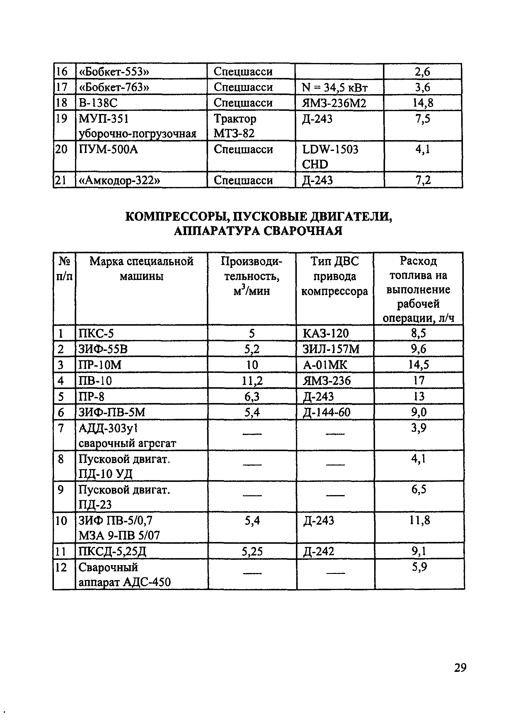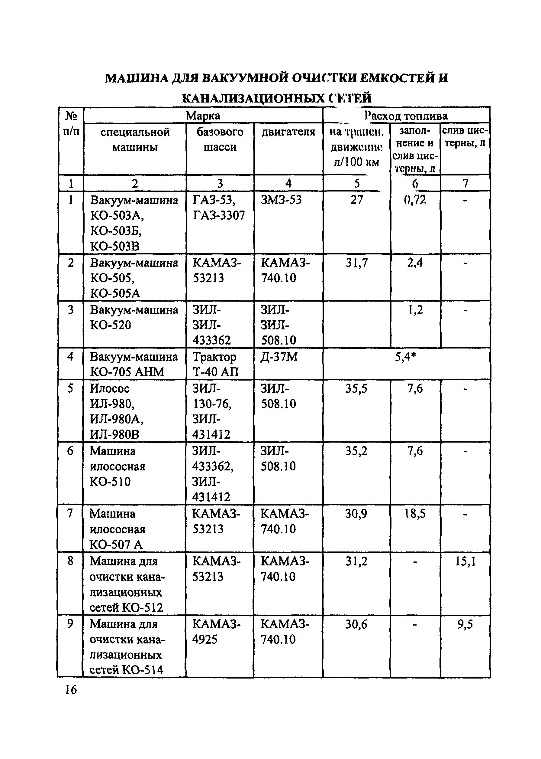 | Оглавление: | Общие положения 1 Расход жидкого топлива для спецмашин, используемых при механизированной уборке дорожных покрытий II Показатели расхода горюче-смазочных материалов для спецмашин, используемых при механизированной уборке дорожных покрытий III Расход жидкого топлива машин, применяемых для ремонтных работ в дорожном хозяйстве Приложение 1 Порядок увеличения линейного расхода топлива в зимнее время Приложение 2 Значение зимних надбавок к показателям расхода топлива в регионах России по климатическим районам Приложение 3 Примеры расчетов потребления топлива при работе оборудования спецмашин |