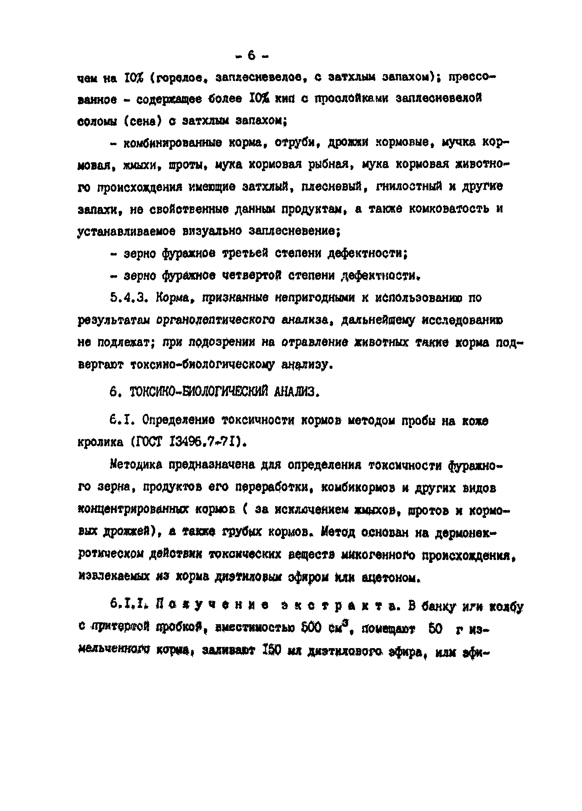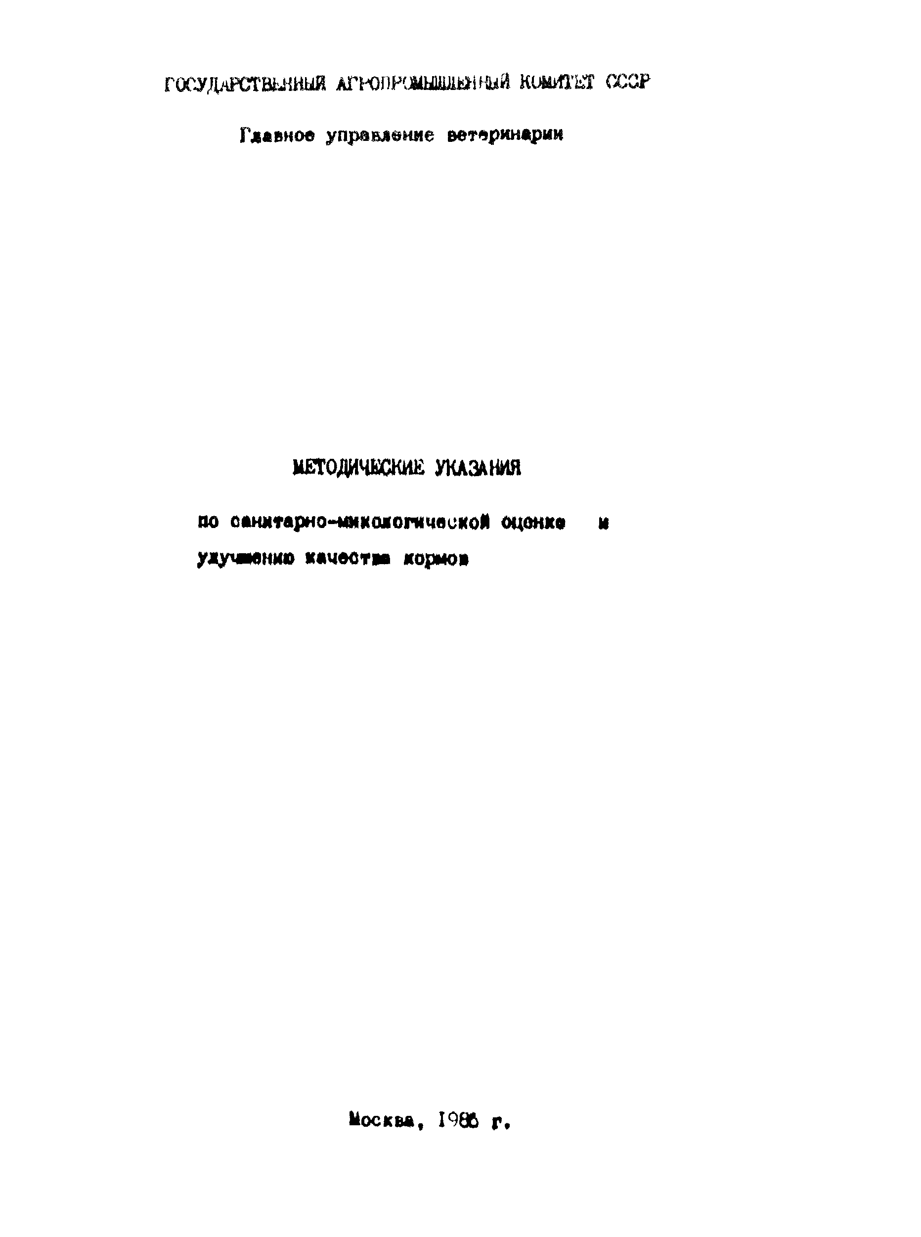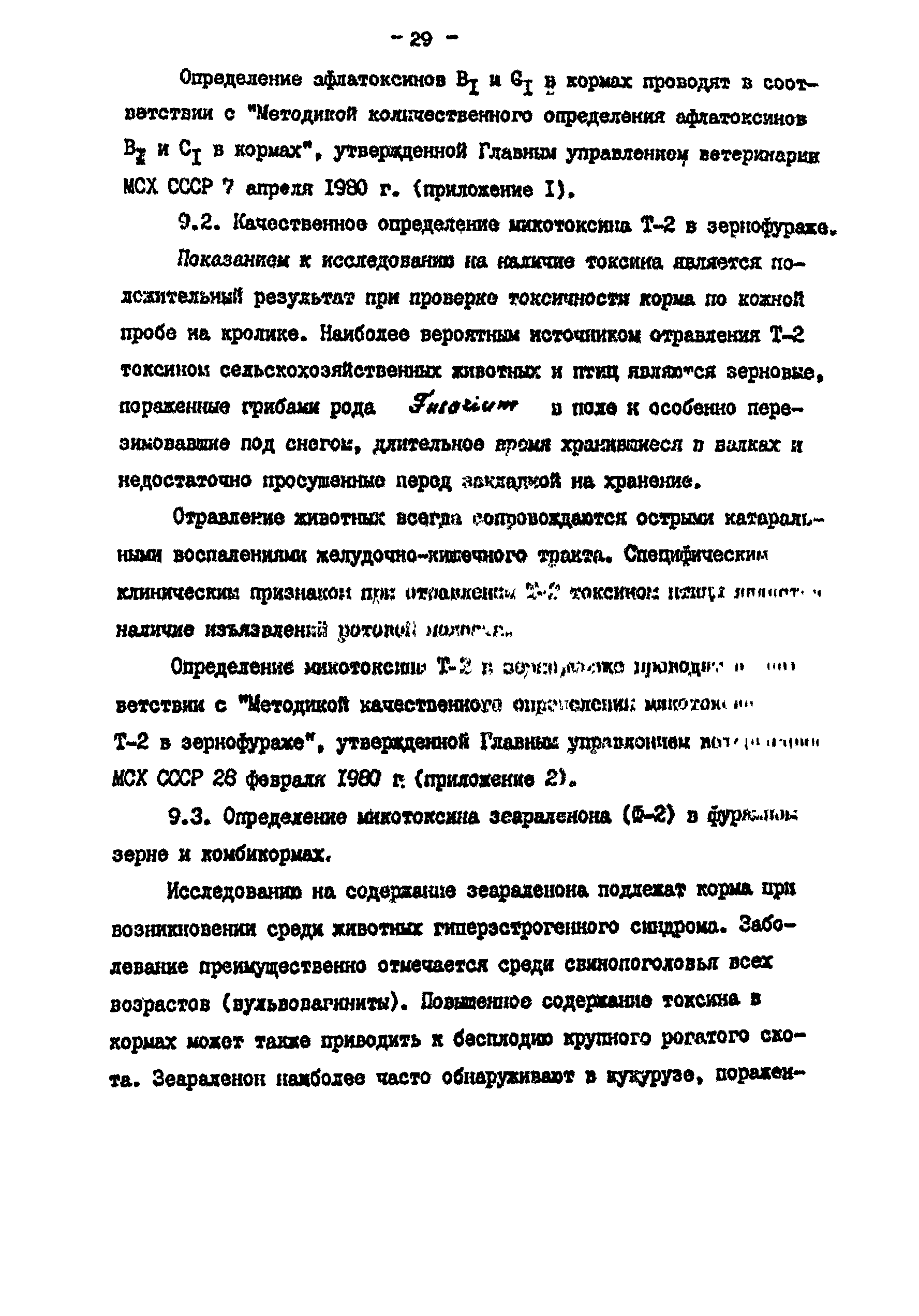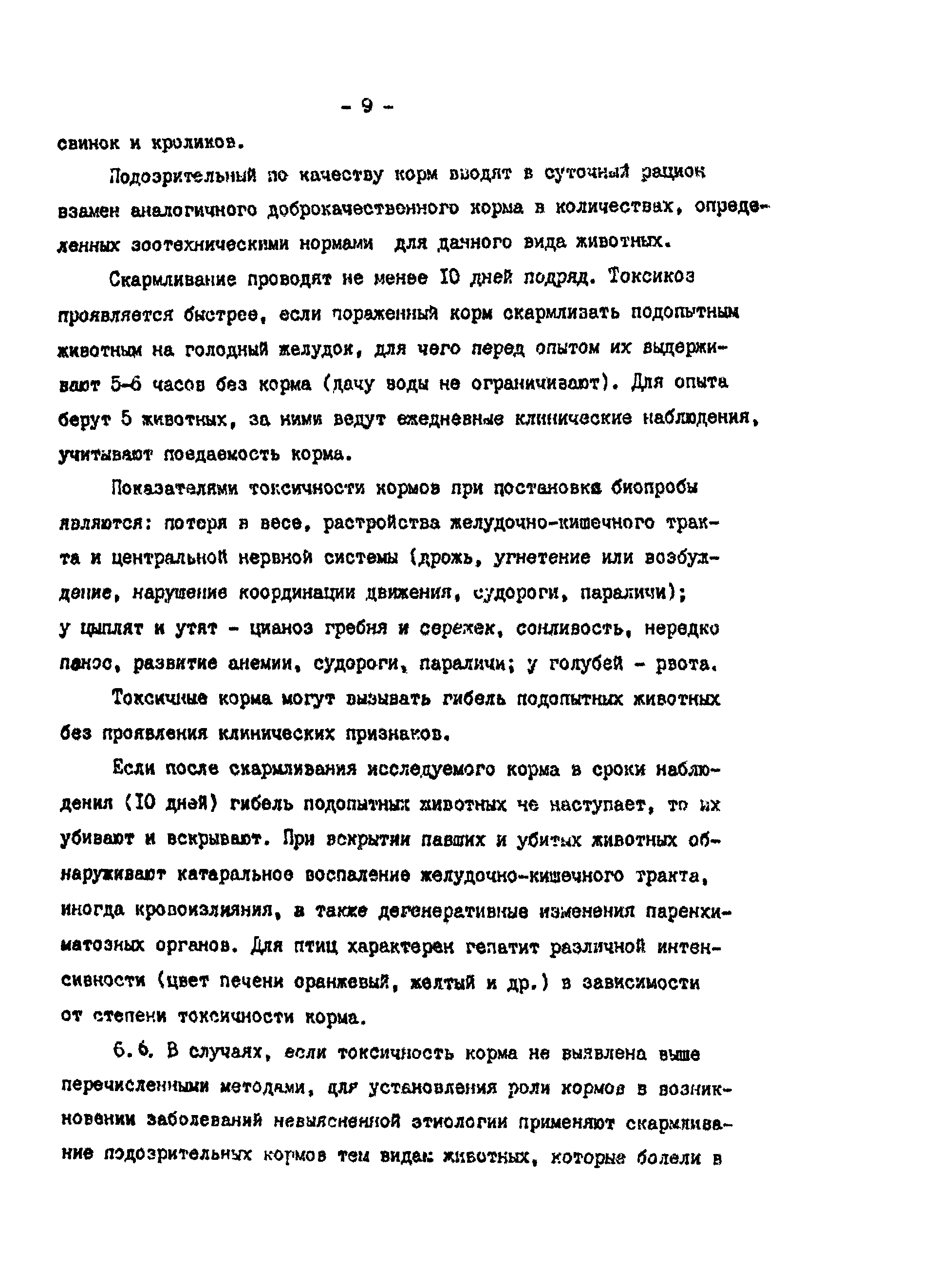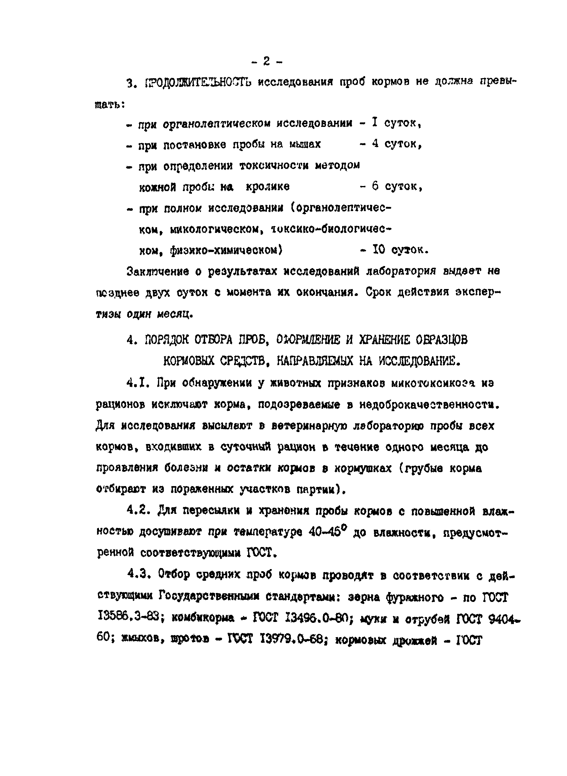 Указания не распространяются на пищевые отходы, премиксы, БВД, травяную муку, новые кормовые средства, находящиеся в стадии производственной апробации или кормовые средства, не имеющие показателей санитарной оценки. | | Оглавление: | 1. Общее положение 2. Исследование кормов 3. Продолжительность исследования проб кормов 4. Порядок отбора проб, оформление и хранение образцов кормовых средств, направляемых на исследование 5. Органолептический анализ 6. Токсико-биологический анализ 7. Микологический анализ 8. Определение токсичности культур грибов 8.1. Определение токсичности культур грибов на простейших Раrаmаеium саudаtum 8.2. Определение токсичности культур грибов методом кожной пробы на кролике 9. Физико-химический анализ 10. Порядок использования некондиционных кормов 10.1. Грубые корма (сено, солома, полова) 10.2. Комбинированные корма 10.3. Концентрированные корма Приложение 1 Методика количественного определения афлатоксинов В1 и С1 в кормах Приложение 2 Методика качественного определения микотоксина Т-2 в зернофураже Приложение 3 Методика определения мекотоксина зеараленона (Ф-2) в фуражном зерне и комбикормах Приложение 4 Обработка некондиционных кормов Приложение 5 Методика определения токсичности фуражного зерна, продуктов его переработки и комбикормов Приложение 6 Методика определения токсичности шротов, жмыхов и кормовых дрожжей Приложение 7 Питательные среды для культивирования грибов Приложение 8 Среды для культивирования парамеций | | Утверждён: | 25.02.1985 Минсельхоз СССР (USSR Minselkhoz )