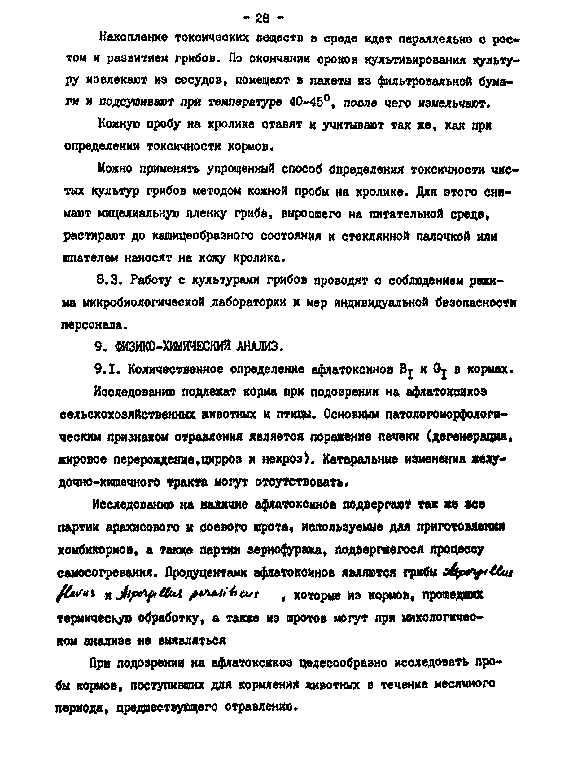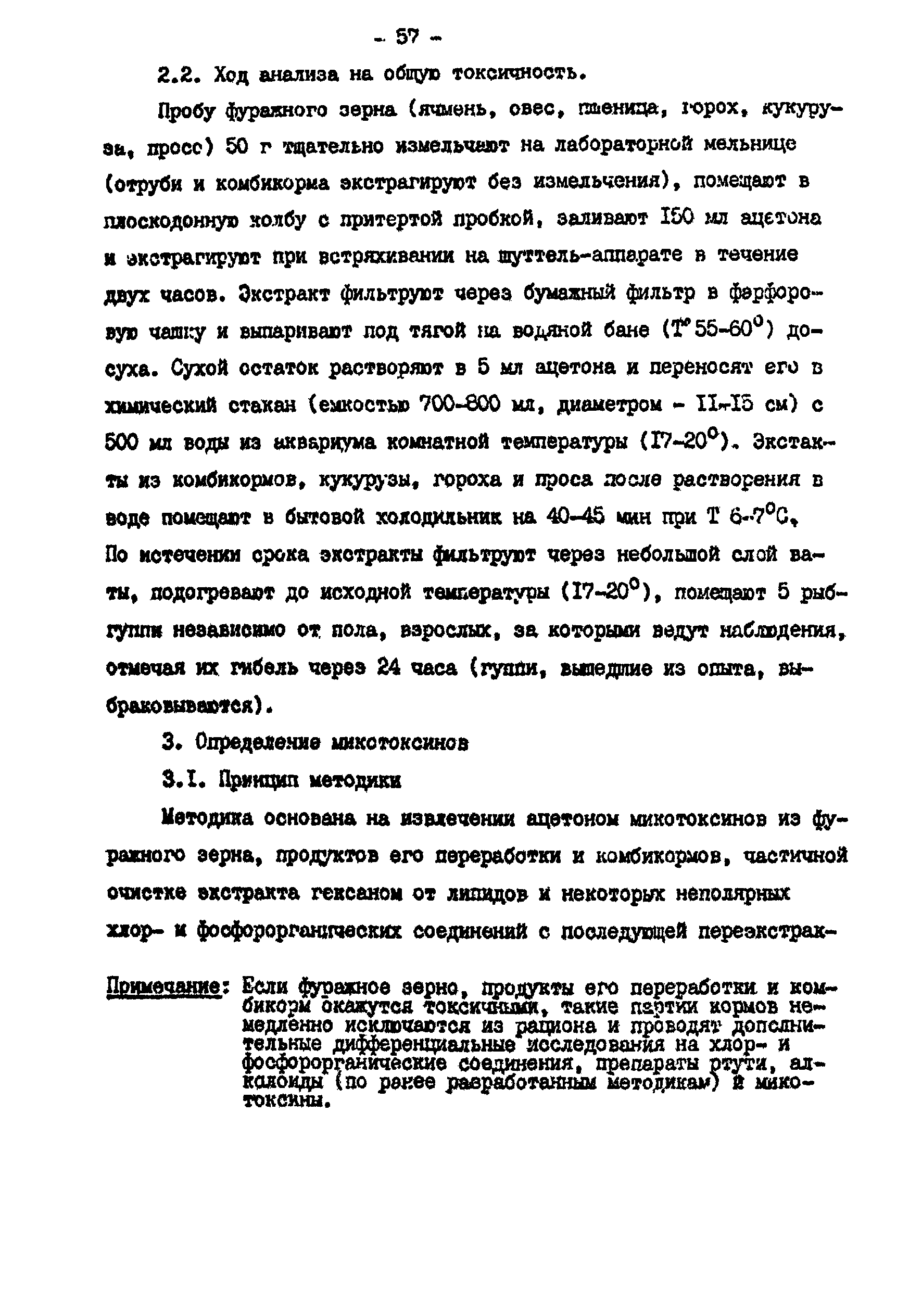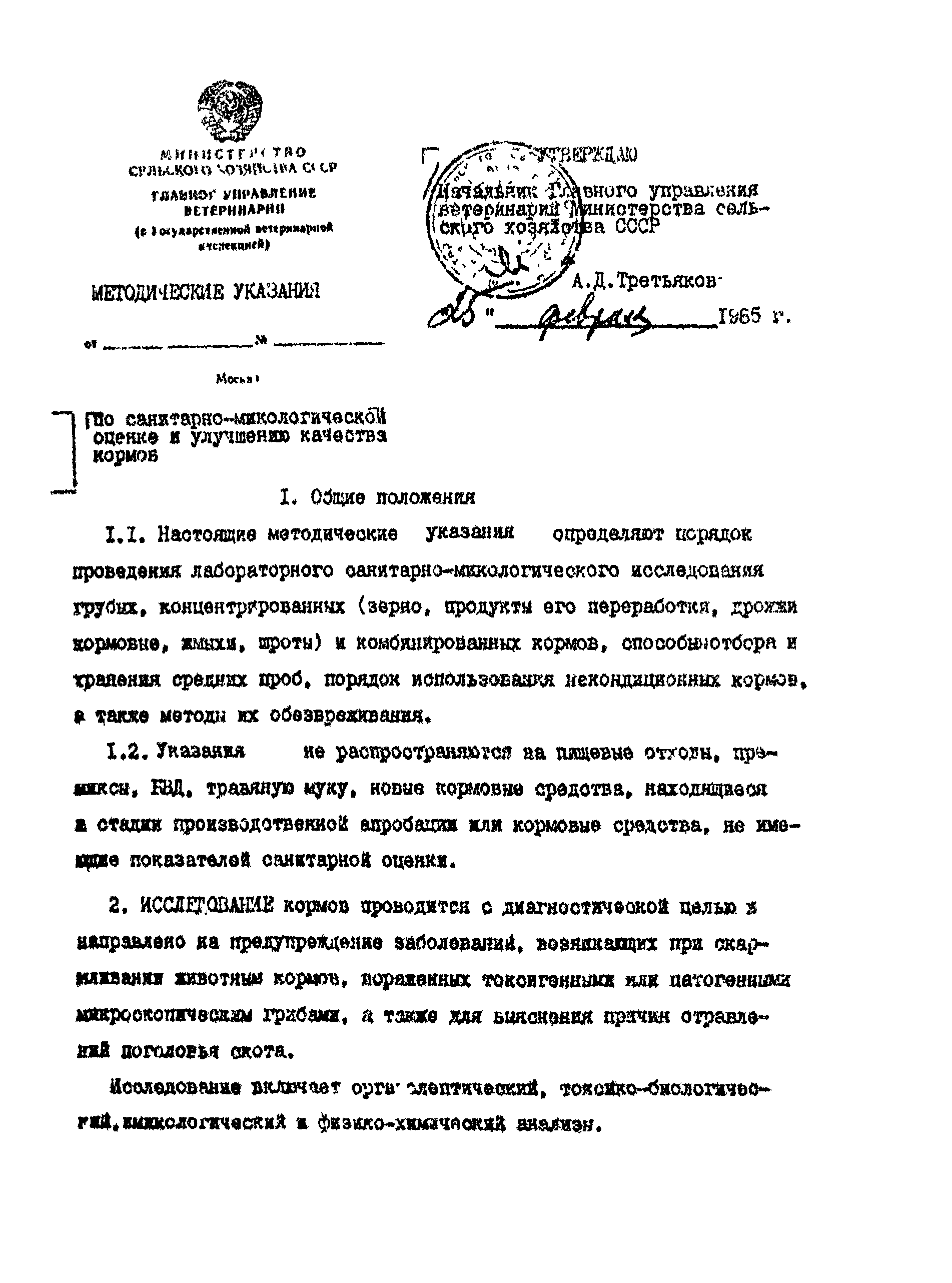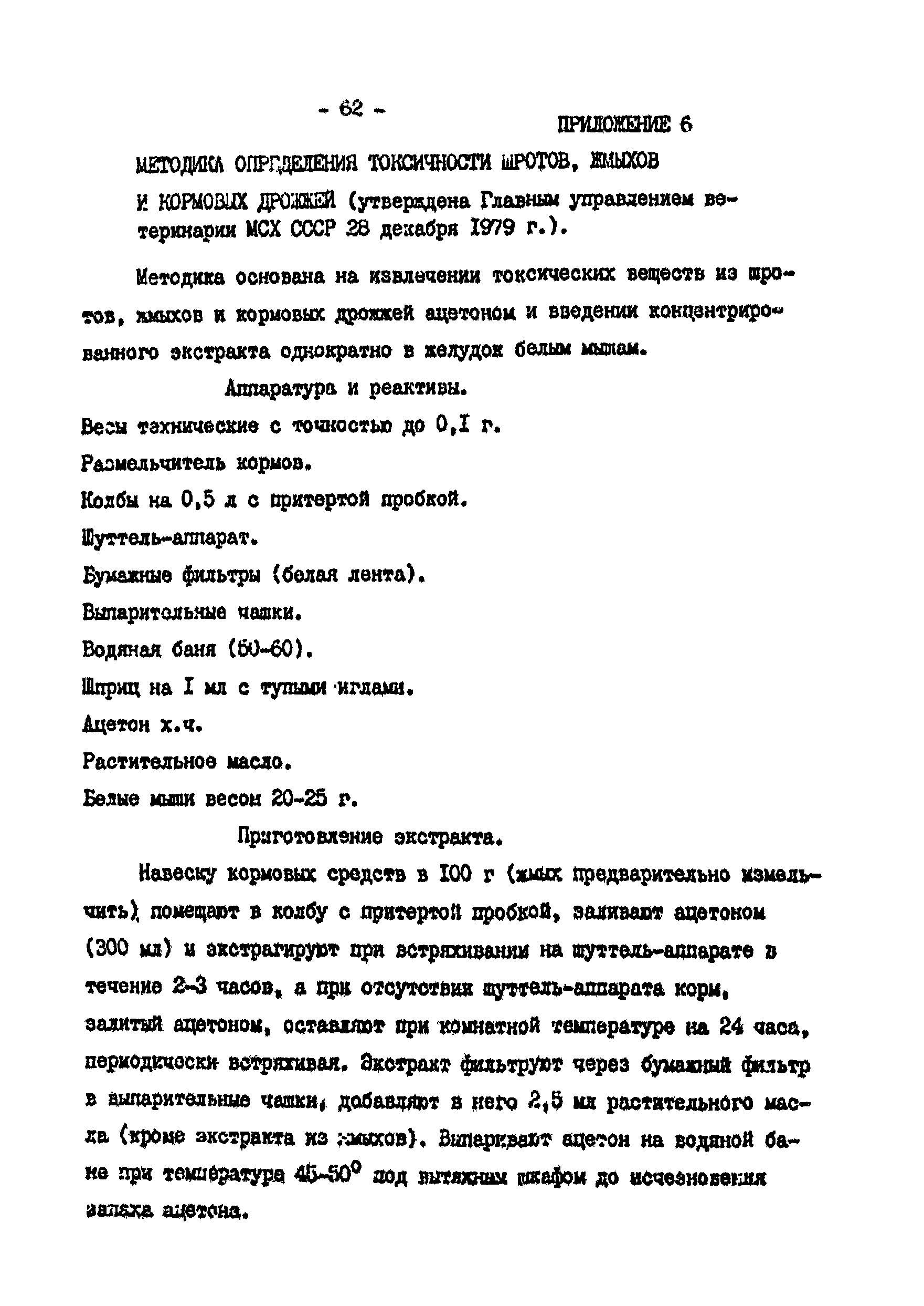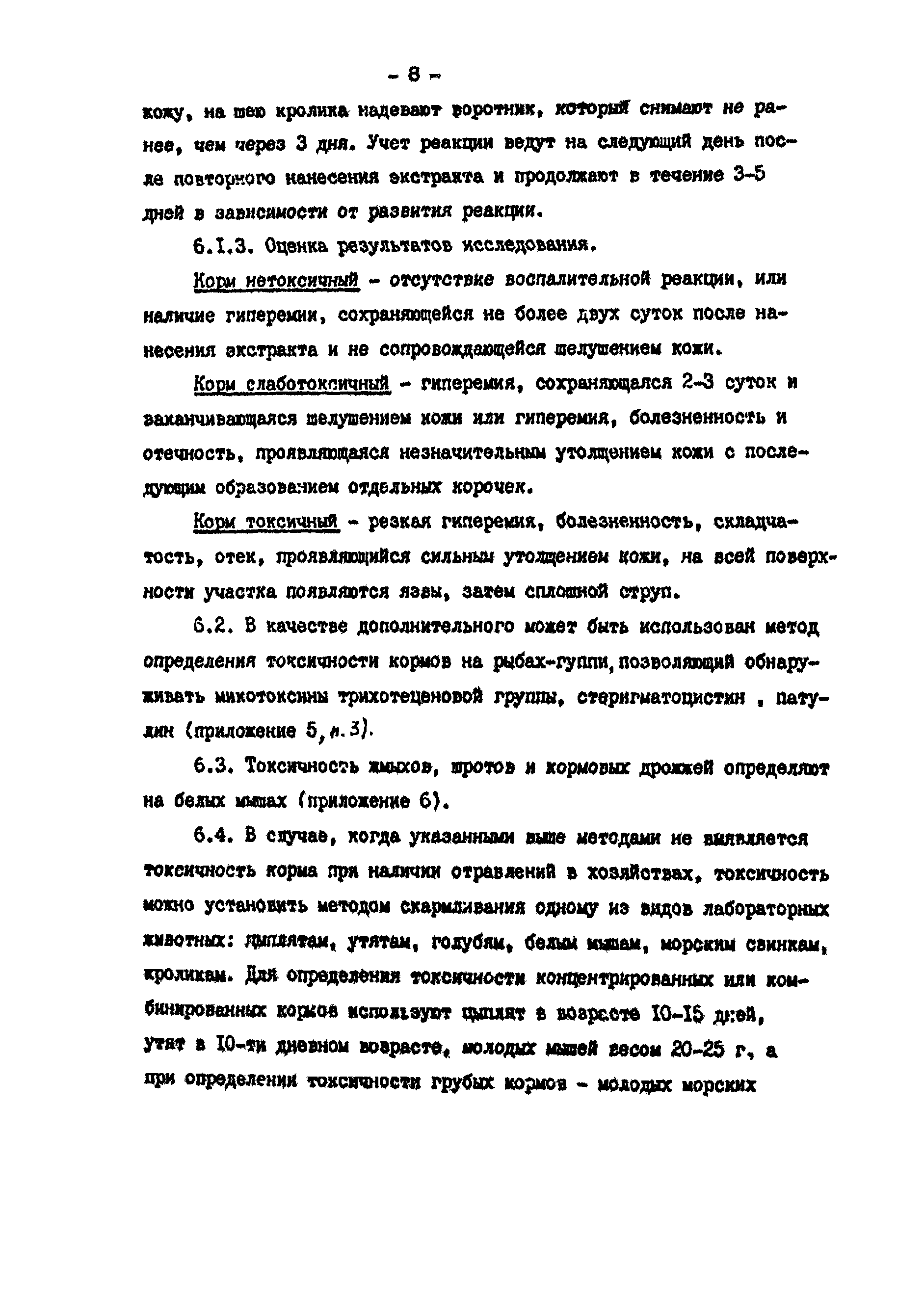 Указания не распространяются на пищевые отходы, премиксы, БВД, травяную муку, новые кормовые средства, находящиеся в стадии производственной апробации или кормовые средства, не имеющие показателей санитарной оценки. | | Оглавление: | 1. Общее положение 2. Исследование кормов 3. Продолжительность исследования проб кормов 4. Порядок отбора проб, оформление и хранение образцов кормовых средств, направляемых на исследование 5. Органолептический анализ 6. Токсико-биологический анализ 7. Микологический анализ 8. Определение токсичности культур грибов 8.1. Определение токсичности культур грибов на простейших Раrаmаеium саudаtum 8.2. Определение токсичности культур грибов методом кожной пробы на кролике 9. Физико-химический анализ 10. Порядок использования некондиционных кормов 10.1. Грубые корма (сено, солома, полова) 10.2. Комбинированные корма 10.3. Концентрированные корма Приложение 1 Методика количественного определения афлатоксинов В1 и С1 в кормах Приложение 2 Методика качественного определения микотоксина Т-2 в зернофураже Приложение 3 Методика определения мекотоксина зеараленона (Ф-2) в фуражном зерне и комбикормах Приложение 4 Обработка некондиционных кормов Приложение 5 Методика определения токсичности фуражного зерна, продуктов его переработки и комбикормов Приложение 6 Методика определения токсичности шротов, жмыхов и кормовых дрожжей Приложение 7 Питательные среды для культивирования грибов Приложение 8 Среды для культивирования парамеций | | Утверждён: | 25.02.1985 Минсельхоз СССР (USSR Minselkhoz )