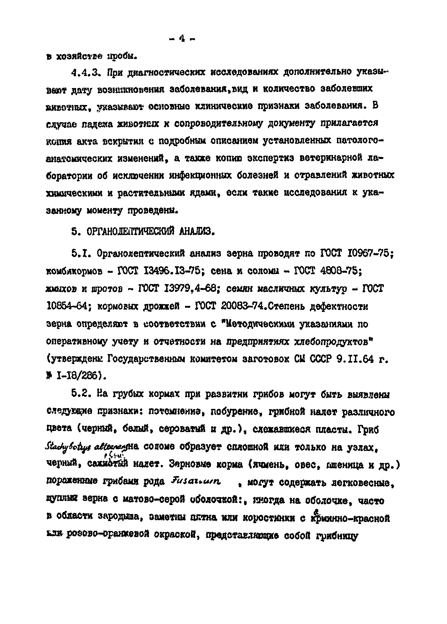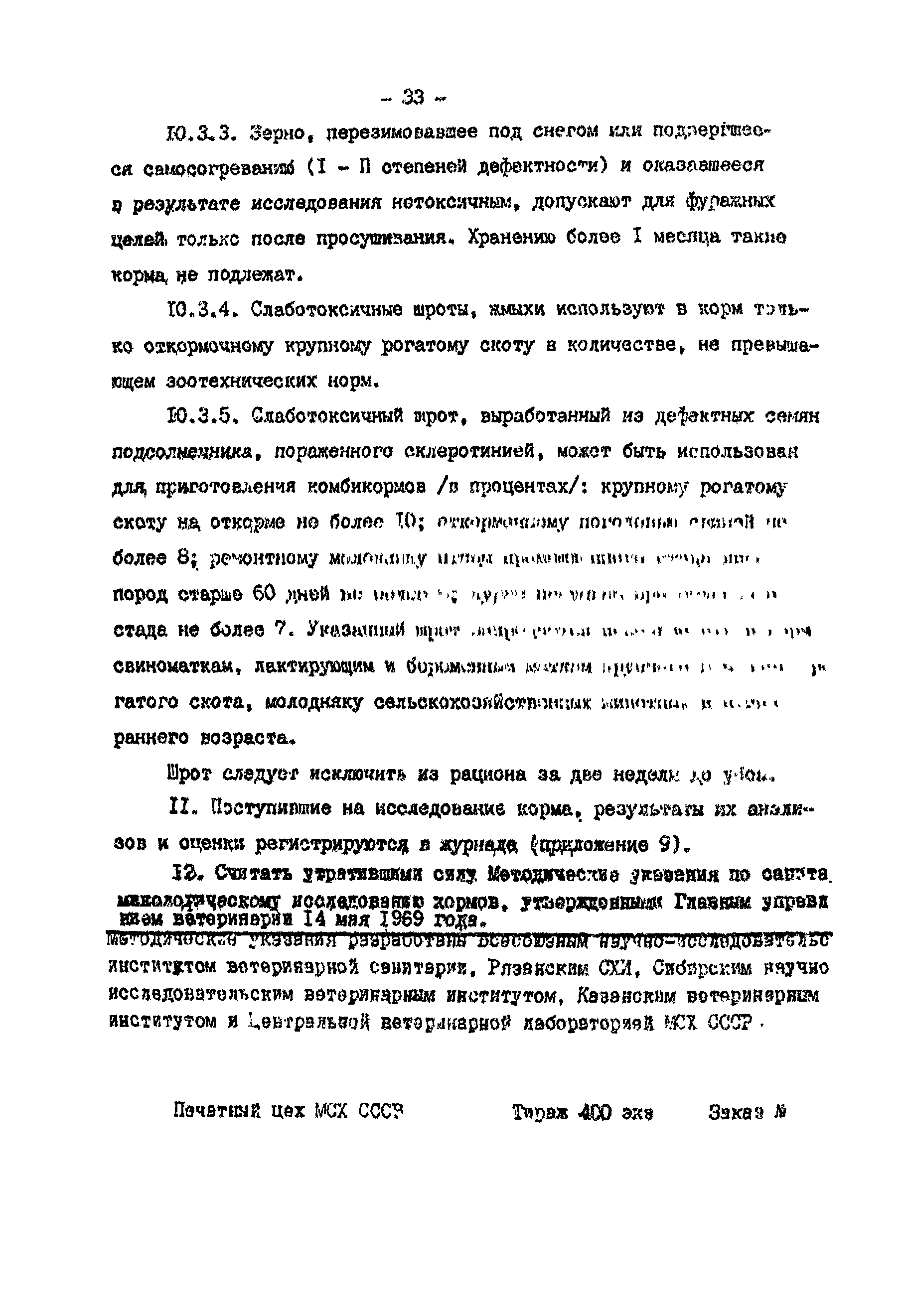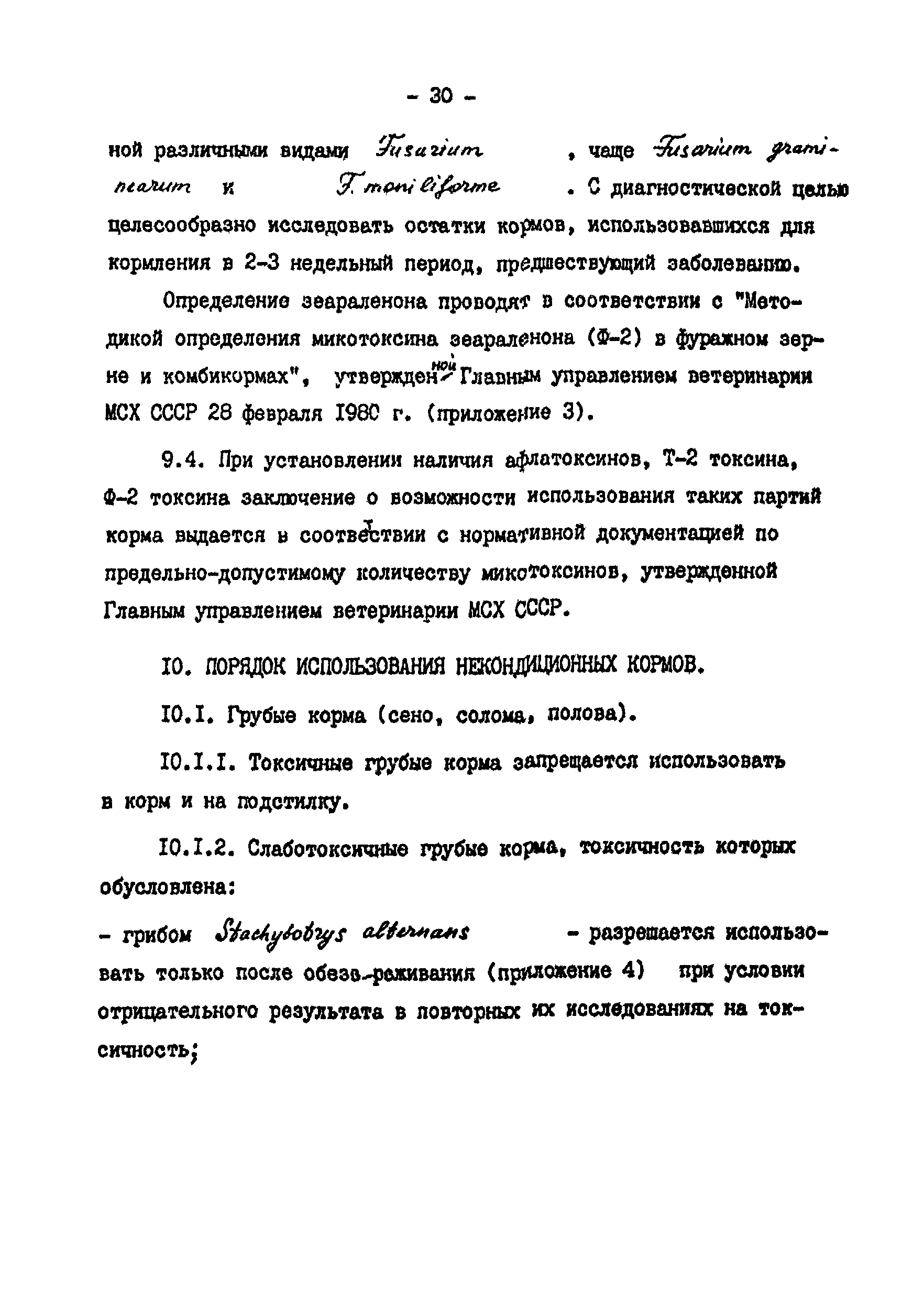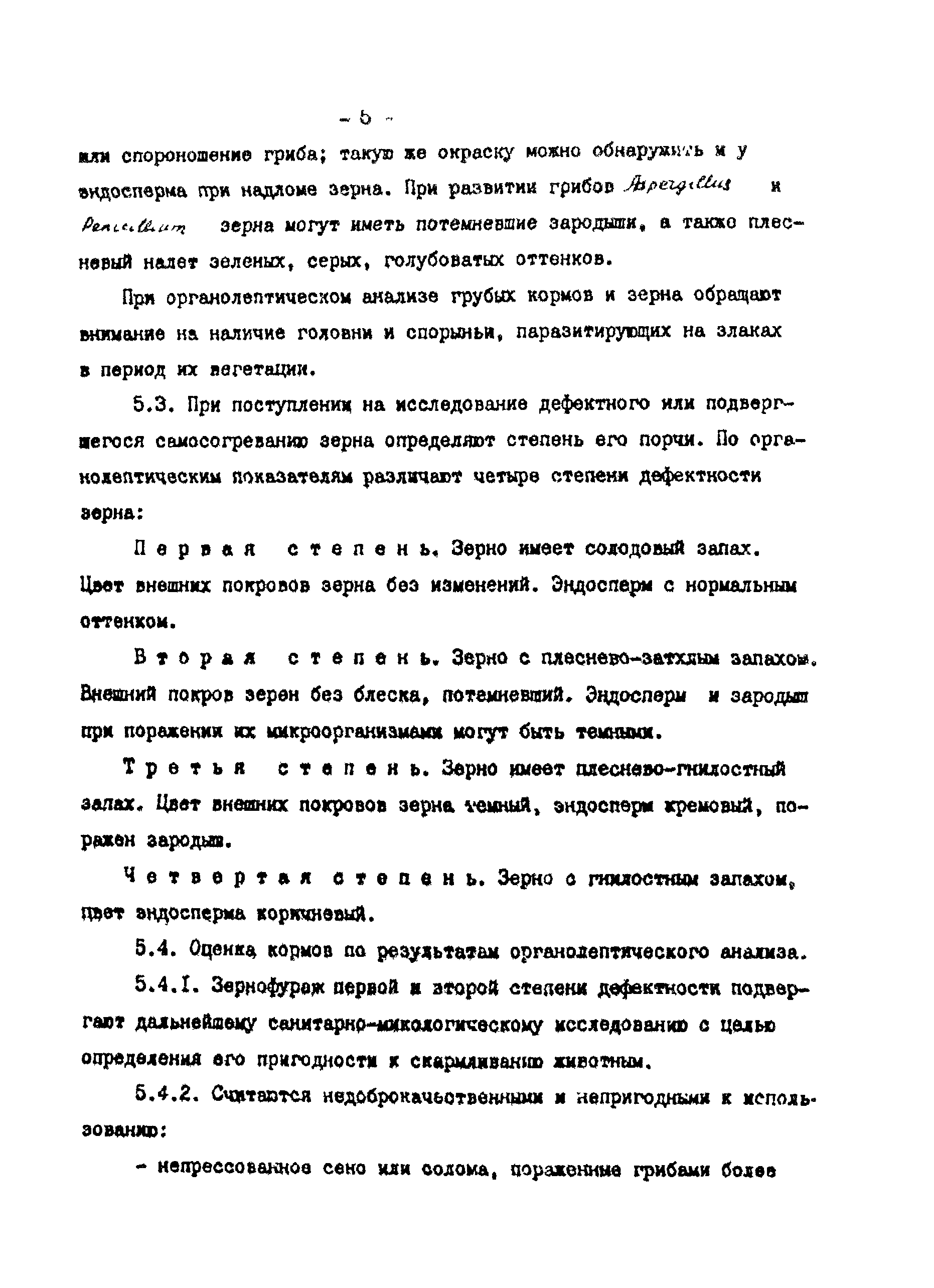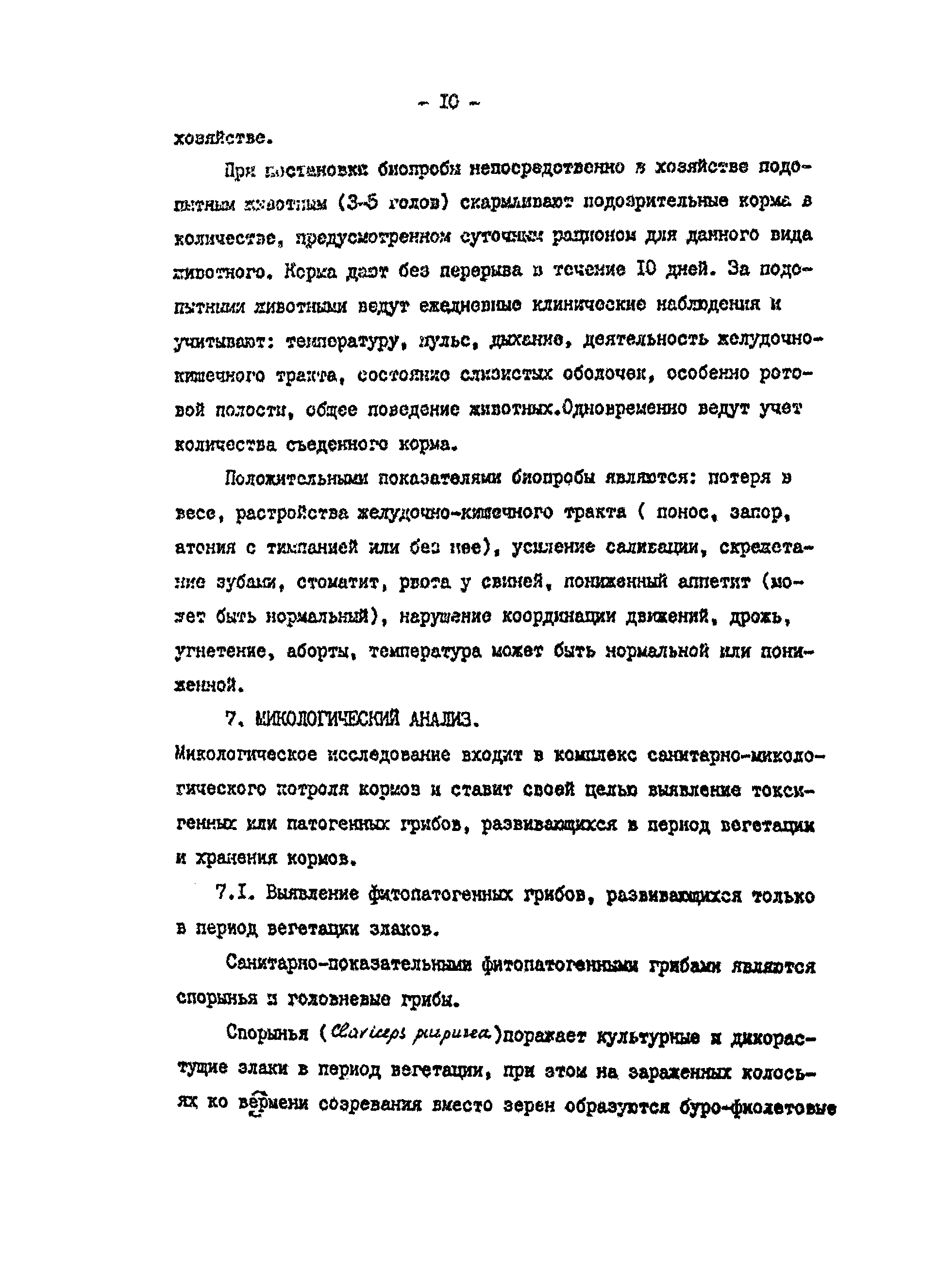 Указания не распространяются на пищевые отходы, премиксы, БВД, травяную муку, новые кормовые средства, находящиеся в стадии производственной апробации или кормовые средства, не имеющие показателей санитарной оценки. | | Оглавление: | 1. Общее положение 2. Исследование кормов 3. Продолжительность исследования проб кормов 4. Порядок отбора проб, оформление и хранение образцов кормовых средств, направляемых на исследование 5. Органолептический анализ 6. Токсико-биологический анализ 7. Микологический анализ 8. Определение токсичности культур грибов 8.1. Определение токсичности культур грибов на простейших Раrаmаеium саudаtum 8.2. Определение токсичности культур грибов методом кожной пробы на кролике 9. Физико-химический анализ 10. Порядок использования некондиционных кормов 10.1. Грубые корма (сено, солома, полова) 10.2. Комбинированные корма 10.3. Концентрированные корма Приложение 1 Методика количественного определения афлатоксинов В1 и С1 в кормах Приложение 2 Методика качественного определения микотоксина Т-2 в зернофураже Приложение 3 Методика определения мекотоксина зеараленона (Ф-2) в фуражном зерне и комбикормах Приложение 4 Обработка некондиционных кормов Приложение 5 Методика определения токсичности фуражного зерна, продуктов его переработки и комбикормов Приложение 6 Методика определения токсичности шротов, жмыхов и кормовых дрожжей Приложение 7 Питательные среды для культивирования грибов Приложение 8 Среды для культивирования парамеций | | Утверждён: | 25.02.1985 Минсельхоз СССР (USSR Minselkhoz )
