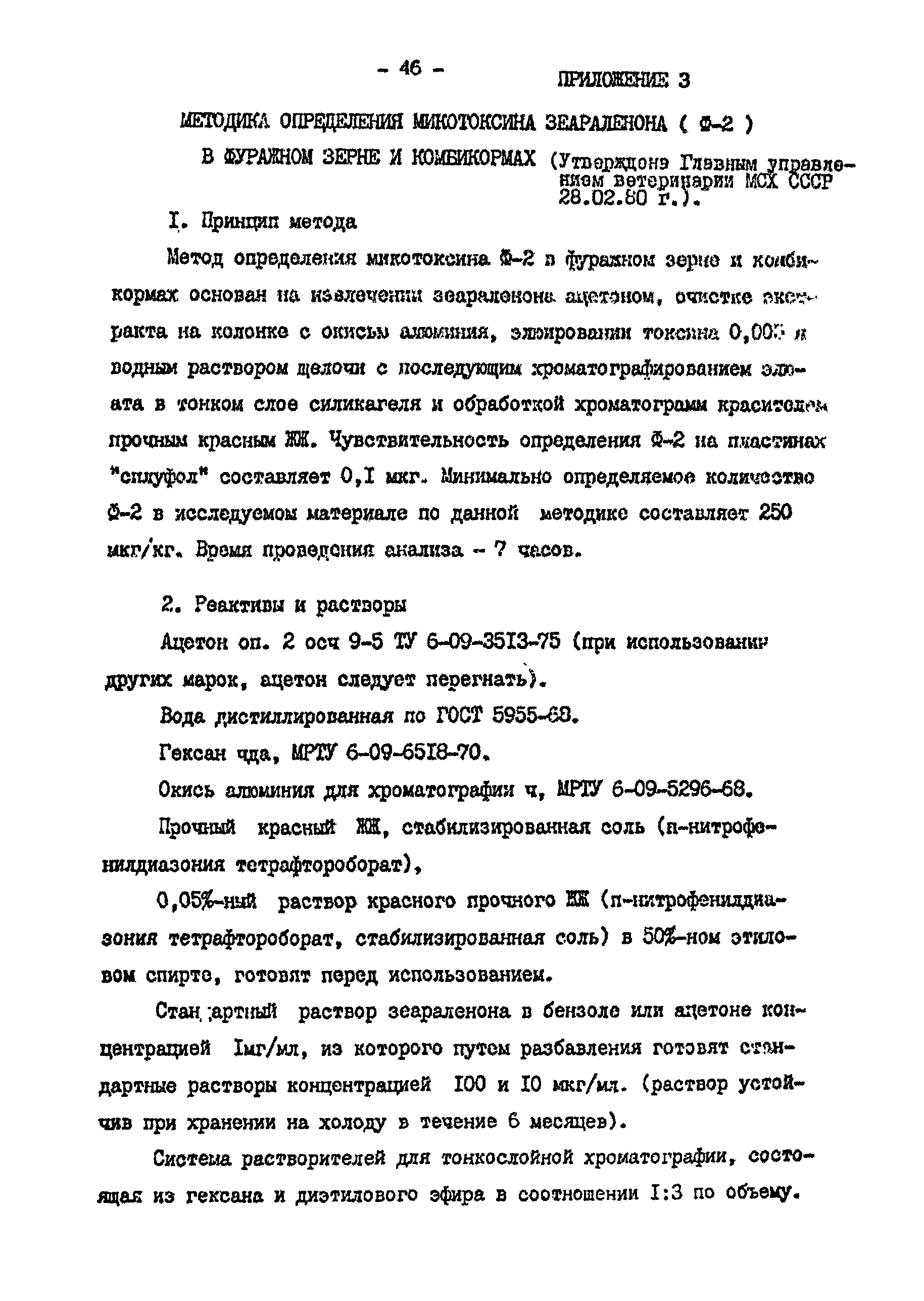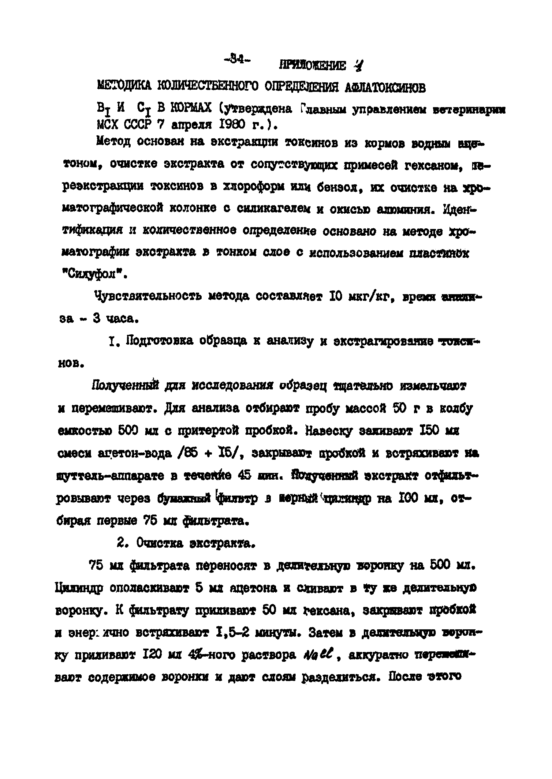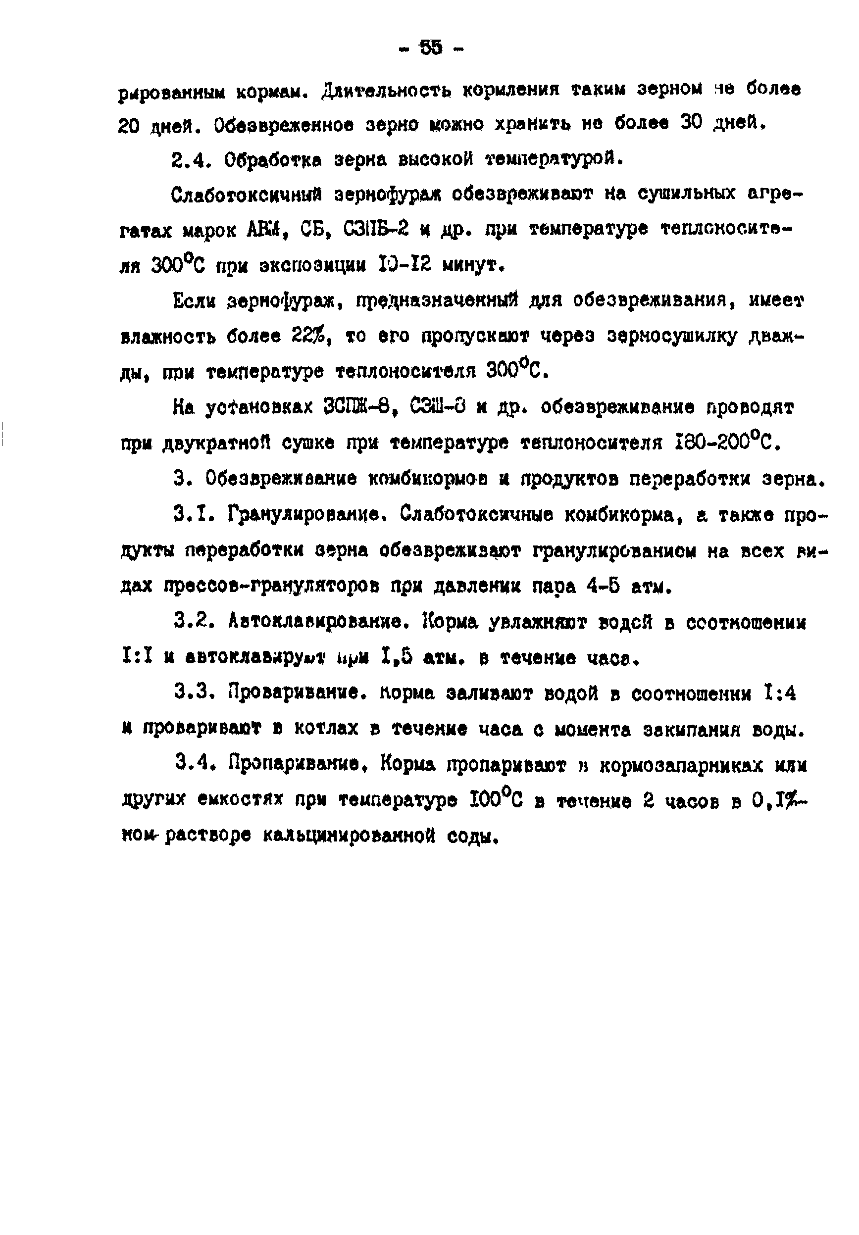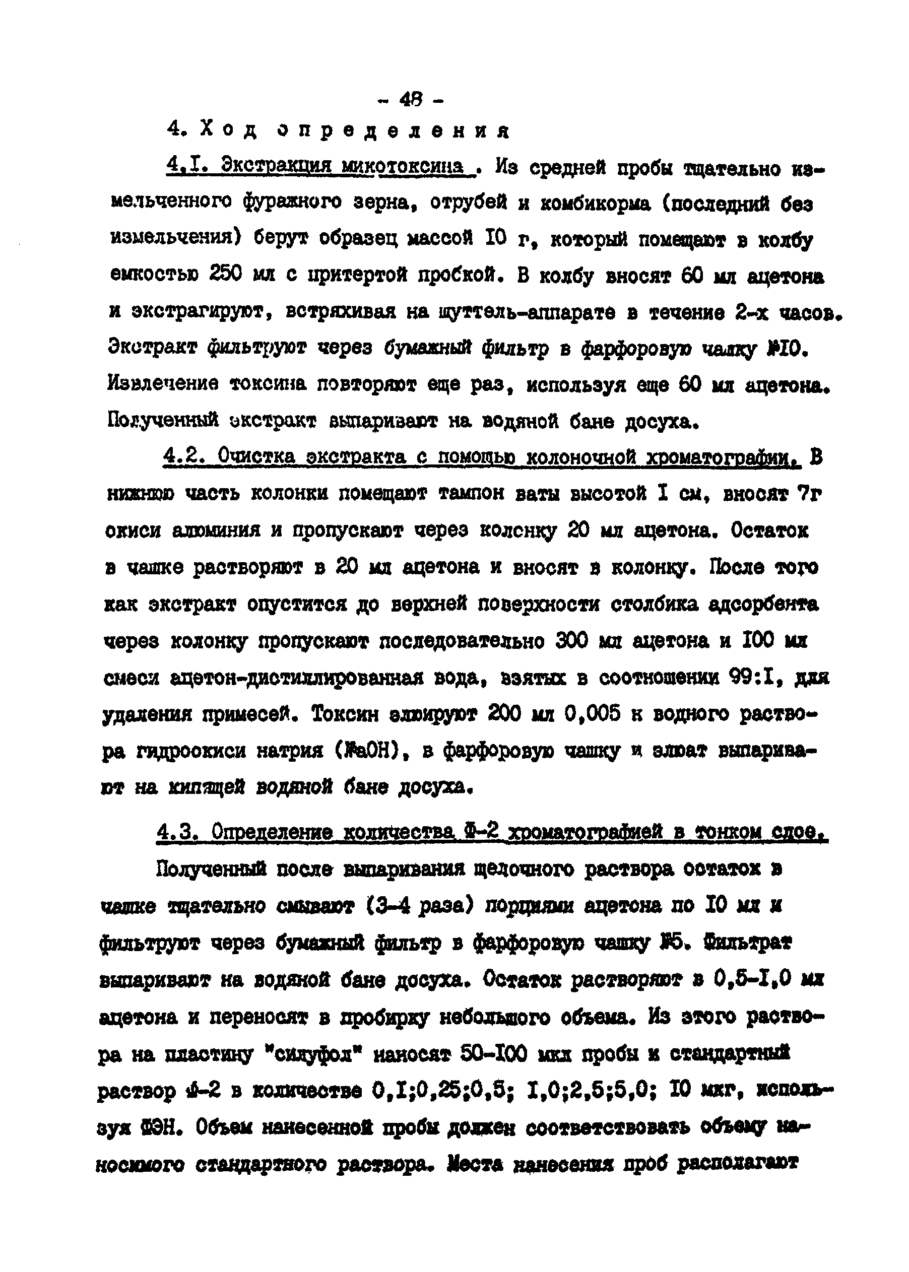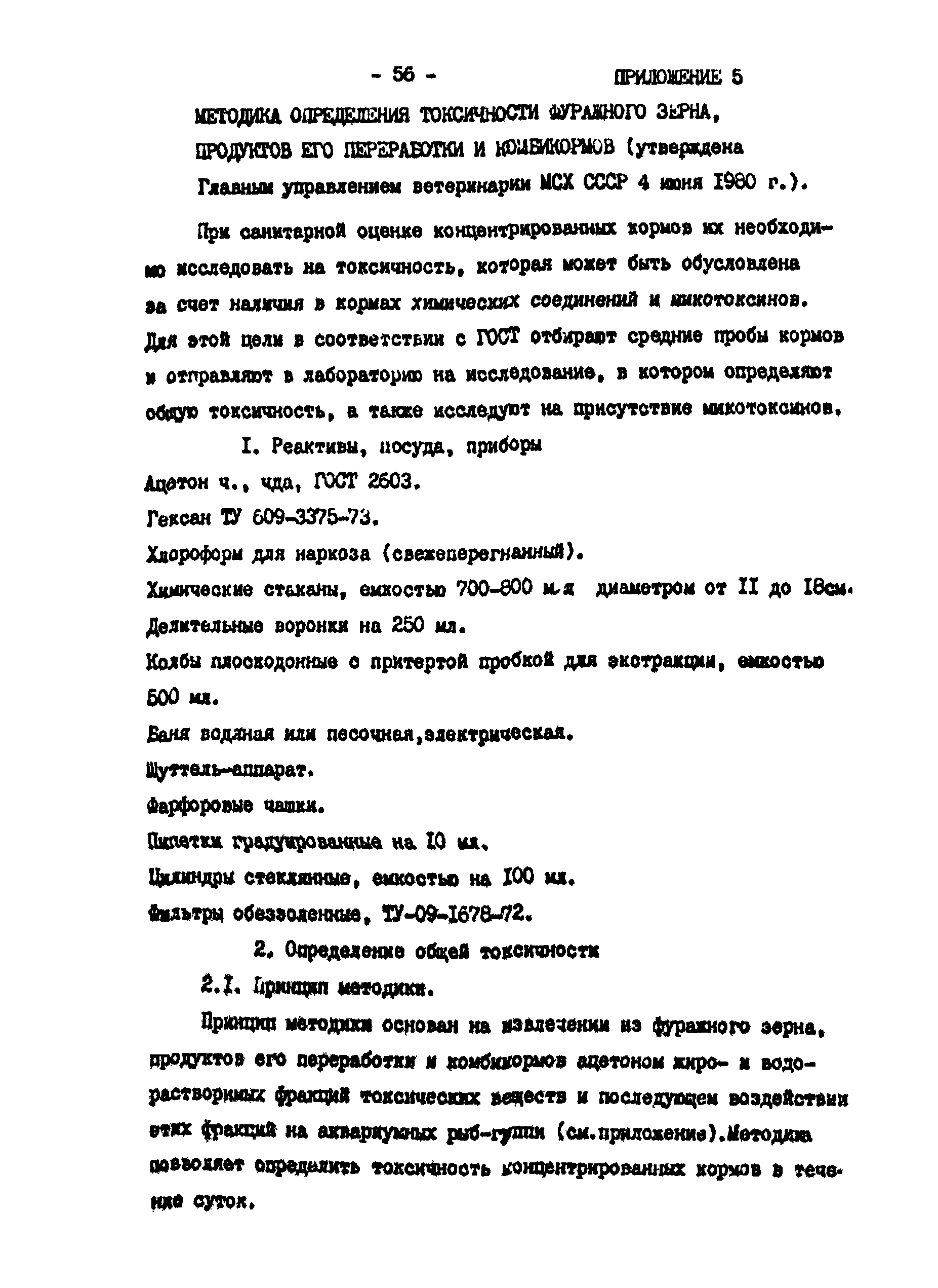 Указания не распространяются на пищевые отходы, премиксы, БВД, травяную муку, новые кормовые средства, находящиеся в стадии производственной апробации или кормовые средства, не имеющие показателей санитарной оценки. | | Оглавление: | 1. Общее положение 2. Исследование кормов 3. Продолжительность исследования проб кормов 4. Порядок отбора проб, оформление и хранение образцов кормовых средств, направляемых на исследование 5. Органолептический анализ 6. Токсико-биологический анализ 7. Микологический анализ 8. Определение токсичности культур грибов 8.1. Определение токсичности культур грибов на простейших Раrаmаеium саudаtum 8.2. Определение токсичности культур грибов методом кожной пробы на кролике 9. Физико-химический анализ 10. Порядок использования некондиционных кормов 10.1. Грубые корма (сено, солома, полова) 10.2. Комбинированные корма 10.3. Концентрированные корма Приложение 1 Методика количественного определения афлатоксинов В1 и С1 в кормах Приложение 2 Методика качественного определения микотоксина Т-2 в зернофураже Приложение 3 Методика определения мекотоксина зеараленона (Ф-2) в фуражном зерне и комбикормах Приложение 4 Обработка некондиционных кормов Приложение 5 Методика определения токсичности фуражного зерна, продуктов его переработки и комбикормов Приложение 6 Методика определения токсичности шротов, жмыхов и кормовых дрожжей Приложение 7 Питательные среды для культивирования грибов Приложение 8 Среды для культивирования парамеций | | Утверждён: | 25.02.1985 Минсельхоз СССР (USSR Minselkhoz )