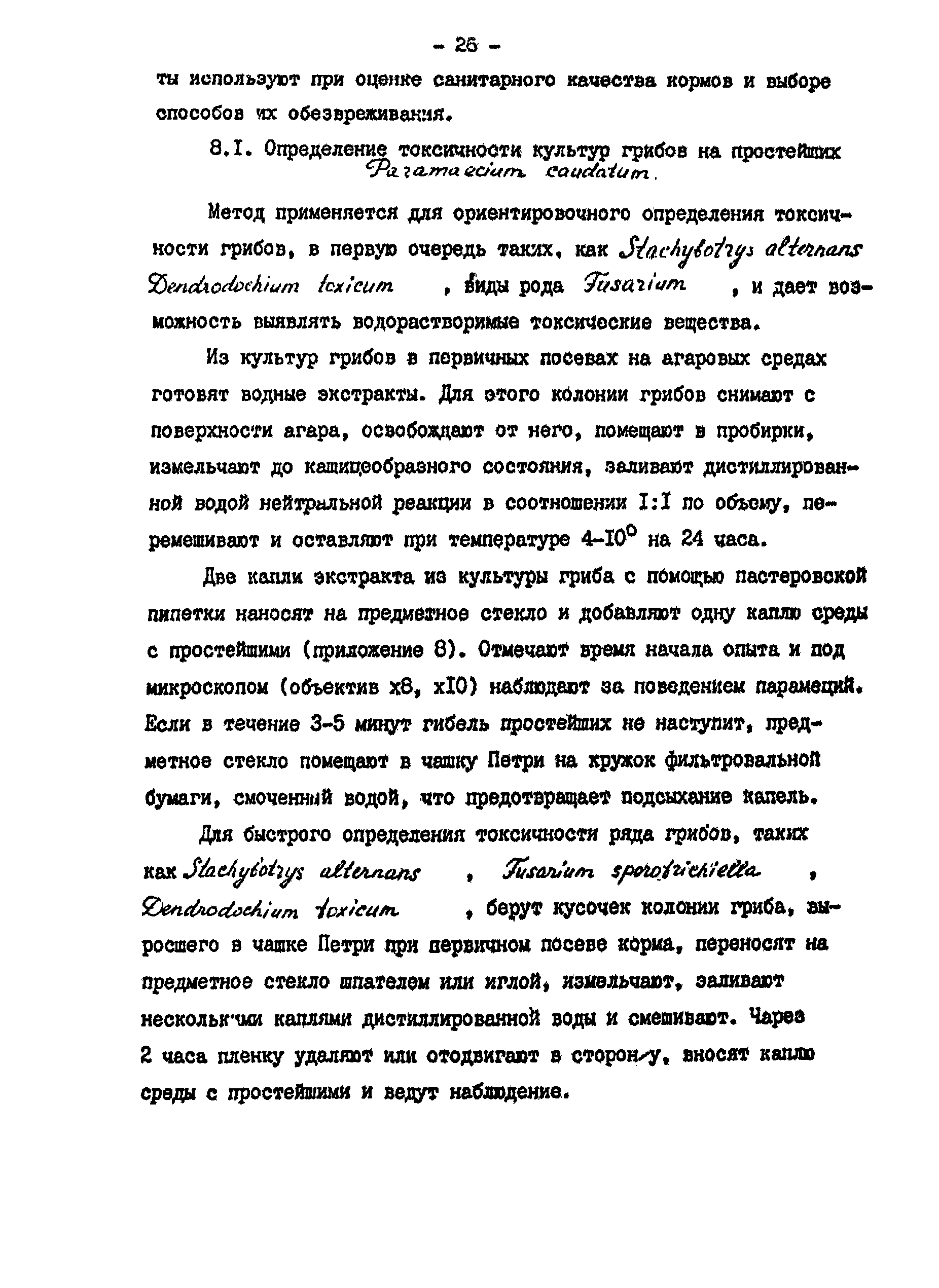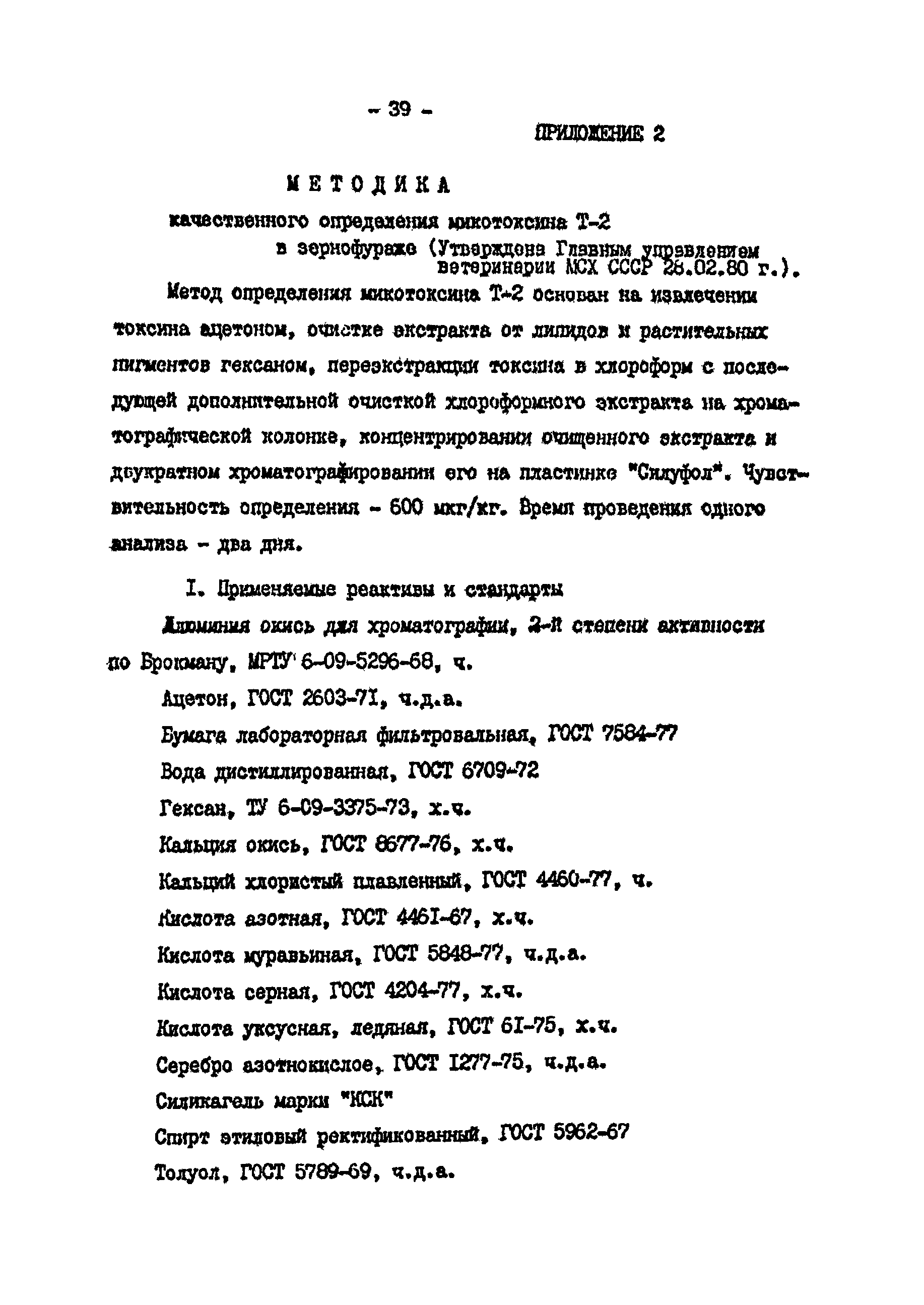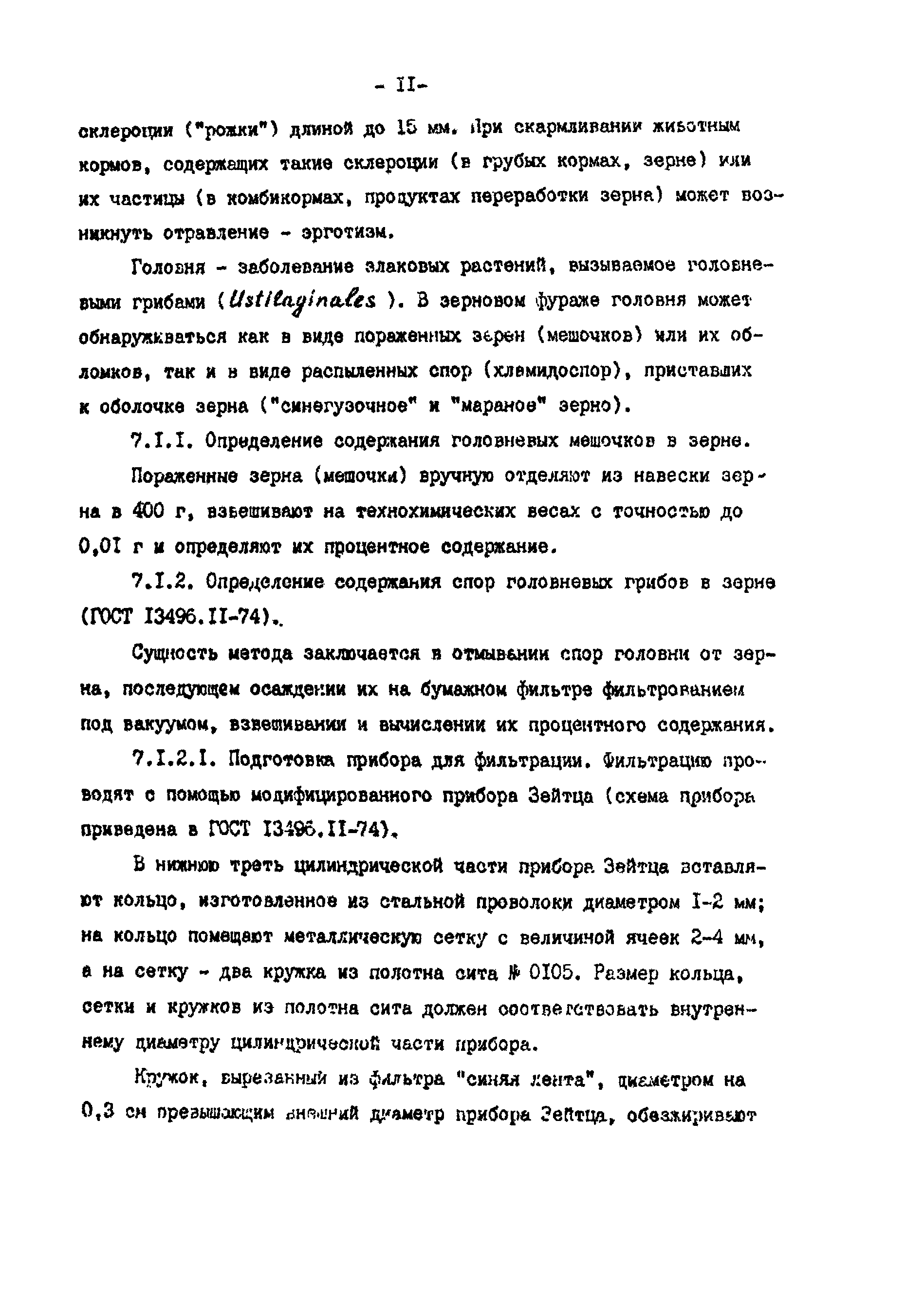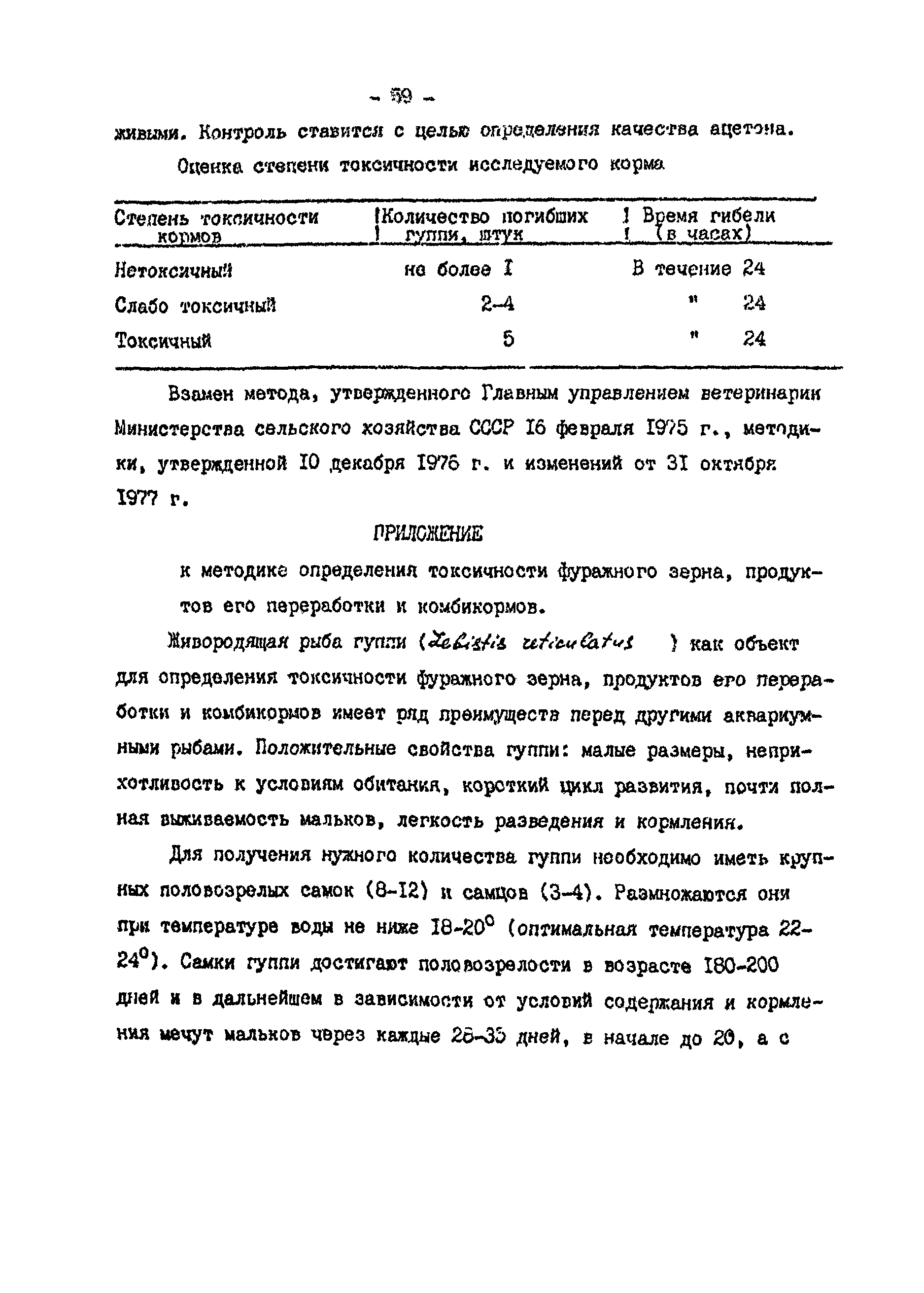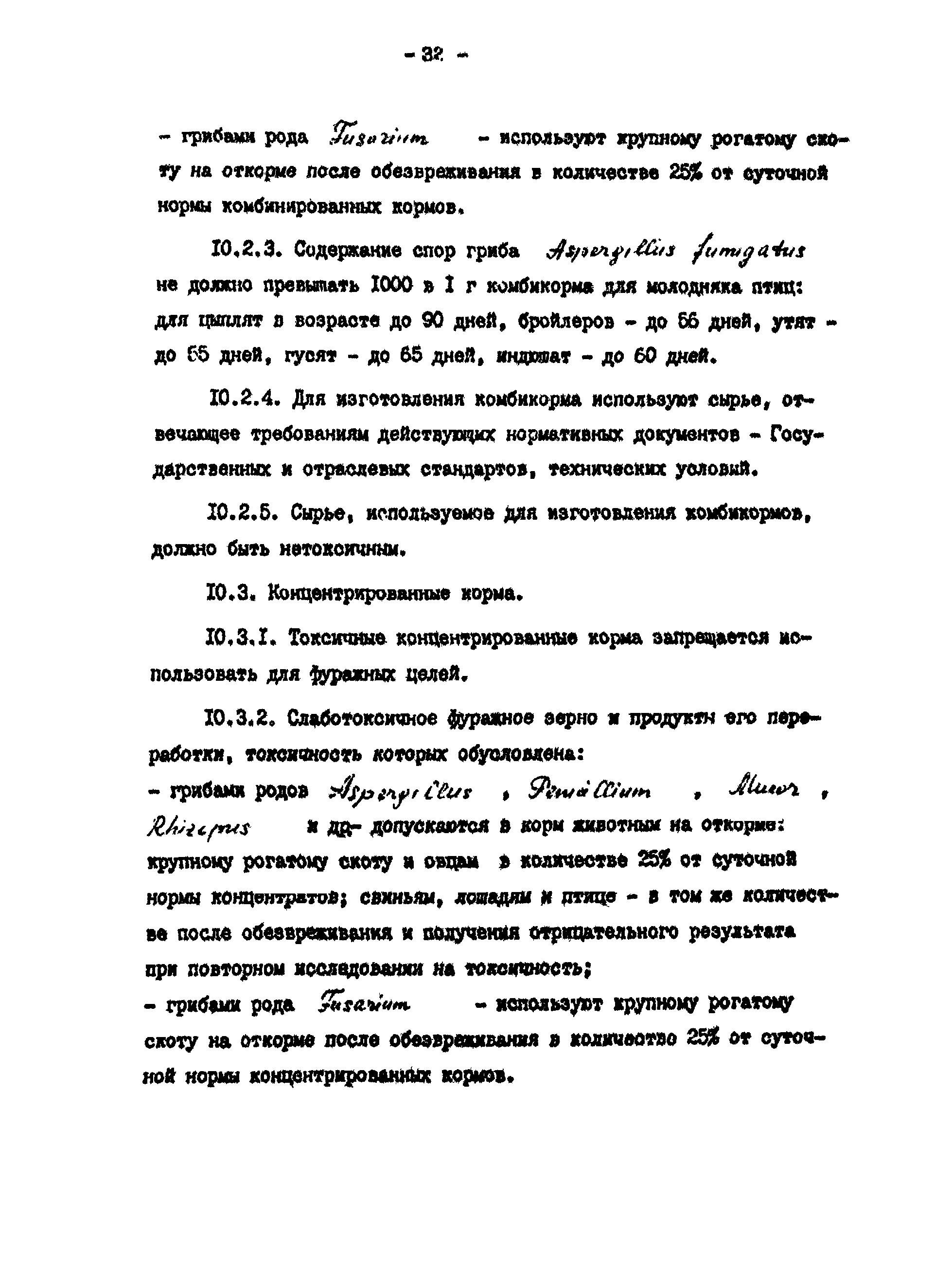 Указания не распространяются на пищевые отходы, премиксы, БВД, травяную муку, новые кормовые средства, находящиеся в стадии производственной апробации или кормовые средства, не имеющие показателей санитарной оценки. | | Оглавление: | 1. Общее положение 2. Исследование кормов 3. Продолжительность исследования проб кормов 4. Порядок отбора проб, оформление и хранение образцов кормовых средств, направляемых на исследование 5. Органолептический анализ 6. Токсико-биологический анализ 7. Микологический анализ 8. Определение токсичности культур грибов 8.1. Определение токсичности культур грибов на простейших Раrаmаеium саudаtum 8.2. Определение токсичности культур грибов методом кожной пробы на кролике 9. Физико-химический анализ 10. Порядок использования некондиционных кормов 10.1. Грубые корма (сено, солома, полова) 10.2. Комбинированные корма 10.3. Концентрированные корма Приложение 1 Методика количественного определения афлатоксинов В1 и С1 в кормах Приложение 2 Методика качественного определения микотоксина Т-2 в зернофураже Приложение 3 Методика определения мекотоксина зеараленона (Ф-2) в фуражном зерне и комбикормах Приложение 4 Обработка некондиционных кормов Приложение 5 Методика определения токсичности фуражного зерна, продуктов его переработки и комбикормов Приложение 6 Методика определения токсичности шротов, жмыхов и кормовых дрожжей Приложение 7 Питательные среды для культивирования грибов Приложение 8 Среды для культивирования парамеций | | Утверждён: | 25.02.1985 Минсельхоз СССР (USSR Minselkhoz )