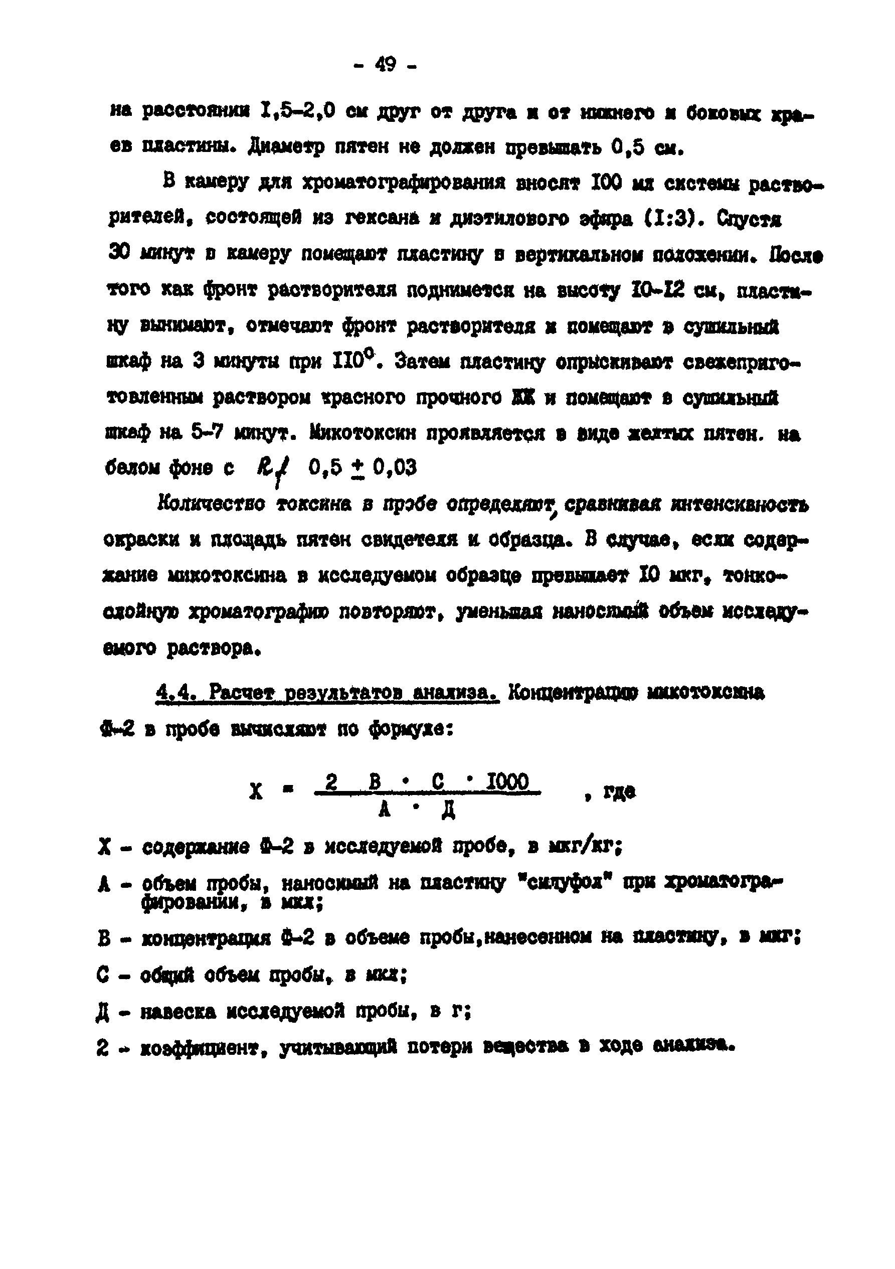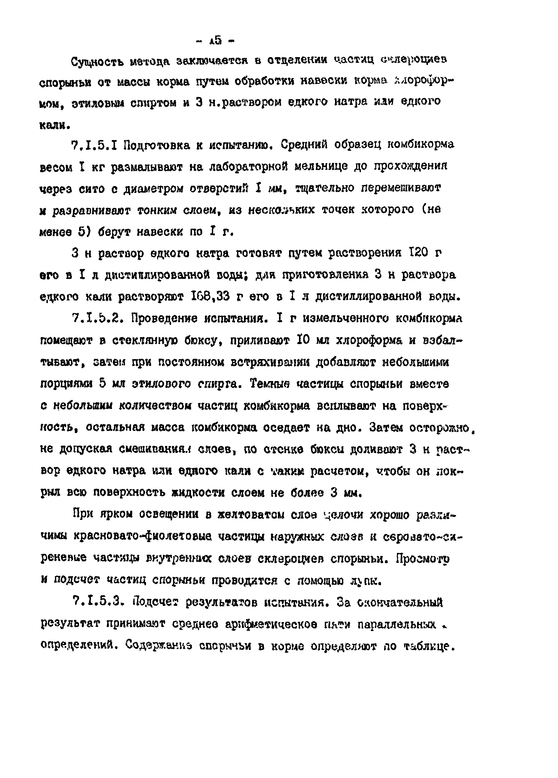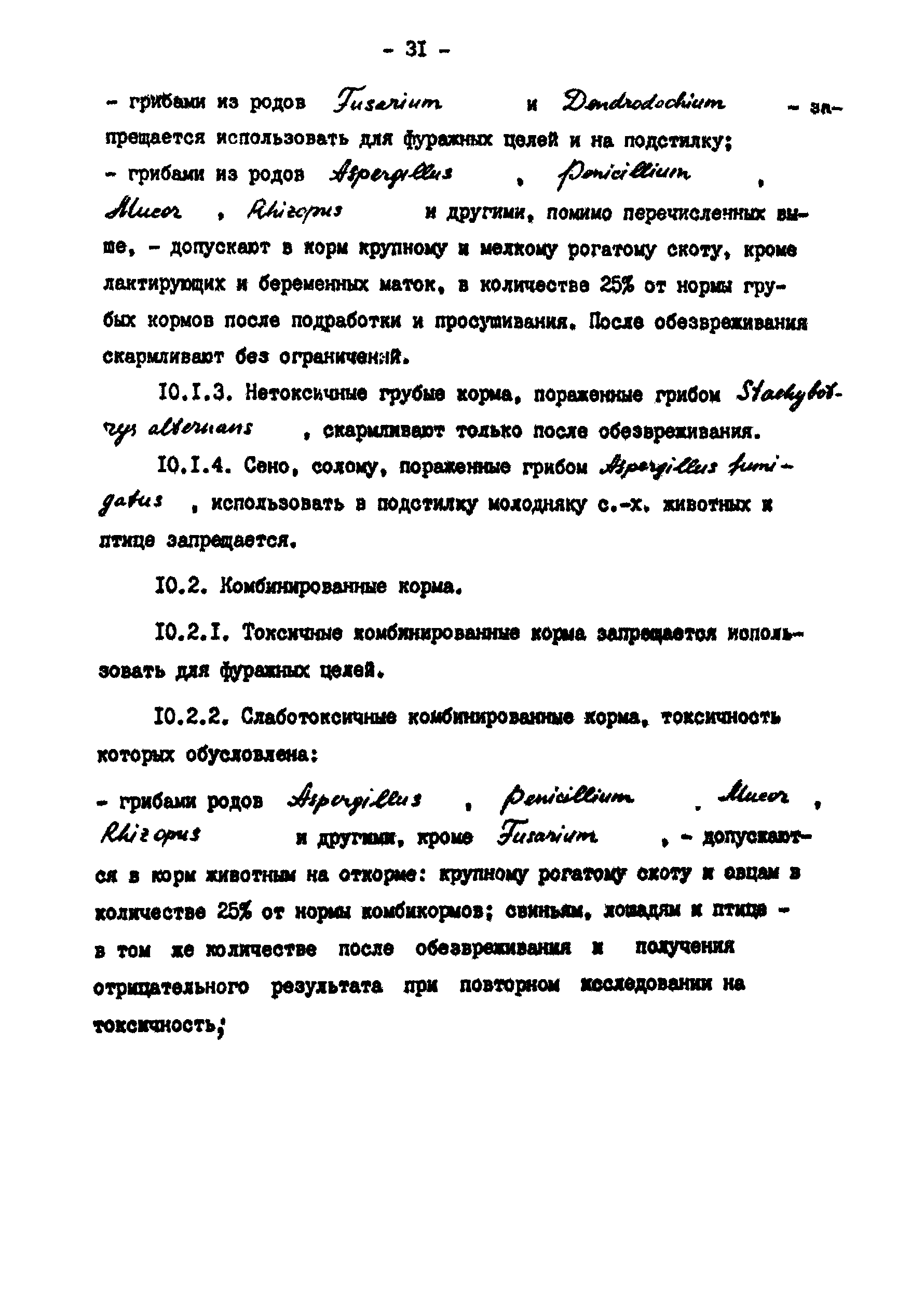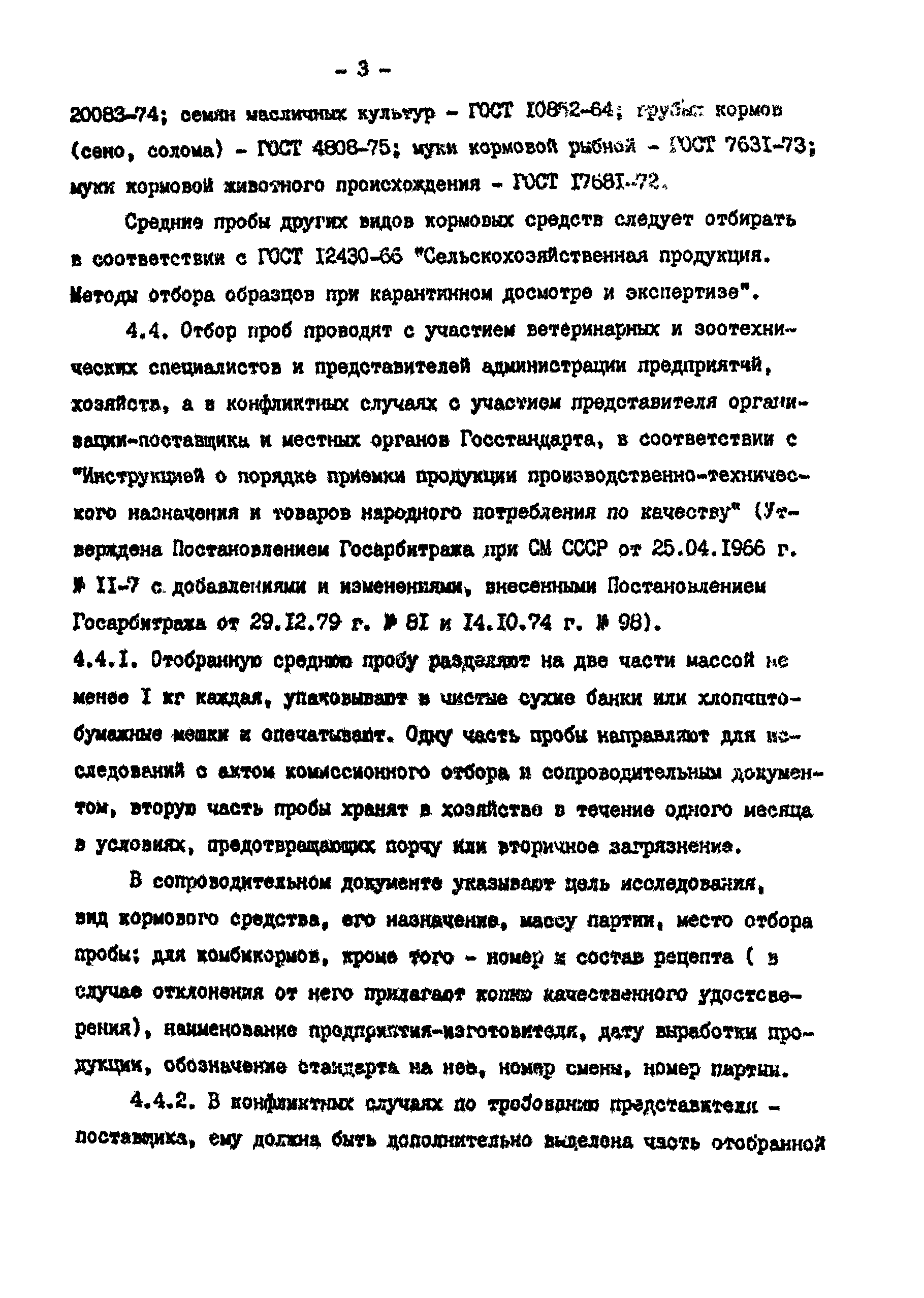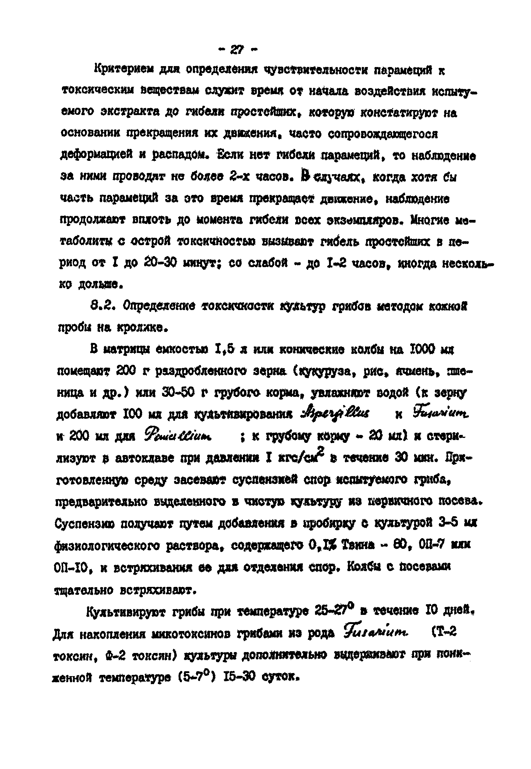 Указания не распространяются на пищевые отходы, премиксы, БВД, травяную муку, новые кормовые средства, находящиеся в стадии производственной апробации или кормовые средства, не имеющие показателей санитарной оценки. | | Оглавление: | 1. Общее положение 2. Исследование кормов 3. Продолжительность исследования проб кормов 4. Порядок отбора проб, оформление и хранение образцов кормовых средств, направляемых на исследование 5. Органолептический анализ 6. Токсико-биологический анализ 7. Микологический анализ 8. Определение токсичности культур грибов 8.1. Определение токсичности культур грибов на простейших Раrаmаеium саudаtum 8.2. Определение токсичности культур грибов методом кожной пробы на кролике 9. Физико-химический анализ 10. Порядок использования некондиционных кормов 10.1. Грубые корма (сено, солома, полова) 10.2. Комбинированные корма 10.3. Концентрированные корма Приложение 1 Методика количественного определения афлатоксинов В1 и С1 в кормах Приложение 2 Методика качественного определения микотоксина Т-2 в зернофураже Приложение 3 Методика определения мекотоксина зеараленона (Ф-2) в фуражном зерне и комбикормах Приложение 4 Обработка некондиционных кормов Приложение 5 Методика определения токсичности фуражного зерна, продуктов его переработки и комбикормов Приложение 6 Методика определения токсичности шротов, жмыхов и кормовых дрожжей Приложение 7 Питательные среды для культивирования грибов Приложение 8 Среды для культивирования парамеций | | Утверждён: | 25.02.1985 Минсельхоз СССР (USSR Minselkhoz )