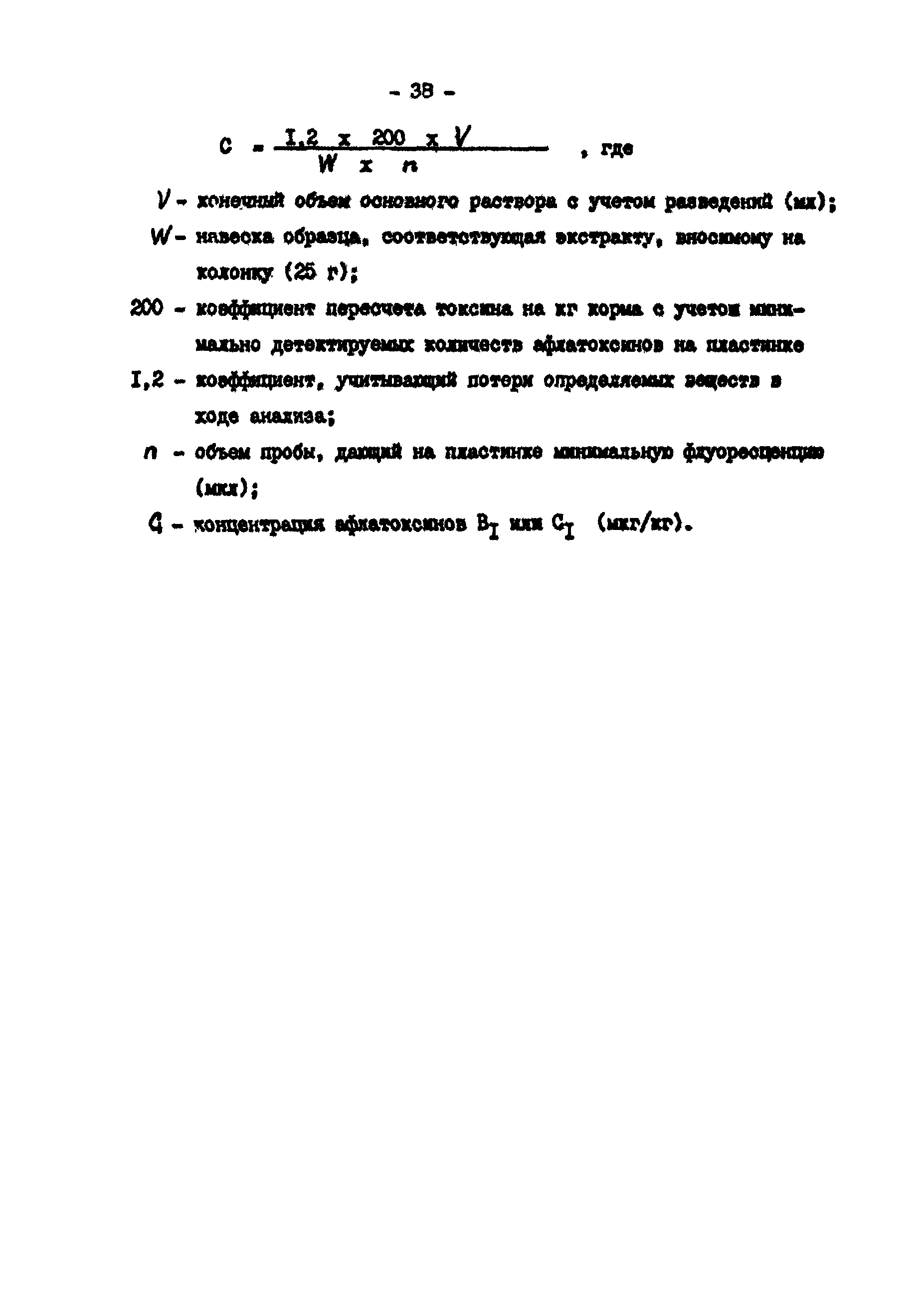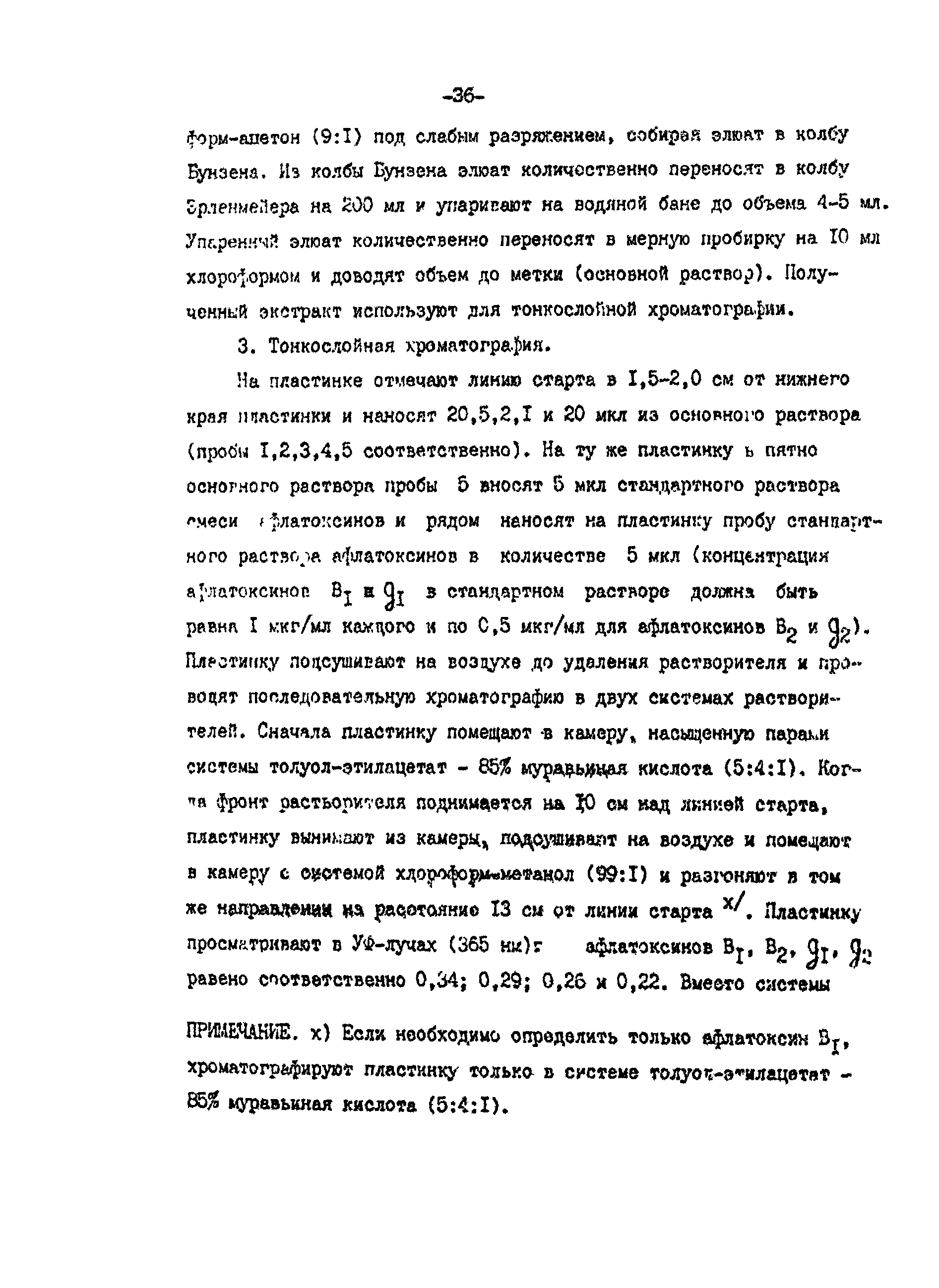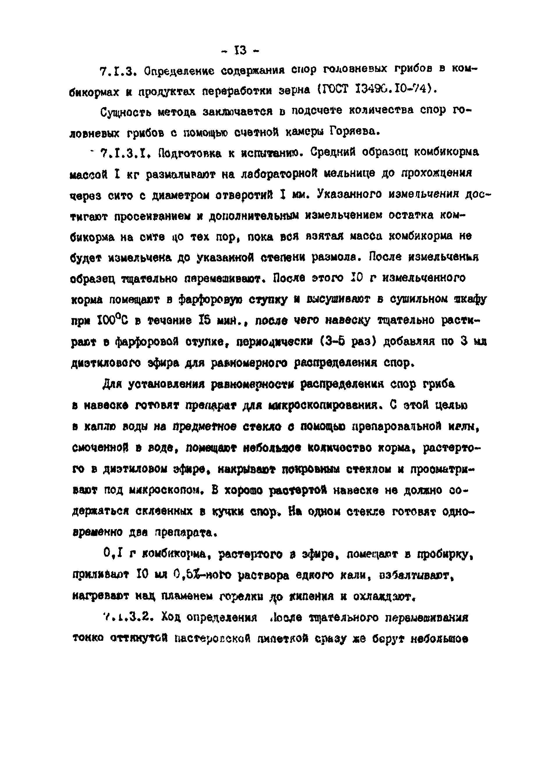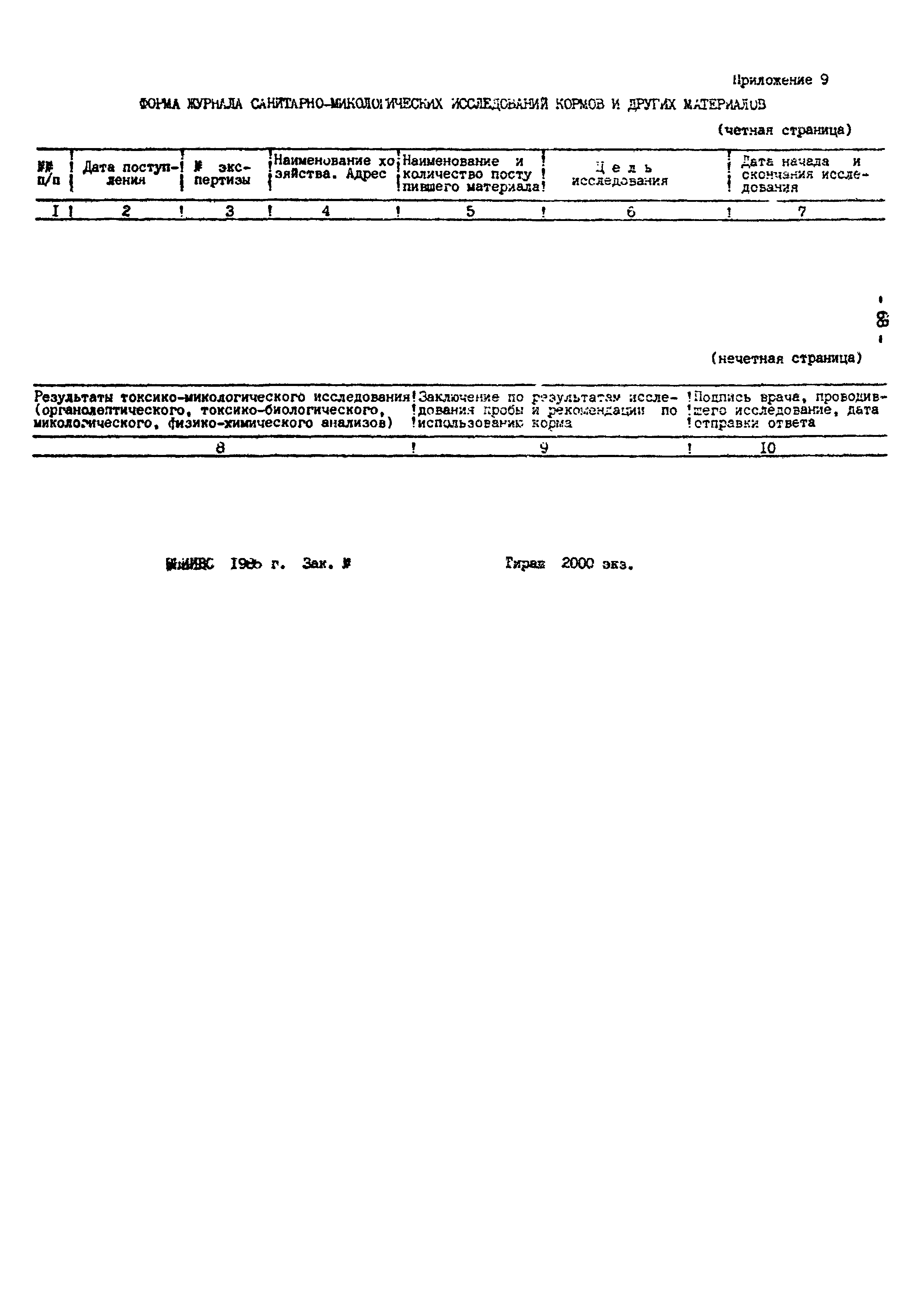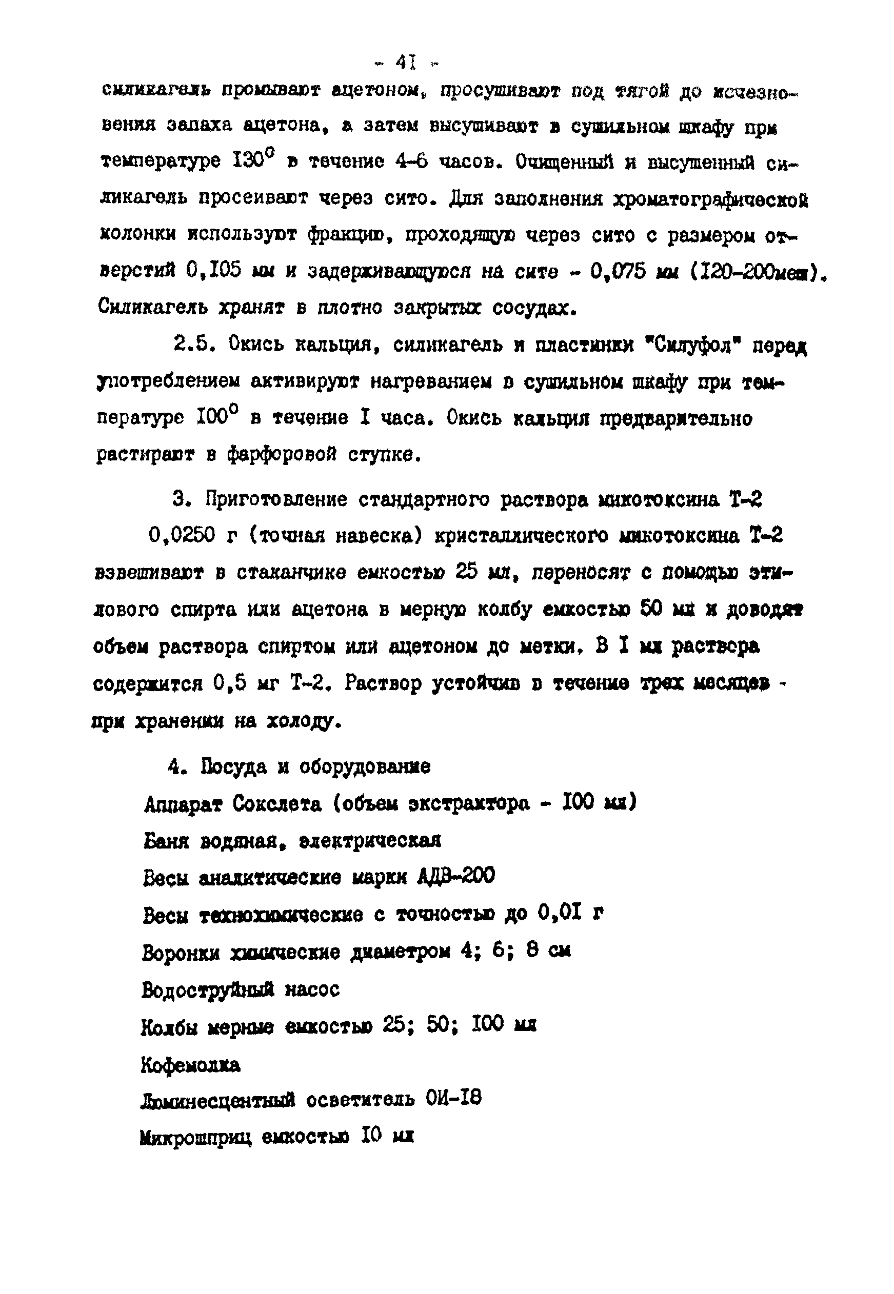 Указания не распространяются на пищевые отходы, премиксы, БВД, травяную муку, новые кормовые средства, находящиеся в стадии производственной апробации или кормовые средства, не имеющие показателей санитарной оценки. | | Оглавление: | 1. Общее положение 2. Исследование кормов 3. Продолжительность исследования проб кормов 4. Порядок отбора проб, оформление и хранение образцов кормовых средств, направляемых на исследование 5. Органолептический анализ 6. Токсико-биологический анализ 7. Микологический анализ 8. Определение токсичности культур грибов 8.1. Определение токсичности культур грибов на простейших Раrаmаеium саudаtum 8.2. Определение токсичности культур грибов методом кожной пробы на кролике 9. Физико-химический анализ 10. Порядок использования некондиционных кормов 10.1. Грубые корма (сено, солома, полова) 10.2. Комбинированные корма 10.3. Концентрированные корма Приложение 1 Методика количественного определения афлатоксинов В1 и С1 в кормах Приложение 2 Методика качественного определения микотоксина Т-2 в зернофураже Приложение 3 Методика определения мекотоксина зеараленона (Ф-2) в фуражном зерне и комбикормах Приложение 4 Обработка некондиционных кормов Приложение 5 Методика определения токсичности фуражного зерна, продуктов его переработки и комбикормов Приложение 6 Методика определения токсичности шротов, жмыхов и кормовых дрожжей Приложение 7 Питательные среды для культивирования грибов Приложение 8 Среды для культивирования парамеций | | Утверждён: | 25.02.1985 Минсельхоз СССР (USSR Minselkhoz )