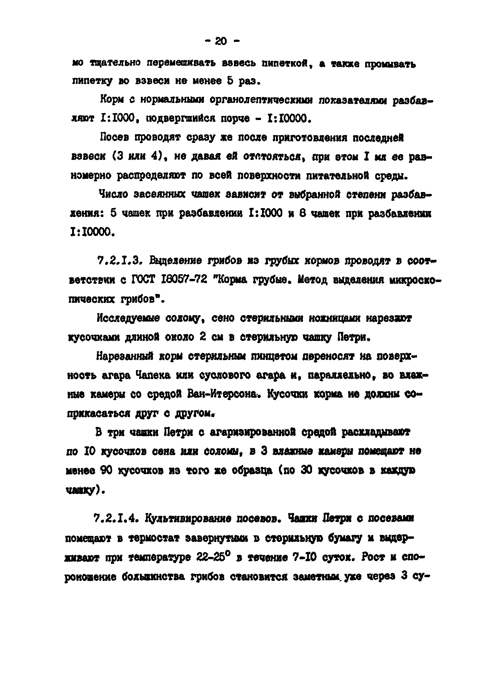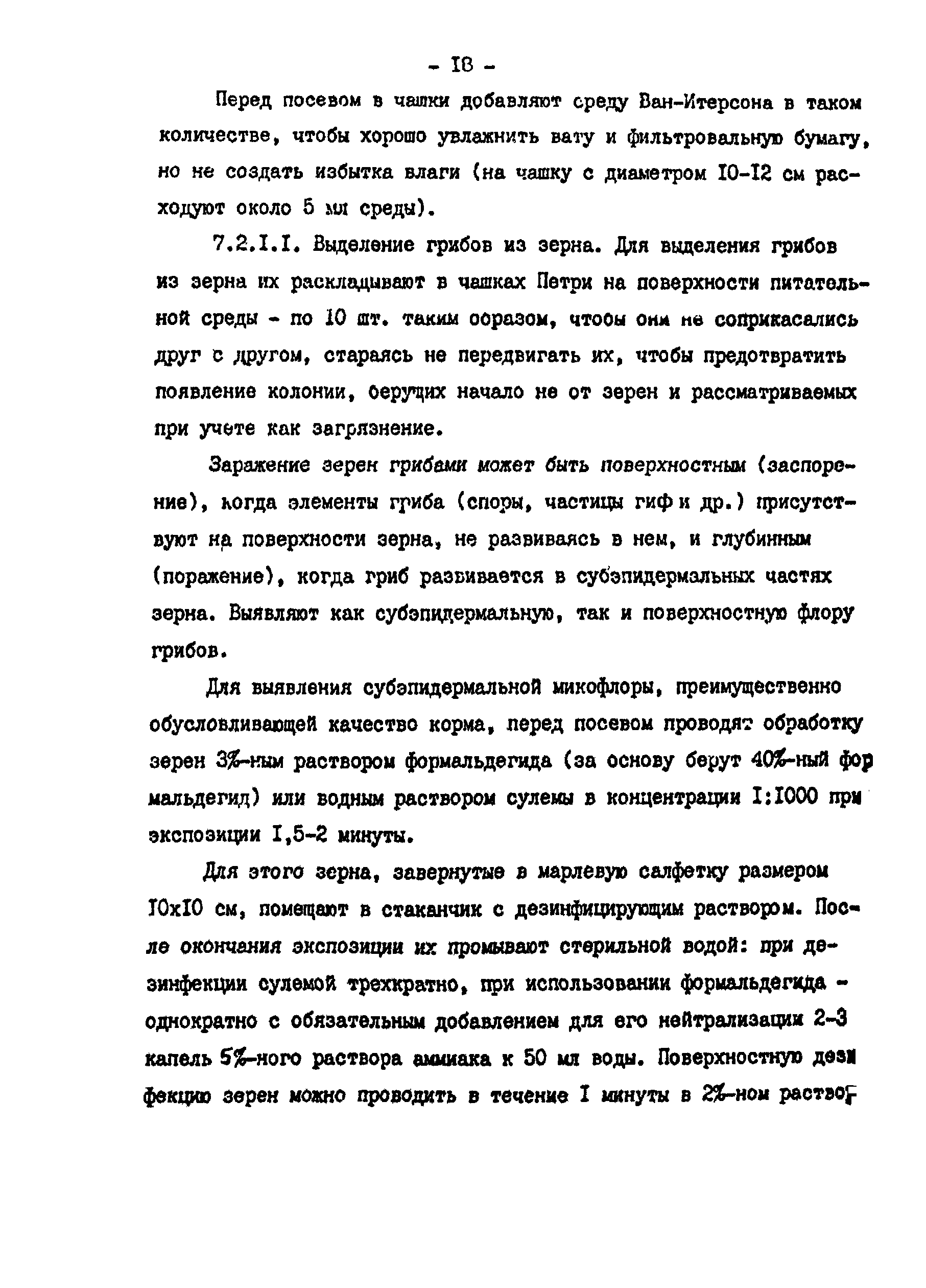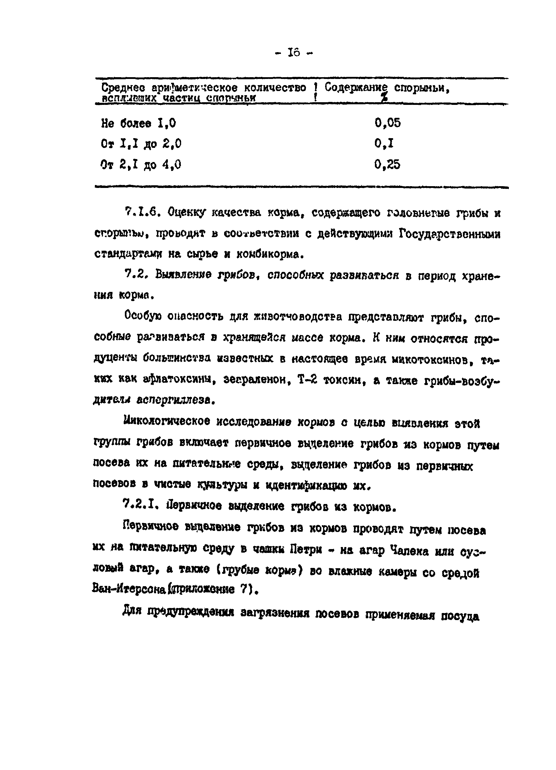 Методические указания по санитарно-микологической оценке и улучшению качества кормов| Статус: | действует | | Название рус.: | Методические указания по санитарно-микологической оценке и улучшению качества кормов | | Дата добавления в базу: | 01.09.2013 | | Дата актуализации: | 01.01.2021 | | Дата введения: | 25.02.1985 | | Область применения: | Методические указания определяют порядок проведения лабораторного санитарно-микологического исследования грубых, концентрированных (зерно, продукты его переработки, дрожжи кормовые, жмых, шроты) и комбинированных кормов, способы отбора и хранения средних проб, порядок использования некондиционных кормов, а также методы их обезвреживания).