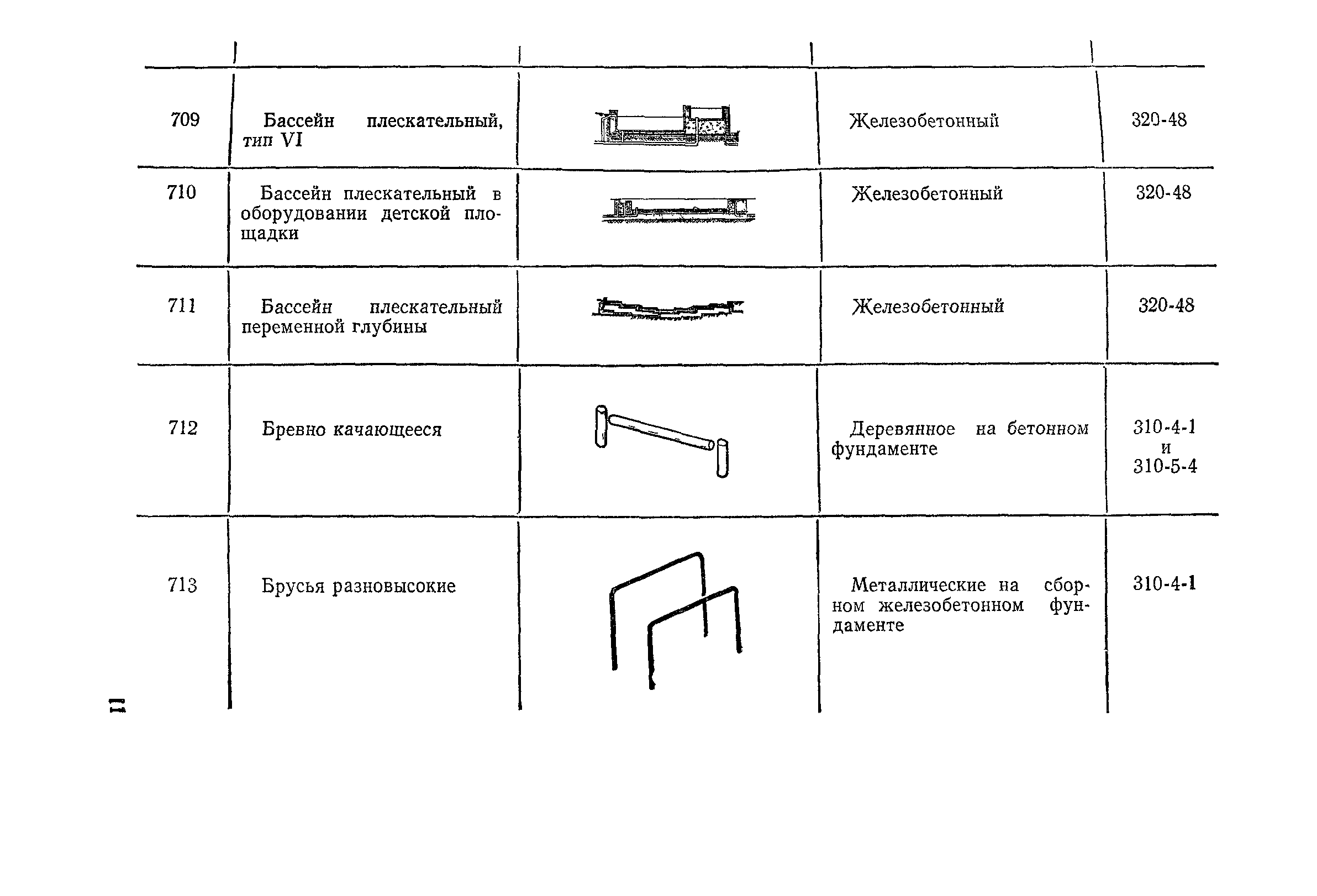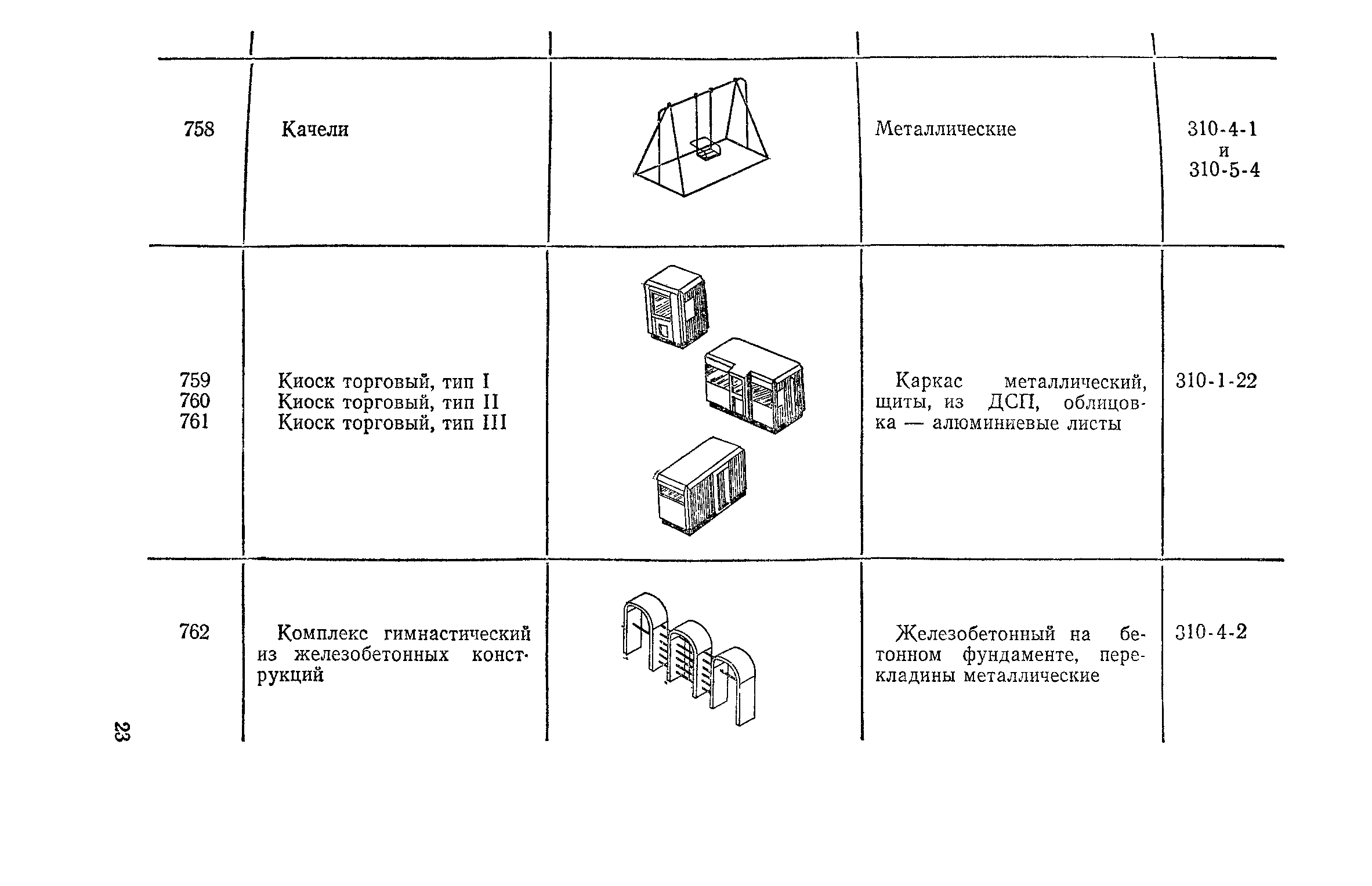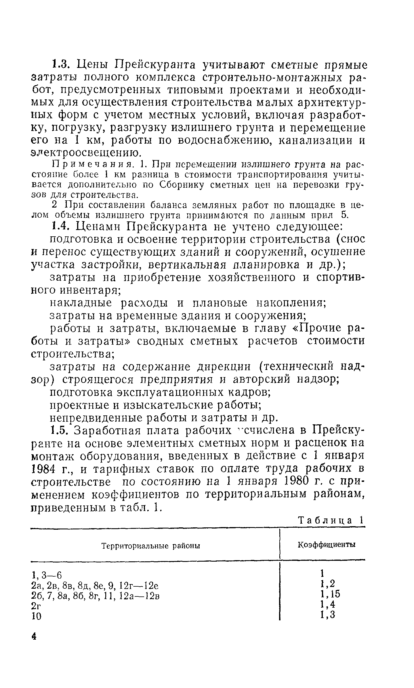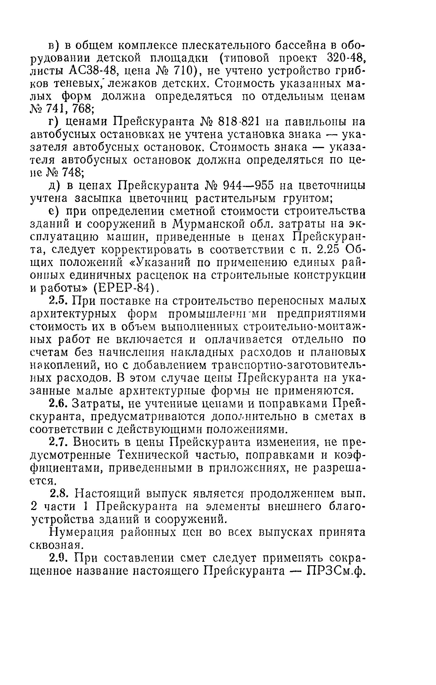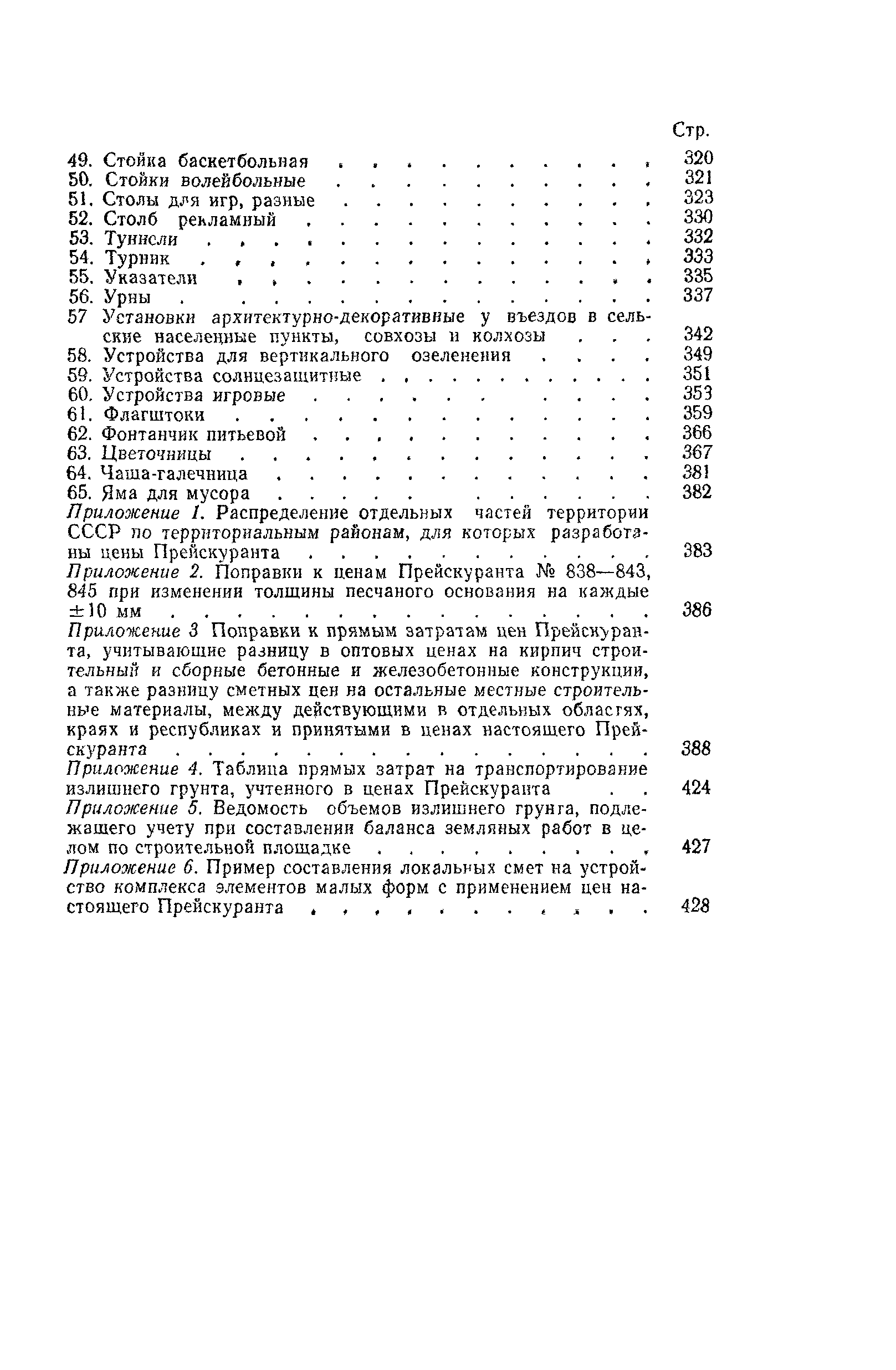 Выпуск 3. Прейскурант на элементы внешнего благоустройства зданий и сооружений. Часть 1. Малые архитектурные формы. Прейскуранты на строительство зданий и сооружений межотраслевого назначения| Статус: | действует | | Название рус.: | Выпуск 3. Прейскурант на элементы внешнего благоустройства зданий и сооружений. Часть 1. Малые архитектурные формы. Прейскуранты на строительство зданий и сооружений межотраслевого назначения | | Дата добавления в базу: | 01.09.2013 | | Дата актуализации: | 01.01.2021 | | Дата введения: | 01.11.1985 | | Оглавление: | Техническая часть 1. Арки 2. Балансиры 3. Барьер 4. Бассейны 5. Бревно качающееся 6. Брусья параллельные и разновысокие 7. Брусья-лабиринты 8. Бумы-балансиры 9. Ворота детские для игр 10. Горки 11. Городок гимнастический 12. Грибок теневой 13. Дворики песочные 14. Знак-указатель автобусных остановок 15. Зонт теневой 16. Карусель 17. Качалки балансиры 18. Качели 19. Киоски торговые 20. Комплексы гимнастические 21. Кострище 22. «Крокодил» для детских игровых площадок и плескательных бассейнов 23. Лабиринты 24. Лежак детский 25. Лесенки перекладины и лесенки-ступеньки 26. Лестницы разные 27. Лианы 28. «Луноход» 29. Манежи 30. Мачта для лазания 31. Мостики 32. Навесы 33. Ограды, ворота и калитки 34. Ограждения проезжей части 35. Ограждение хоккейного поля 36. Остановки автобусные 37. Павильоны на автобусных остановках 38. Песочницы 39. Пирамиды 40. Покрытия внутриплощадочных проездов, тротуаров, площадок, дорожек 41. Рекламы отдельностоящие для кинотеатров 42. Рукоходы 43. Сетки для лазания 44. Скамьи разные 45. Скульптуры игровые 46. Спираль 47. Стенды 48. Стенки игровые и гимнастические 49. Стойка баскетбольная 50. Стойки волейбольные 51. Столы для игр, разные 52. Столб рекламный 53. Туннели 54. Турник 55. Указатели 56. Урны 57. Установки архитектурно-декоративные у въездов в сельские населенные пункты, совхозы и колхозы 58. Устройства для вертикального озеленения 59. Устройства солнцезащитные 60. Устройства игровые 61. Флагштоки 62. Фонтанчик питьевой 63. Цветочницы 64. Чаша-галечница 65. Яма для мусора Приложение 1. Распределение отдельных частей территории СССР по территориальным районам, для которых разработаны цены Прейскуранта Приложение 2. Поправки к ценам Прейскуранта № 838-843, 845 при изменении толщины песчаного основания на каждые ±10 мм Приложение 3 Поправки к прямым затратам цен Прейскуранта, учитывающие разницу в оптовых ценах на кирпич строительный и сборные бетонные и железобетонные конструкции, а также разницу сметных цен на остальные местные строительные материалы, между действующими в отдельных областях, краях и республиках и принятыми в ценах настоящего Прейскуранта Приложение 4. Таблица прямых затрат на транспортирование излишнего грунта, учтенного в ценах Прейскуранта Приложение 5. Ведомость объемов излишнего грунта, подлежащего учету при составлении баланса земляных работ в целом по строительной площадке Приложение 6. Пример составления локальных смет на устройство комплекса элементов малых форм с применением цен настоящего Прейскуранта | | Разработан: | Гипропромтрансстрой Главтранспроекта