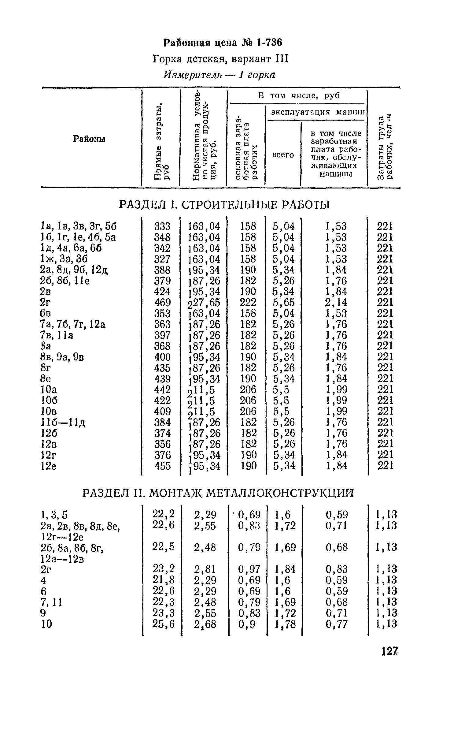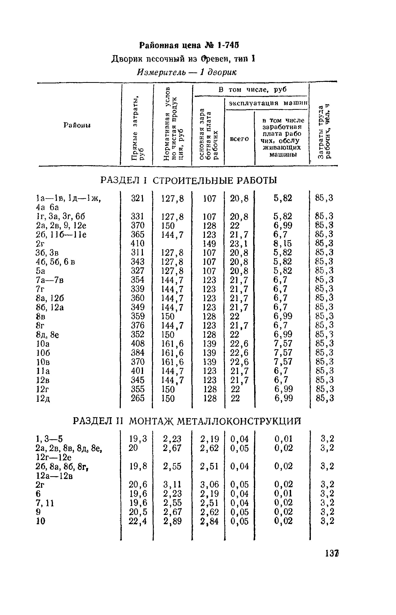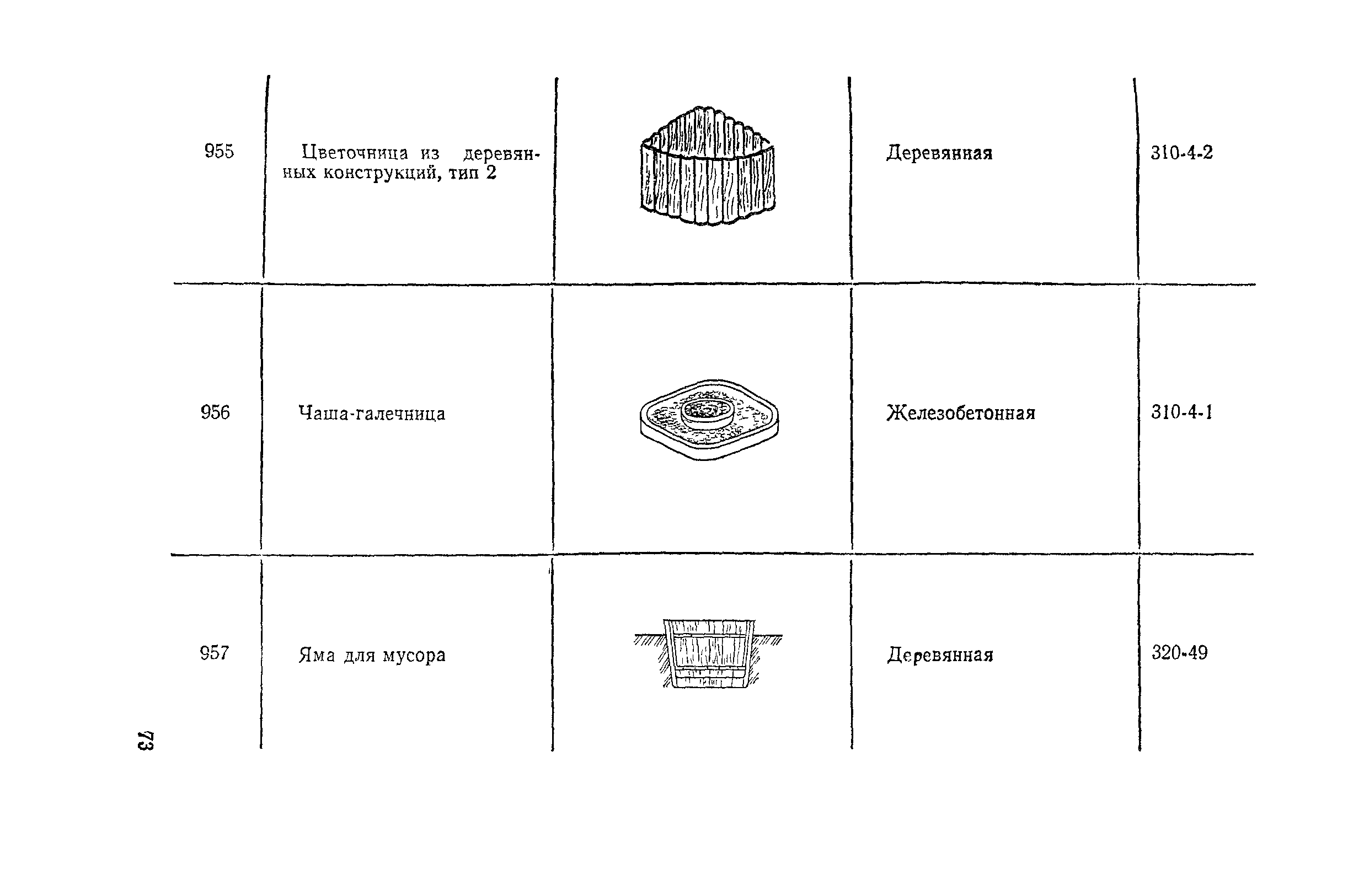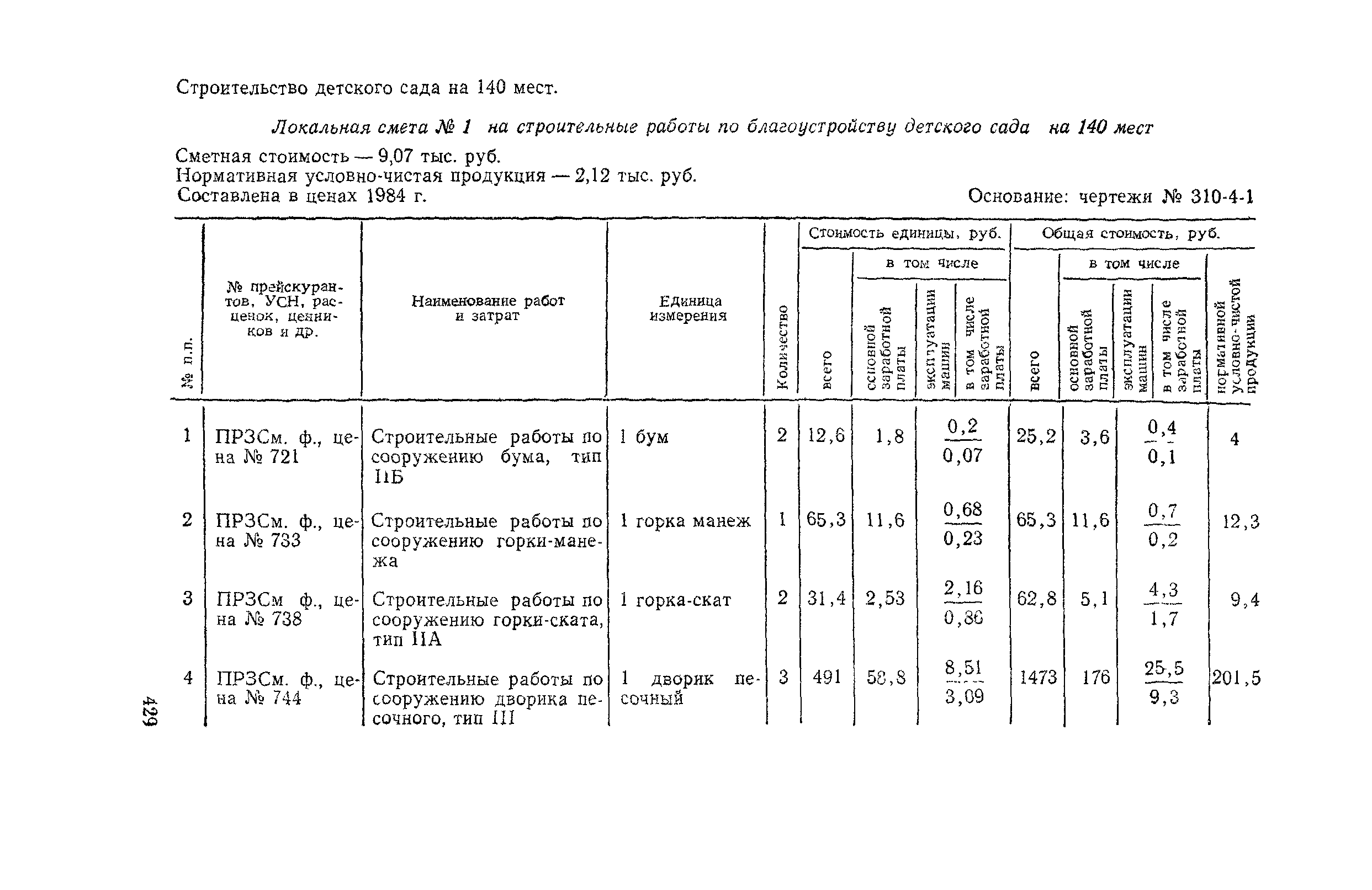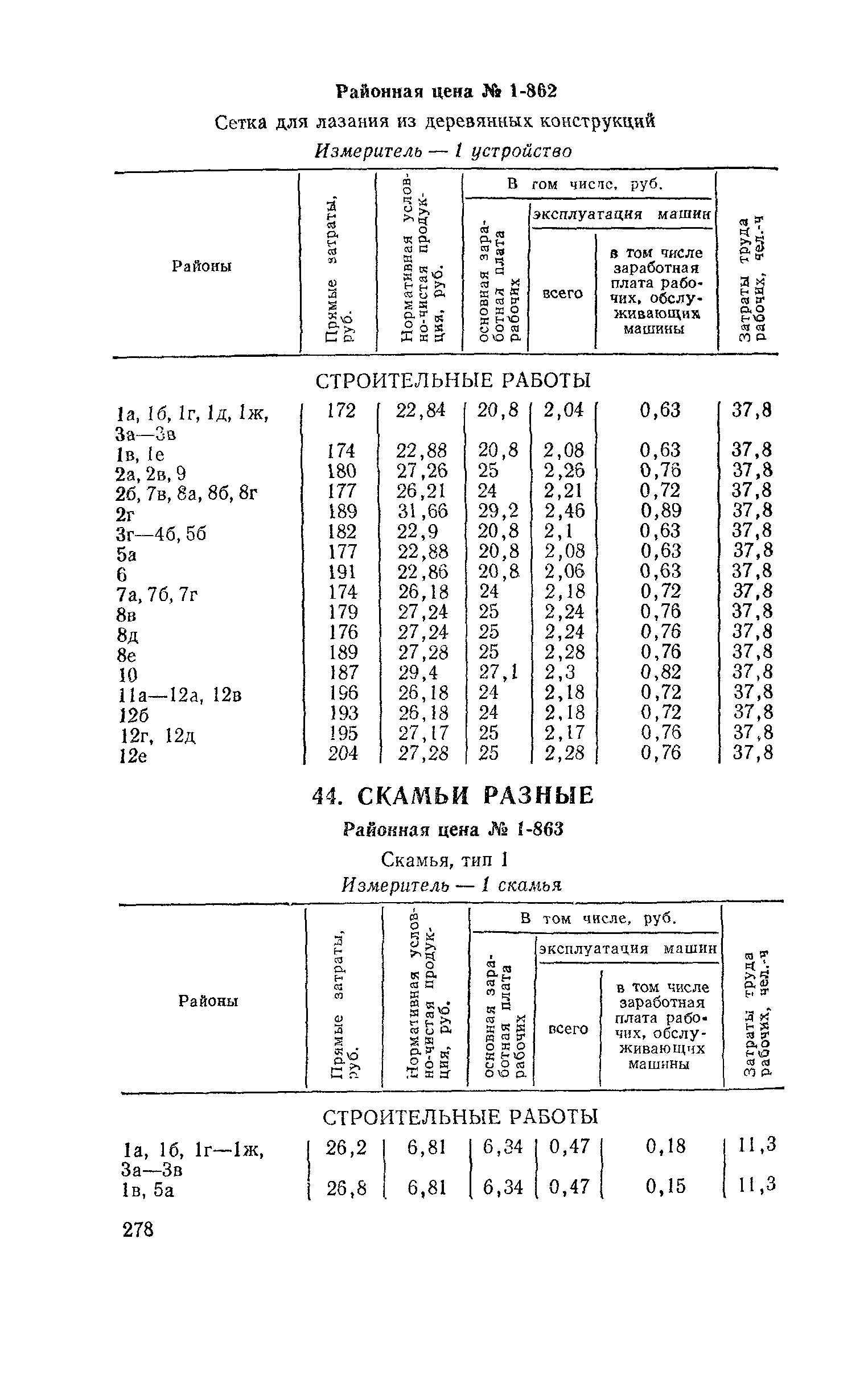 Выпуск 3. Прейскурант на элементы внешнего благоустройства зданий и сооружений. Часть 1. Малые архитектурные формы. Прейскуранты на строительство зданий и сооружений межотраслевого назначения| Статус: | действует | | Название рус.: | Выпуск 3. Прейскурант на элементы внешнего благоустройства зданий и сооружений. Часть 1. Малые архитектурные формы. Прейскуранты на строительство зданий и сооружений межотраслевого назначения | | Дата добавления в базу: | 01.09.2013 | | Дата актуализации: | 01.01.2021 | | Дата введения: | 01.11.1985 | | Оглавление: | Техническая часть 1. Арки 2. Балансиры 3. Барьер 4. Бассейны 5. Бревно качающееся 6. Брусья параллельные и разновысокие 7. Брусья-лабиринты 8. Бумы-балансиры 9. Ворота детские для игр 10. Горки 11. Городок гимнастический 12. Грибок теневой 13. Дворики песочные 14. Знак-указатель автобусных остановок 15. Зонт теневой 16. Карусель 17. Качалки балансиры 18. Качели 19. Киоски торговые 20. Комплексы гимнастические 21. Кострище 22. «Крокодил» для детских игровых площадок и плескательных бассейнов 23. Лабиринты 24. Лежак детский 25. Лесенки перекладины и лесенки-ступеньки 26. Лестницы разные 27. Лианы 28. «Луноход» 29. Манежи 30. Мачта для лазания 31. Мостики 32. Навесы 33. Ограды, ворота и калитки 34. Ограждения проезжей части 35. Ограждение хоккейного поля 36. Остановки автобусные 37. Павильоны на автобусных остановках 38. Песочницы 39. Пирамиды 40. Покрытия внутриплощадочных проездов, тротуаров, площадок, дорожек 41. Рекламы отдельностоящие для кинотеатров 42. Рукоходы 43. Сетки для лазания 44. Скамьи разные 45. Скульптуры игровые 46. Спираль 47. Стенды 48. Стенки игровые и гимнастические 49. Стойка баскетбольная 50. Стойки волейбольные 51. Столы для игр, разные 52. Столб рекламный 53. Туннели 54. Турник 55. Указатели 56. Урны 57. Установки архитектурно-декоративные у въездов в сельские населенные пункты, совхозы и колхозы 58. Устройства для вертикального озеленения 59. Устройства солнцезащитные 60. Устройства игровые 61. Флагштоки 62. Фонтанчик питьевой 63. Цветочницы 64. Чаша-галечница 65. Яма для мусора Приложение 1. Распределение отдельных частей территории СССР по территориальным районам, для которых разработаны цены Прейскуранта Приложение 2. Поправки к ценам Прейскуранта № 838-843, 845 при изменении толщины песчаного основания на каждые ±10 мм Приложение 3 Поправки к прямым затратам цен Прейскуранта, учитывающие разницу в оптовых ценах на кирпич строительный и сборные бетонные и железобетонные конструкции, а также разницу сметных цен на остальные местные строительные материалы, между действующими в отдельных областях, краях и республиках и принятыми в ценах настоящего Прейскуранта Приложение 4. Таблица прямых затрат на транспортирование излишнего грунта, учтенного в ценах Прейскуранта Приложение 5. Ведомость объемов излишнего грунта, подлежащего учету при составлении баланса земляных работ в целом по строительной площадке Приложение 6. Пример составления локальных смет на устройство комплекса элементов малых форм с применением цен настоящего Прейскуранта | | Разработан: | Гипропромтрансстрой Главтранспроекта