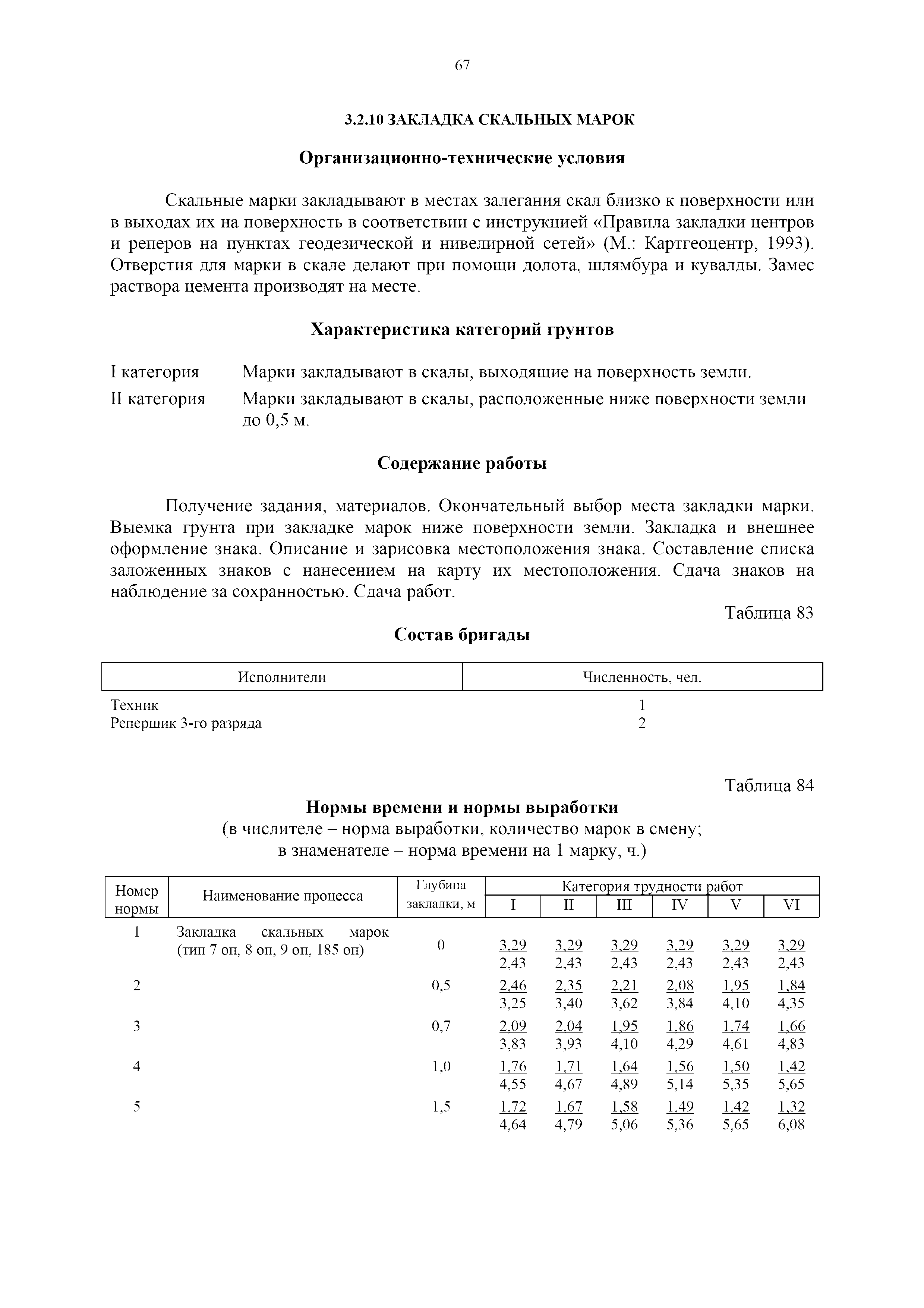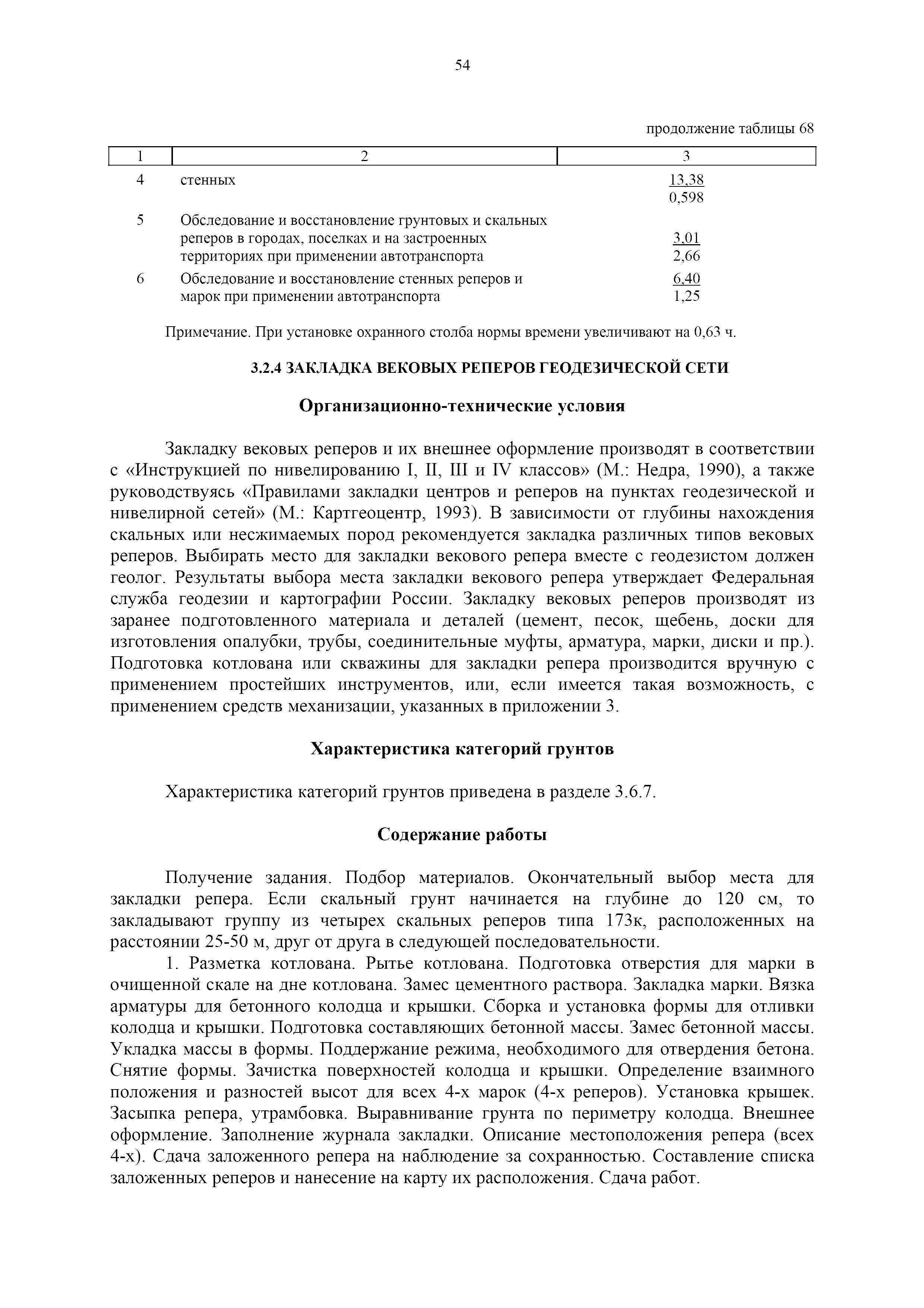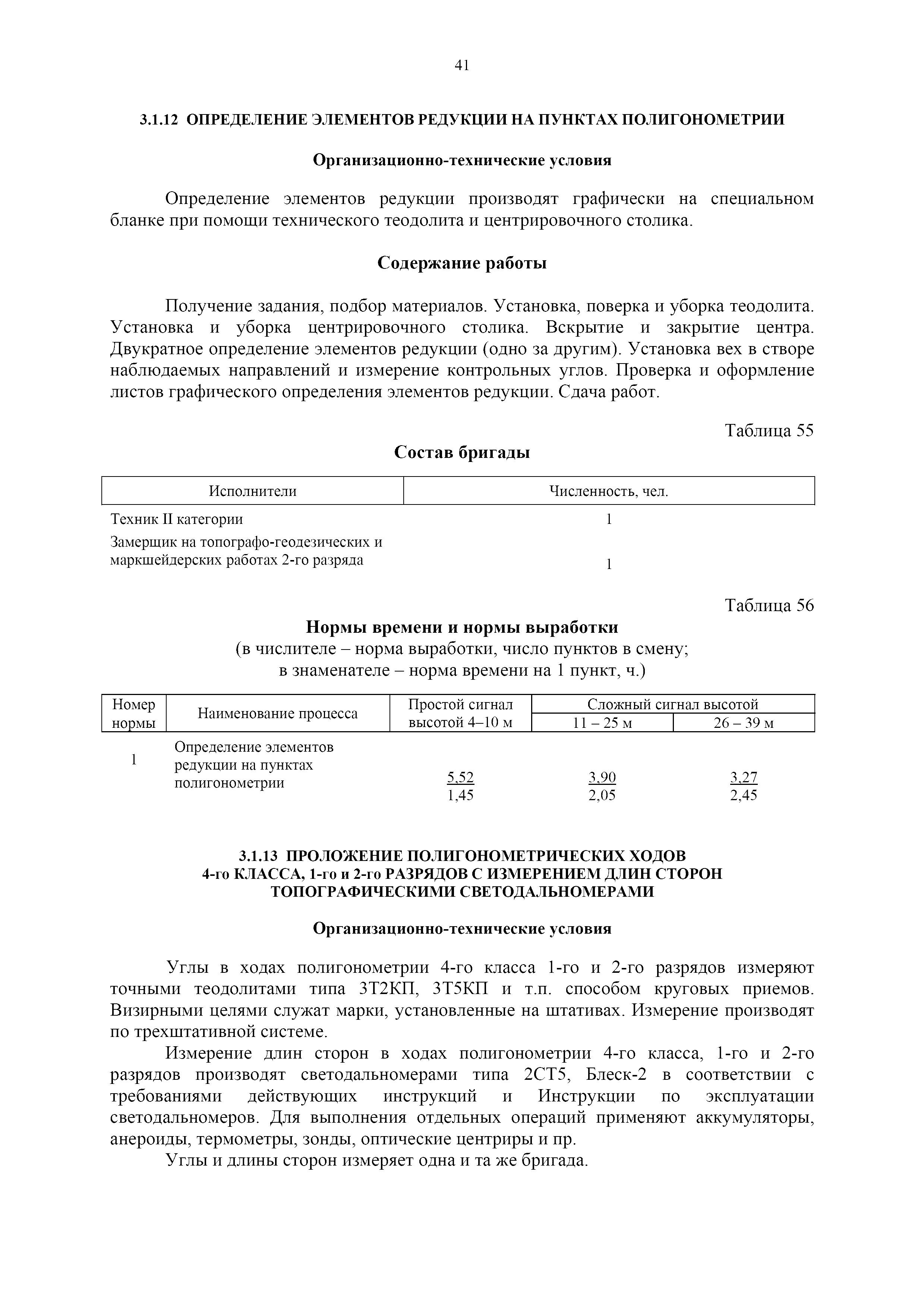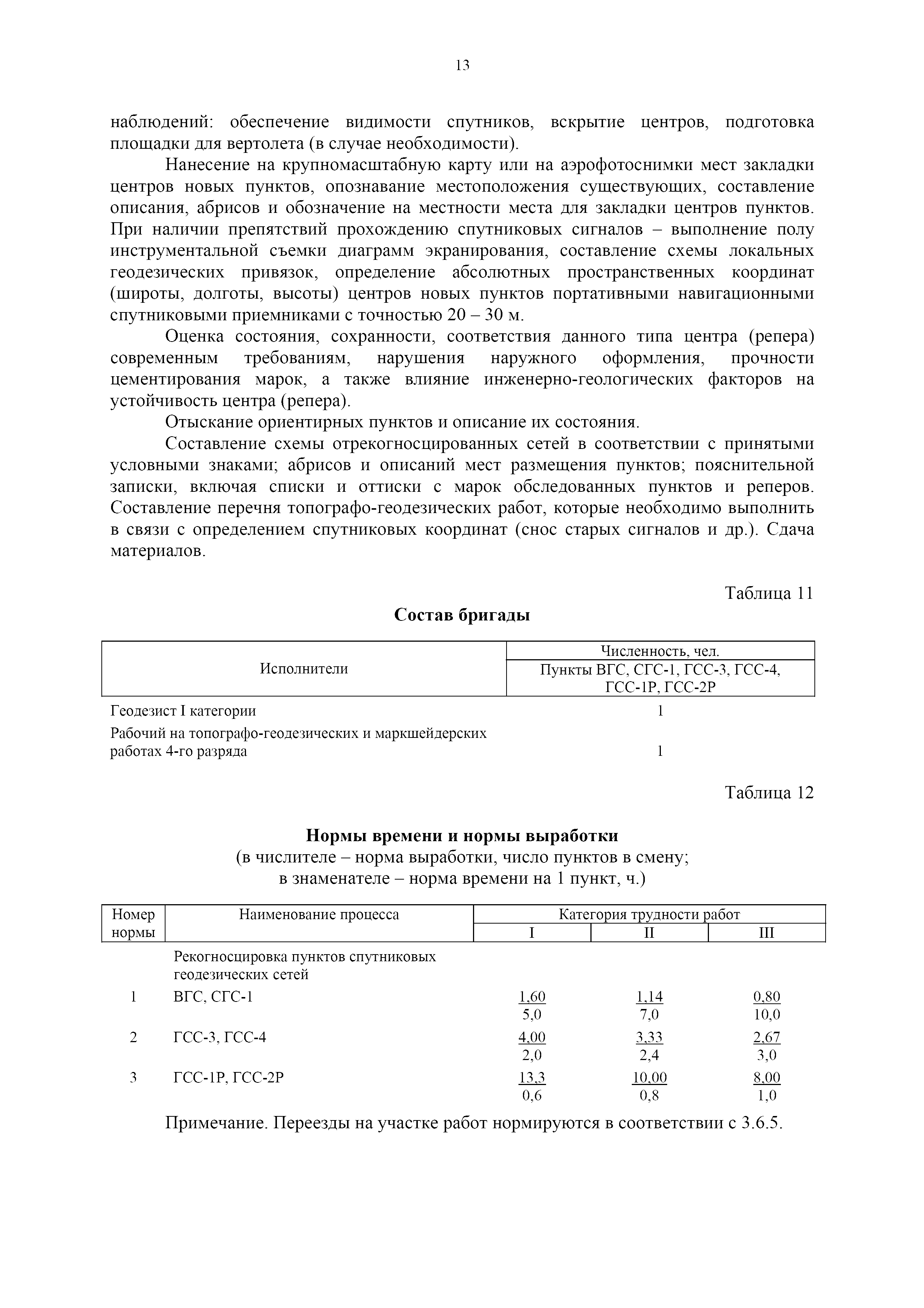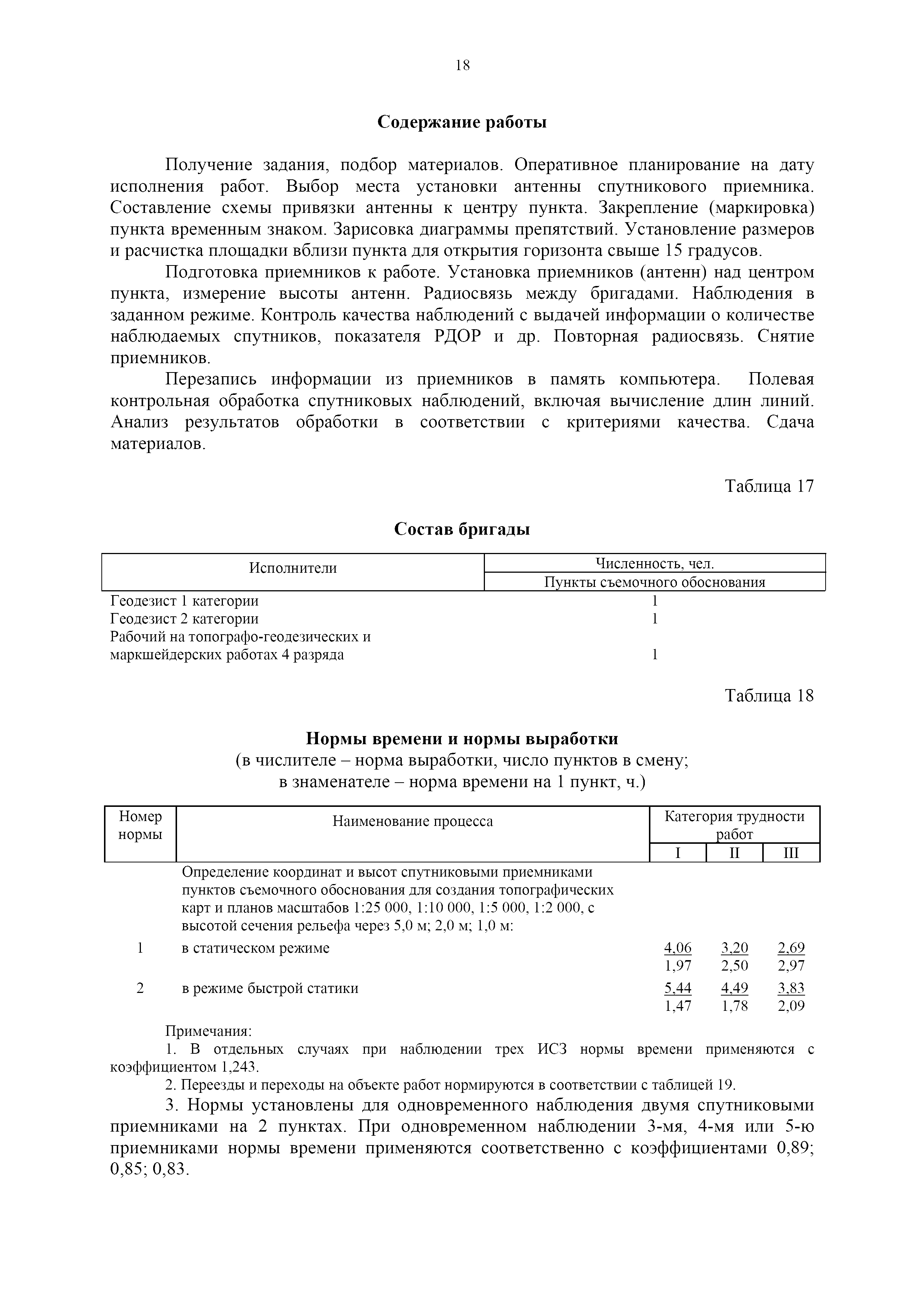 | Оглавление: | 1. Общая часть 2. Характеристика применяемых приборов, оборудования и технология работ 3. Организация труда 3.1. Создание и развитие государственных геодезических сетей и съемочного обоснования 3.1.1. Построение государственных геодезических сетей с применением глобальных навигационных спутниковых систем 3.1.2. Определение геодезических координат и высот пунктов съемочного обоснования с применением глобальных навигационных спутниковых систем 3.1.3. Гравиметрические работы 3.1.4. Измерение сторон по программе 1-го класса на геодинамических полигонах светодальномером "Гранат-М" 3.1.5. Рекогносцировка пунктов полигонометрии 4-го класса, 1-го и 2-го разрядов 3.1.6. Обследование и восстановление знаков полигонометрии 4-го класса, 1-го и 2-го разрядов на территории городов, поселков и промышленных площадках 3.1.7. Централизованное изготовление бетонных монолитов для центров, закладываемых на пунктах полигонометрии в городах, поселках и на промышленных площадках 3.1.8 Закладка центров на пунктах полигонометрии 4-го класса, 1-го и 2-го разрядов в городах, поселках и на промышленных площадках 3.1.9. Установка предохранительного чугунного колпака над центрами пунктов полигонометрии 4-го класса, 1-го и 2-го разрядов в городах, поселках и на промышленных площадках 3.1.10. Закладка стенных знаков полигонометрии в городах, поселках и на промышленных площадках 3.1.11. Измерение углов в полигонометрических ходах 4-го класса 3.1.12. Определение элементов редукции на пунктах полигонометрии 3.1.13. Проложение полигонометрических ходов 4-го класса, 1-го и 2-го разрядов с измерением длин сторон топографическими светодальномерами 3.1.14. Проложение теодолитных ходов 3.2. Нивелирование 3.2.1. Рекогносцировка линий нивелирования I, II, III классов 3.2.2. Обследование и восстановление нивелирных знаков 3.2.3. Обследование и восстановление знаков нивелирования II, III и IV классов в городах, поселках и на застроенных территориях 3.2.4. Закладка вековых реперов геодезической сети 3.2.5. Закладка фундаментальных реперов геодезической сети 3.2.6. Закладка центров (реперов) геодезической сети 3.2.7. Закладка грунтовых реперов геодезической сети, изготовленных на месте закладки 3.2.8. Централизованное изготовление железобетонных пилонов и опознавательных знаков для грунтовых реперов, закладываемых в зонах сезонного промерзания грунтов 3.2.9. Закладка грунтовых реперов, изготовленных централизованным путем 3.2.10. Закладка скальных марок 3.2.11. Закладка стенных марок и реперов 3.2.12. Нивелирование I класса 3.2.13. Нивелирование II, III и IV классов 3.2.14. Нивелирование II, III, IV классов в городах, поселках и на промышленных площадках 3.2.15. Нивелирование IV класса с одновременным опаздыванием, передачей высот на опознаки и их закреплением 3.2.16. Техническое нивелирование 3.3. Топографические съемки 3.3.1. Мензульная съемка в масштабе 1:10000 3.3.2. Мензульные съемки в масштабах 1:5000, 1:2000, 1:1000 и 1:500 3.3.3. Мензульная съемка застроенных территорий в масштабах 1:5000, 1:2000, 1:1000 и 1:500 3.3.4. Тахеометрическая съемка в масштабах 1:2000, 1:1000 и 1:500 3.3.5. Составление планов тахеометрической съемки в масштабах 1:2000, 1:1000 и 1:500 3.3.6. Горизонтальная и высотная съемки застроенных территорий в масштабах 1:2000, 1:1000 и 1:500 3.3.7. Составление планов горизонтальной и высотной съемки застроенных территорий в масштабах 1:2000, 1:1000 и 1:500 3.3.8. Маркировка плановых или планово-высо