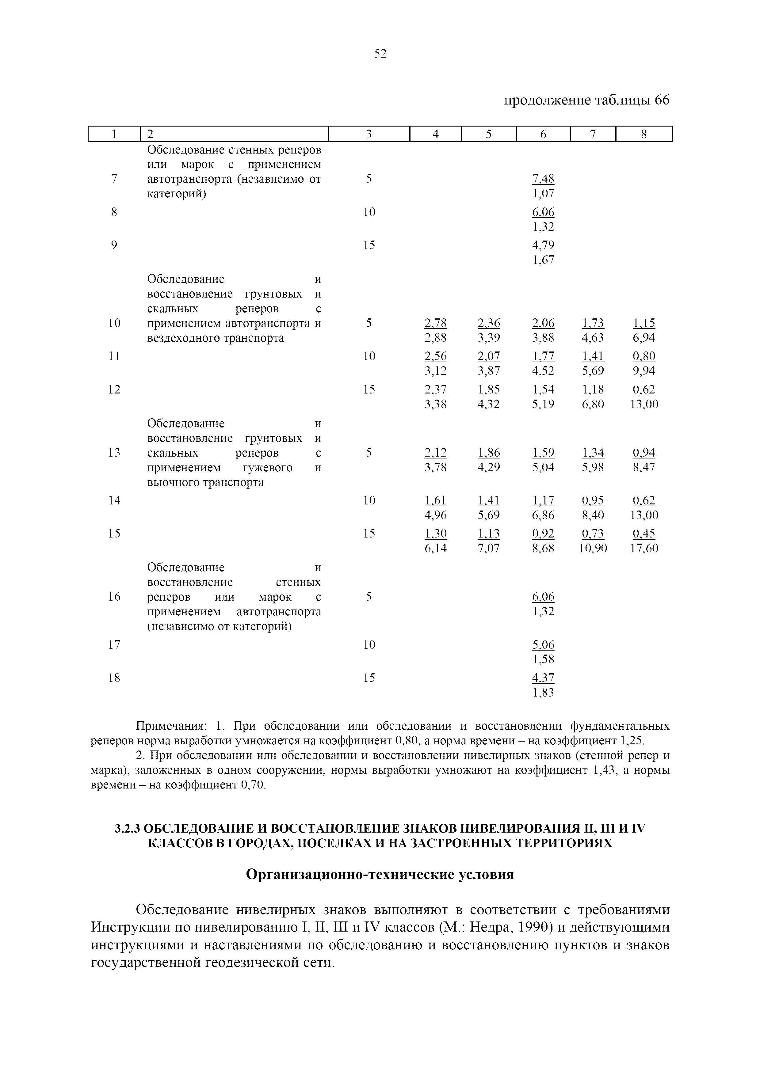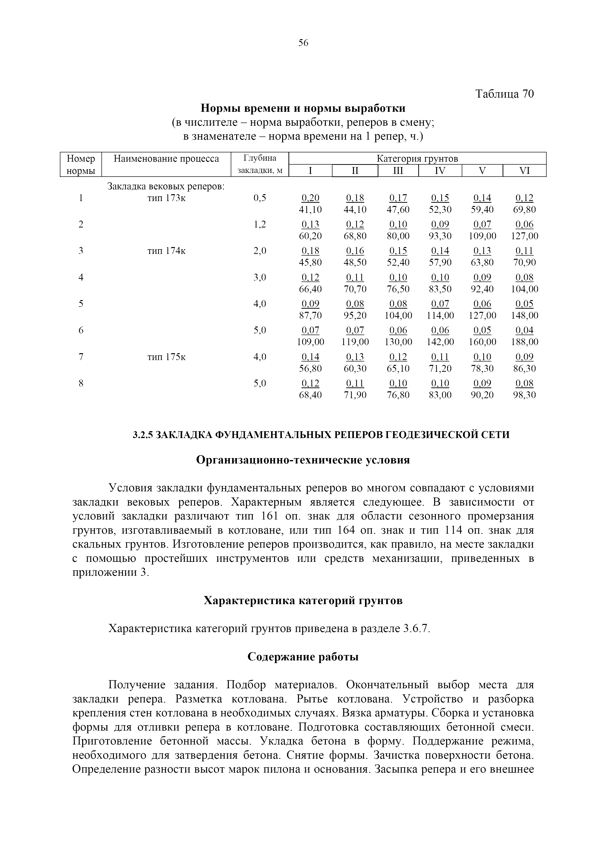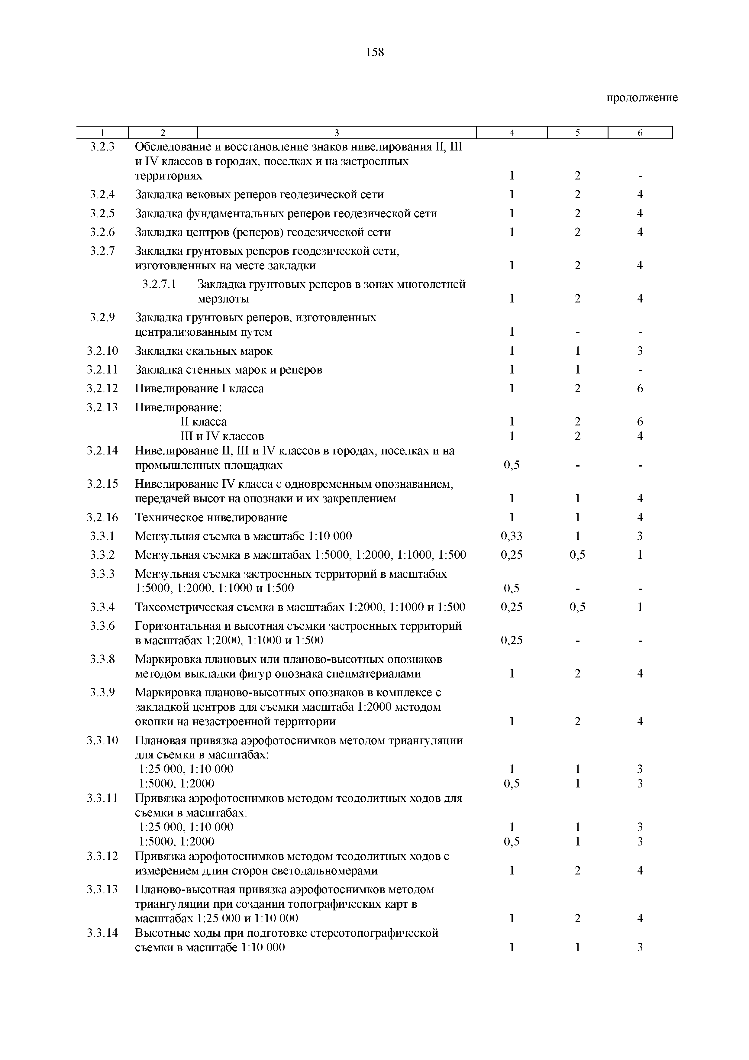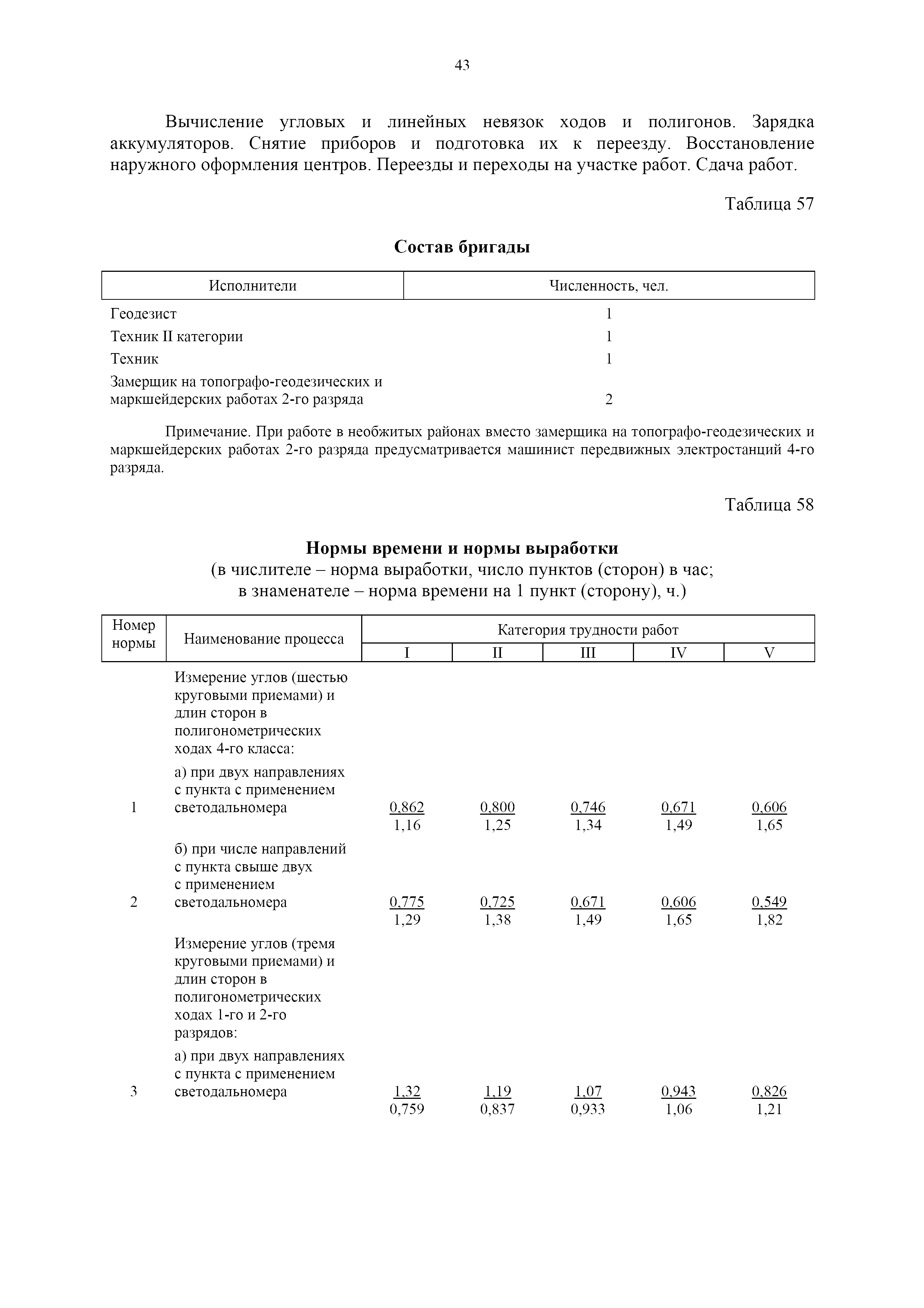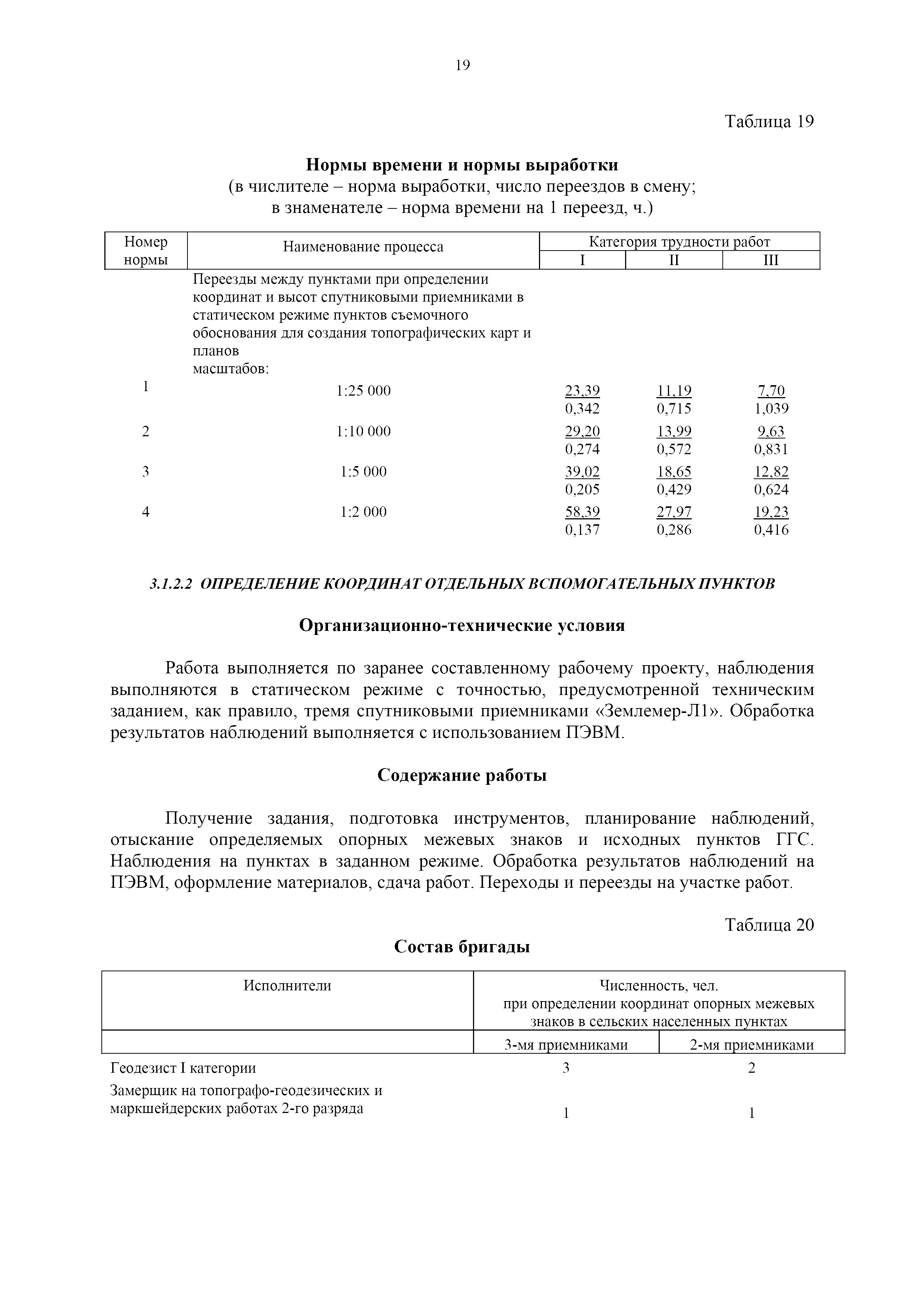 | Оглавление: | 1. Общая часть 2. Характеристика применяемых приборов, оборудования и технология работ 3. Организация труда 3.1. Создание и развитие государственных геодезических сетей и съемочного обоснования 3.1.1. Построение государственных геодезических сетей с применением глобальных навигационных спутниковых систем 3.1.2. Определение геодезических координат и высот пунктов съемочного обоснования с применением глобальных навигационных спутниковых систем 3.1.3. Гравиметрические работы 3.1.4. Измерение сторон по программе 1-го класса на геодинамических полигонах светодальномером "Гранат-М" 3.1.5. Рекогносцировка пунктов полигонометрии 4-го класса, 1-го и 2-го разрядов 3.1.6. Обследование и восстановление знаков полигонометрии 4-го класса, 1-го и 2-го разрядов на территории городов, поселков и промышленных площадках 3.1.7. Централизованное изготовление бетонных монолитов для центров, закладываемых на пунктах полигонометрии в городах, поселках и на промышленных площадках 3.1.8 Закладка центров на пунктах полигонометрии 4-го класса, 1-го и 2-го разрядов в городах, поселках и на промышленных площадках 3.1.9. Установка предохранительного чугунного колпака над центрами пунктов полигонометрии 4-го класса, 1-го и 2-го разрядов в городах, поселках и на промышленных площадках 3.1.10. Закладка стенных знаков полигонометрии в городах, поселках и на промышленных площадках 3.1.11. Измерение углов в полигонометрических ходах 4-го класса 3.1.12. Определение элементов редукции на пунктах полигонометрии 3.1.13. Проложение полигонометрических ходов 4-го класса, 1-го и 2-го разрядов с измерением длин сторон топографическими светодальномерами 3.1.14. Проложение теодолитных ходов 3.2. Нивелирование 3.2.1. Рекогносцировка линий нивелирования I, II, III классов 3.2.2. Обследование и восстановление нивелирных знаков 3.2.3. Обследование и восстановление знаков нивелирования II, III и IV классов в городах, поселках и на застроенных территориях 3.2.4. Закладка вековых реперов геодезической сети 3.2.5. Закладка фундаментальных реперов геодезической сети 3.2.6. Закладка центров (реперов) геодезической сети 3.2.7. Закладка грунтовых реперов геодезической сети, изготовленных на месте закладки 3.2.8. Централизованное изготовление железобетонных пилонов и опознавательных знаков для грунтовых реперов, закладываемых в зонах сезонного промерзания грунтов 3.2.9. Закладка грунтовых реперов, изготовленных централизованным путем 3.2.10. Закладка скальных марок 3.2.11. Закладка стенных марок и реперов 3.2.12. Нивелирование I класса 3.2.13. Нивелирование II, III и IV классов 3.2.14. Нивелирование II, III, IV классов в городах, поселках и на промышленных площадках 3.2.15. Нивелирование IV класса с одновременным опаздыванием, передачей высот на опознаки и их закреплением 3.2.16. Техническое нивелирование 3.3. Топографические съемки 3.3.1. Мензульная съемка в масштабе 1:10000 3.3.2. Мензульные съемки в масштабах 1:5000, 1:2000, 1:1000 и 1:500 3.3.3. Мензульная съемка застроенных территорий в масштабах 1:5000, 1:2000, 1:1000 и 1:500 3.3.4. Тахеометрическая съемка в масштабах 1:2000, 1:1000 и 1:500 3.3.5. Составление планов тахеометрической съемки в масштабах 1:2000, 1:1000 и 1:500 3.3.6. Горизонтальная и высотная съемки застроенных территорий в масштабах 1:2000, 1:1000 и 1:500 3.3.7. Составление планов горизонтальной и высотной съемки застроенных территорий в масштабах 1:2000, 1:1000 и 1:500 3.3.8. Маркировка плановых или планово-высо