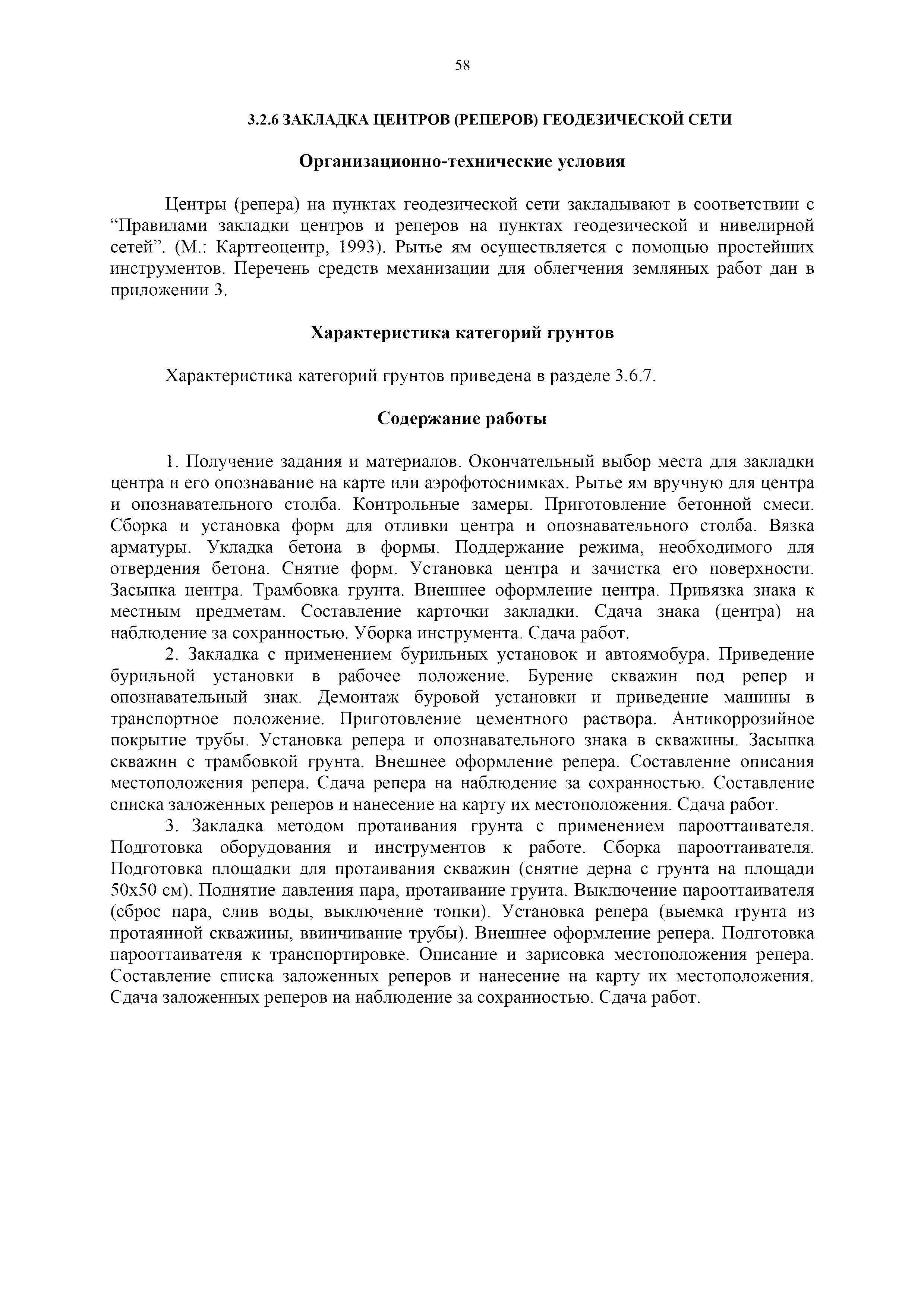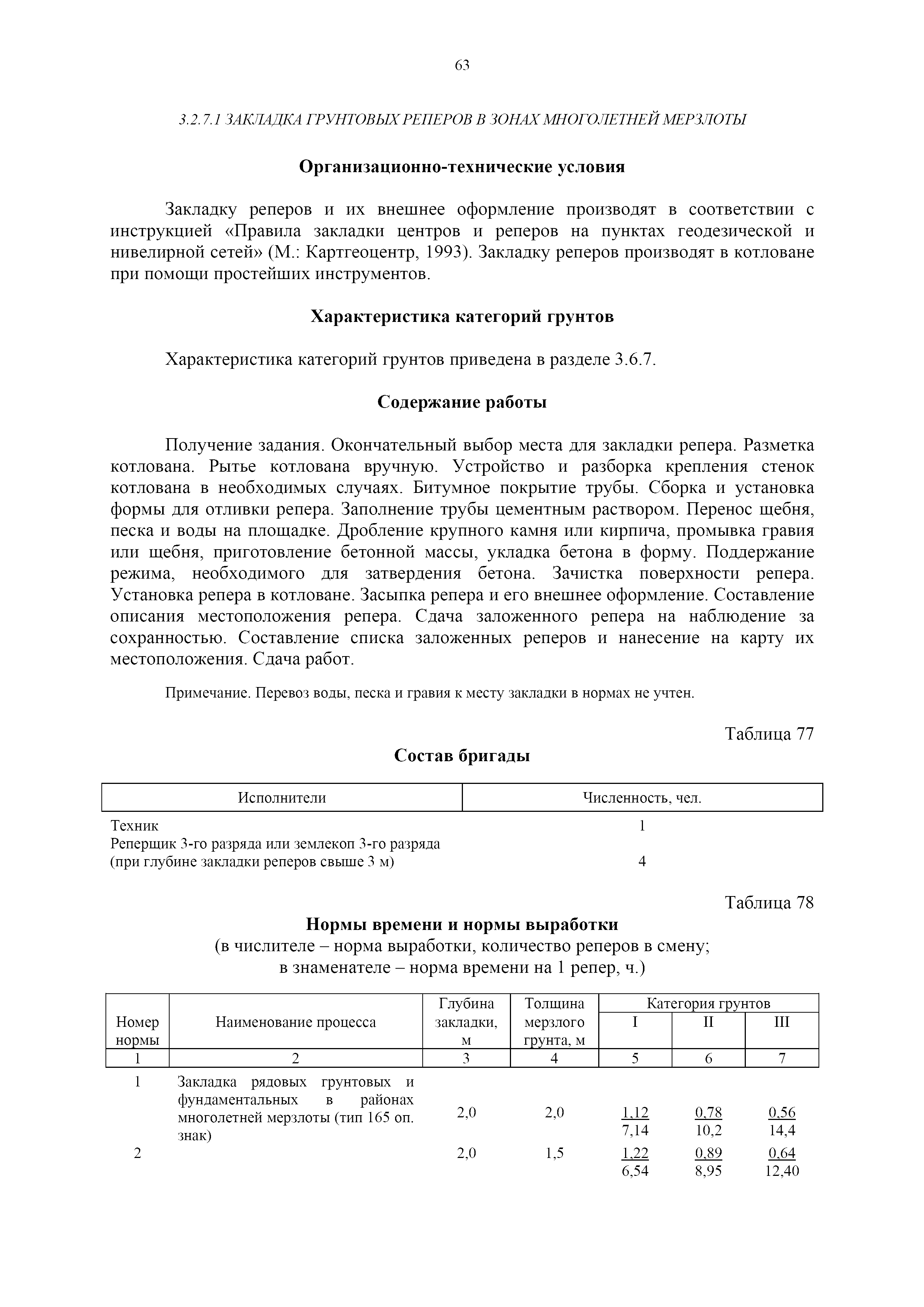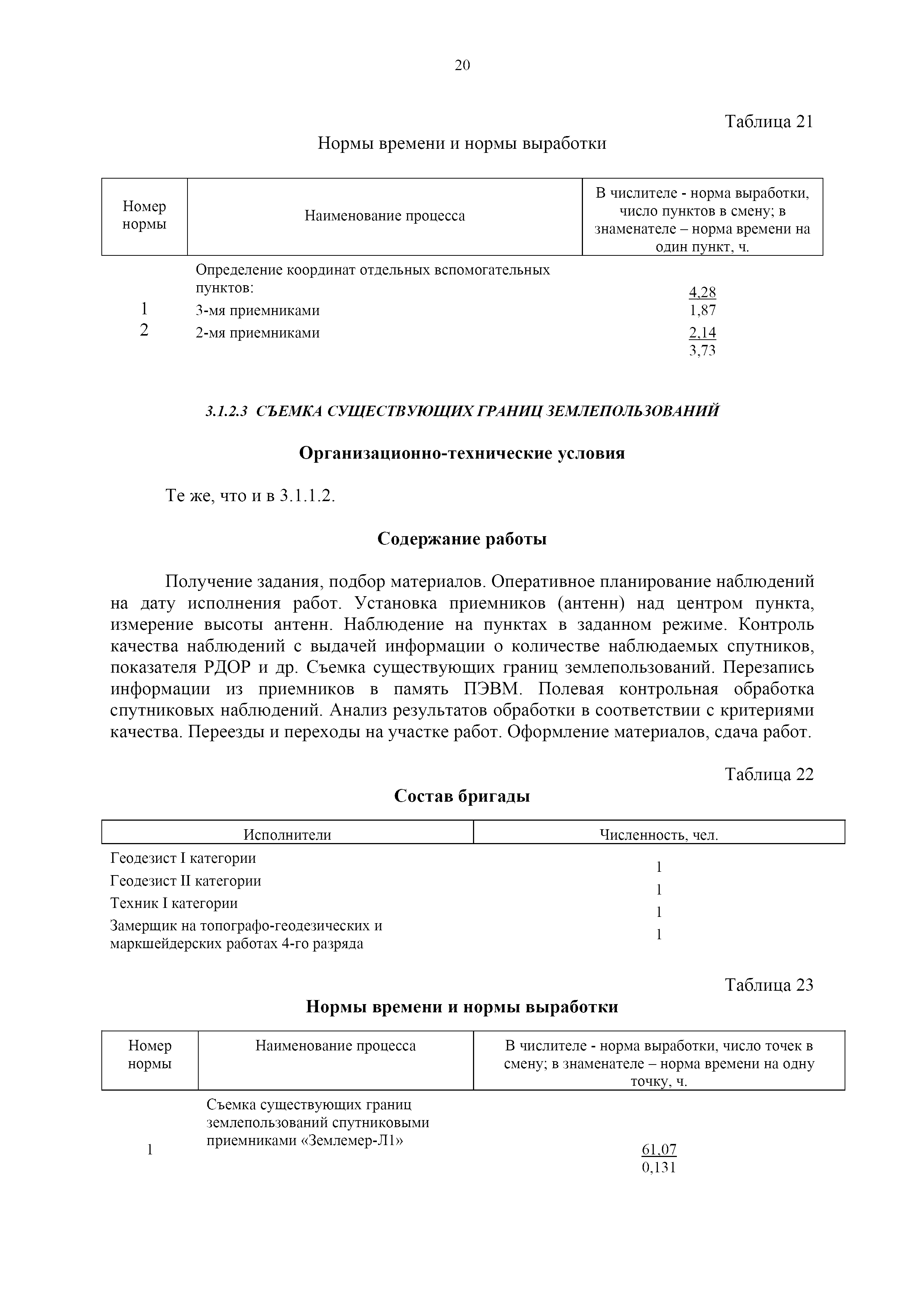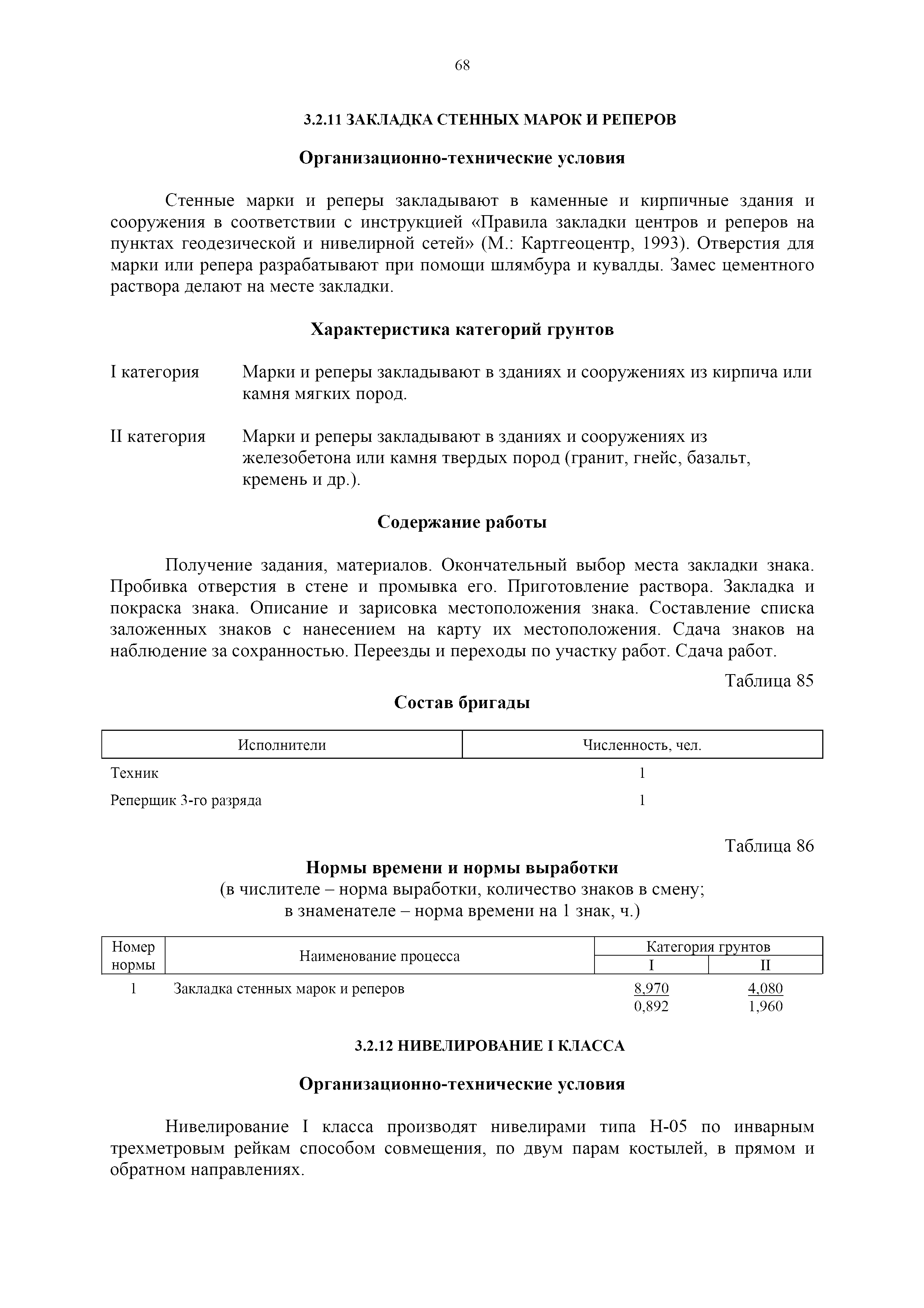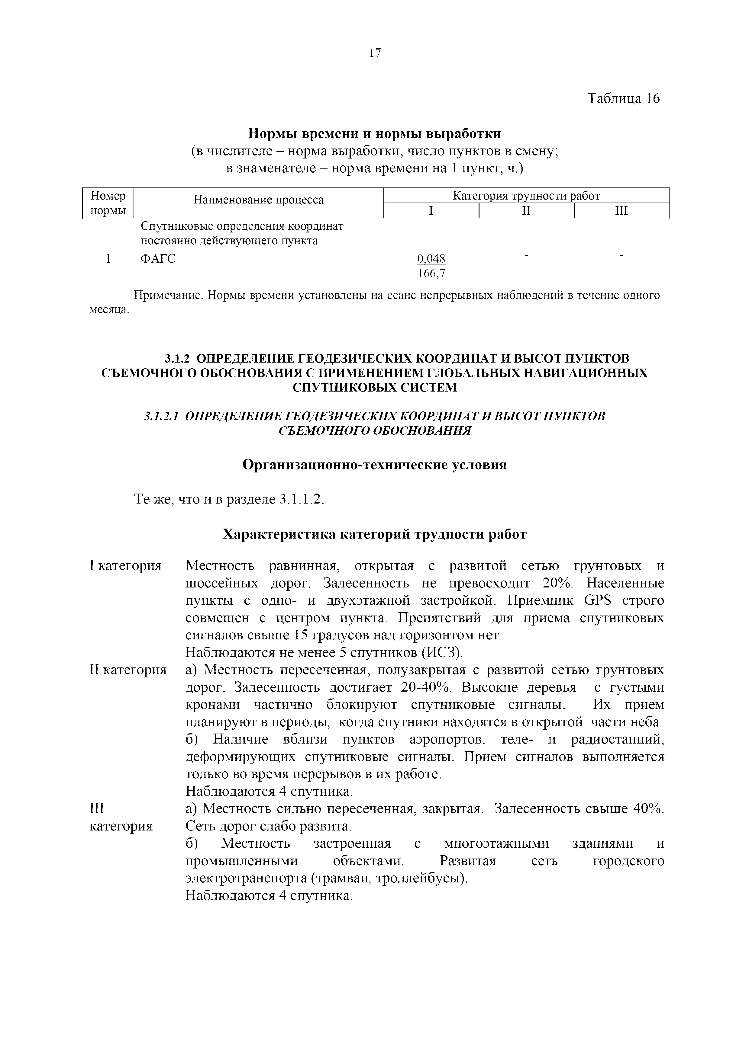 | Оглавление: | 1. Общая часть 2. Характеристика применяемых приборов, оборудования и технология работ 3. Организация труда 3.1. Создание и развитие государственных геодезических сетей и съемочного обоснования 3.1.1. Построение государственных геодезических сетей с применением глобальных навигационных спутниковых систем 3.1.2. Определение геодезических координат и высот пунктов съемочного обоснования с применением глобальных навигационных спутниковых систем 3.1.3. Гравиметрические работы 3.1.4. Измерение сторон по программе 1-го класса на геодинамических полигонах светодальномером "Гранат-М" 3.1.5. Рекогносцировка пунктов полигонометрии 4-го класса, 1-го и 2-го разрядов 3.1.6. Обследование и восстановление знаков полигонометрии 4-го класса, 1-го и 2-го разрядов на территории городов, поселков и промышленных площадках 3.1.7. Централизованное изготовление бетонных монолитов для центров, закладываемых на пунктах полигонометрии в городах, поселках и на промышленных площадках 3.1.8 Закладка центров на пунктах полигонометрии 4-го класса, 1-го и 2-го разрядов в городах, поселках и на промышленных площадках 3.1.9. Установка предохранительного чугунного колпака над центрами пунктов полигонометрии 4-го класса, 1-го и 2-го разрядов в городах, поселках и на промышленных площадках 3.1.10. Закладка стенных знаков полигонометрии в городах, поселках и на промышленных площадках 3.1.11. Измерение углов в полигонометрических ходах 4-го класса 3.1.12. Определение элементов редукции на пунктах полигонометрии 3.1.13. Проложение полигонометрических ходов 4-го класса, 1-го и 2-го разрядов с измерением длин сторон топографическими светодальномерами 3.1.14. Проложение теодолитных ходов 3.2. Нивелирование 3.2.1. Рекогносцировка линий нивелирования I, II, III классов 3.2.2. Обследование и восстановление нивелирных знаков 3.2.3. Обследование и восстановление знаков нивелирования II, III и IV классов в городах, поселках и на застроенных территориях 3.2.4. Закладка вековых реперов геодезической сети 3.2.5. Закладка фундаментальных реперов геодезической сети 3.2.6. Закладка центров (реперов) геодезической сети 3.2.7. Закладка грунтовых реперов геодезической сети, изготовленных на месте закладки 3.2.8. Централизованное изготовление железобетонных пилонов и опознавательных знаков для грунтовых реперов, закладываемых в зонах сезонного промерзания грунтов 3.2.9. Закладка грунтовых реперов, изготовленных централизованным путем 3.2.10. Закладка скальных марок 3.2.11. Закладка стенных марок и реперов 3.2.12. Нивелирование I класса 3.2.13. Нивелирование II, III и IV классов 3.2.14. Нивелирование II, III, IV классов в городах, поселках и на промышленных площадках 3.2.15. Нивелирование IV класса с одновременным опаздыванием, передачей высот на опознаки и их закреплением 3.2.16. Техническое нивелирование 3.3. Топографические съемки 3.3.1. Мензульная съемка в масштабе 1:10000 3.3.2. Мензульные съемки в масштабах 1:5000, 1:2000, 1:1000 и 1:500 3.3.3. Мензульная съемка застроенных территорий в масштабах 1:5000, 1:2000, 1:1000 и 1:500 3.3.4. Тахеометрическая съемка в масштабах 1:2000, 1:1000 и 1:500 3.3.5. Составление планов тахеометрической съемки в масштабах 1:2000, 1:1000 и 1:500 3.3.6. Горизонтальная и высотная съемки застроенных территорий в масштабах 1:2000, 1:1000 и 1:500 3.3.7. Составление планов горизонтальной и высотной съемки застроенных территорий в масштабах 1:2000, 1:1000 и 1:500 3.3.8. Маркировка плановых или планово-высо