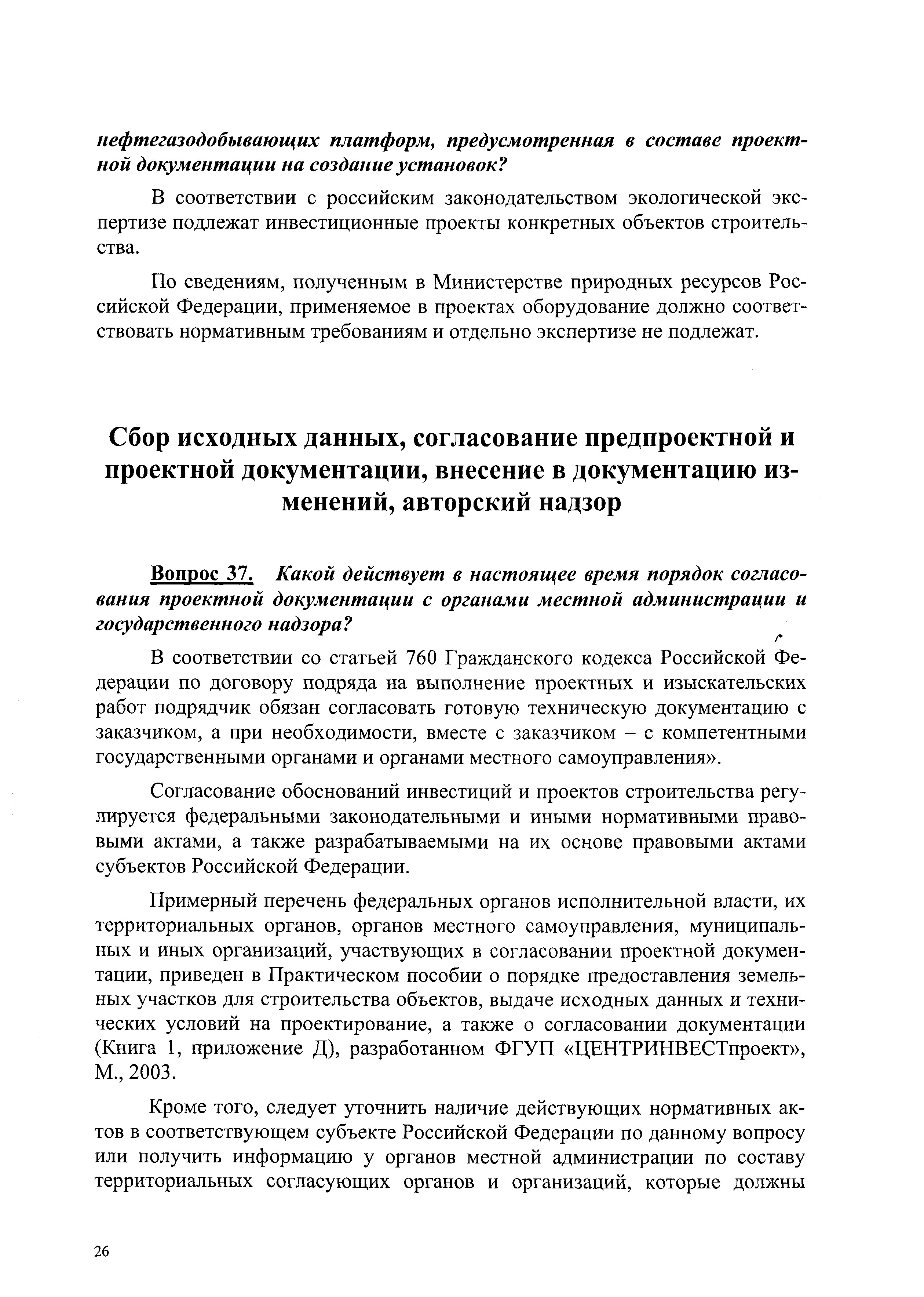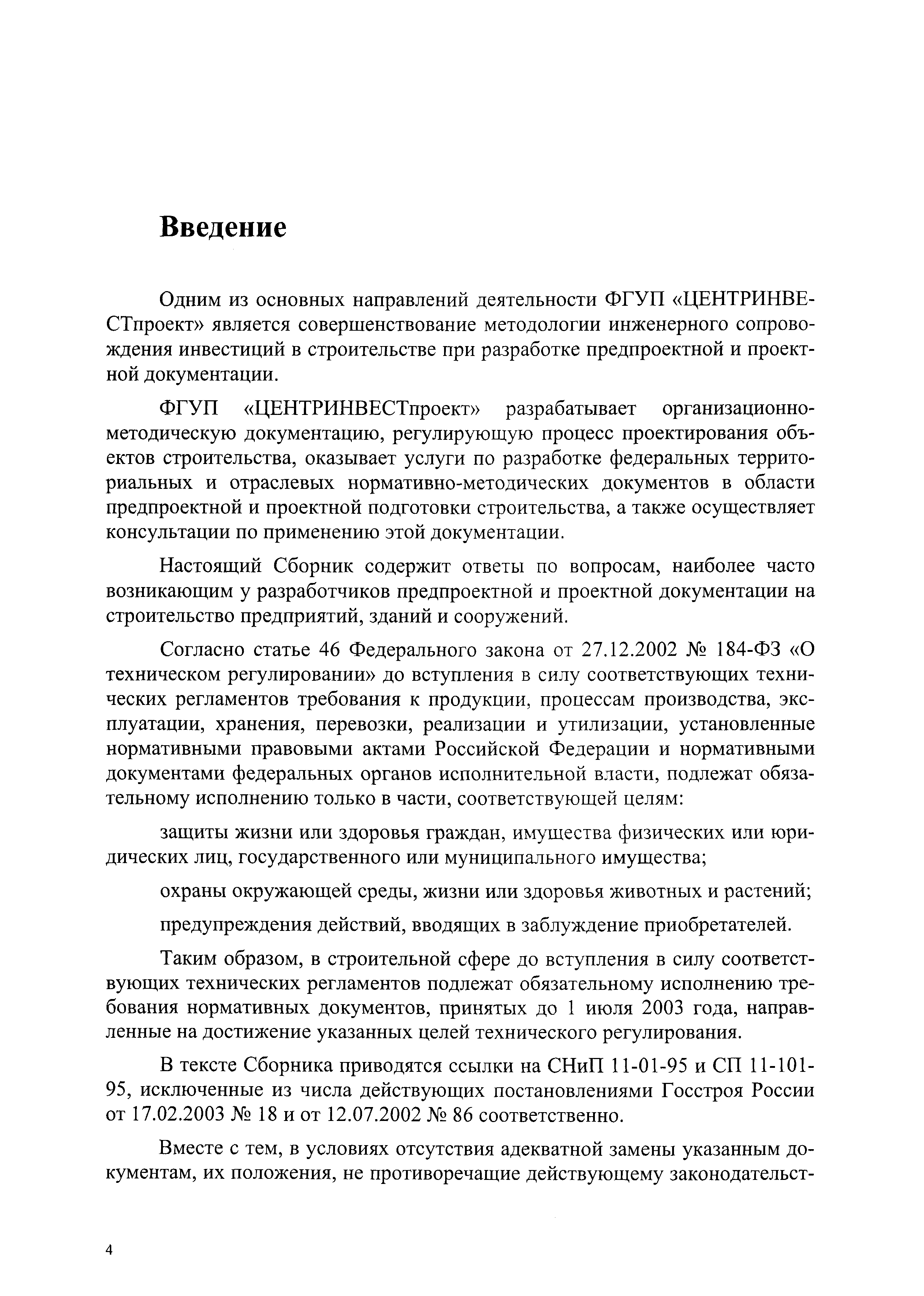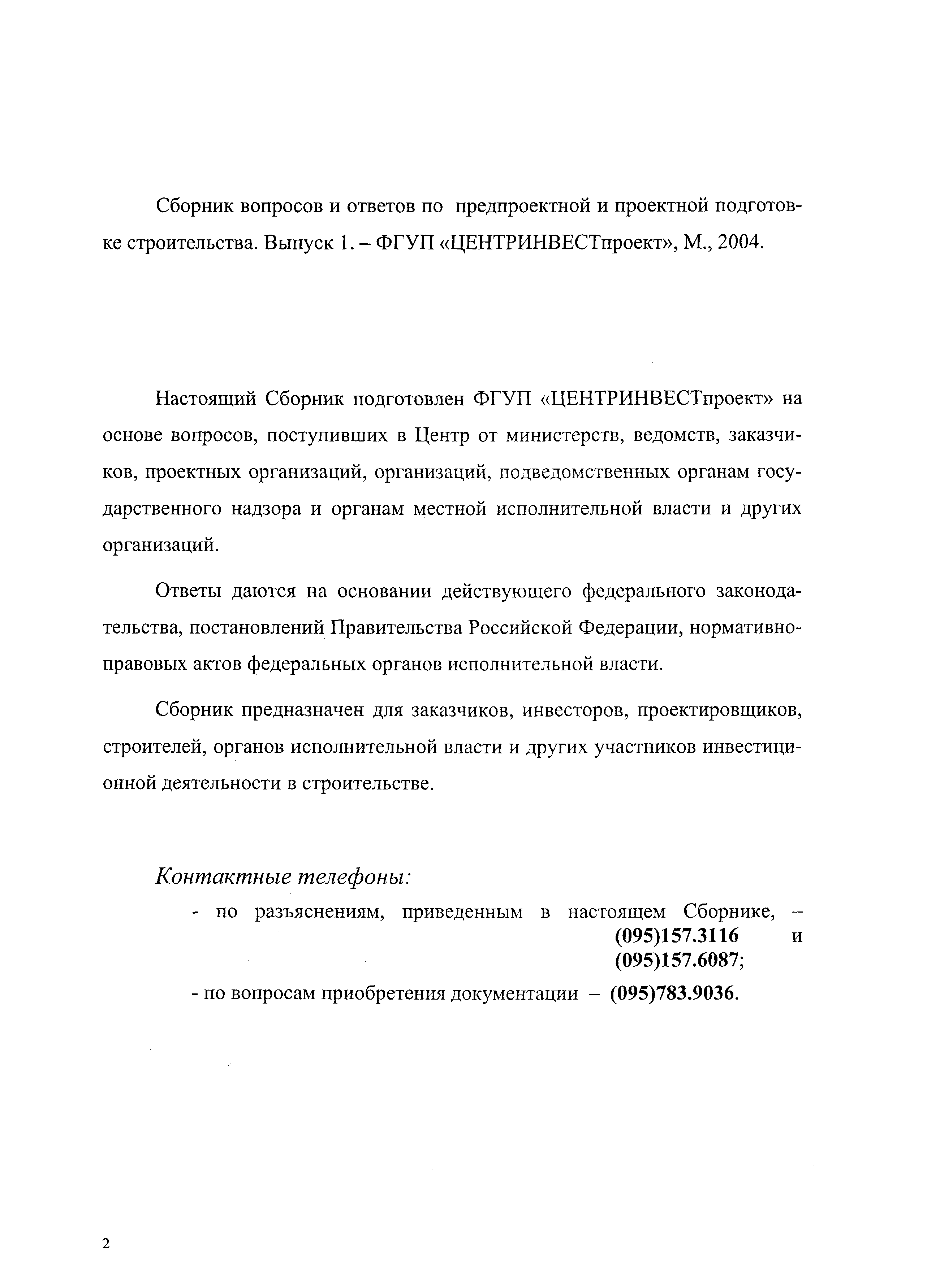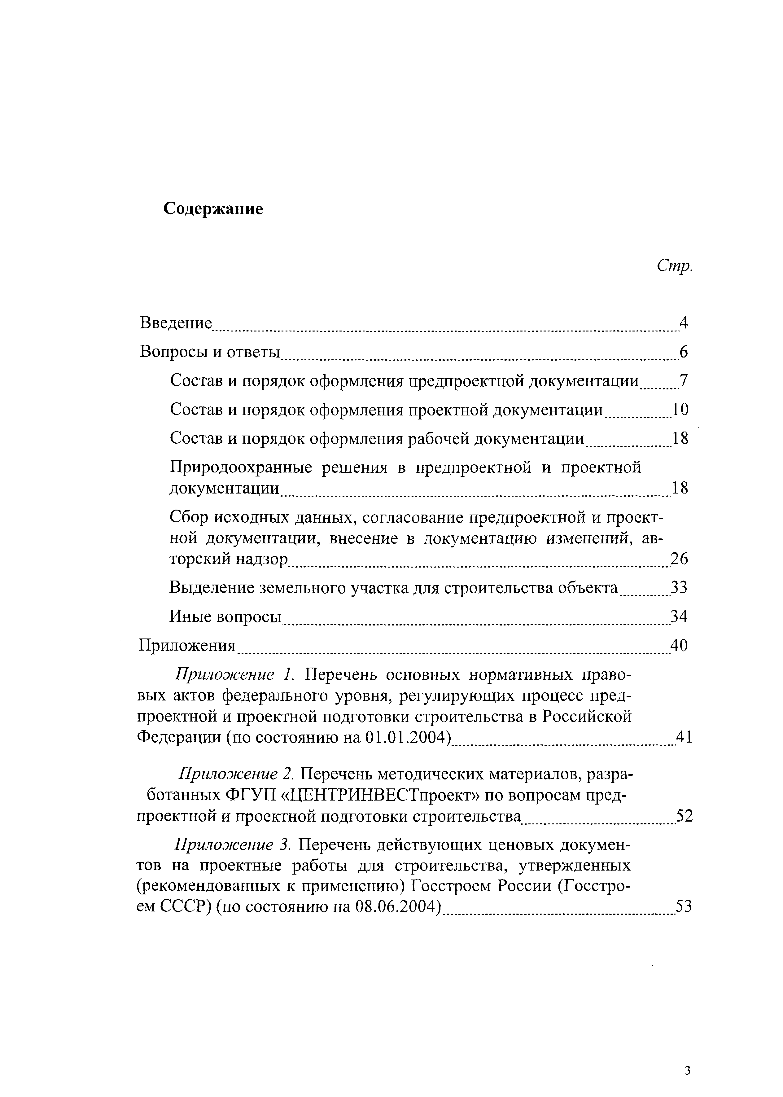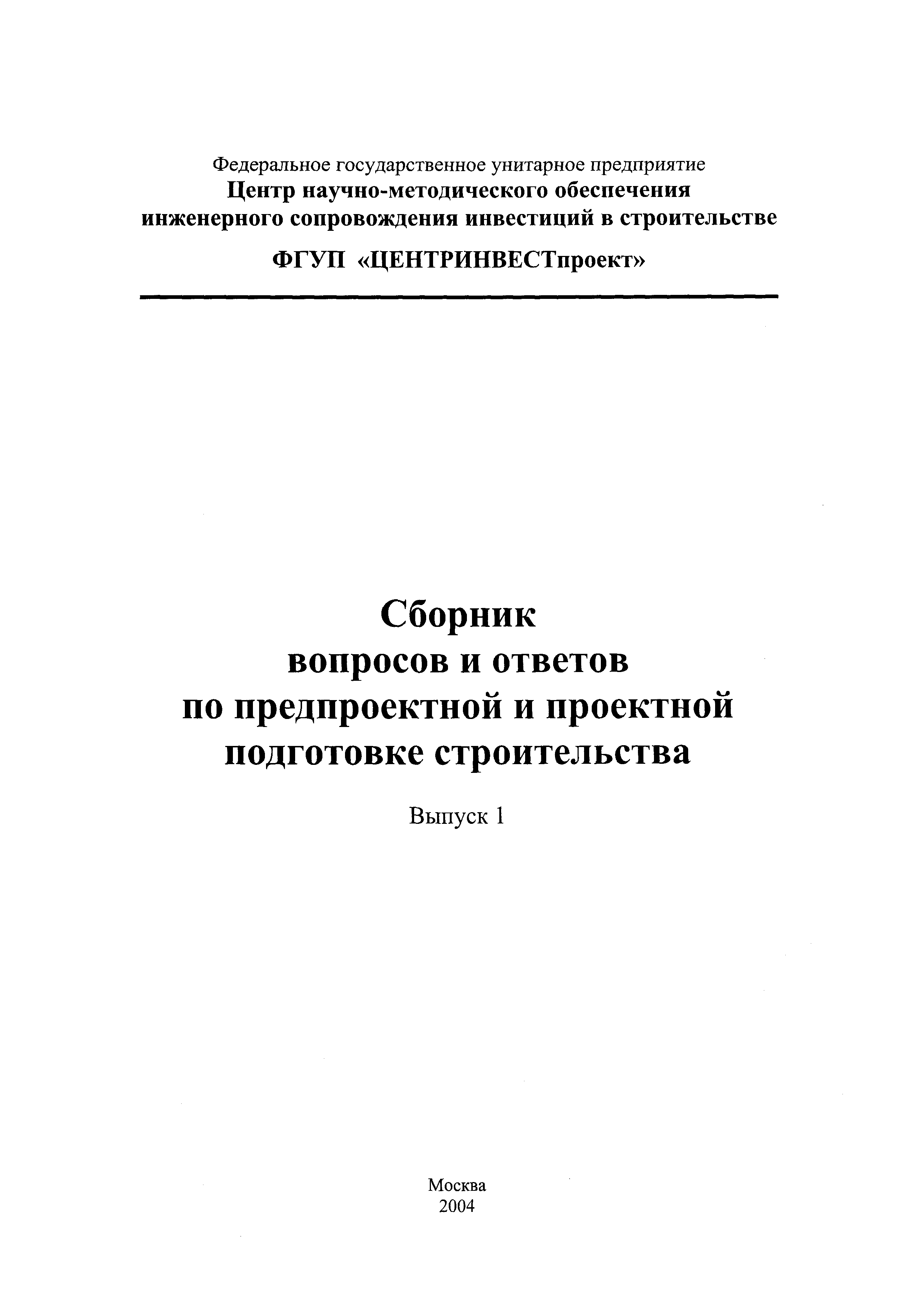 | Оглавление: | Введение Вопросы и ответы Состав и порядок оформления предпроектной документации Состав и порядок оформления проектной документации Состав и порядок оформления рабочей документации Природоохранные решения в предпроектной и проектной документации Сбор исходных данных, согласование предпроектной и проектной документации, внесение в документацию изменений, авторский надзор Выделение земельного участка для строительства объекта Иные вопросы Приложения Приложение 1 Перечень основных нормативных правовых актов федерального уровня, регулирующих процесс предпроектной и проектной подготовки строительства в Российской Федерации (по состоянию на 01.01.2004) Приложение 2 Перечень методических материалов, разработанных ФГУП "ЦЕНТРИНВЕСТпроект" по вопросам предпроектной и проектной подготовки строительства Приложение 3 Перечень действующих ценовых документов на проектные работы для строительства, утвержденнных (рекомендованных к применению) Госстроем России (Госстроем СССР) (по состоянию на 08.06.2004) |