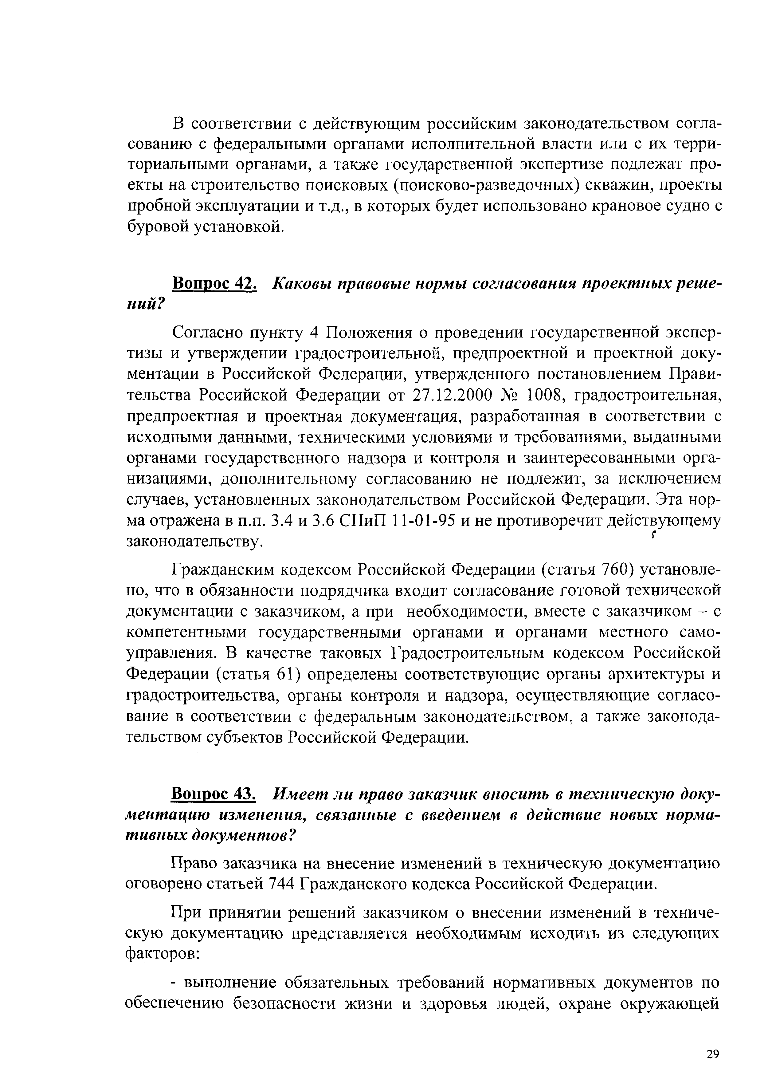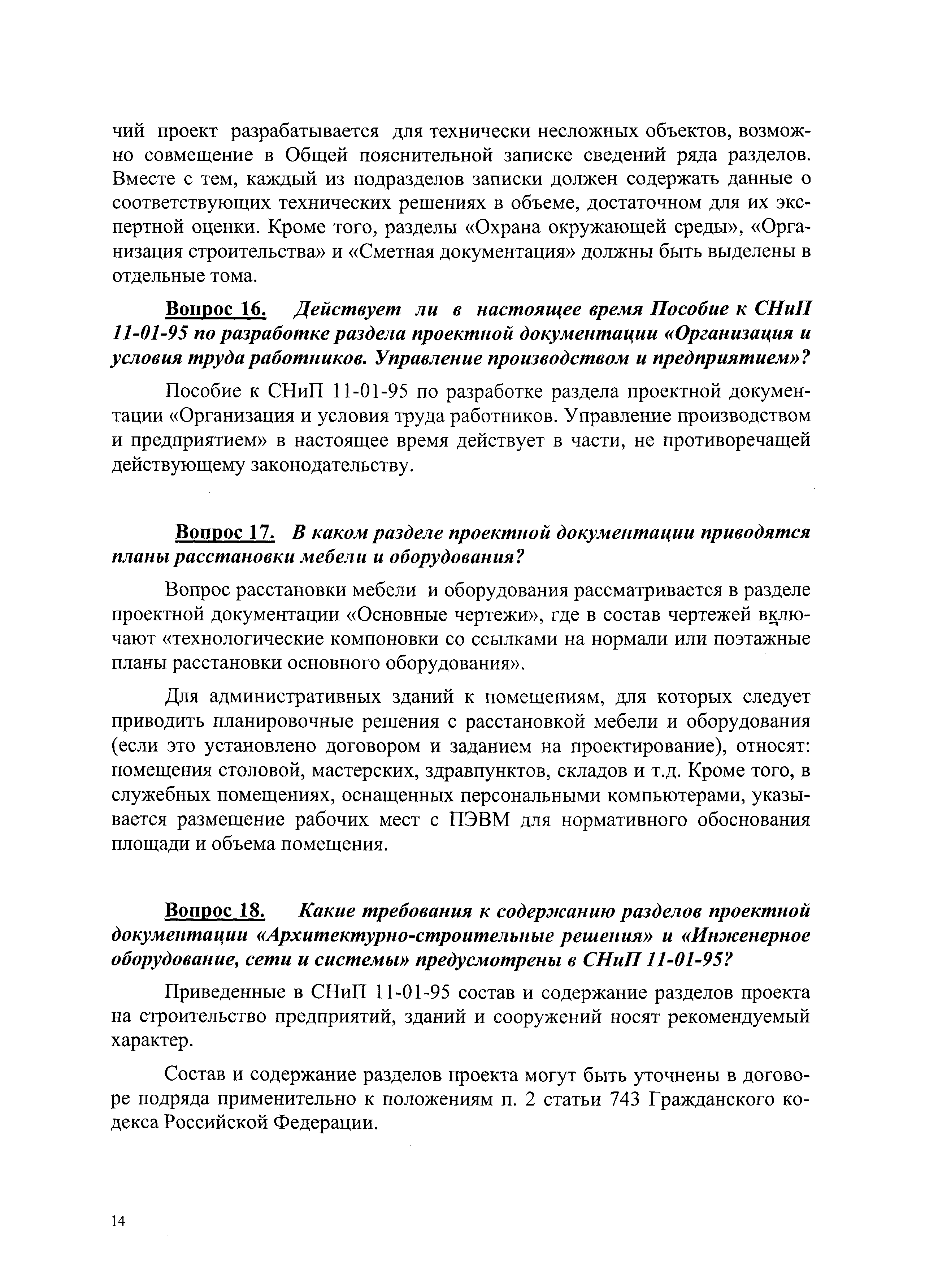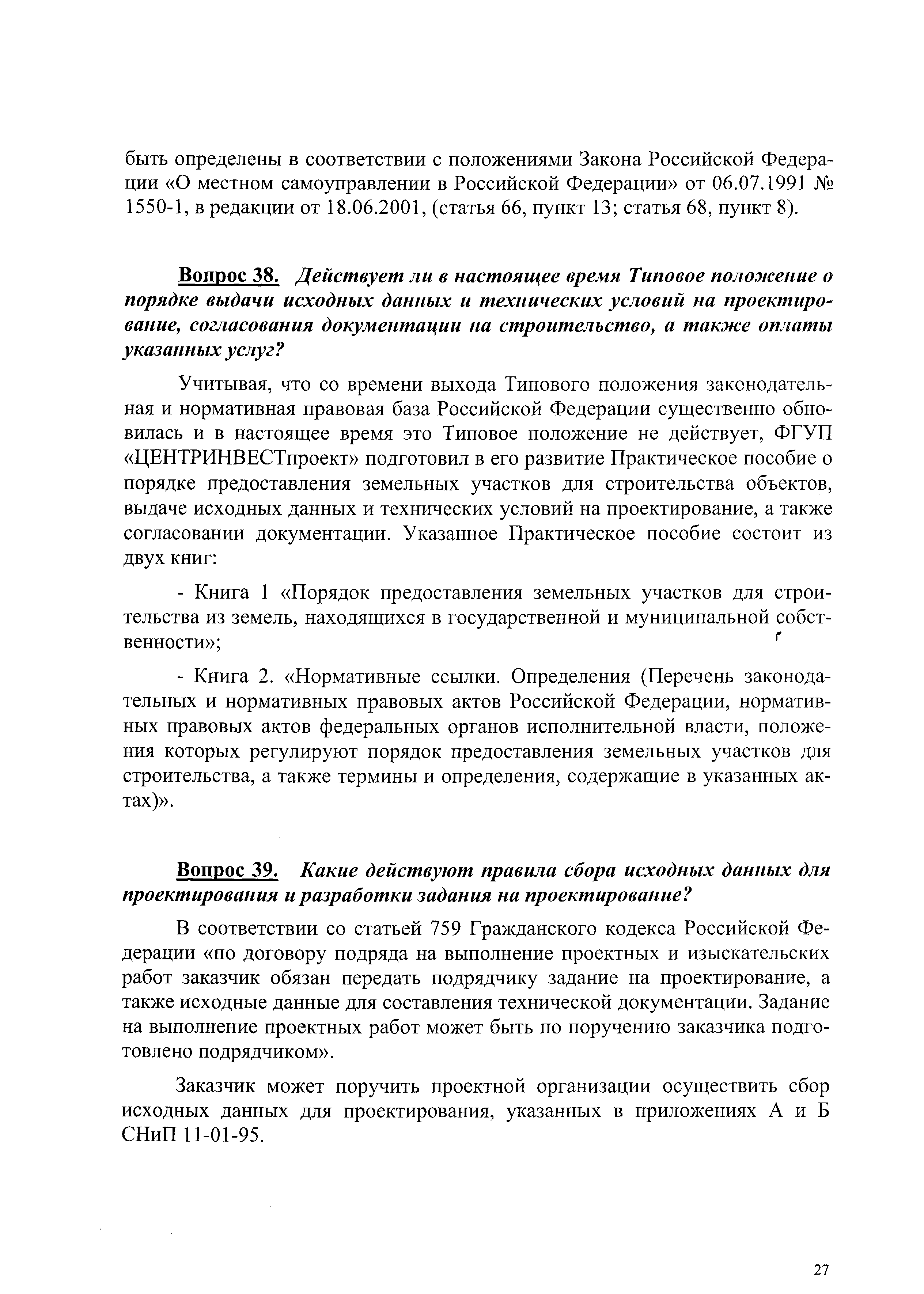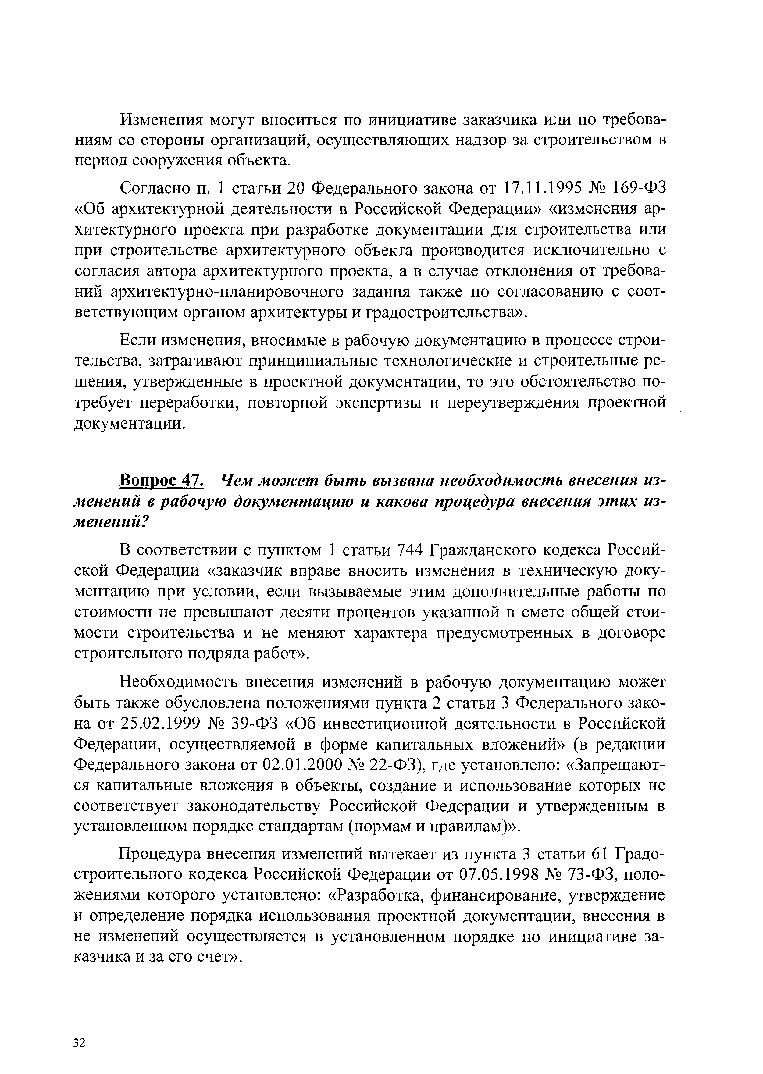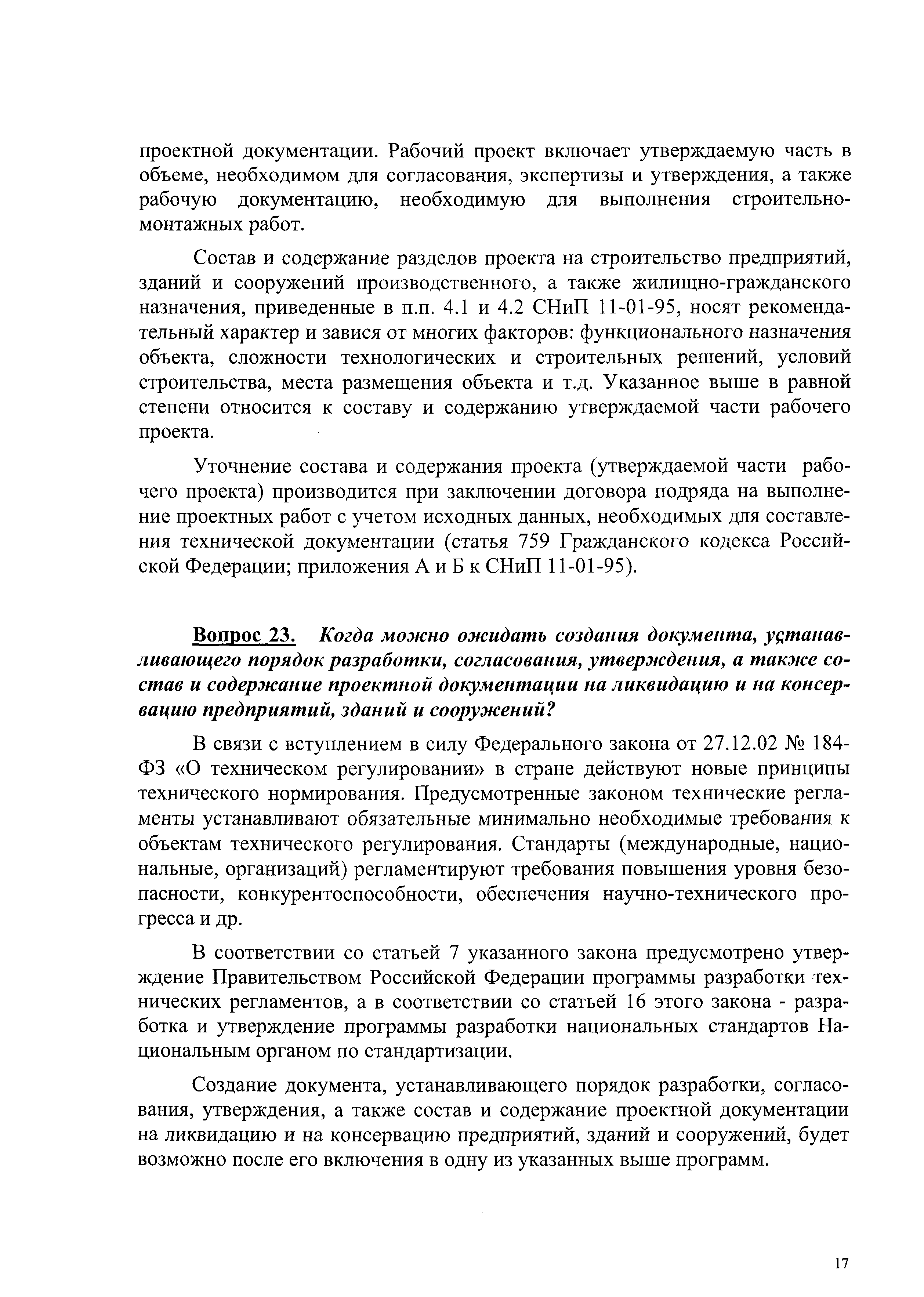 | Оглавление: | Введение Вопросы и ответы Состав и порядок оформления предпроектной документации Состав и порядок оформления проектной документации Состав и порядок оформления рабочей документации Природоохранные решения в предпроектной и проектной документации Сбор исходных данных, согласование предпроектной и проектной документации, внесение в документацию изменений, авторский надзор Выделение земельного участка для строительства объекта Иные вопросы Приложения Приложение 1 Перечень основных нормативных правовых актов федерального уровня, регулирующих процесс предпроектной и проектной подготовки строительства в Российской Федерации (по состоянию на 01.01.2004) Приложение 2 Перечень методических материалов, разработанных ФГУП "ЦЕНТРИНВЕСТпроект" по вопросам предпроектной и проектной подготовки строительства Приложение 3 Перечень действующих ценовых документов на проектные работы для строительства, утвержденнных (рекомендованных к применению) Госстроем России (Госстроем СССР) (по состоянию на 08.06.2004) |
