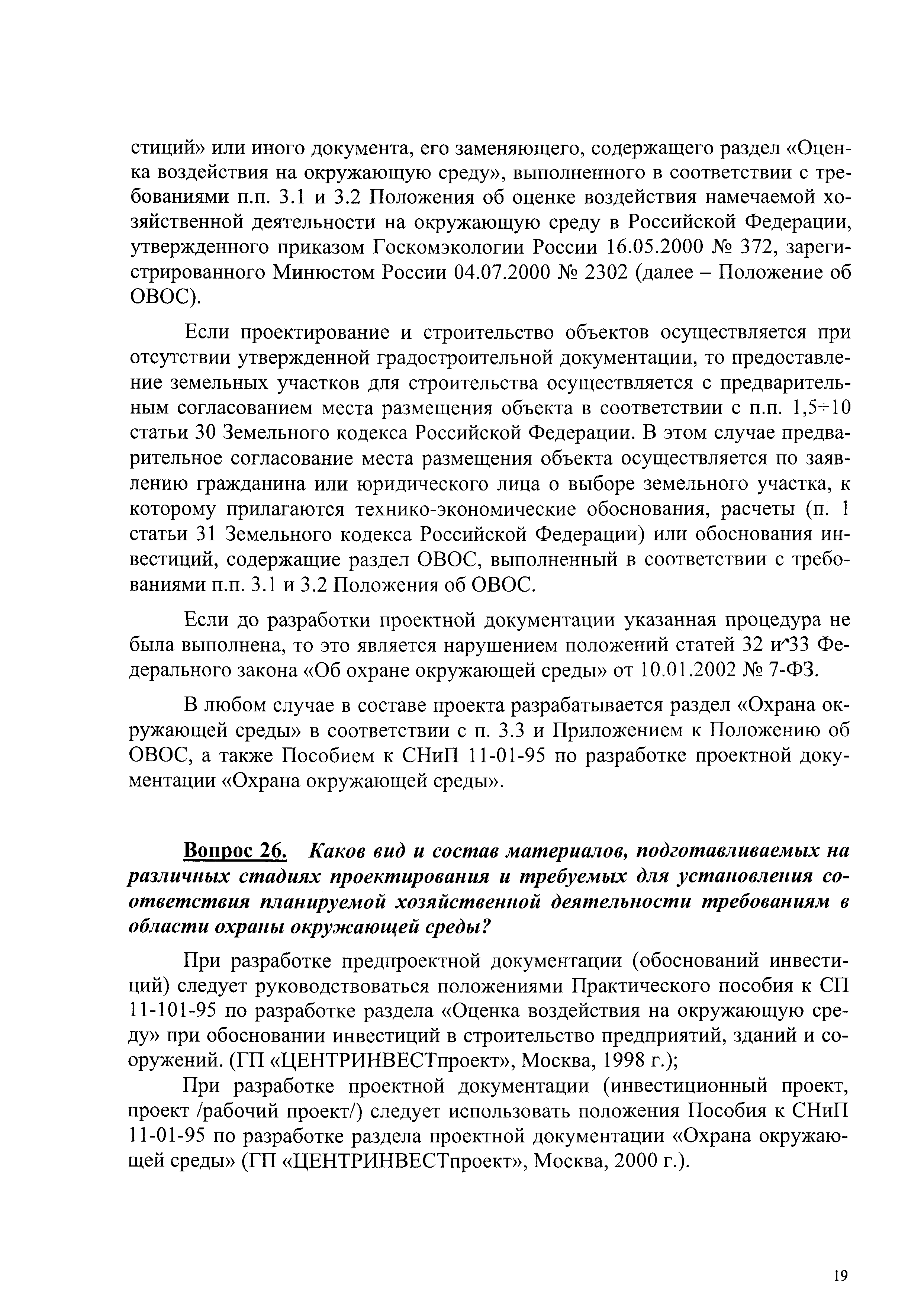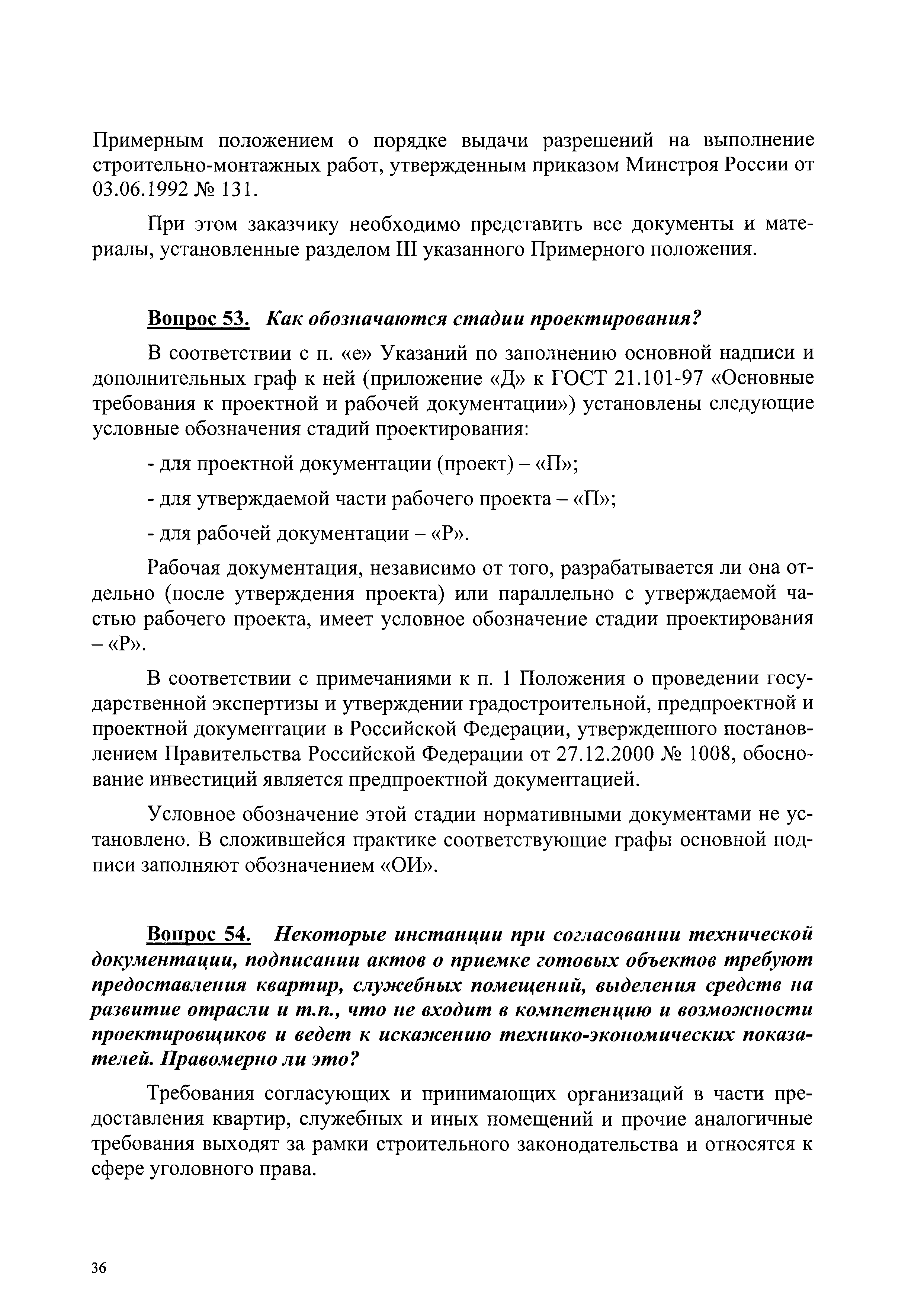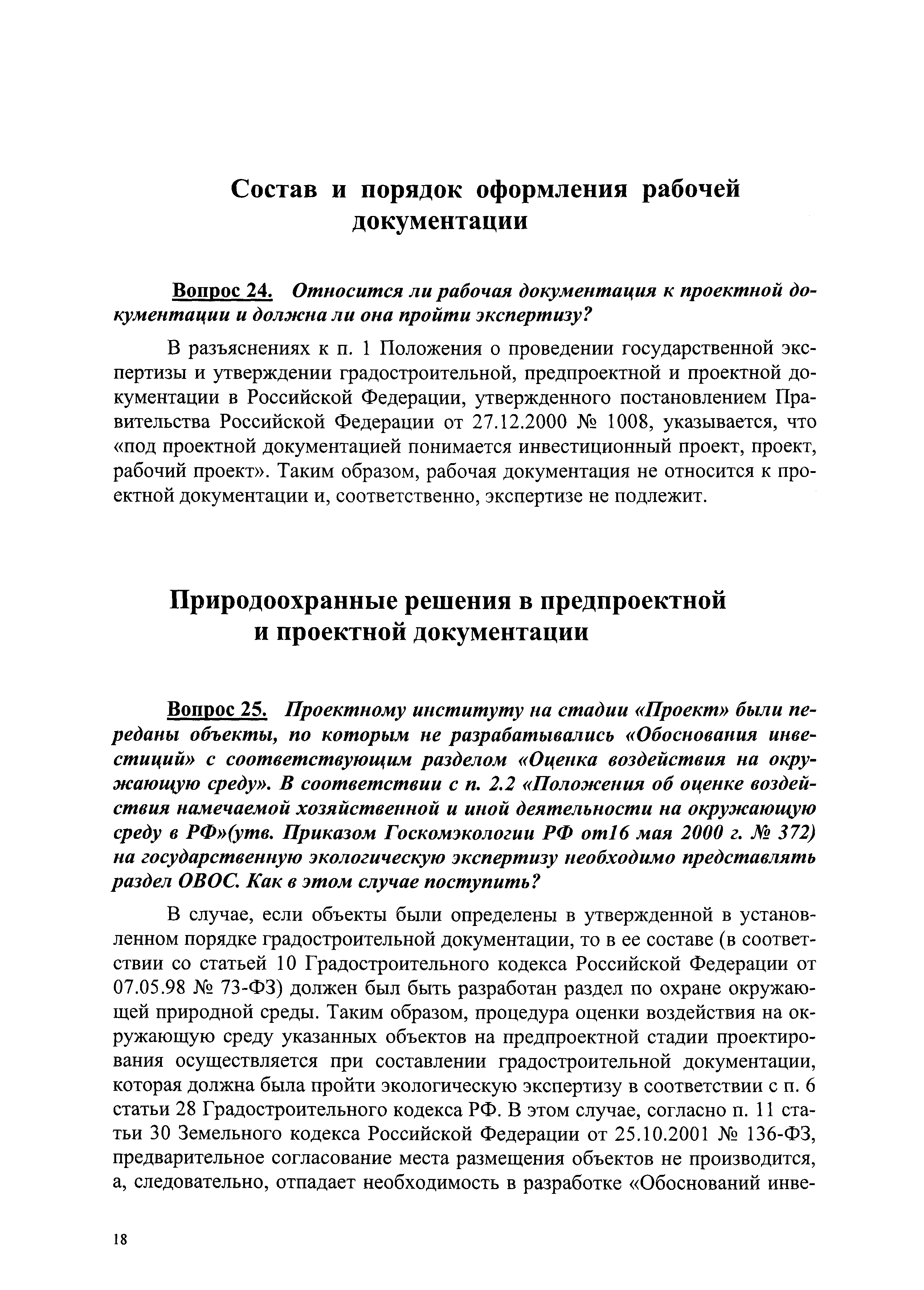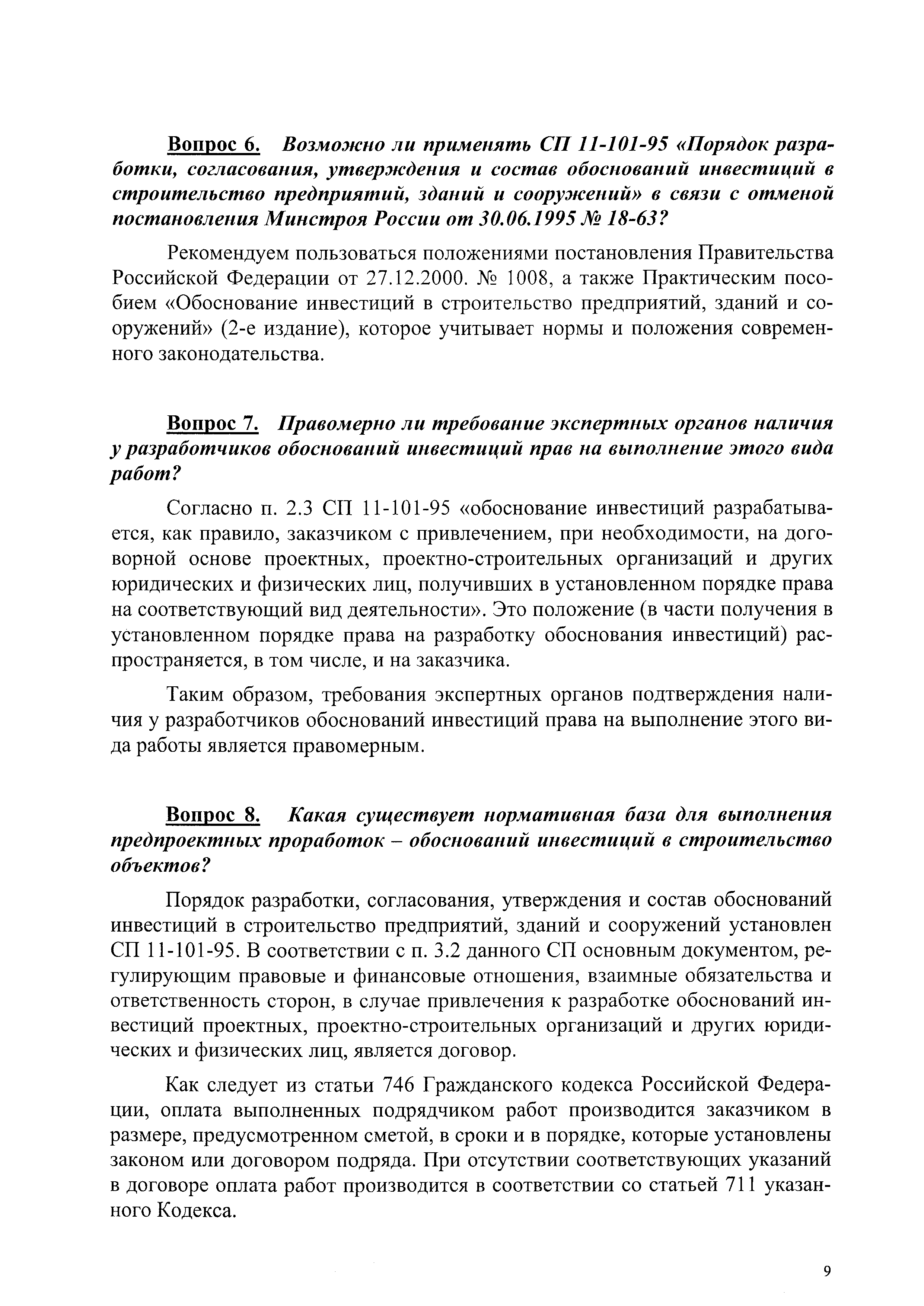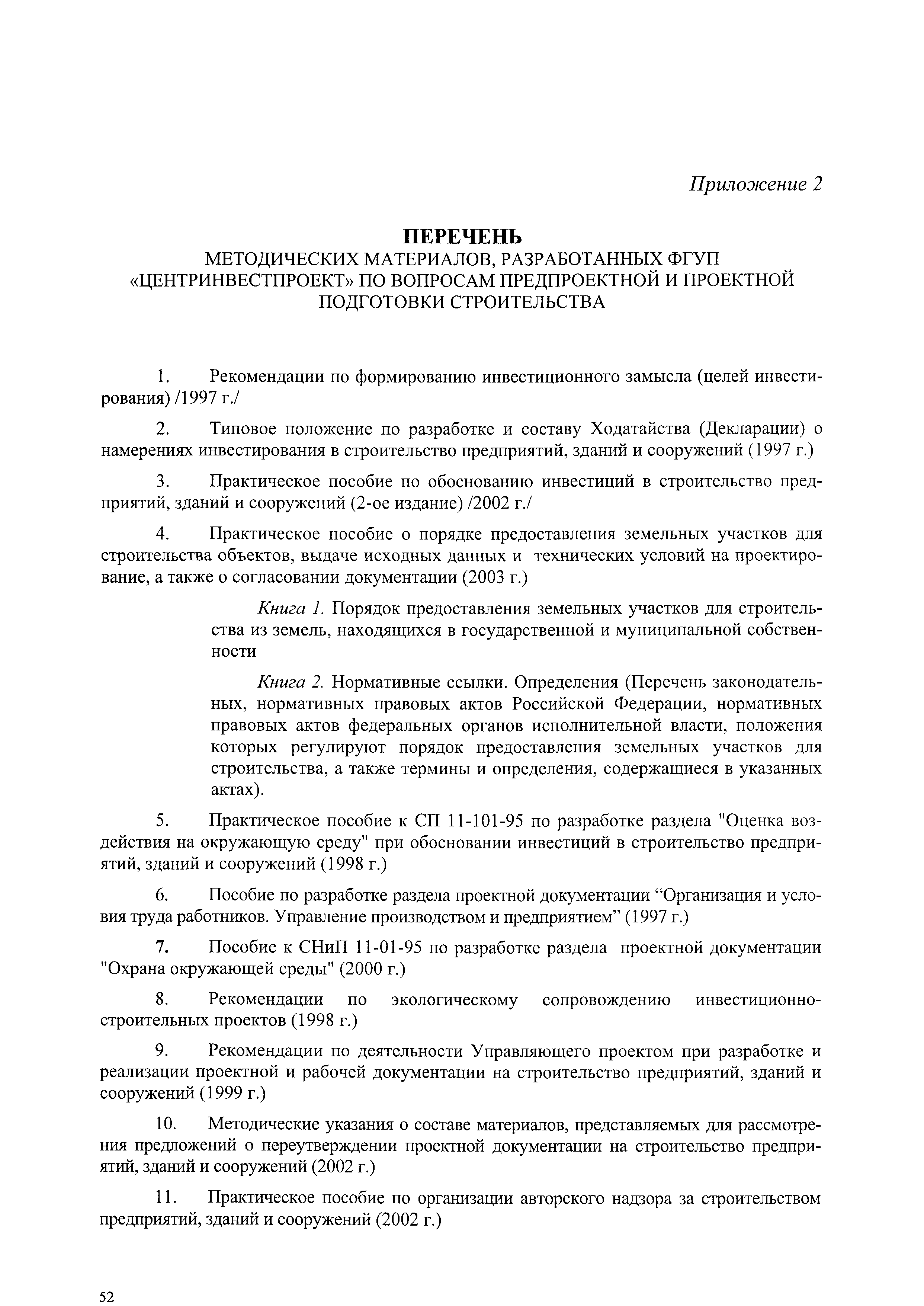 | Оглавление: | Введение Вопросы и ответы Состав и порядок оформления предпроектной документации Состав и порядок оформления проектной документации Состав и порядок оформления рабочей документации Природоохранные решения в предпроектной и проектной документации Сбор исходных данных, согласование предпроектной и проектной документации, внесение в документацию изменений, авторский надзор Выделение земельного участка для строительства объекта Иные вопросы Приложения Приложение 1 Перечень основных нормативных правовых актов федерального уровня, регулирующих процесс предпроектной и проектной подготовки строительства в Российской Федерации (по состоянию на 01.01.2004) Приложение 2 Перечень методических материалов, разработанных ФГУП "ЦЕНТРИНВЕСТпроект" по вопросам предпроектной и проектной подготовки строительства Приложение 3 Перечень действующих ценовых документов на проектные работы для строительства, утвержденнных (рекомендованных к применению) Госстроем России (Госстроем СССР) (по состоянию на 08.06.2004) |