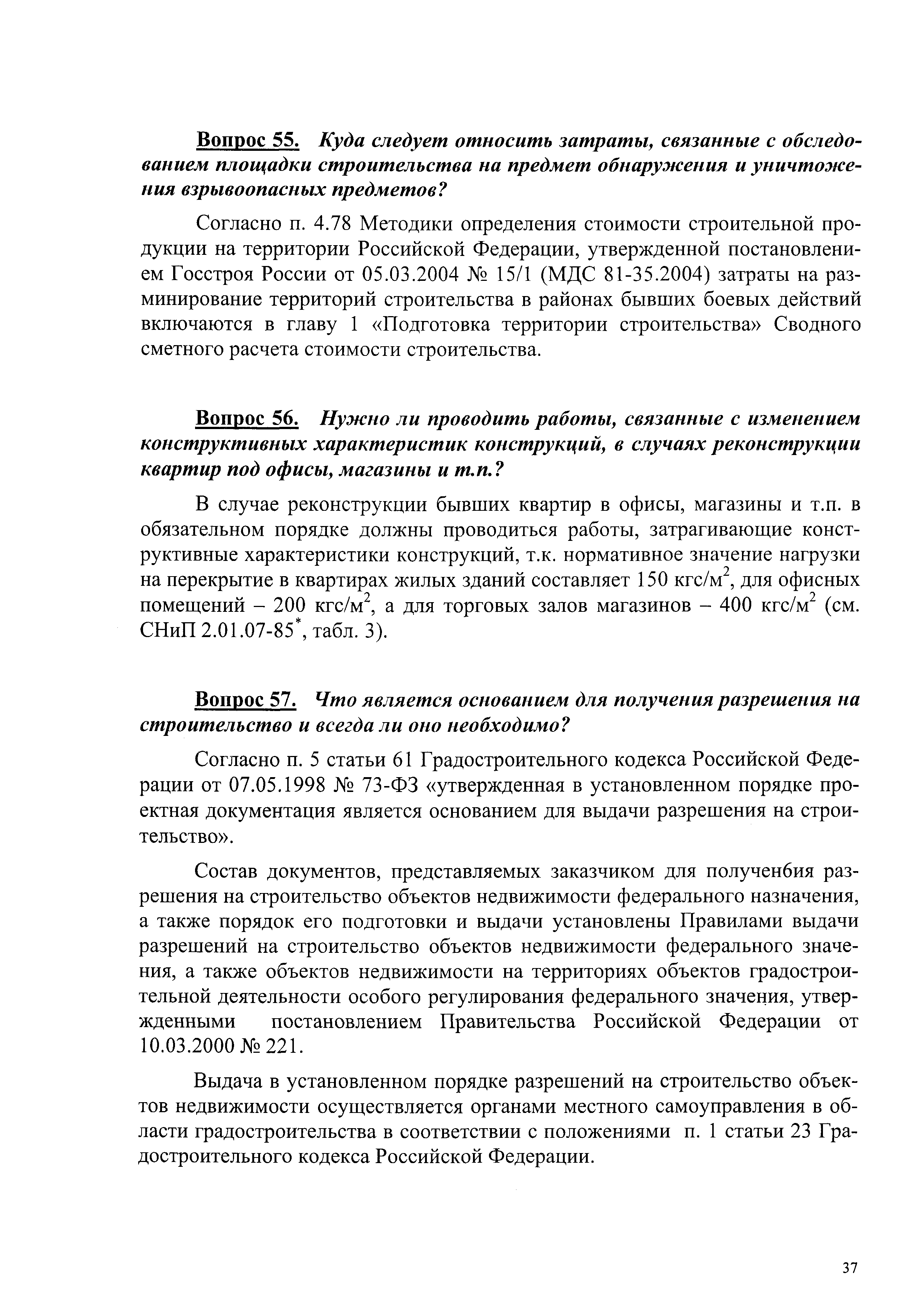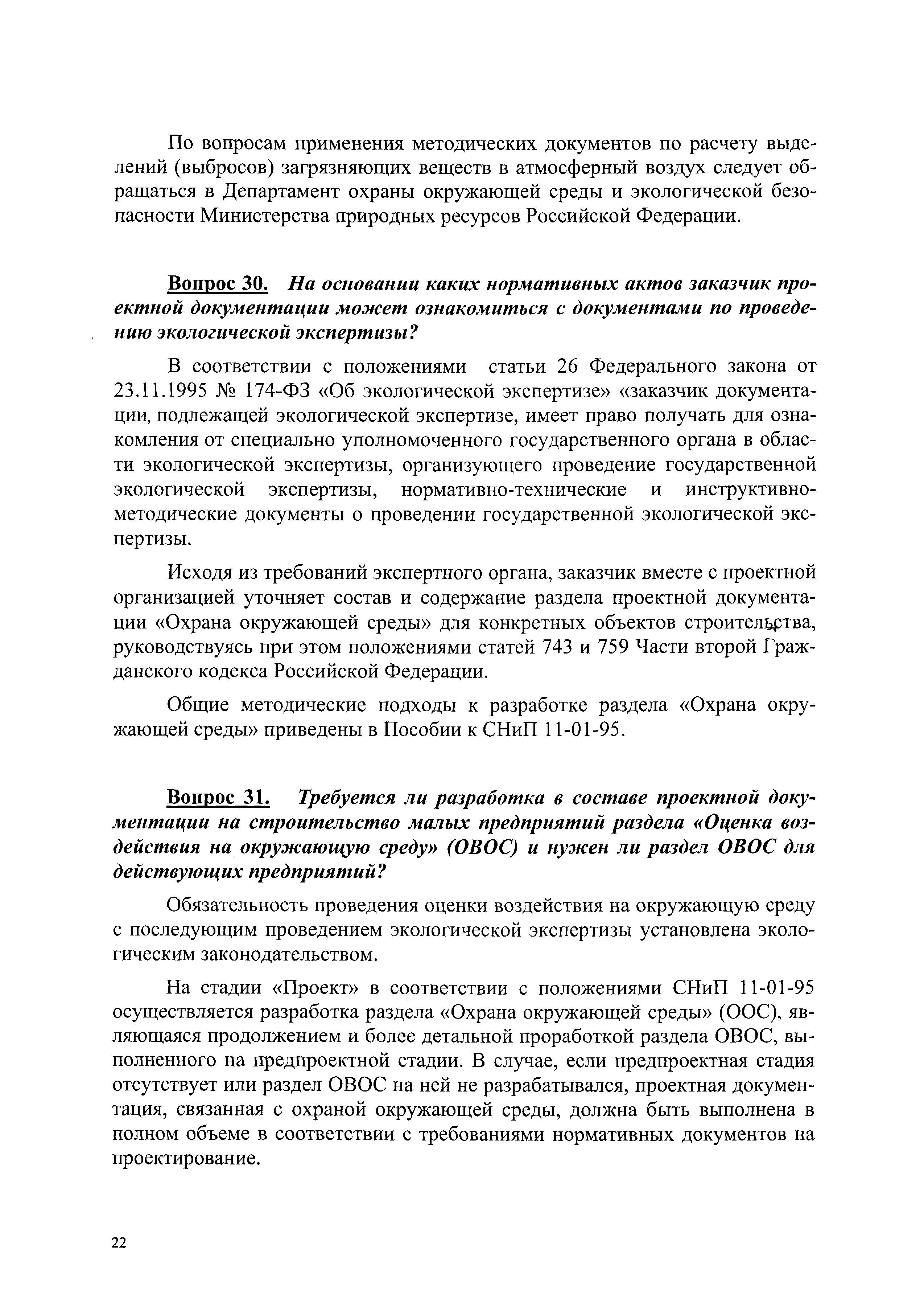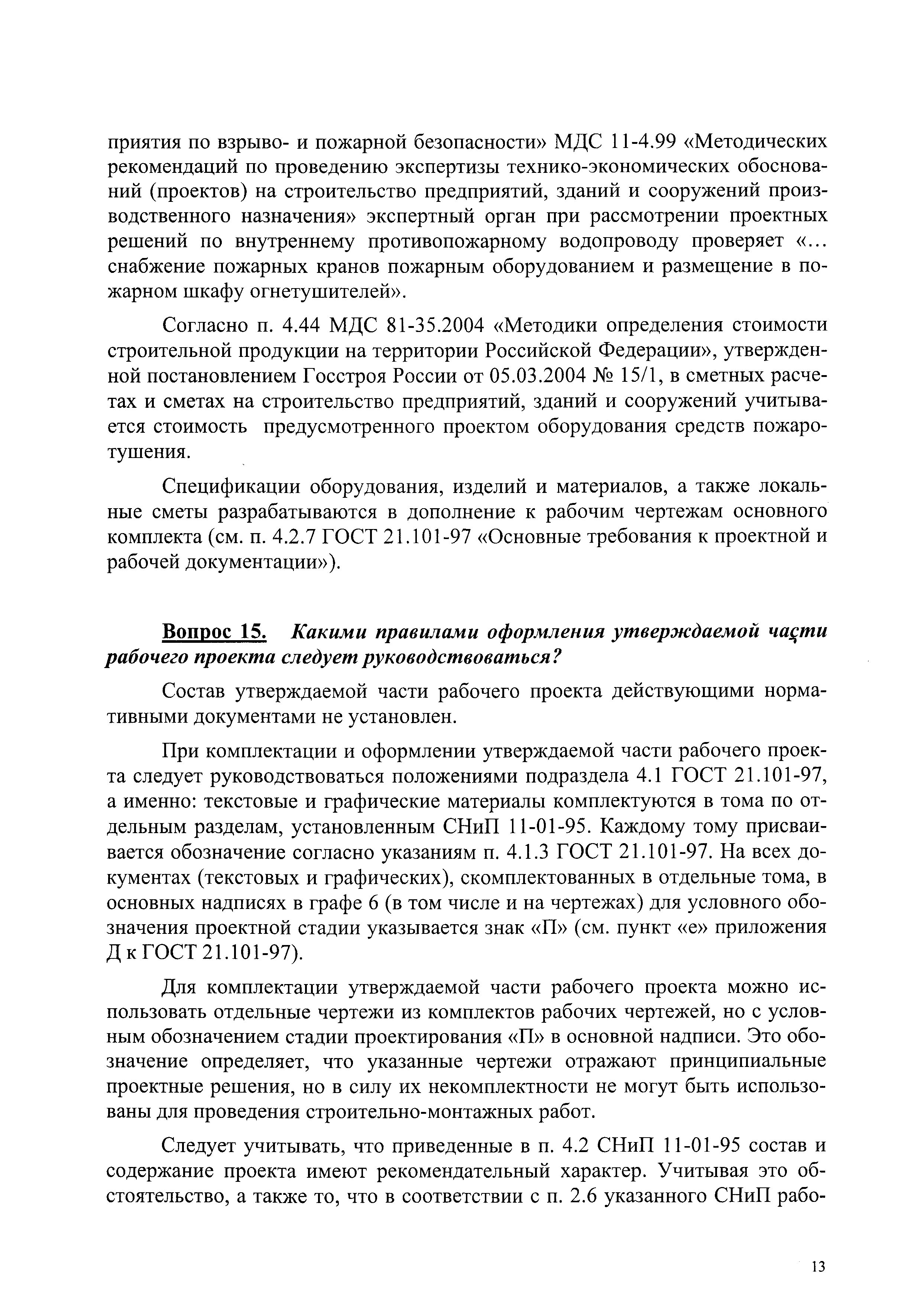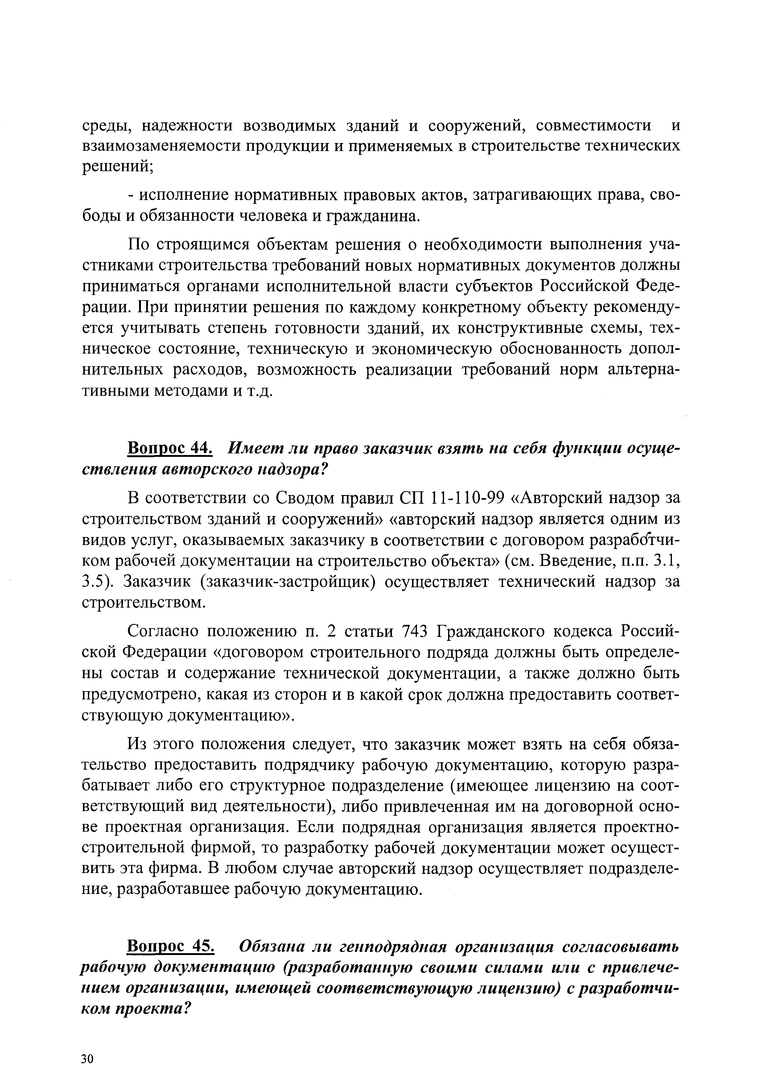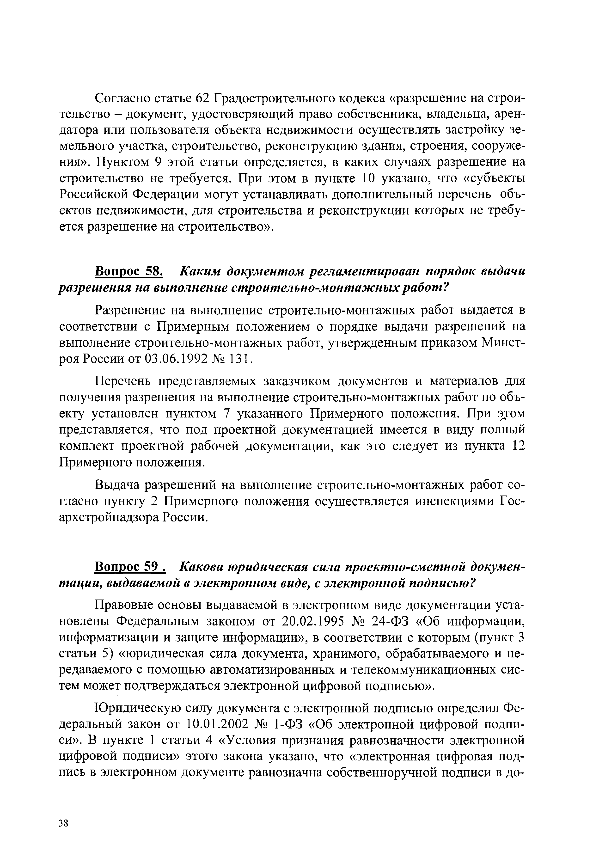 | Оглавление: | Введение Вопросы и ответы Состав и порядок оформления предпроектной документации Состав и порядок оформления проектной документации Состав и порядок оформления рабочей документации Природоохранные решения в предпроектной и проектной документации Сбор исходных данных, согласование предпроектной и проектной документации, внесение в документацию изменений, авторский надзор Выделение земельного участка для строительства объекта Иные вопросы Приложения Приложение 1 Перечень основных нормативных правовых актов федерального уровня, регулирующих процесс предпроектной и проектной подготовки строительства в Российской Федерации (по состоянию на 01.01.2004) Приложение 2 Перечень методических материалов, разработанных ФГУП "ЦЕНТРИНВЕСТпроект" по вопросам предпроектной и проектной подготовки строительства Приложение 3 Перечень действующих ценовых документов на проектные работы для строительства, утвержденнных (рекомендованных к применению) Госстроем России (Госстроем СССР) (по состоянию на 08.06.2004) |