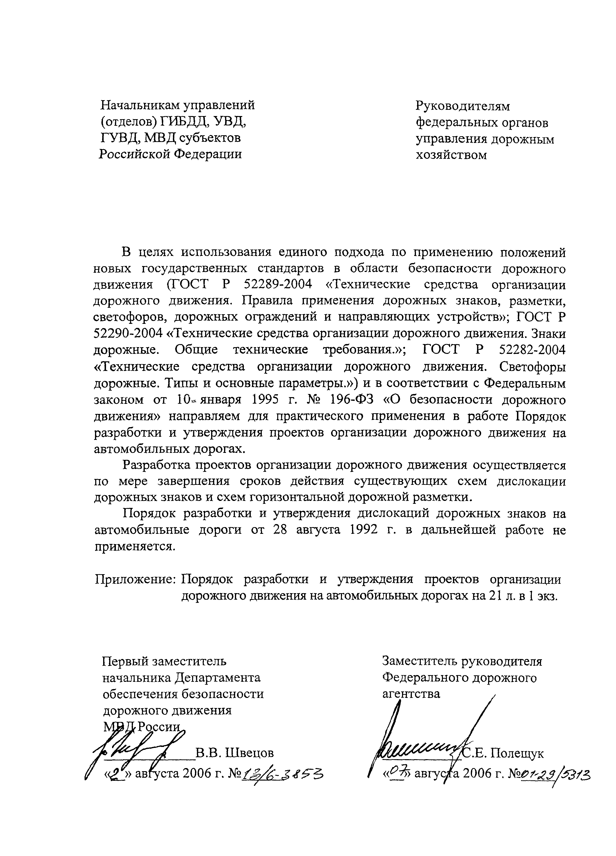 | Утверждён: | 07.08.2006 Федеральное дорожное агентство (01-29/5313) 02.08.2006 Департамент обеспечения безопасности дорожного движения МВД России (13/6-3853) |