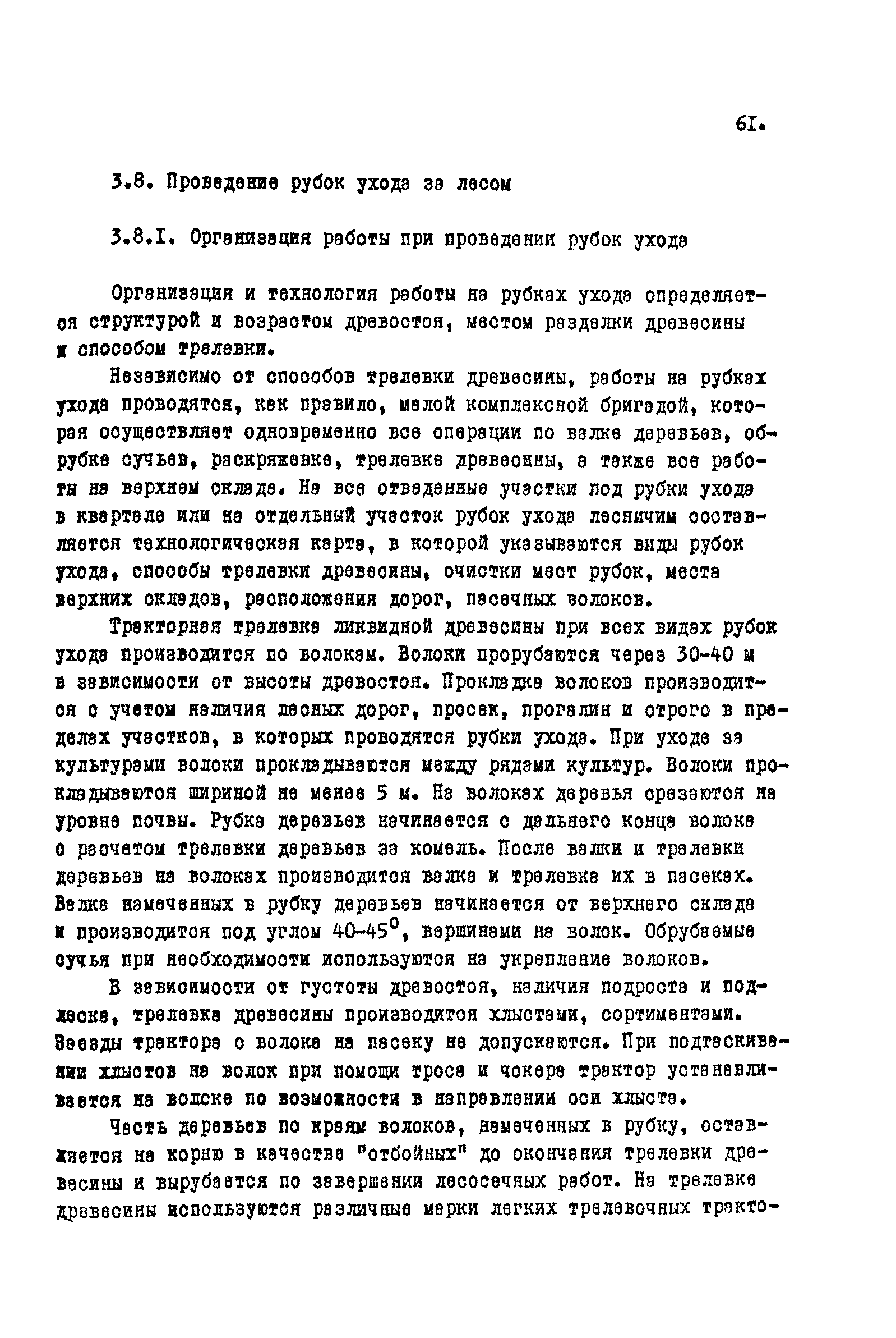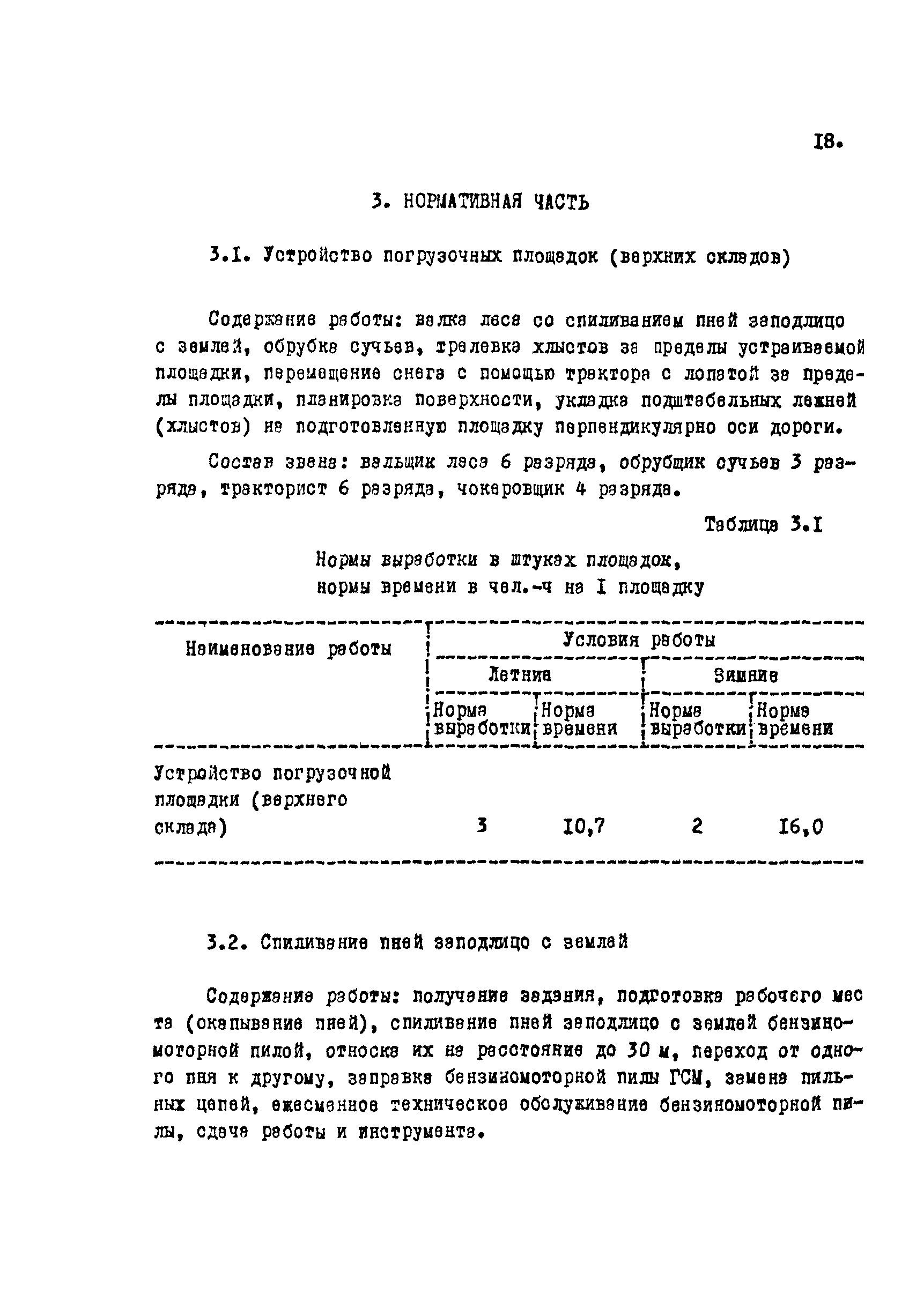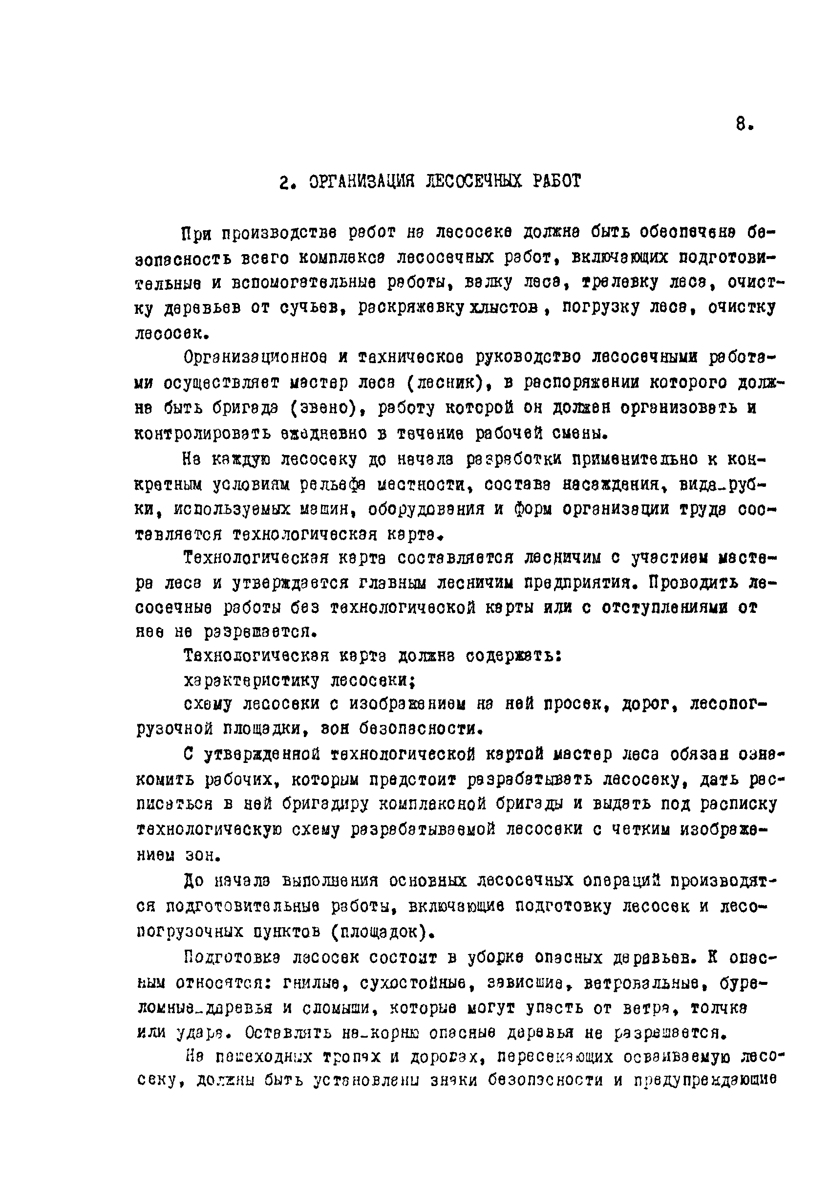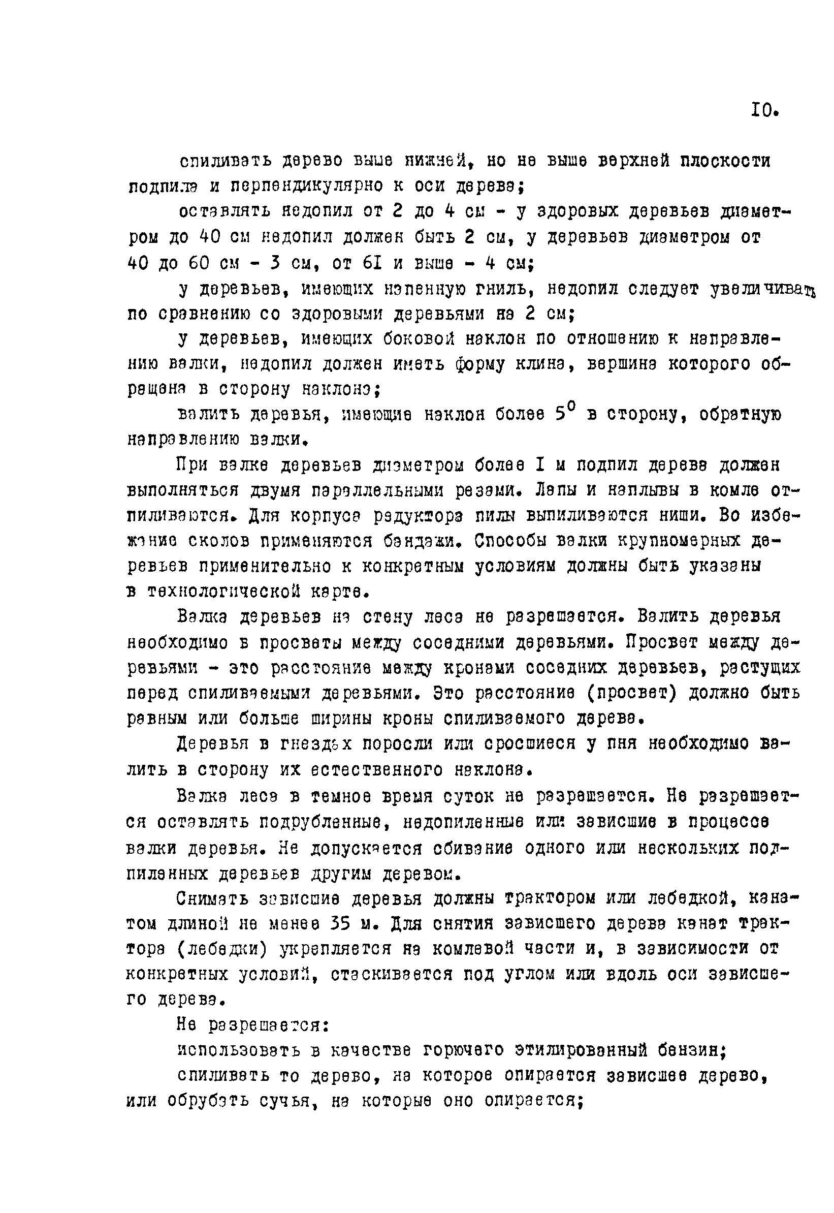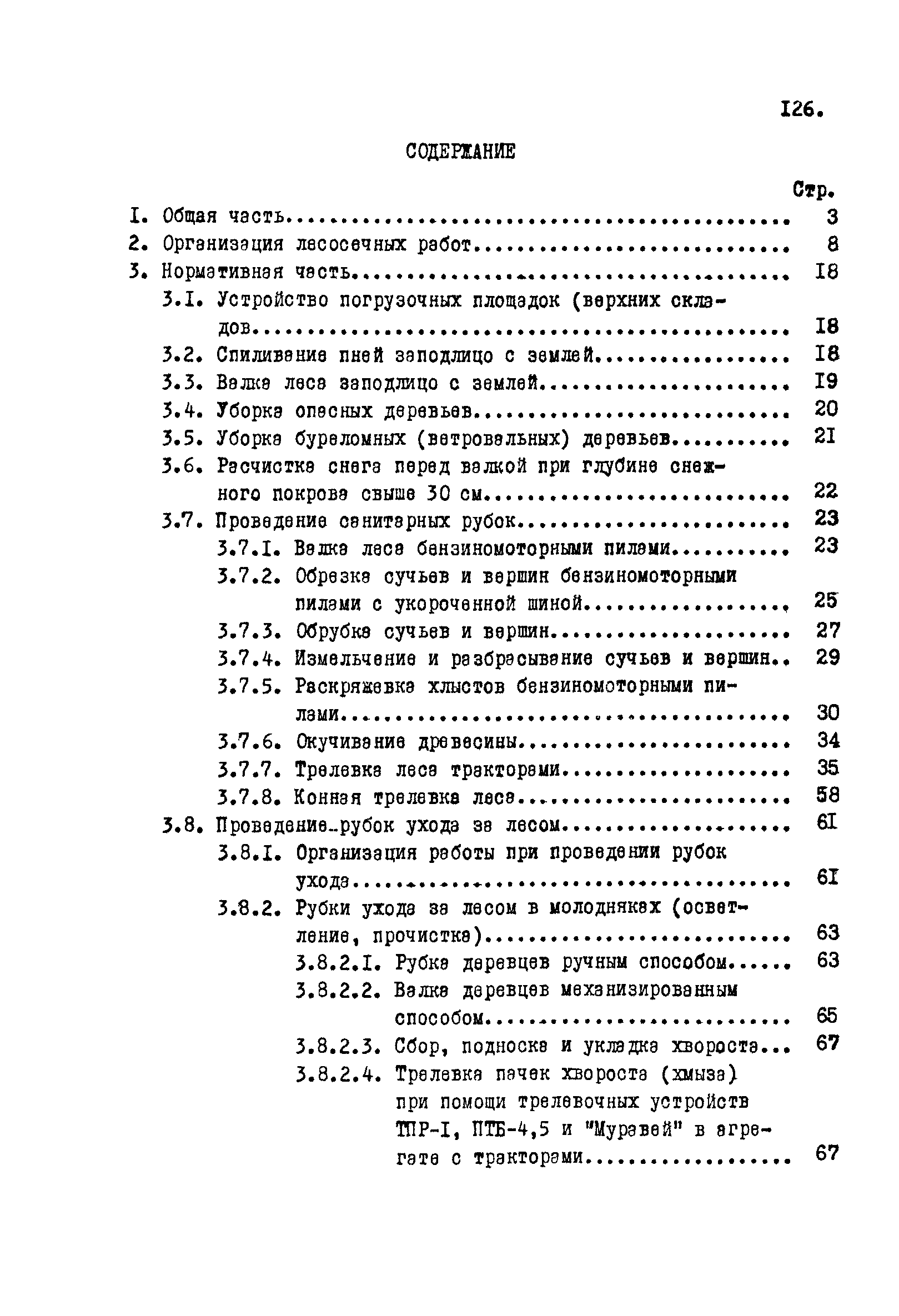 | Оглавление: | 1 Общая часть 2 Организация лесосечных работ 3 Нормативная часть 3.1 Устройство погрузочных площадок (верхних складов) 3.2 Спиливание пней заподлицо с землей 3.3 Валка леса заподлицо с землей 3.4 Уборка опасных деревьев 3.5 Уборка буреломных деревьев 3.6 Расчистка снега перед валкой при глубине снежного покрова свыше 30 см 3.7 Проведение санитарных рубок 3.8 Проведение рубок ухода за лесом 3.9 Работы, выполняемые на верхнем складе 3.10 Вывозка леса 3.11 Уход за подростом 3.12 Уход за подлеском 3.13 Обрезка сучьев 3.14 Очистка леса от захламленности 3.15 Работы на отводе лесосек 3.16 Точка, правка и ремонт лесорубочных инструментов |