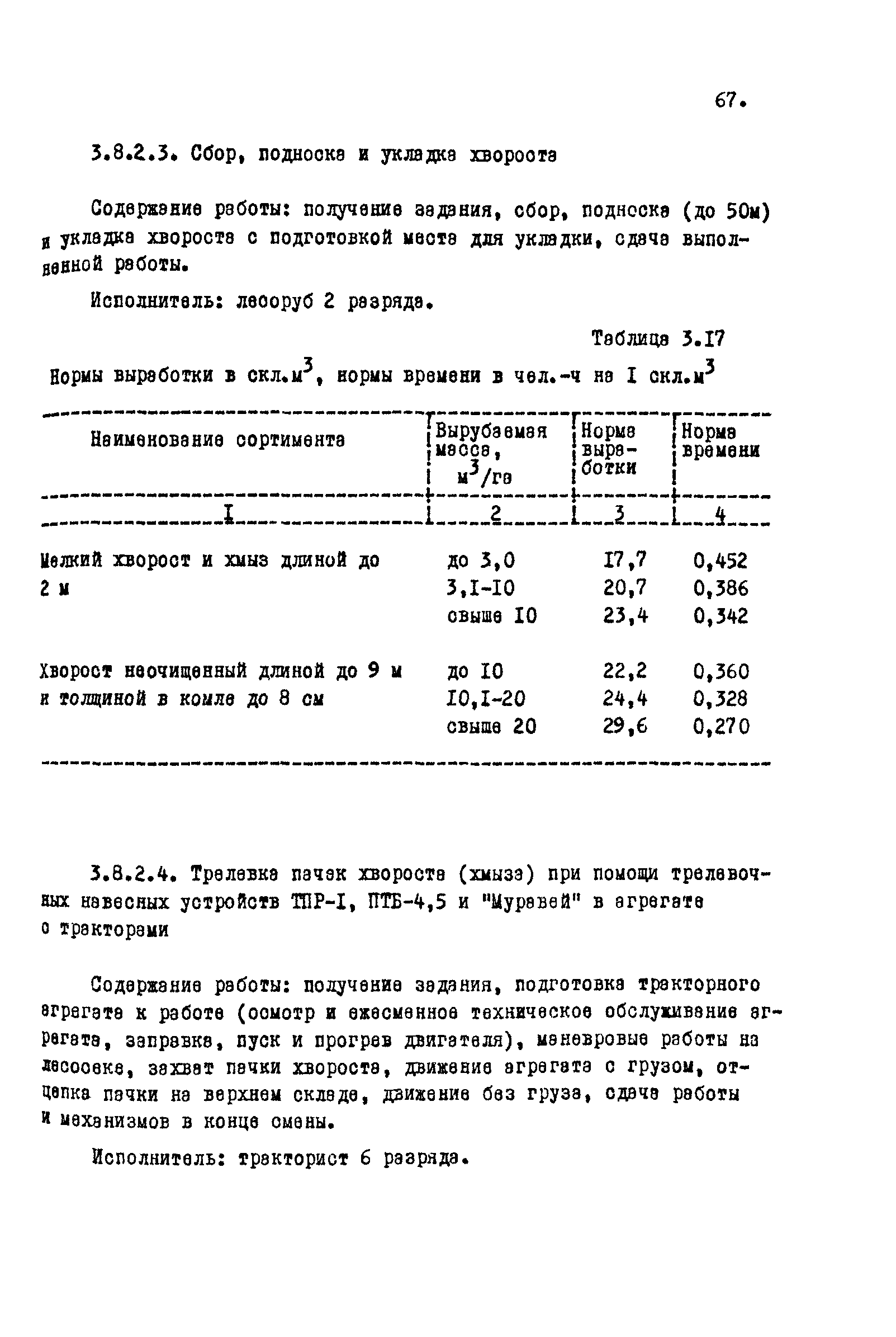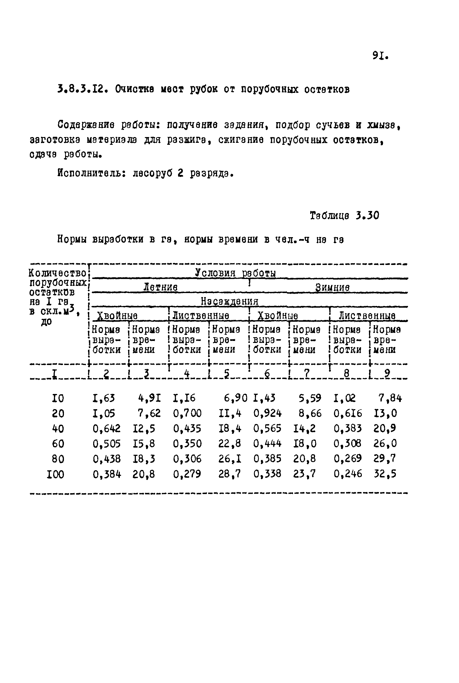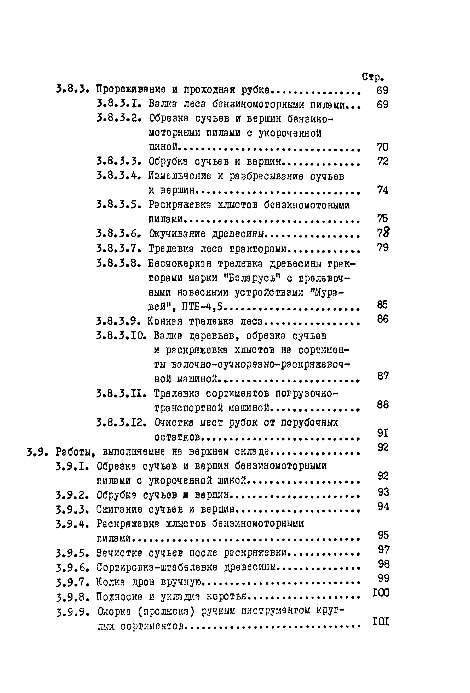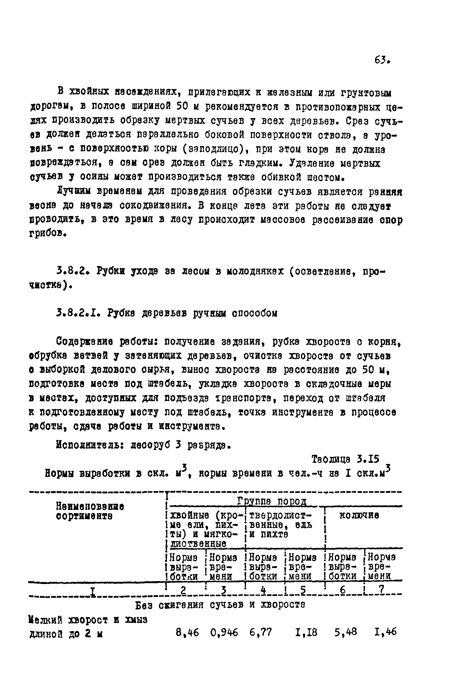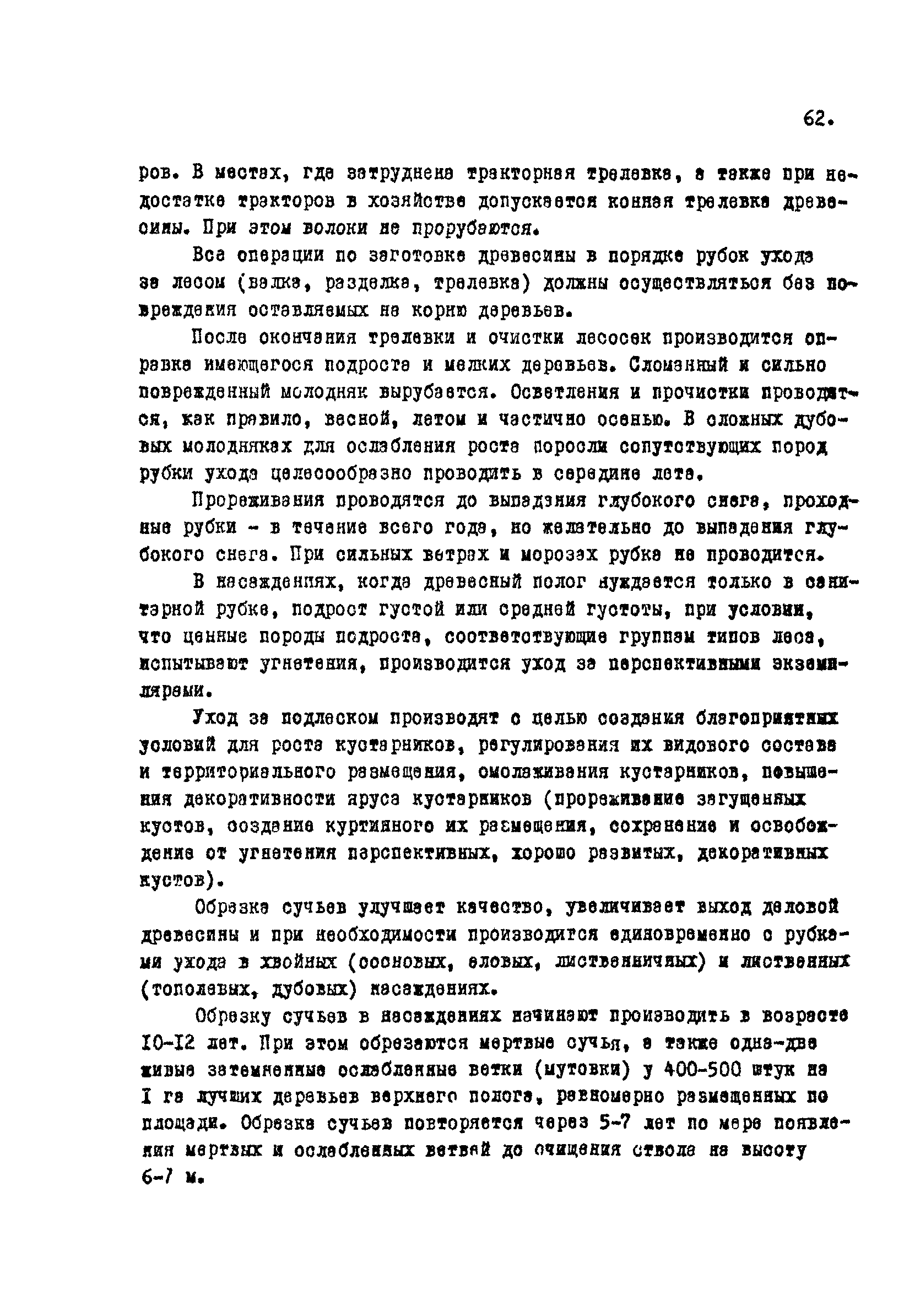 | Оглавление: | 1 Общая часть 2 Организация лесосечных работ 3 Нормативная часть 3.1 Устройство погрузочных площадок (верхних складов) 3.2 Спиливание пней заподлицо с землей 3.3 Валка леса заподлицо с землей 3.4 Уборка опасных деревьев 3.5 Уборка буреломных деревьев 3.6 Расчистка снега перед валкой при глубине снежного покрова свыше 30 см 3.7 Проведение санитарных рубок 3.8 Проведение рубок ухода за лесом 3.9 Работы, выполняемые на верхнем складе 3.10 Вывозка леса 3.11 Уход за подростом 3.12 Уход за подлеском 3.13 Обрезка сучьев 3.14 Очистка леса от захламленности 3.15 Работы на отводе лесосек 3.16 Точка, правка и ремонт лесорубочных инструментов |