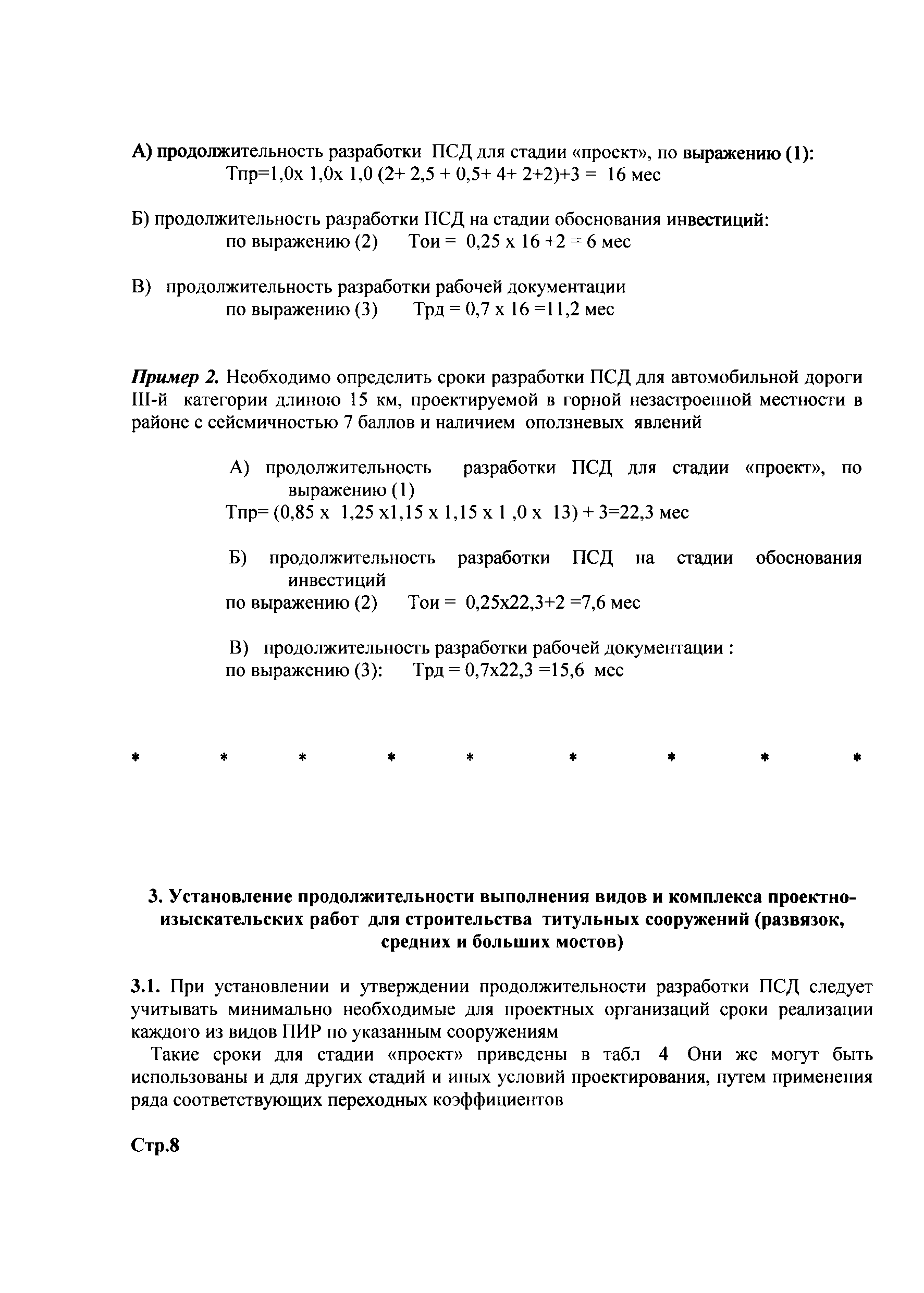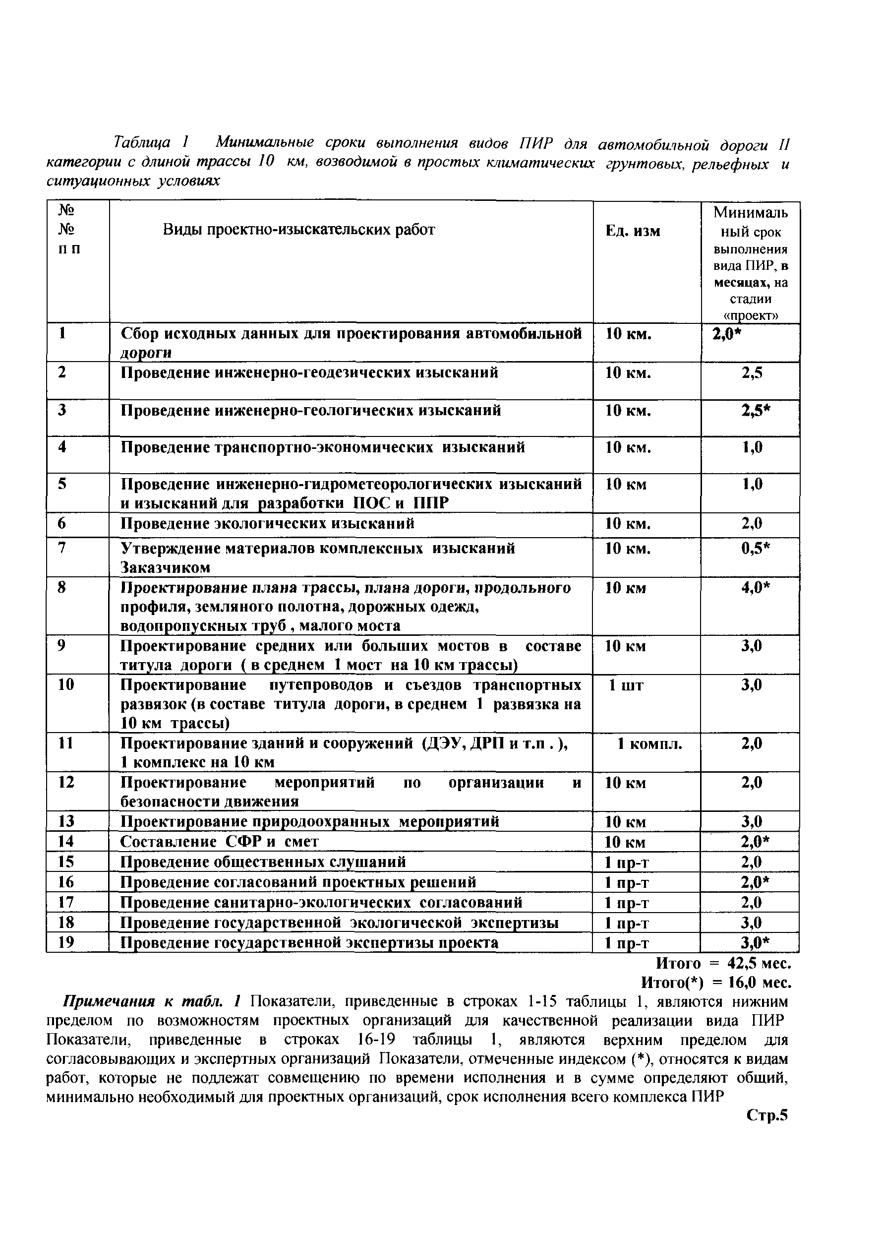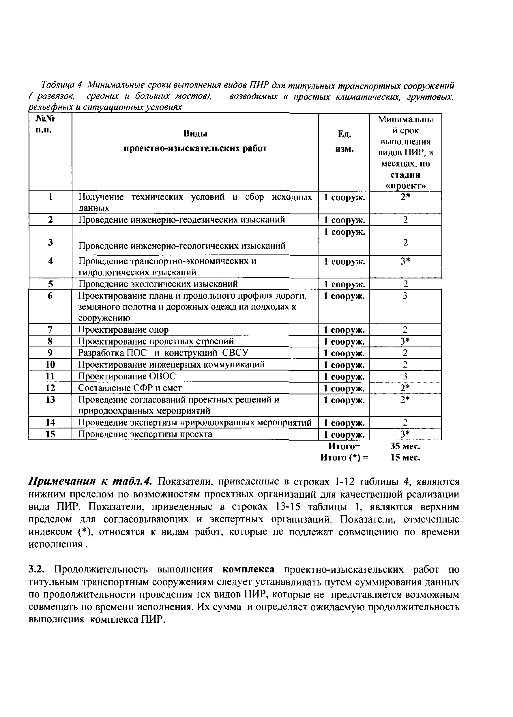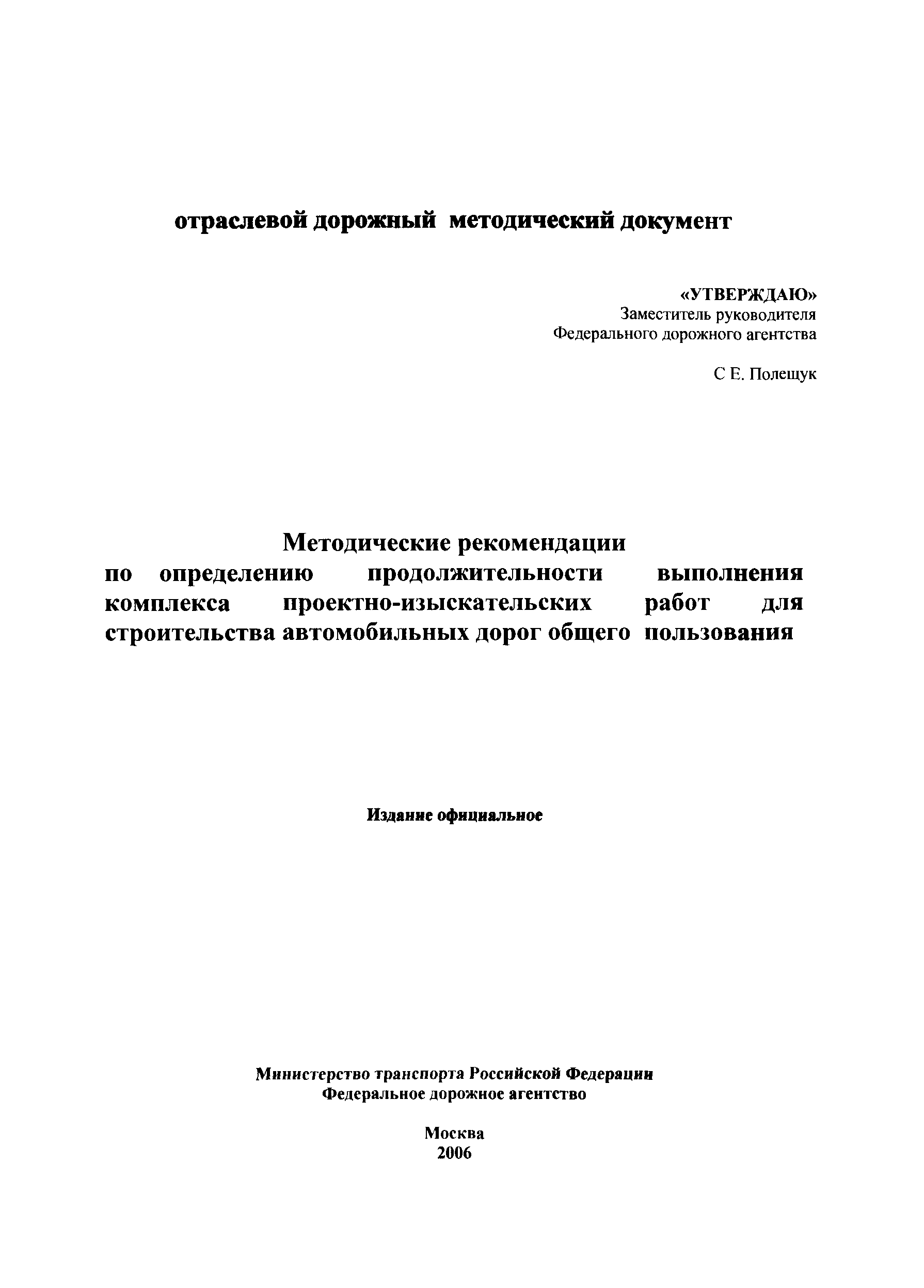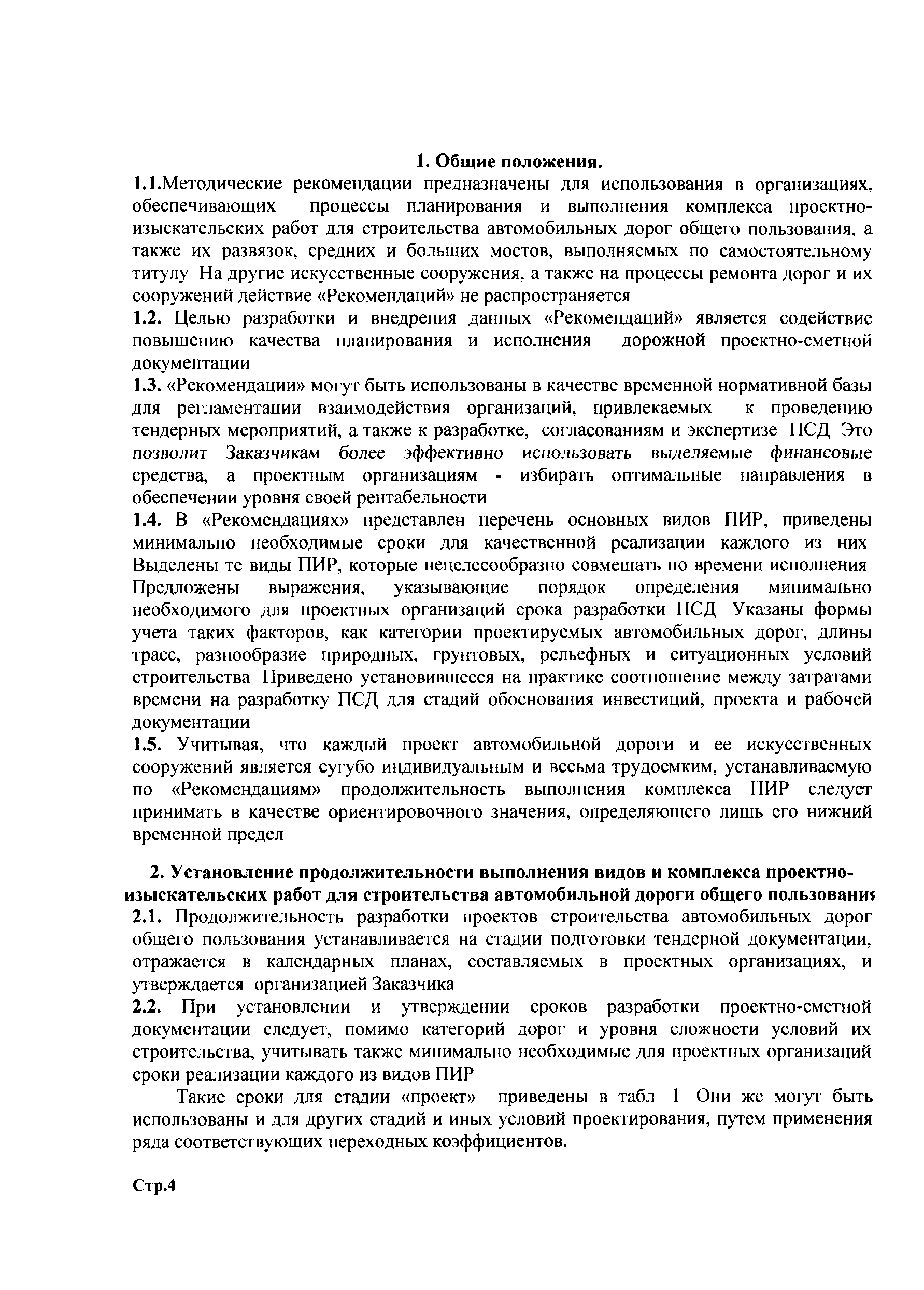 | Оглавление: | 1 Общие положения 2 Установление продолжительности выполнения видов и комплекса проектно-изыскательских работ по титулу автомобильной дороги общего пользования 3 Установление продолжительности выполнения видов и комплекса проектно-изыскательских работ для строительства титульных сооружений (развязок, средних и больших мостов) |