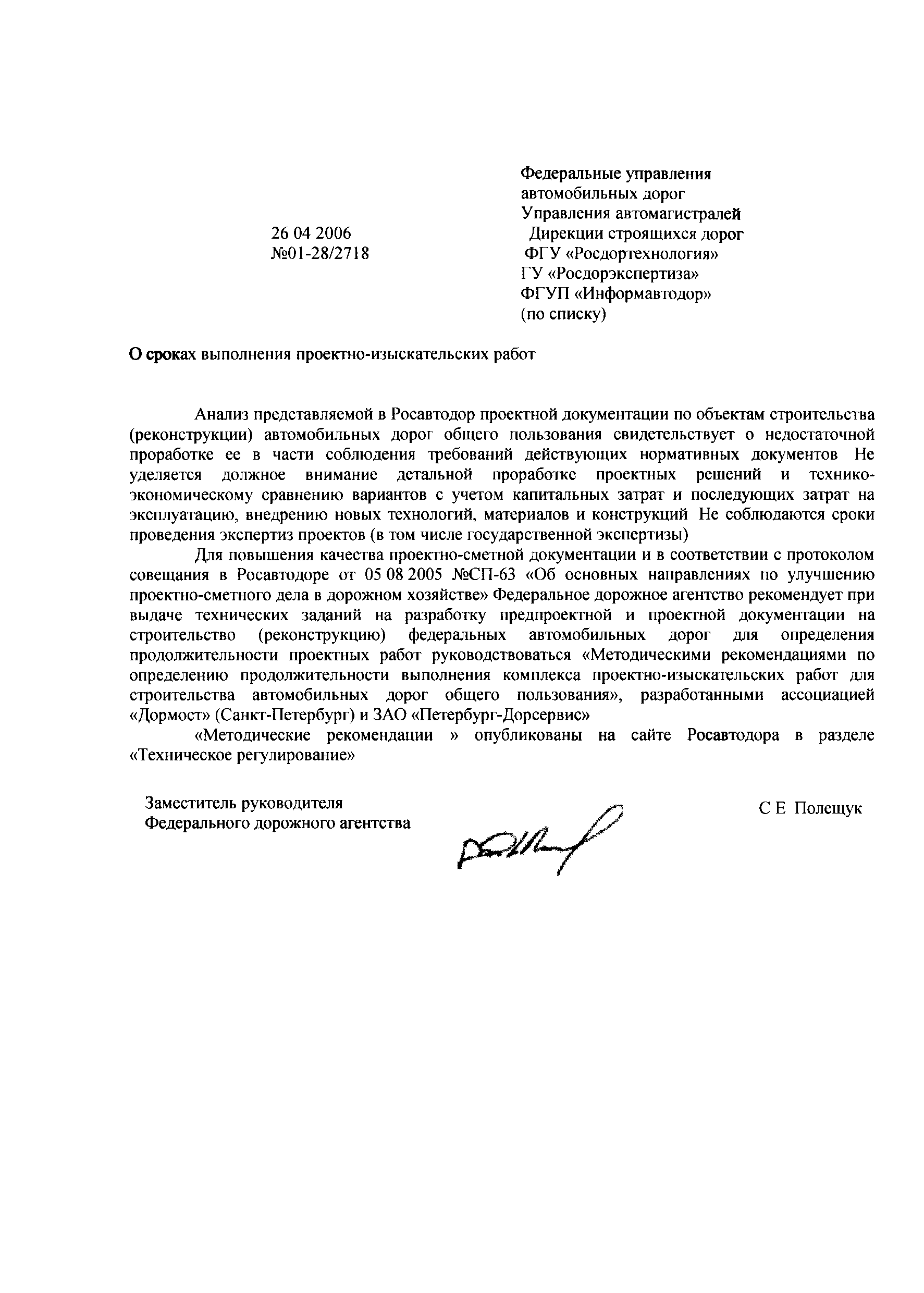 | Название рус.: | Методические рекомендации по определению продолжительности выполнения комплекса проектно-изыскательских работ для строительства автомобильных дорог общего пользования |