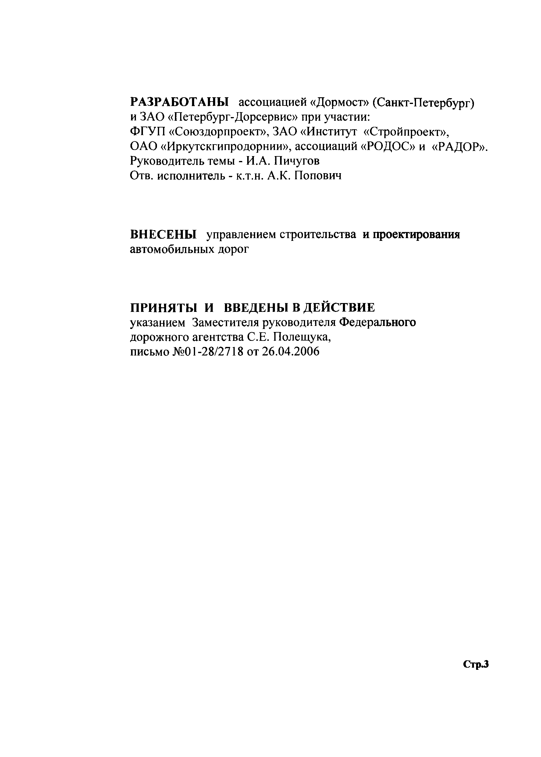 | Разработан: | ФГУП Союздорпроект Ассоциация РАДОР ОАО ИркутскГипродорнии Информавтодор ФГУ Росдортехнология ГУ Росдорэкспертиза ЗАО Петербург-Дорсервис Ассоциация Дормост Ассоциация РОДОС