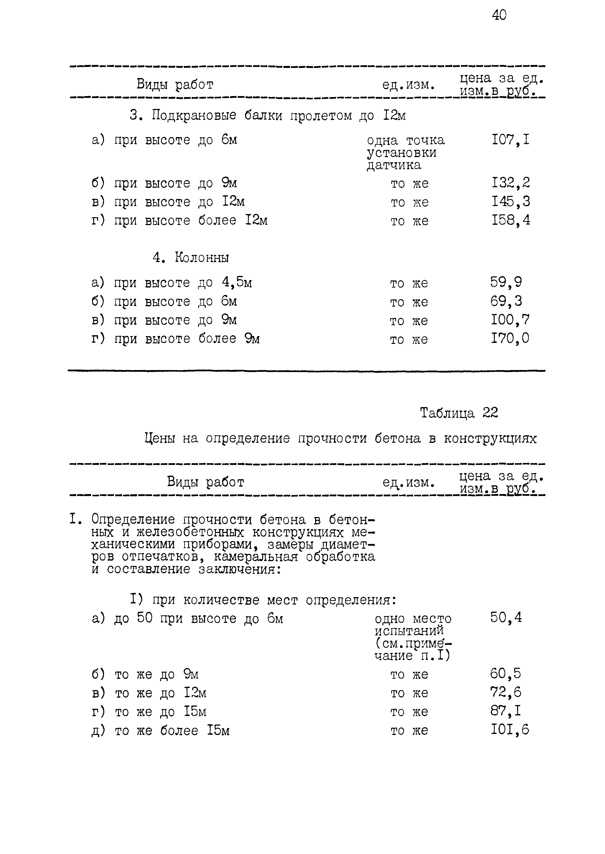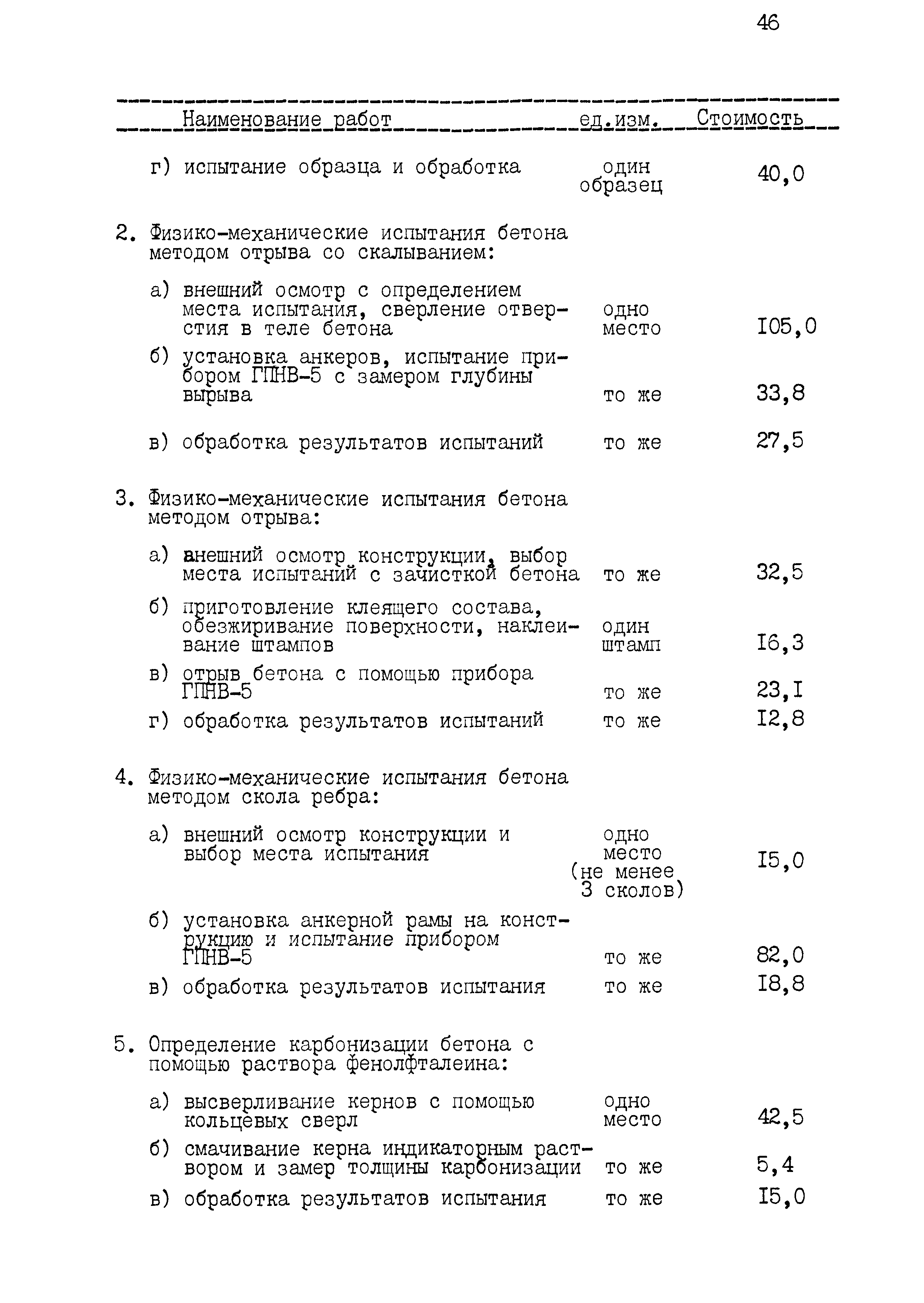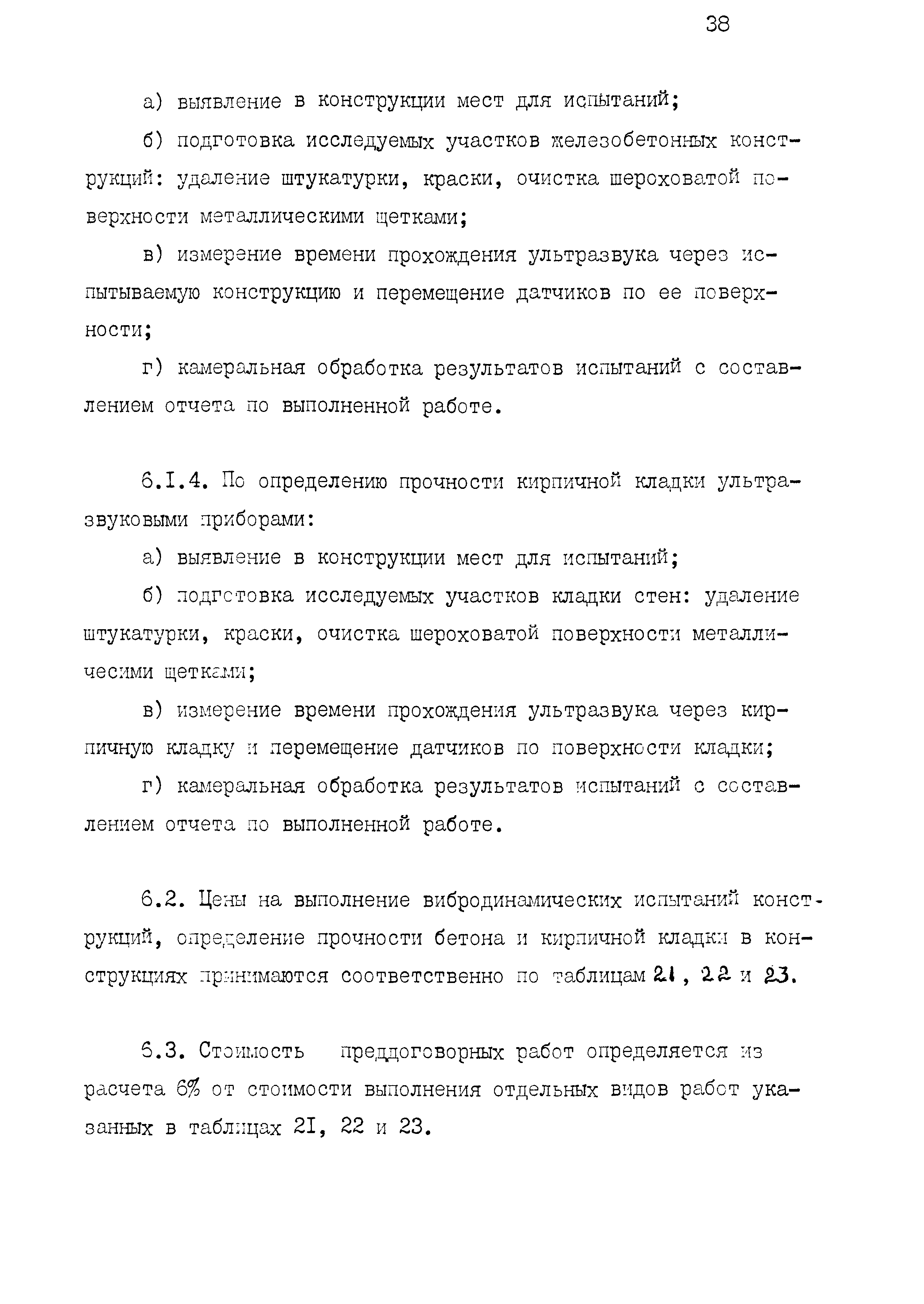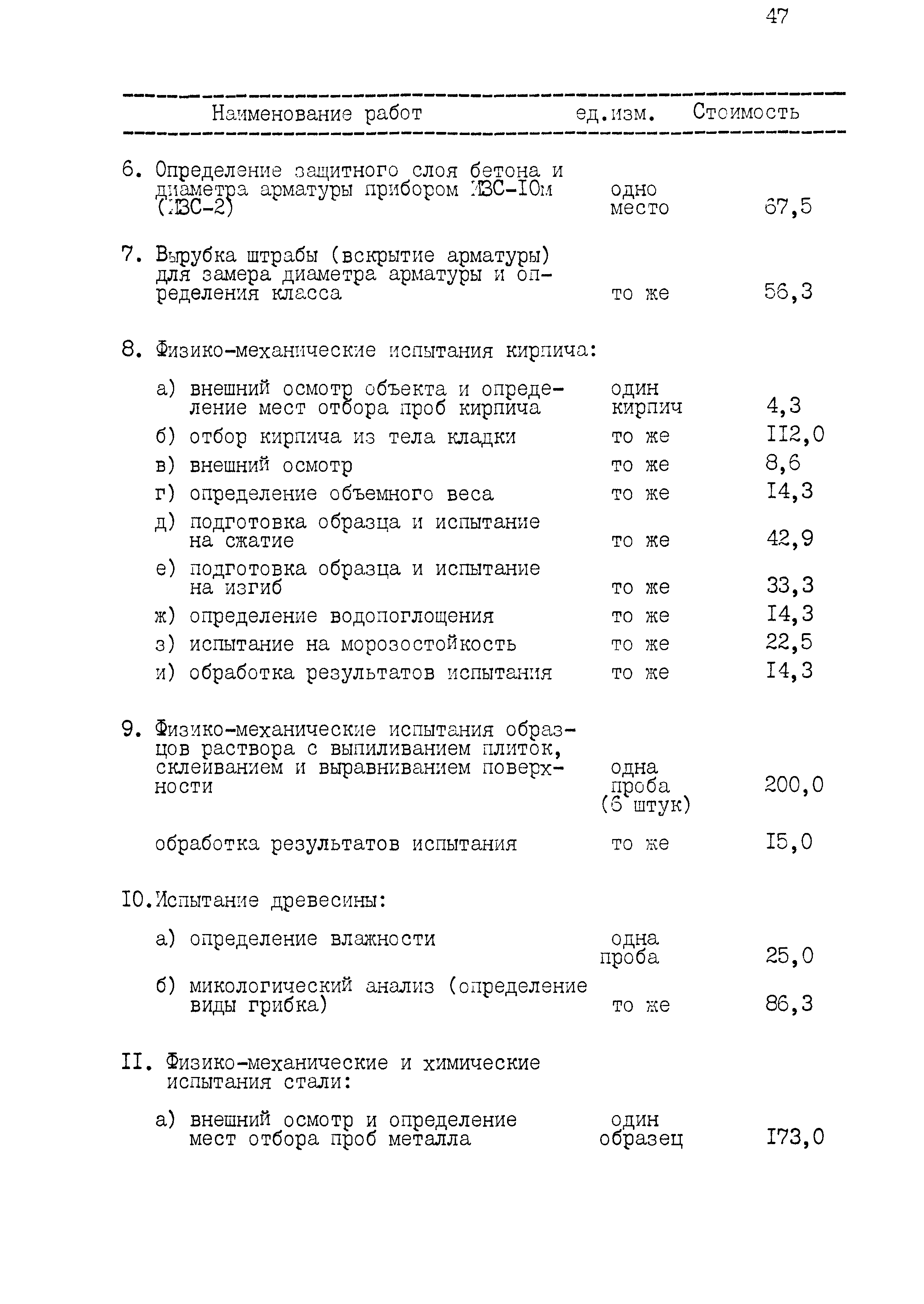 | Оглавление: | 1 Основные положения принятые при разработке Сборника цен 2 Указания о порядке определения стоимости обмерных работ 3 Указания о порядке определения стоимости обследовательских работ 4 Указания о порядке определения стоимости разработки рабочих чертежей на усиление или частичную замену строительных конструкций 5 Указания о порядке определения стоимости разработки рабочих чертежей на замену строительных конструкций 6 Указания о порядке определения стоимости вибродинамических испытаний, определения прочности кирпича и бетона в конструкциях неразрушающими методами 7 Цены на отбор проб бетона и испытание строительных материалов |
