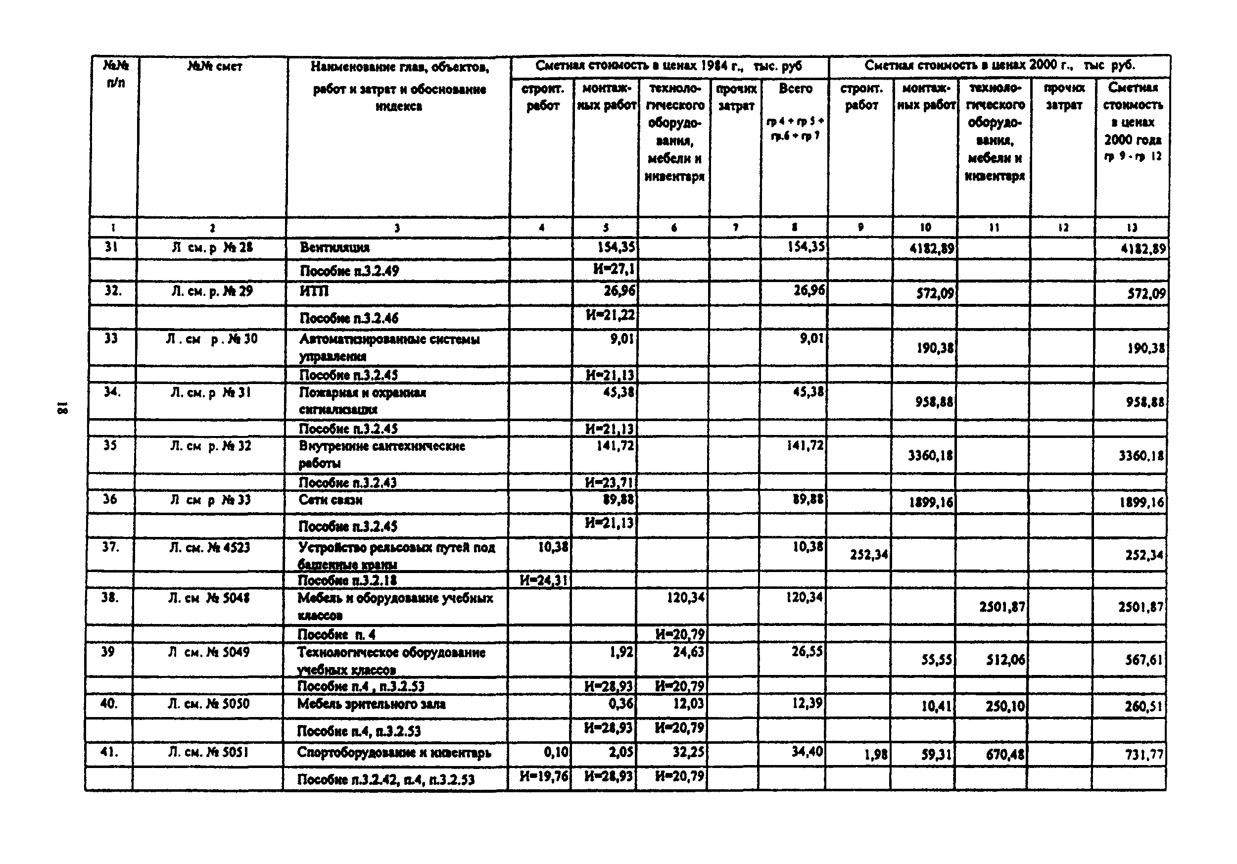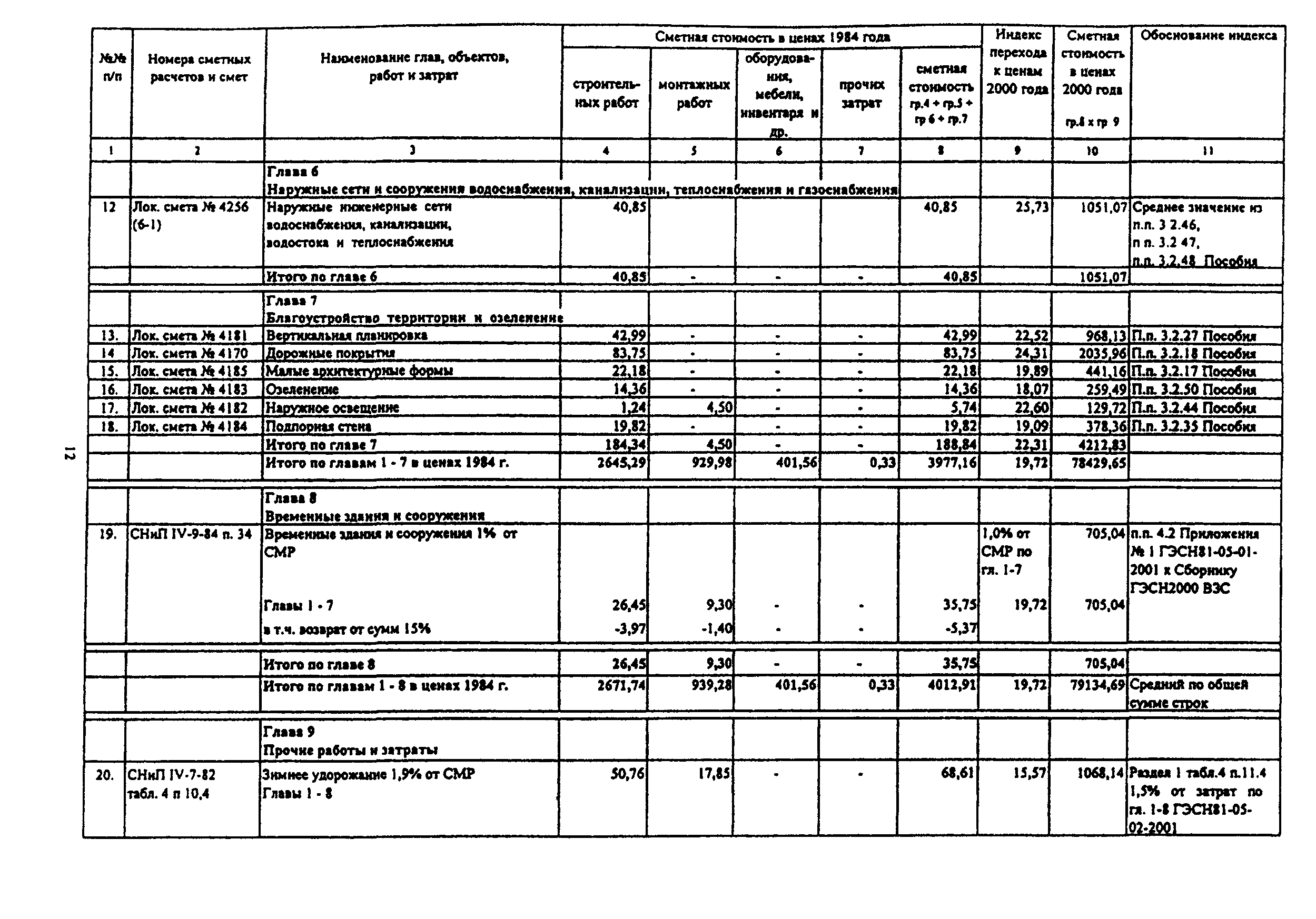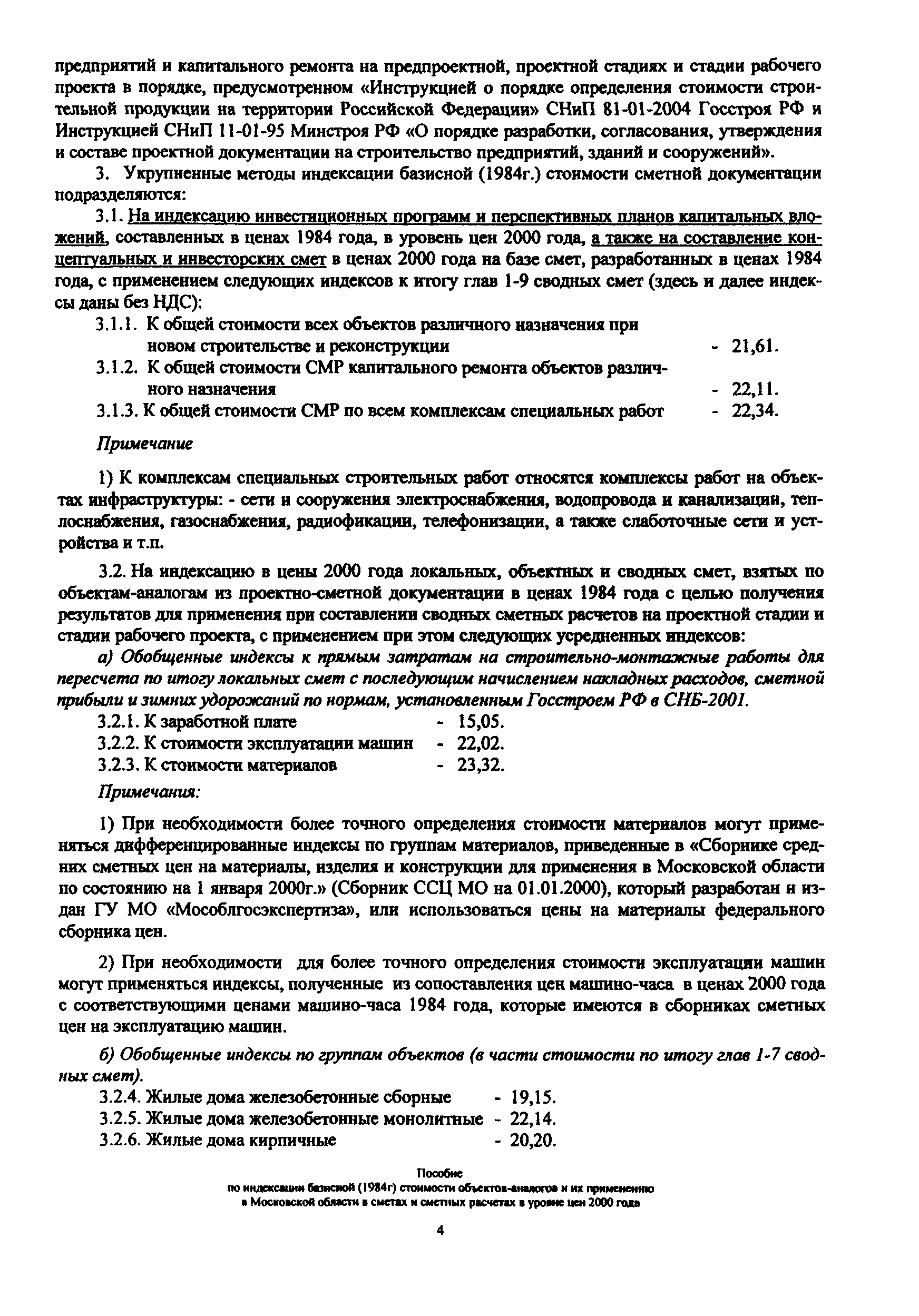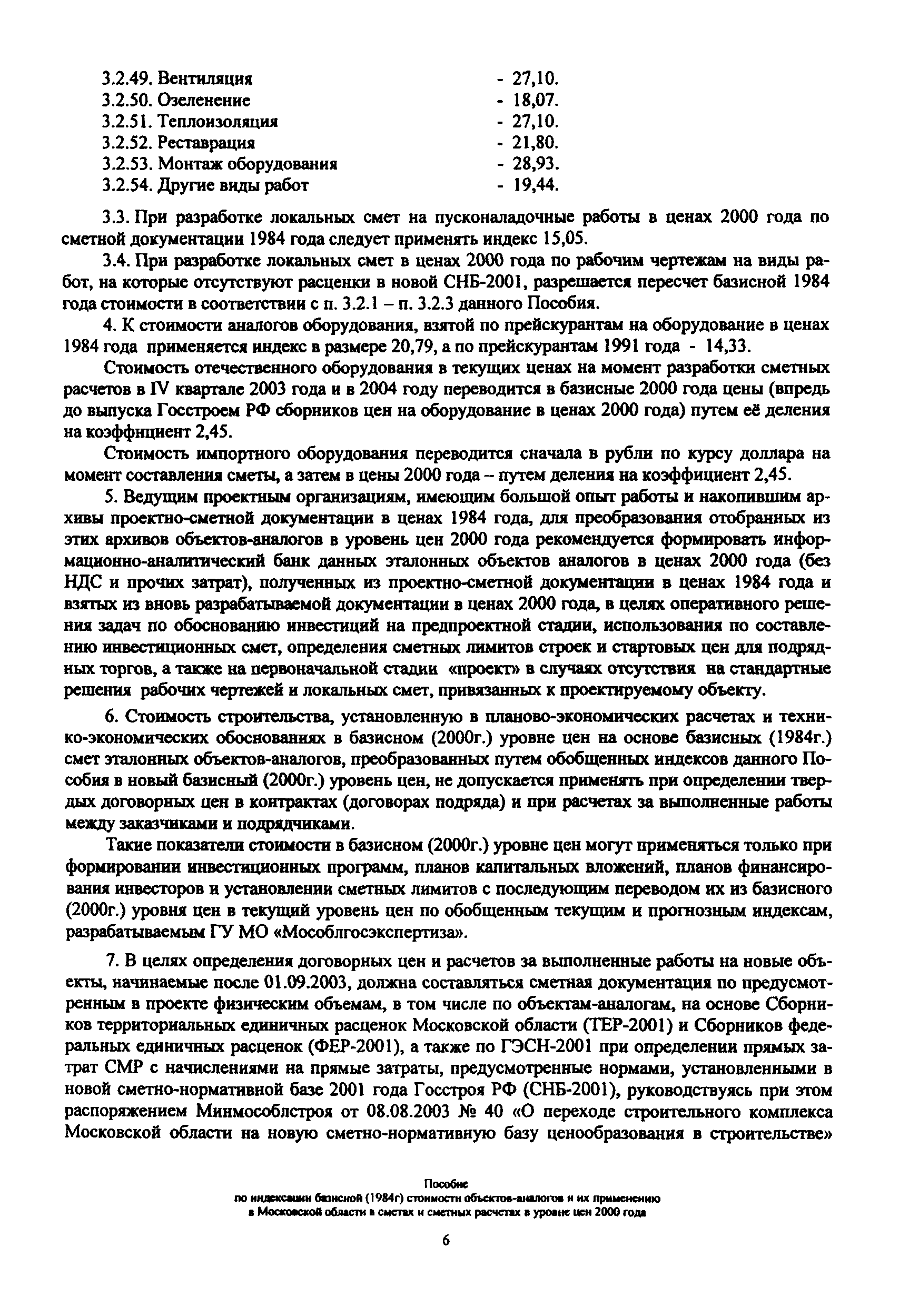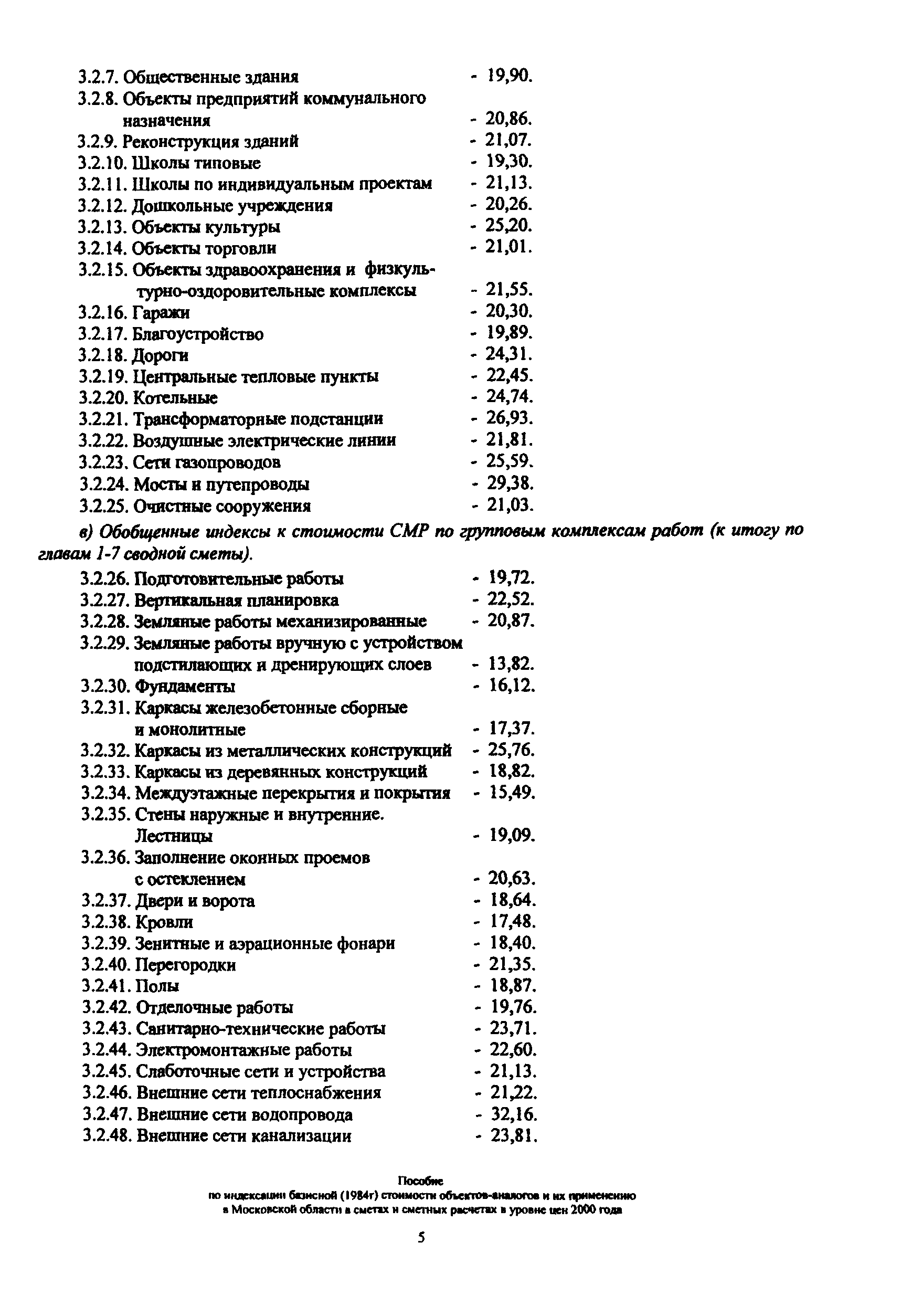 | Оглавление: | Приложения 1. Распоряжение Минмособлстроя от 08.08.2003 №40 "О переходе строительного комплекса Московской области на новую сметно-нормативную базу ценообразования в строительстве (СНБ-2001)" 2. Пример пересчета базисной 1984 года стоимости по укрупненным индексам в цены 2000 года сводной сметы на строительство школы 3. Пример пересчета базисной по укрупненным индексам объектной сметы по той же школе из цен 1984 года в цены 2000 года 4. Пример пересчета базисной по укрупненным индексам локальной сметы по той же школе из цен 1984 года в цены 2000 года |