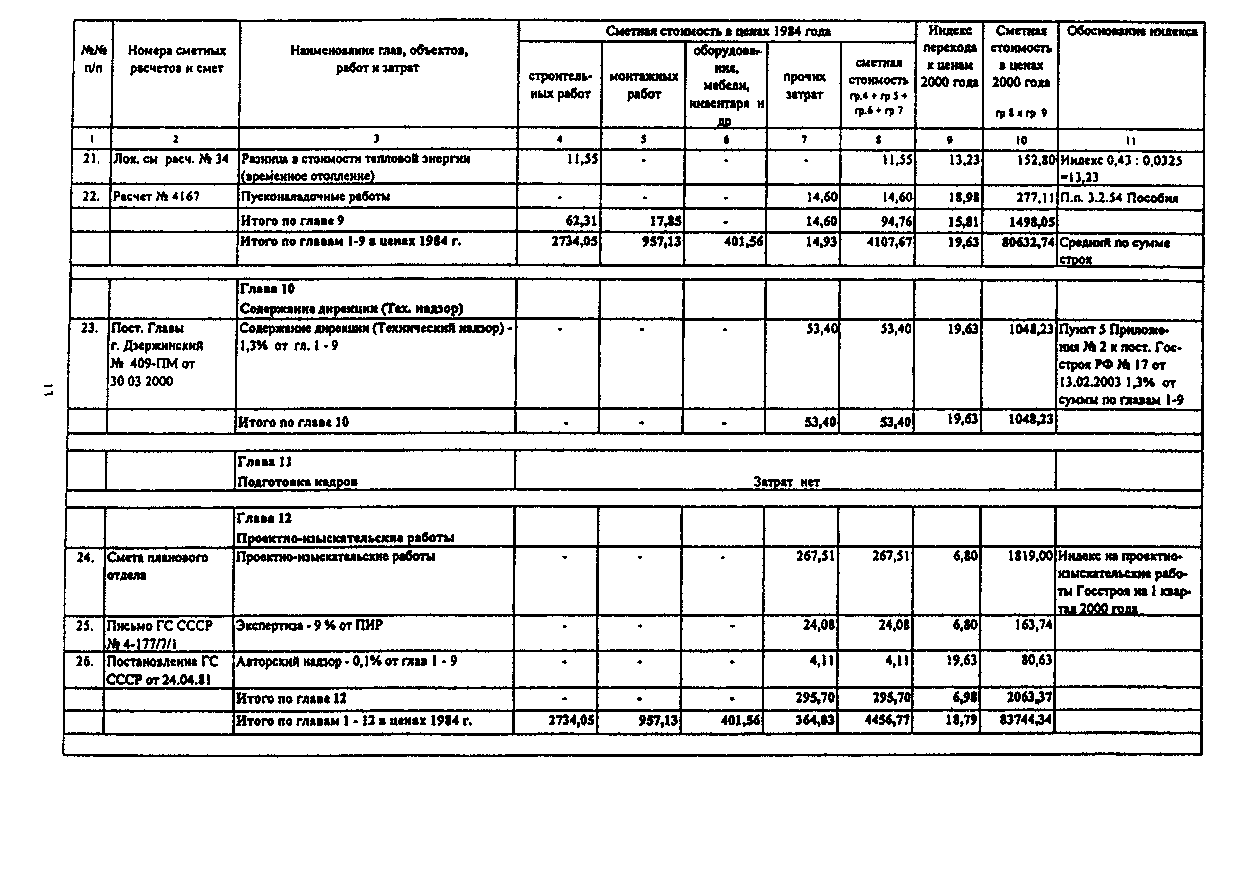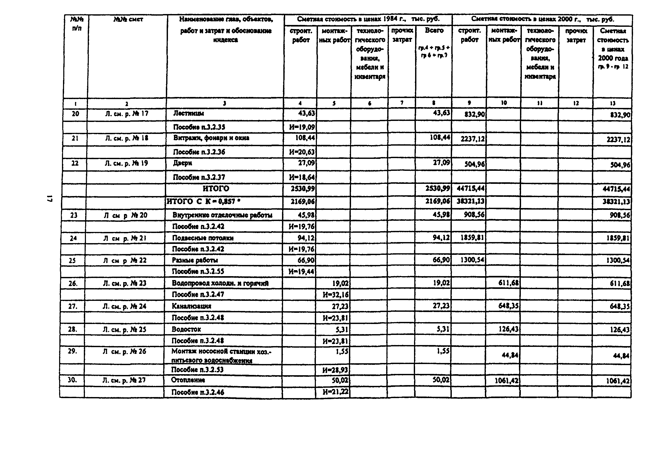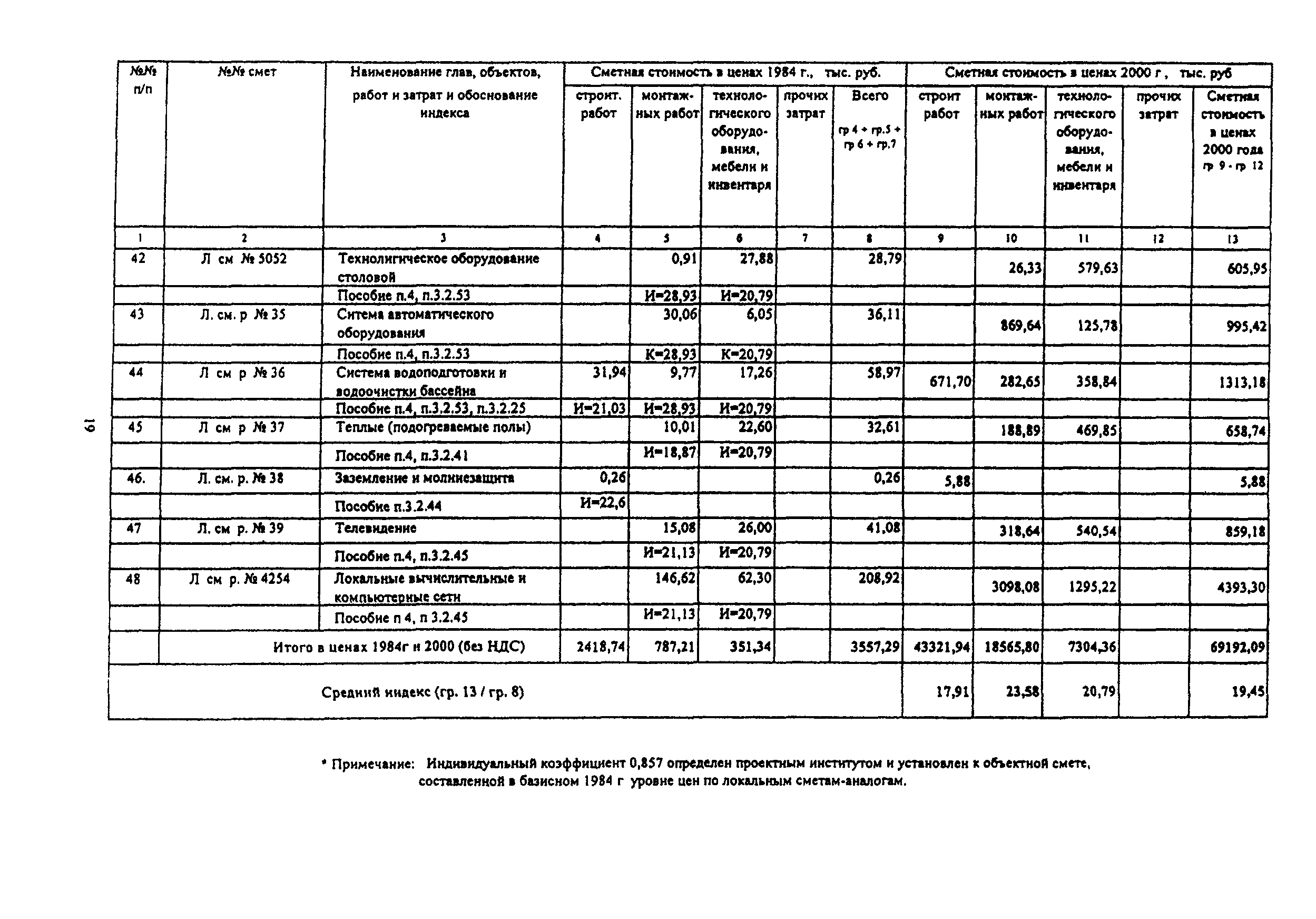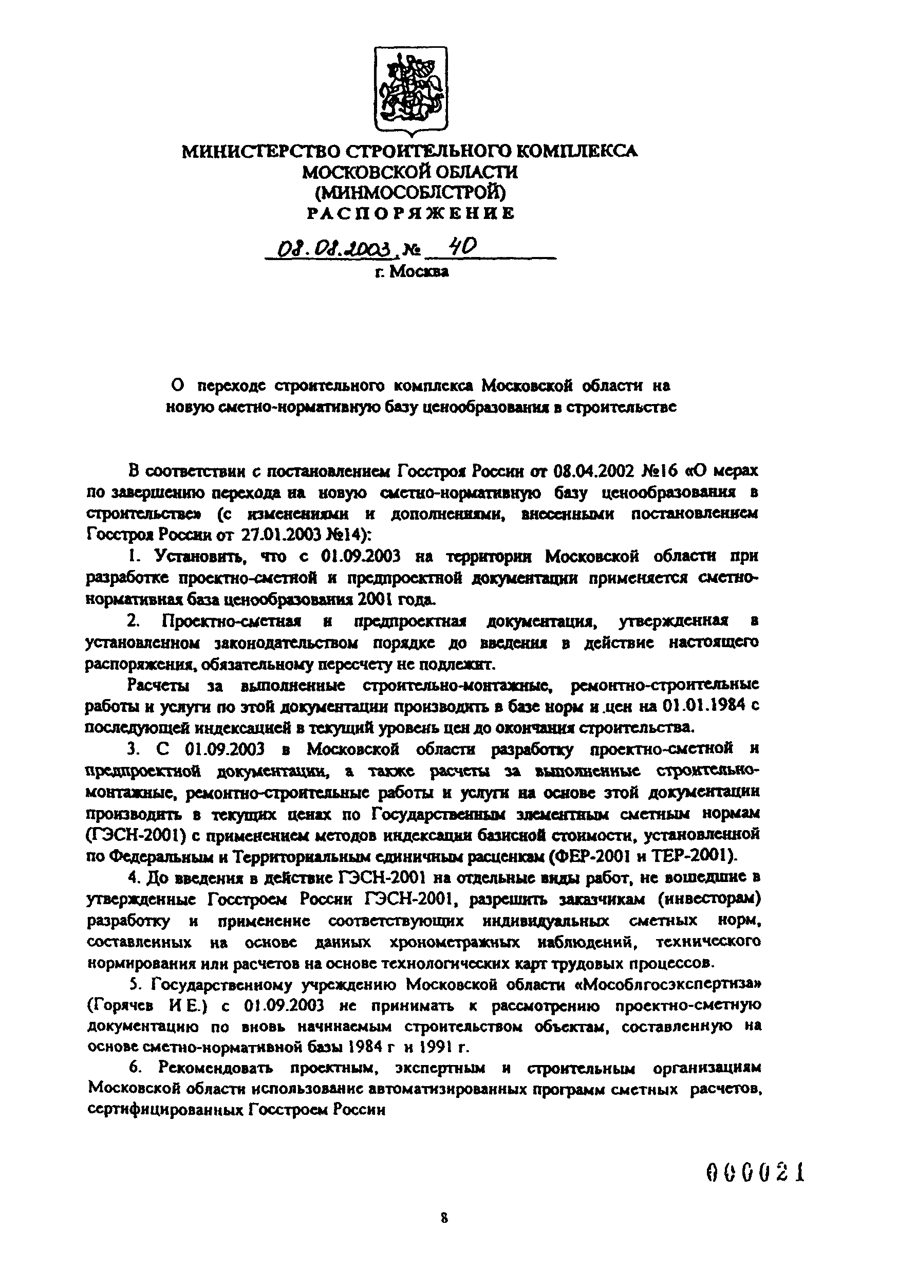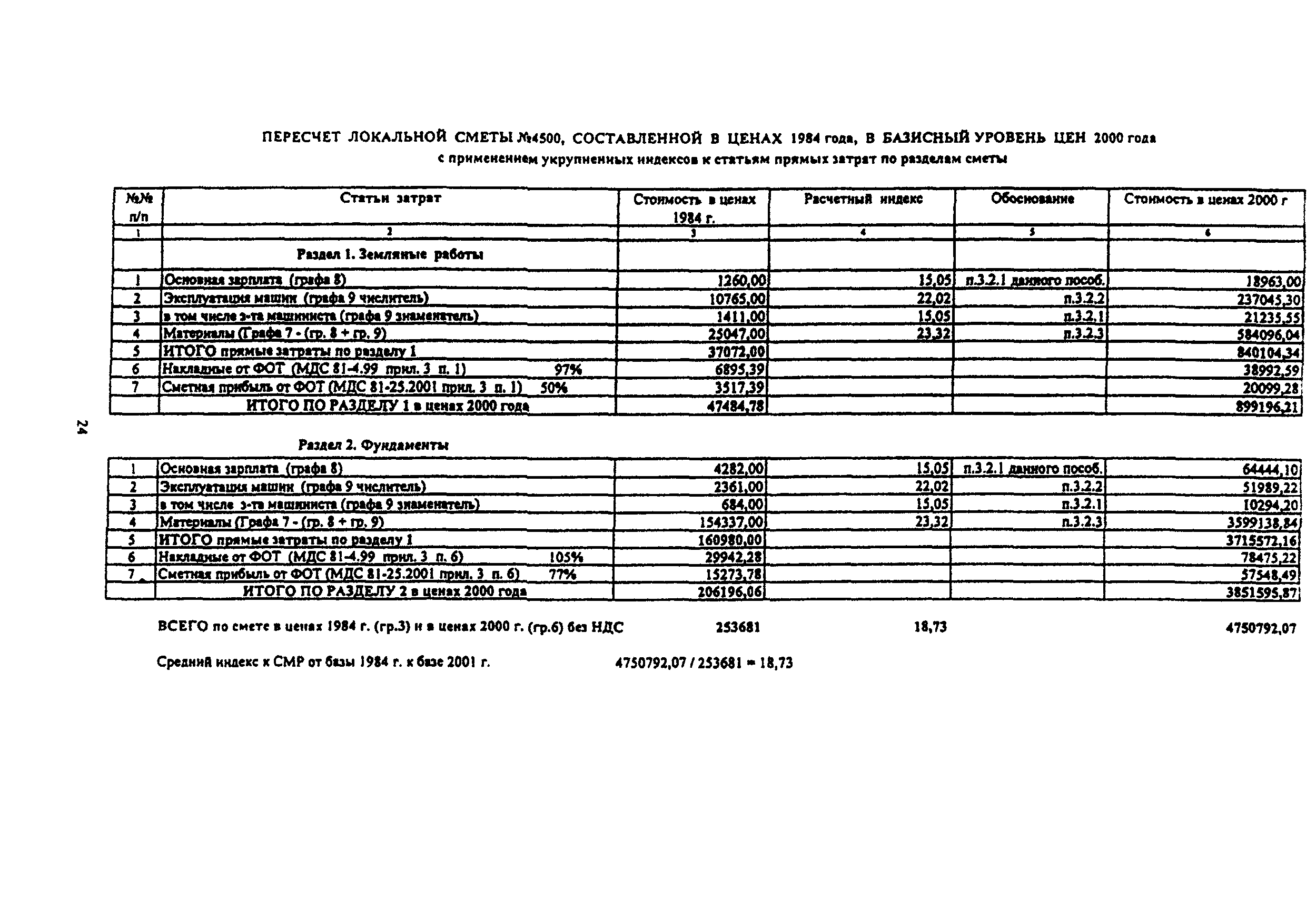 | Оглавление: | Приложения 1. Распоряжение Минмособлстроя от 08.08.2003 №40 "О переходе строительного комплекса Московской области на новую сметно-нормативную базу ценообразования в строительстве (СНБ-2001)" 2. Пример пересчета базисной 1984 года стоимости по укрупненным индексам в цены 2000 года сводной сметы на строительство школы 3. Пример пересчета базисной по укрупненным индексам объектной сметы по той же школе из цен 1984 года в цены 2000 года 4. Пример пересчета базисной по укрупненным индексам локальной сметы по той же школе из цен 1984 года в цены 2000 года |