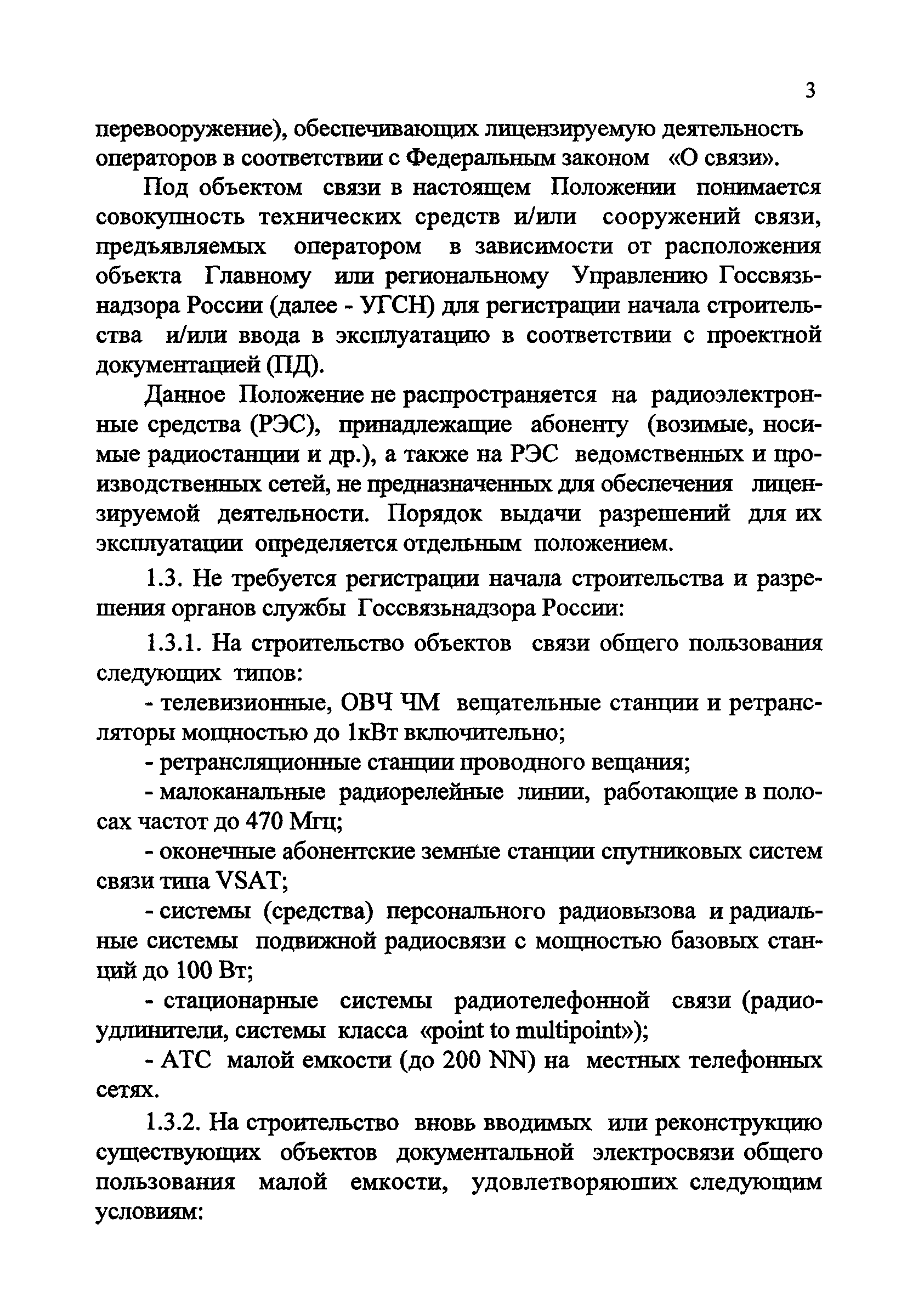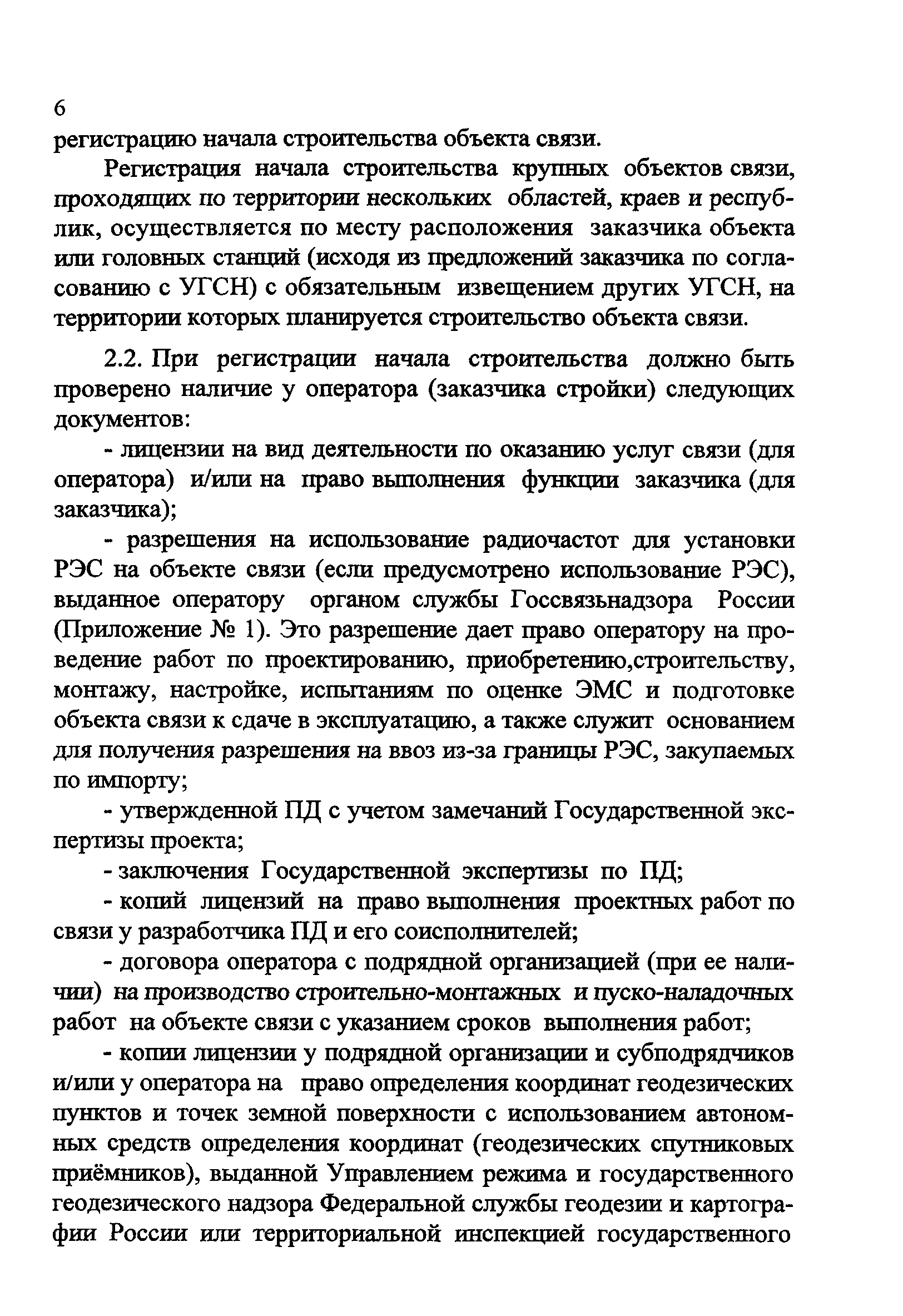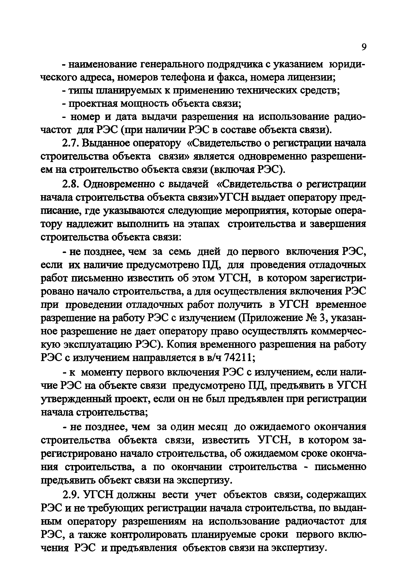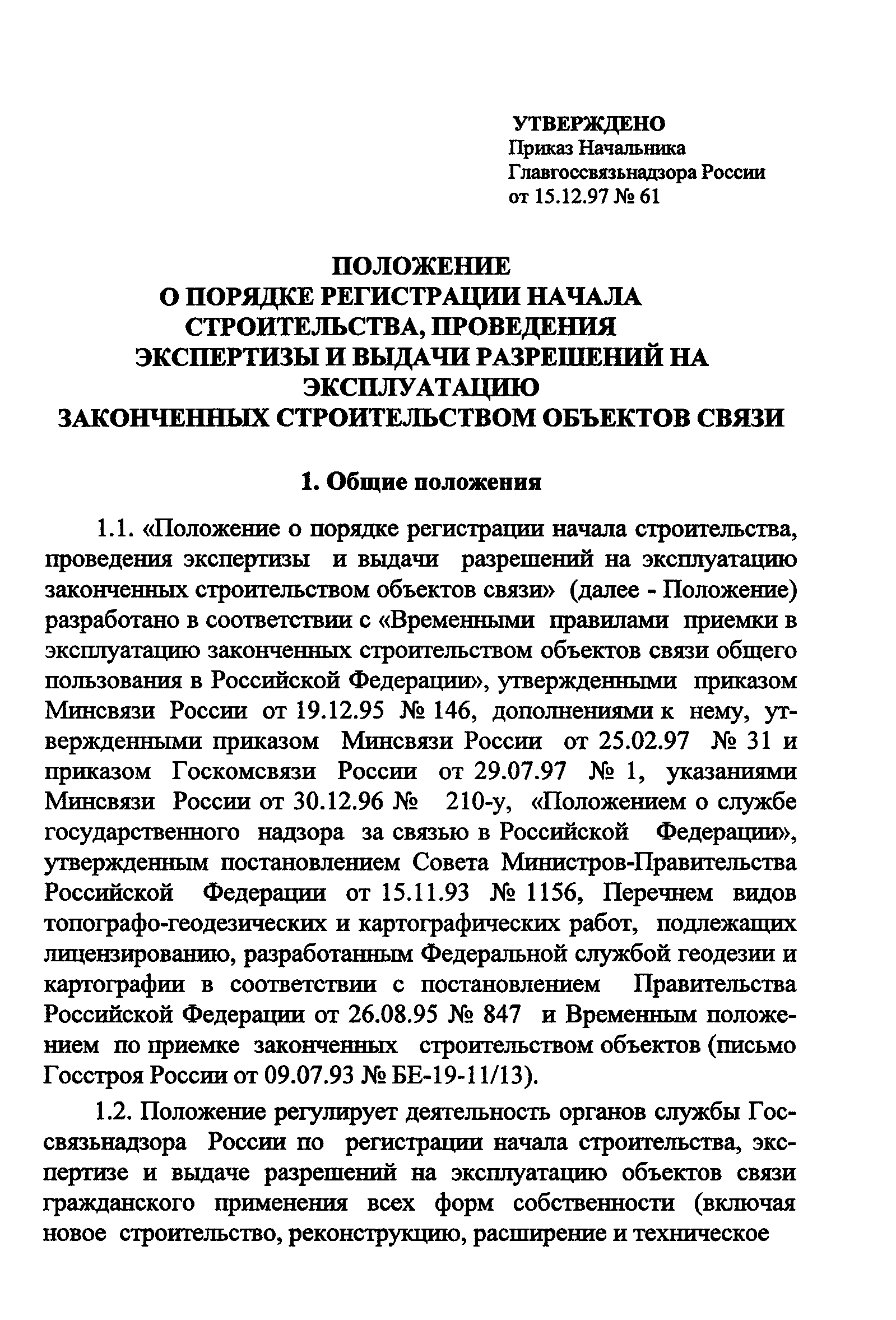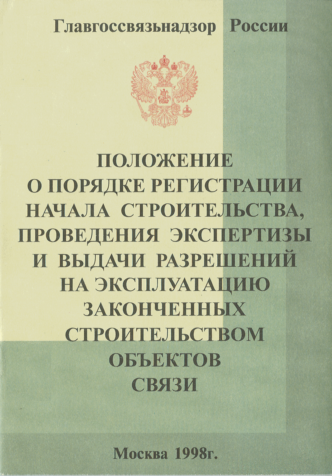Положение о порядке регистрации начала строительства, проведения экспертизы и выдачи разрешений на эксплуатацию законченных строительством объектов связи| Статус: | действует | | Название рус.: | Положение о порядке регистрации начала строительства, проведения экспертизы и выдачи разрешений на эксплуатацию законченных строительством объектов связи | | Дата добавления в базу: | 01.09.2013 | | Дата актуализации: | 01.01.2021 | | Область применения: | Положение регулирует деятельность органов службы Госсвязьнадзора России по регистрации начала строительства, экспертизе и выдаче разрешений на эксплуатацию объектов связи гражданского применения всех форм собственности (включая новое строительство, реконструкцию, расширение и техническое перевооружение), обеспечивающих лицензируемую деятельность операторов в соответствии с Федеральным законом «О связи». | | Оглавление: | 1 Общие положения 2 Регистрация начала строительства объекта связи 3 Взаимодействие с оператором на этапе строительства объекта связи 4 Экспертиза объекта связи 5 Участие в работе приемочной комиссии 6 Выдача разрешения на эксплуатацию объекта связи Приложение 1 Разрешение на использование радиочастот для установки РЭС Приложение 2 Свидетельство о регистрации начала строительства объекта связи Приложение 3 Временное разрешение на работу РЭС с излучением Приложение 4 Заключение о результатах экспертизы № Приложение 5 Разрешение на использование радиочастот для эксплуатации РЭС Приложение 6 Разрешение на эксплуатацию объекта связи Приложение 7 Разрешение на эксплуатацию радиоэлектронного средства | | Утверждён: | 15.12.1997 Главгоссвязьнадзор России (61)