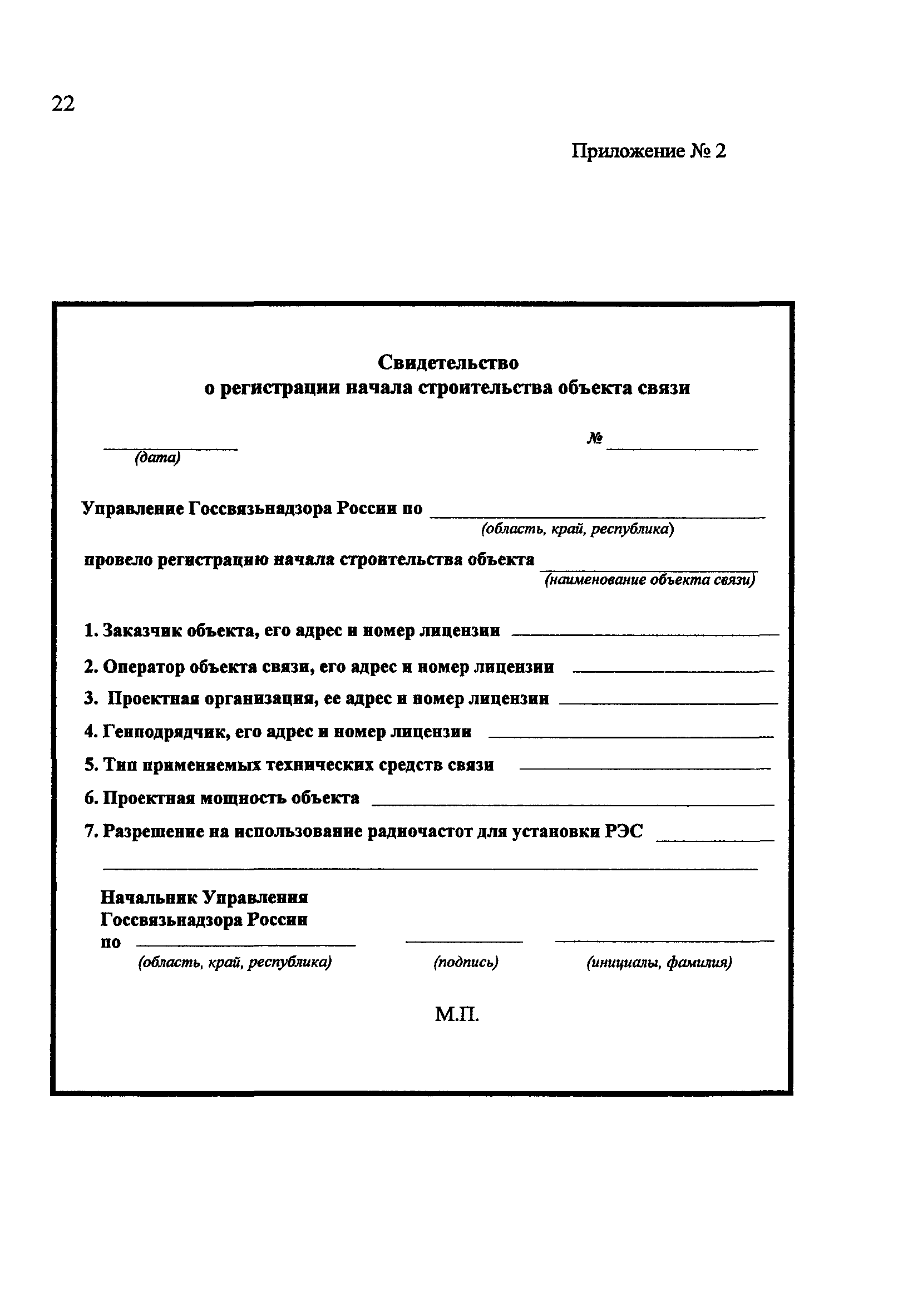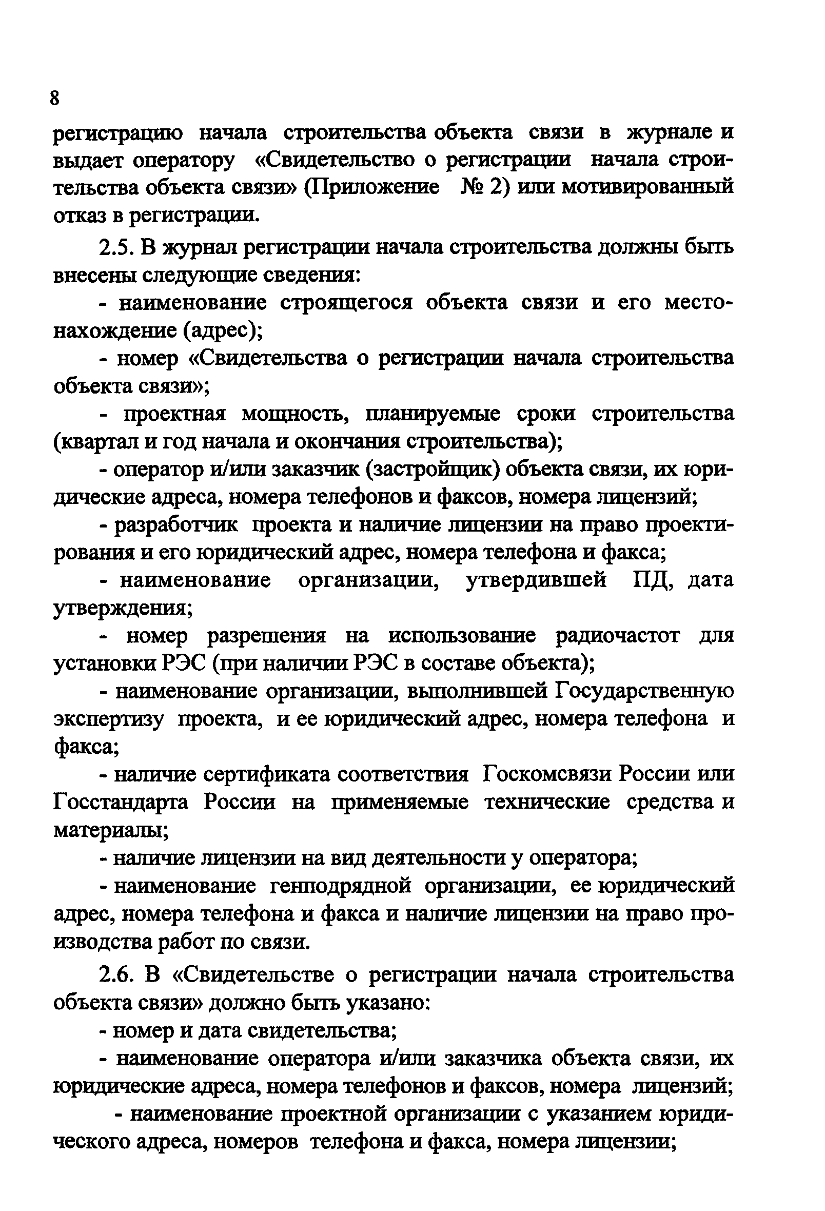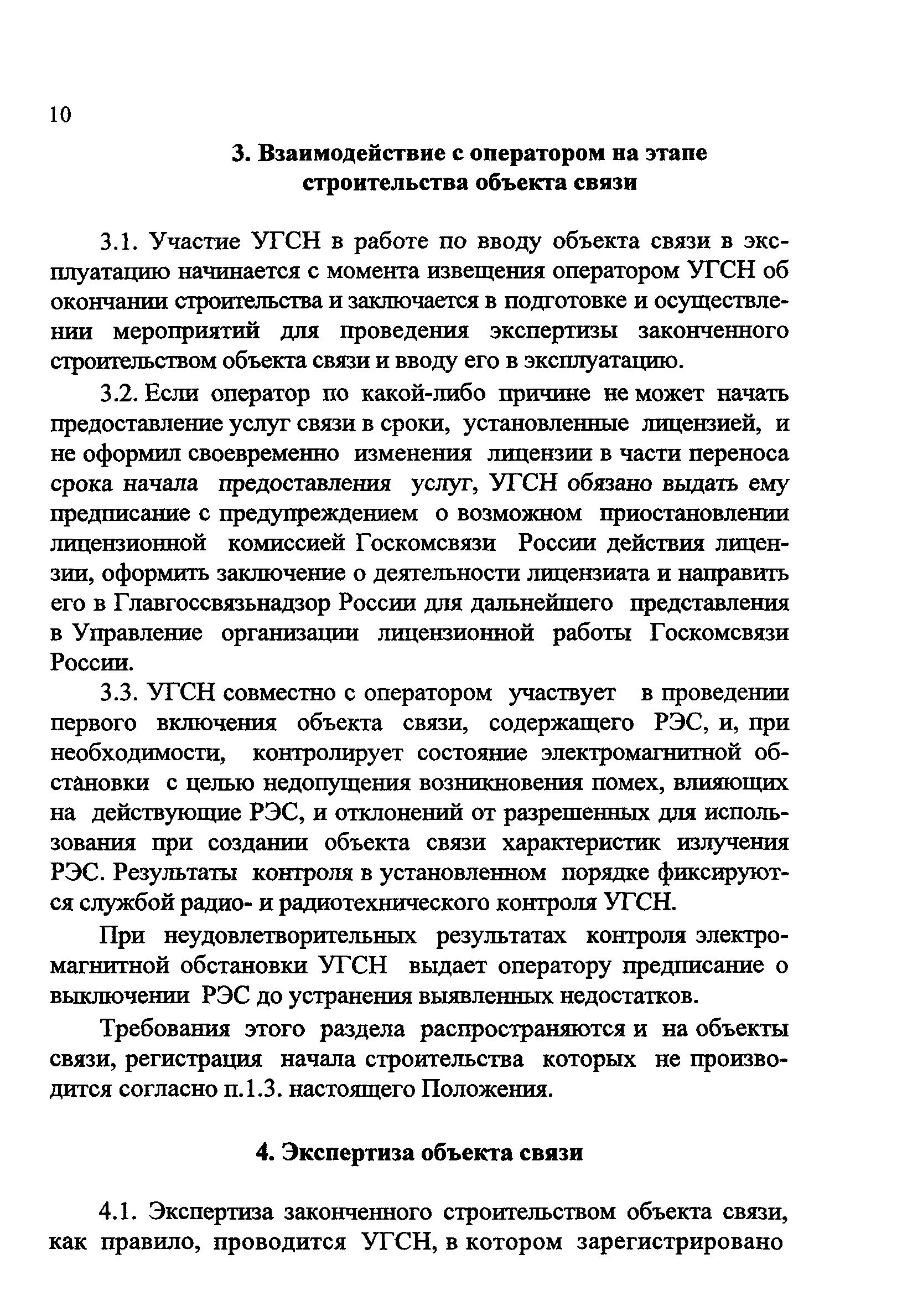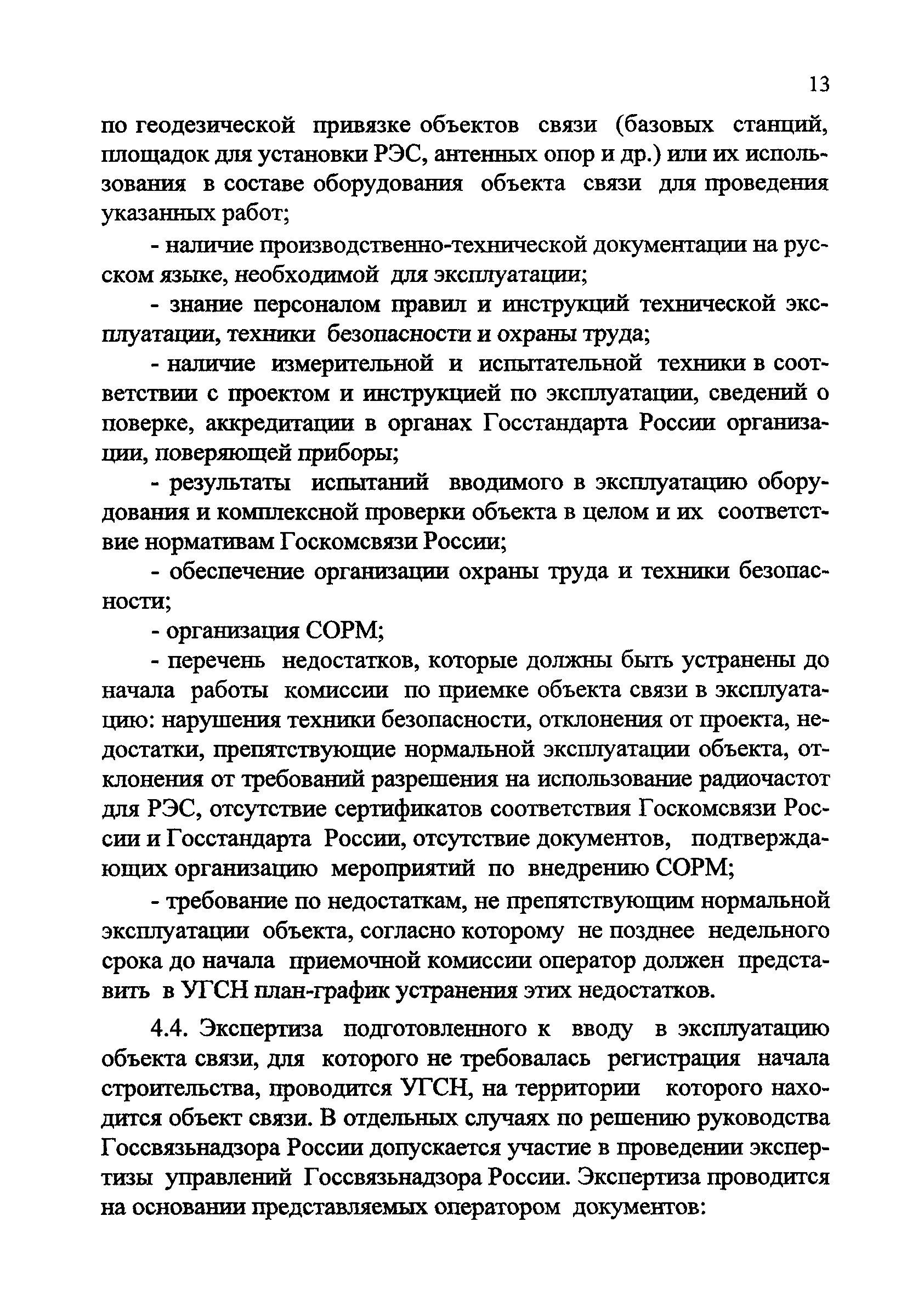 Положение о порядке регистрации начала строительства, проведения экспертизы и выдачи разрешений на эксплуатацию законченных строительством объектов связи| Статус: | действует | | Название рус.: | Положение о порядке регистрации начала строительства, проведения экспертизы и выдачи разрешений на эксплуатацию законченных строительством объектов связи | | Дата добавления в базу: | 01.09.2013 | | Дата актуализации: | 01.01.2021 | | Область применения: | Положение регулирует деятельность органов службы Госсвязьнадзора России по регистрации начала строительства, экспертизе и выдаче разрешений на эксплуатацию объектов связи гражданского применения всех форм собственности (включая новое строительство, реконструкцию, расширение и техническое перевооружение), обеспечивающих лицензируемую деятельность операторов в соответствии с Федеральным законом «О связи». | | Оглавление: | 1 Общие положения 2 Регистрация начала строительства объекта связи 3 Взаимодействие с оператором на этапе строительства объекта связи 4 Экспертиза объекта связи 5 Участие в работе приемочной комиссии 6 Выдача разрешения на эксплуатацию объекта связи Приложение 1 Разрешение на использование радиочастот для установки РЭС Приложение 2 Свидетельство о регистрации начала строительства объекта связи Приложение 3 Временное разрешение на работу РЭС с излучением Приложение 4 Заключение о результатах экспертизы № Приложение 5 Разрешение на использование радиочастот для эксплуатации РЭС Приложение 6 Разрешение на эксплуатацию объекта связи Приложение 7 Разрешение на эксплуатацию радиоэлектронного средства | | Утверждён: | 15.12.1997 Главгоссвязьнадзор России (61)