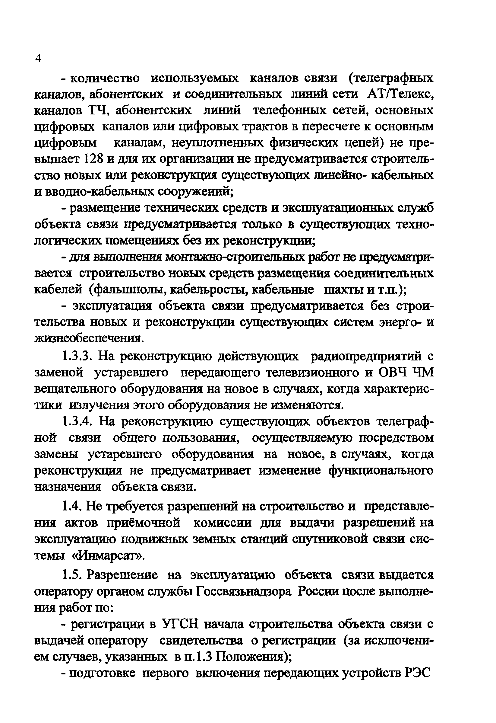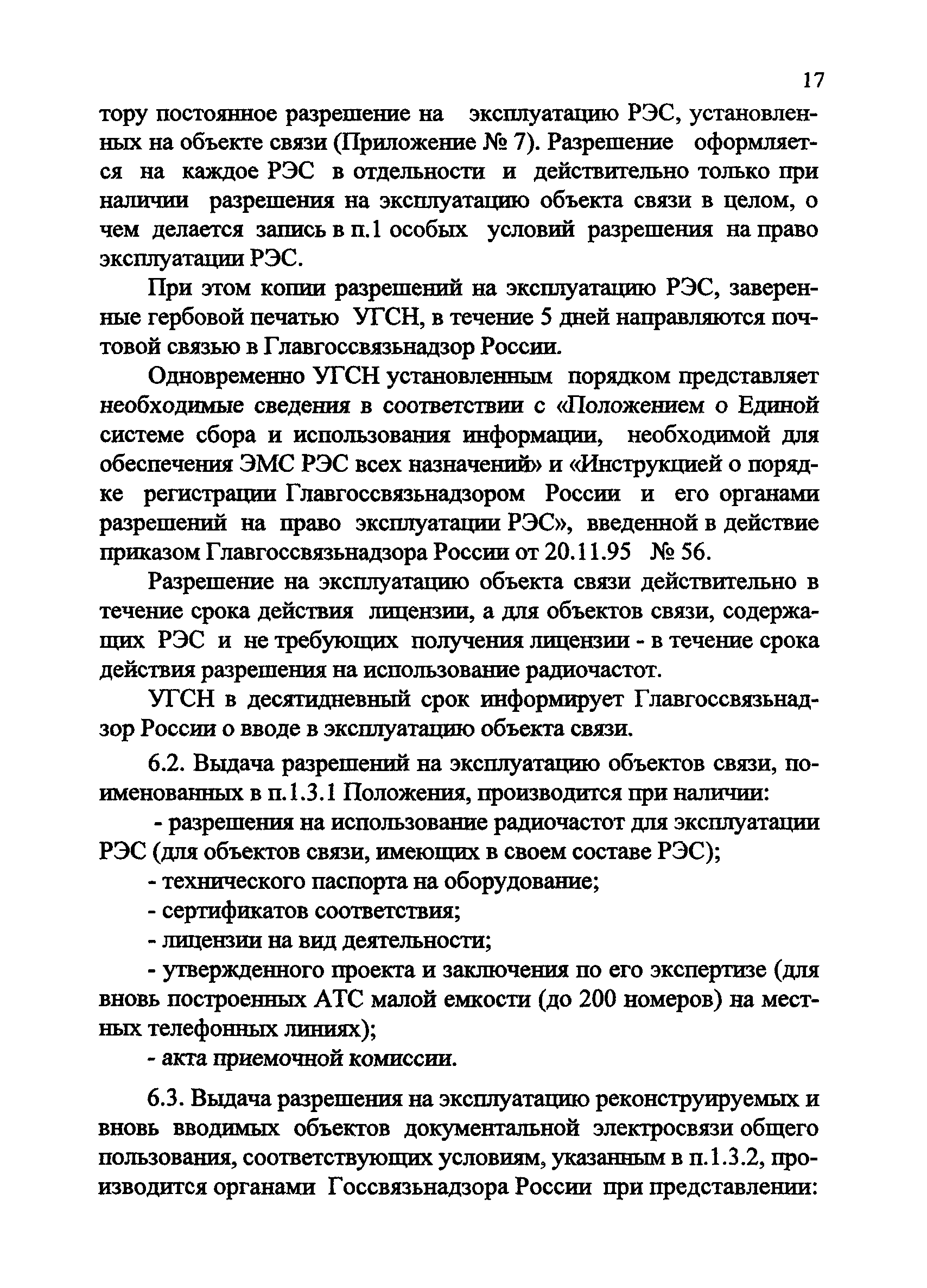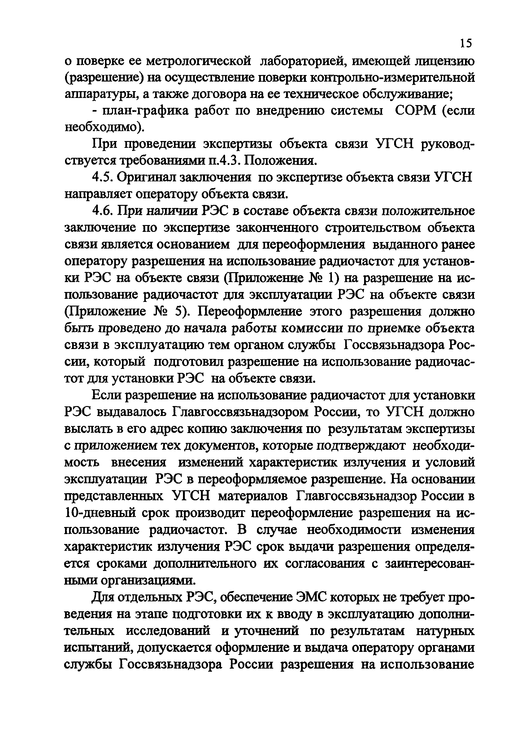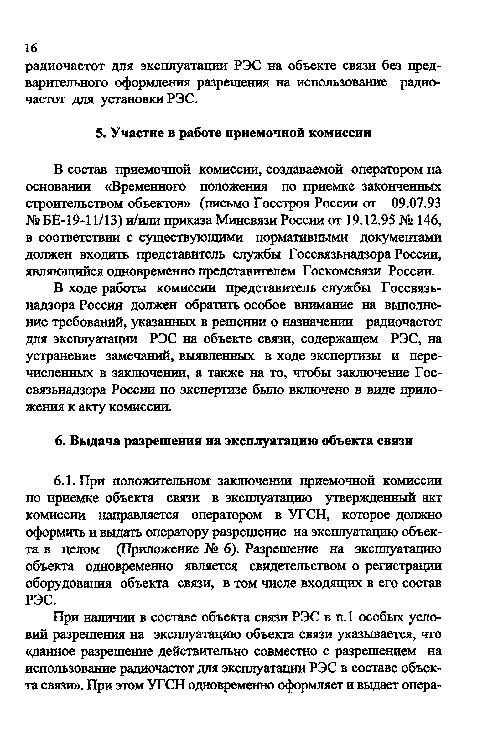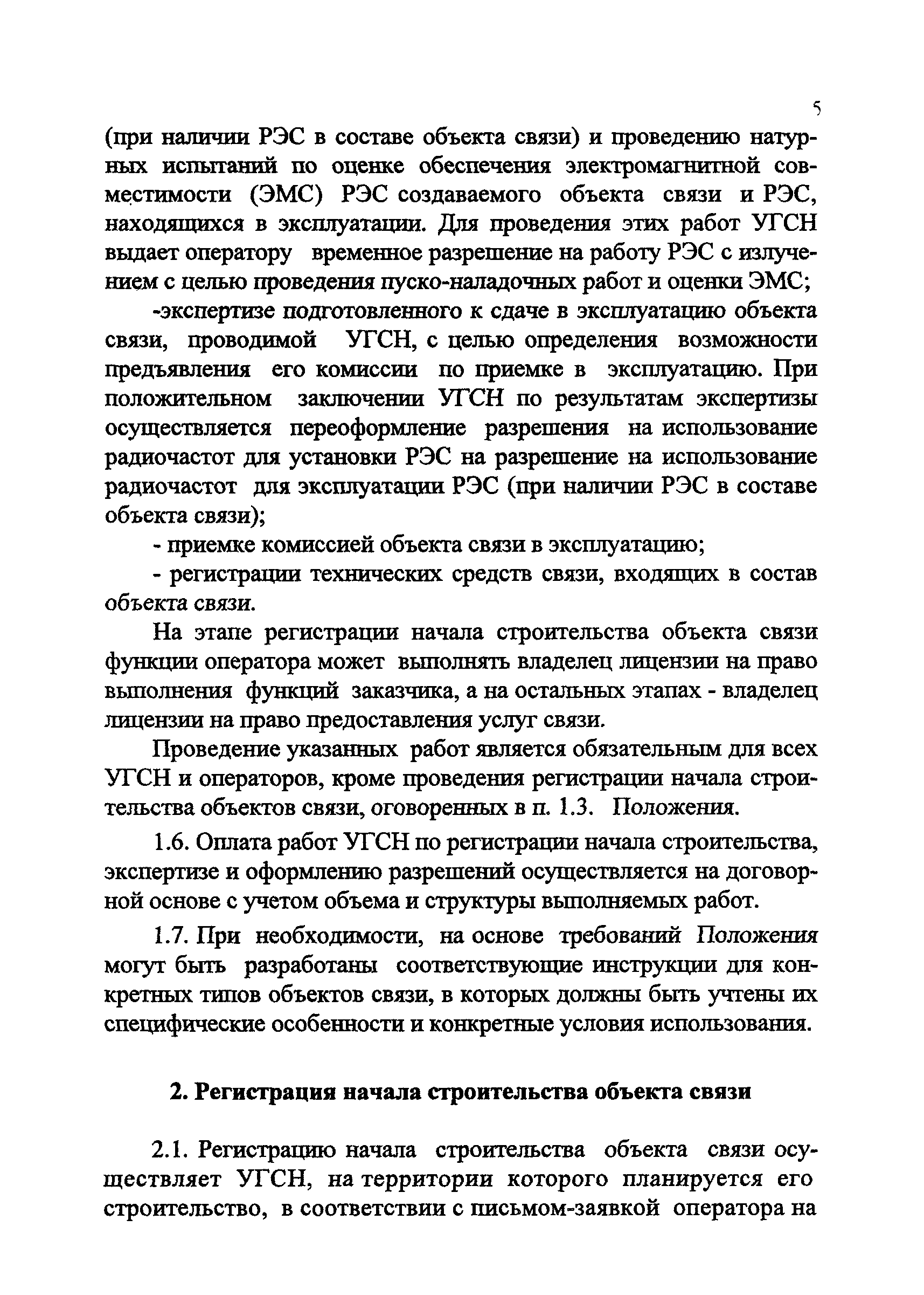 Положение о порядке регистрации начала строительства, проведения экспертизы и выдачи разрешений на эксплуатацию законченных строительством объектов связи| Статус: | действует | | Название рус.: | Положение о порядке регистрации начала строительства, проведения экспертизы и выдачи разрешений на эксплуатацию законченных строительством объектов связи | | Дата добавления в базу: | 01.09.2013 | | Дата актуализации: | 01.01.2021 | | Область применения: | Положение регулирует деятельность органов службы Госсвязьнадзора России по регистрации начала строительства, экспертизе и выдаче разрешений на эксплуатацию объектов связи гражданского применения всех форм собственности (включая новое строительство, реконструкцию, расширение и техническое перевооружение), обеспечивающих лицензируемую деятельность операторов в соответствии с Федеральным законом «О связи». | | Оглавление: | 1 Общие положения 2 Регистрация начала строительства объекта связи 3 Взаимодействие с оператором на этапе строительства объекта связи 4 Экспертиза объекта связи 5 Участие в работе приемочной комиссии 6 Выдача разрешения на эксплуатацию объекта связи Приложение 1 Разрешение на использование радиочастот для установки РЭС Приложение 2 Свидетельство о регистрации начала строительства объекта связи Приложение 3 Временное разрешение на работу РЭС с излучением Приложение 4 Заключение о результатах экспертизы № Приложение 5 Разрешение на использование радиочастот для эксплуатации РЭС Приложение 6 Разрешение на эксплуатацию объекта связи Приложение 7 Разрешение на эксплуатацию радиоэлектронного средства | | Утверждён: | 15.12.1997 Главгоссвязьнадзор России (61)