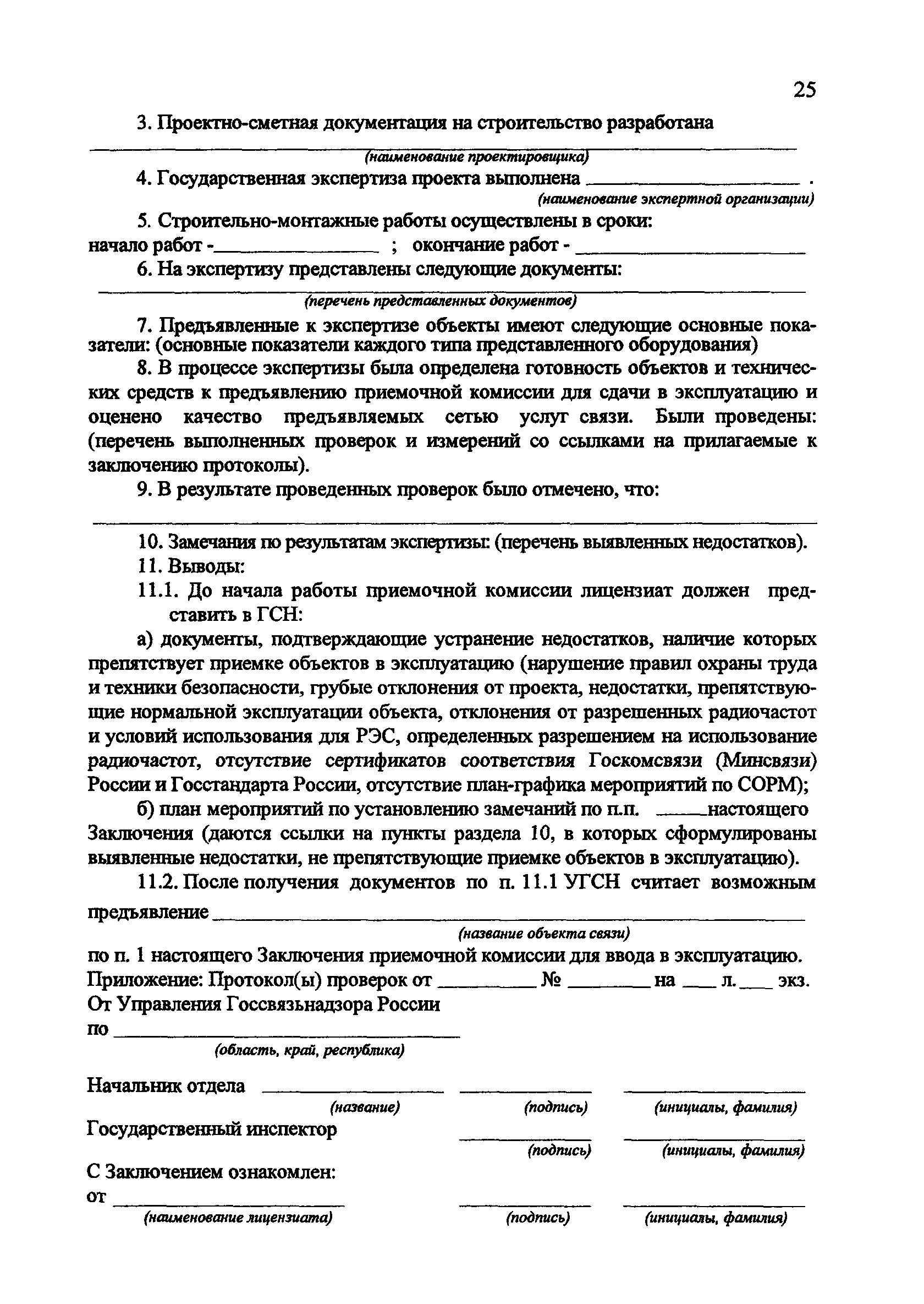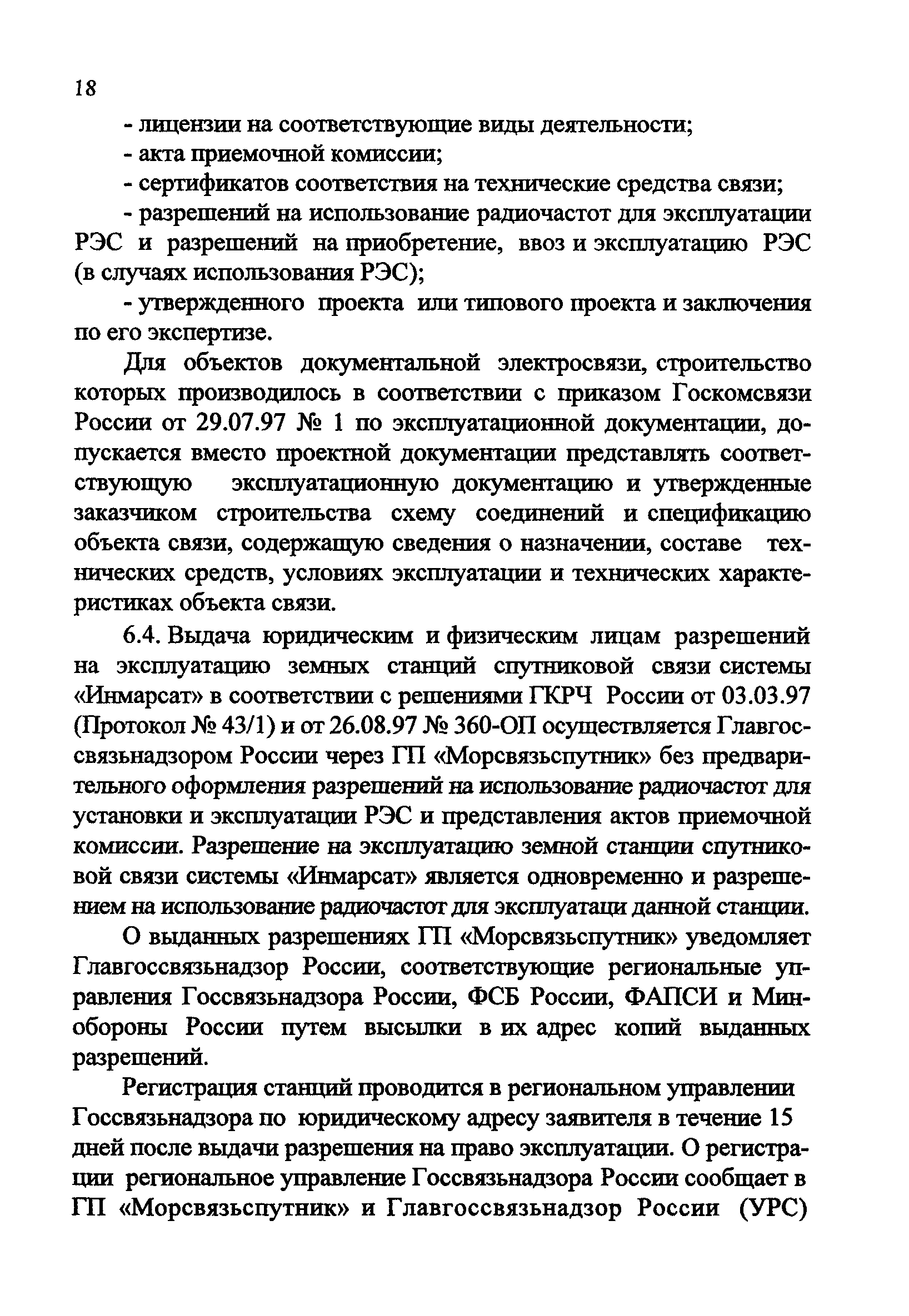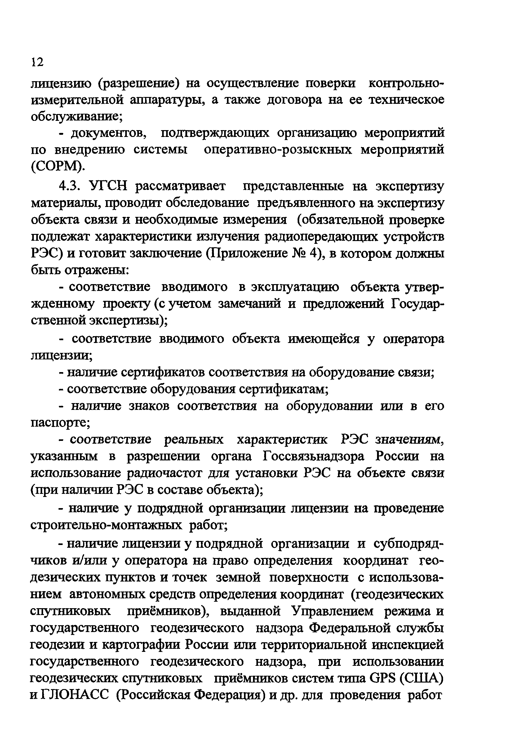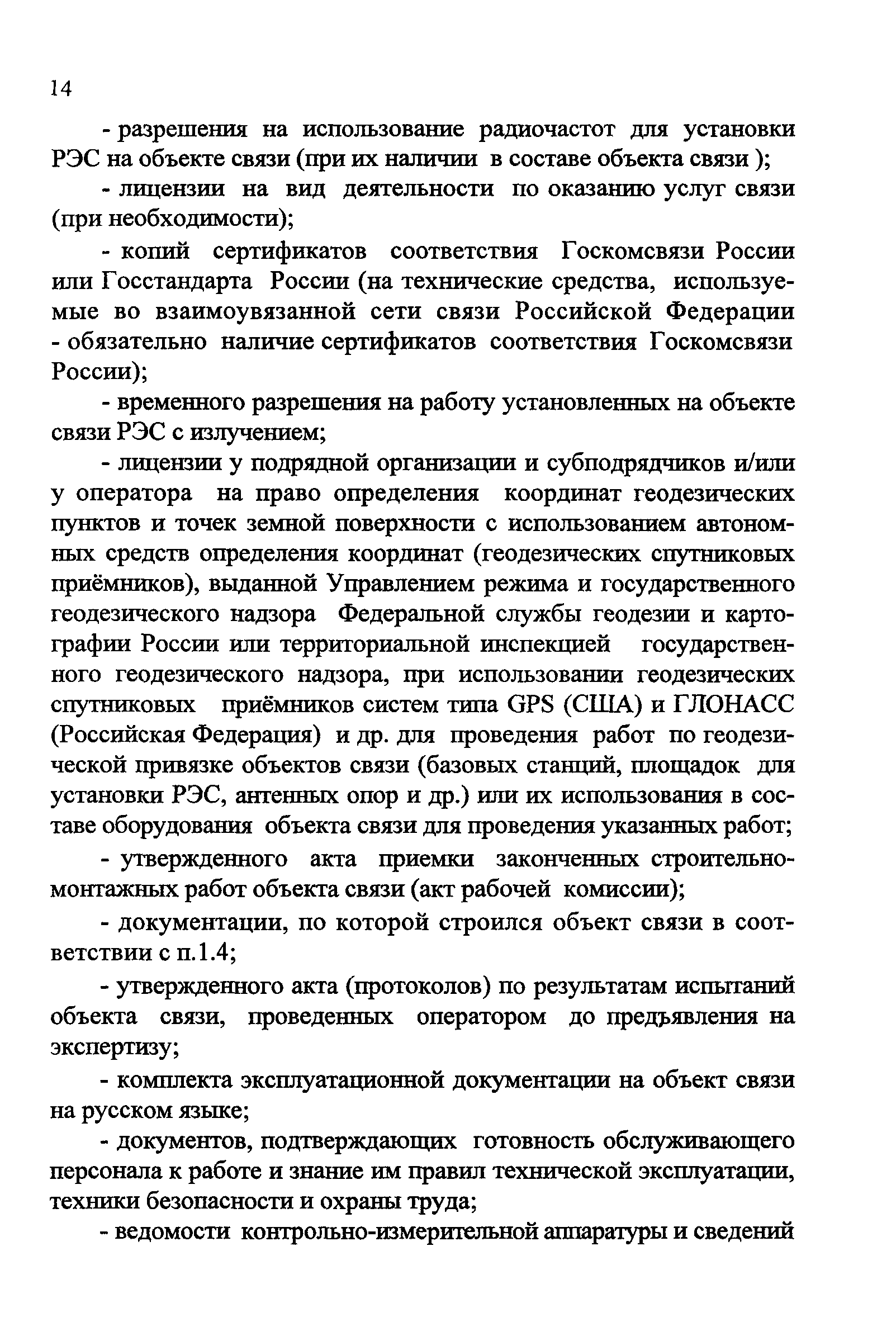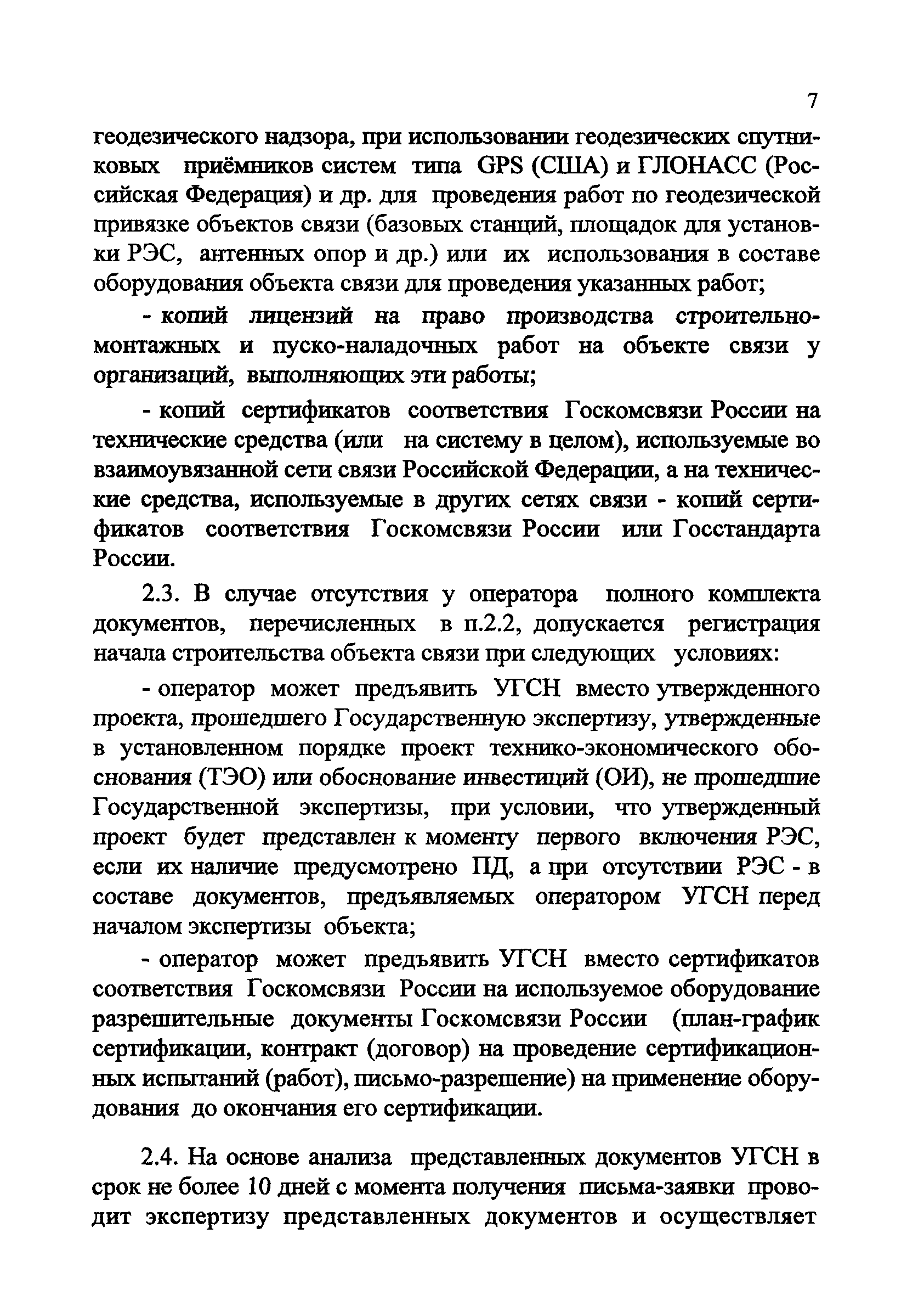 Положение о порядке регистрации начала строительства, проведения экспертизы и выдачи разрешений на эксплуатацию законченных строительством объектов связи| Статус: | действует | | Название рус.: | Положение о порядке регистрации начала строительства, проведения экспертизы и выдачи разрешений на эксплуатацию законченных строительством объектов связи | | Дата добавления в базу: | 01.09.2013 | | Дата актуализации: | 01.01.2021 | | Область применения: | Положение регулирует деятельность органов службы Госсвязьнадзора России по регистрации начала строительства, экспертизе и выдаче разрешений на эксплуатацию объектов связи гражданского применения всех форм собственности (включая новое строительство, реконструкцию, расширение и техническое перевооружение), обеспечивающих лицензируемую деятельность операторов в соответствии с Федеральным законом «О связи». | | Оглавление: | 1 Общие положения 2 Регистрация начала строительства объекта связи 3 Взаимодействие с оператором на этапе строительства объекта связи 4 Экспертиза объекта связи 5 Участие в работе приемочной комиссии 6 Выдача разрешения на эксплуатацию объекта связи Приложение 1 Разрешение на использование радиочастот для установки РЭС Приложение 2 Свидетельство о регистрации начала строительства объекта связи Приложение 3 Временное разрешение на работу РЭС с излучением Приложение 4 Заключение о результатах экспертизы № Приложение 5 Разрешение на использование радиочастот для эксплуатации РЭС Приложение 6 Разрешение на эксплуатацию объекта связи Приложение 7 Разрешение на эксплуатацию радиоэлектронного средства | | Утверждён: | 15.12.1997 Главгоссвязьнадзор России (61)