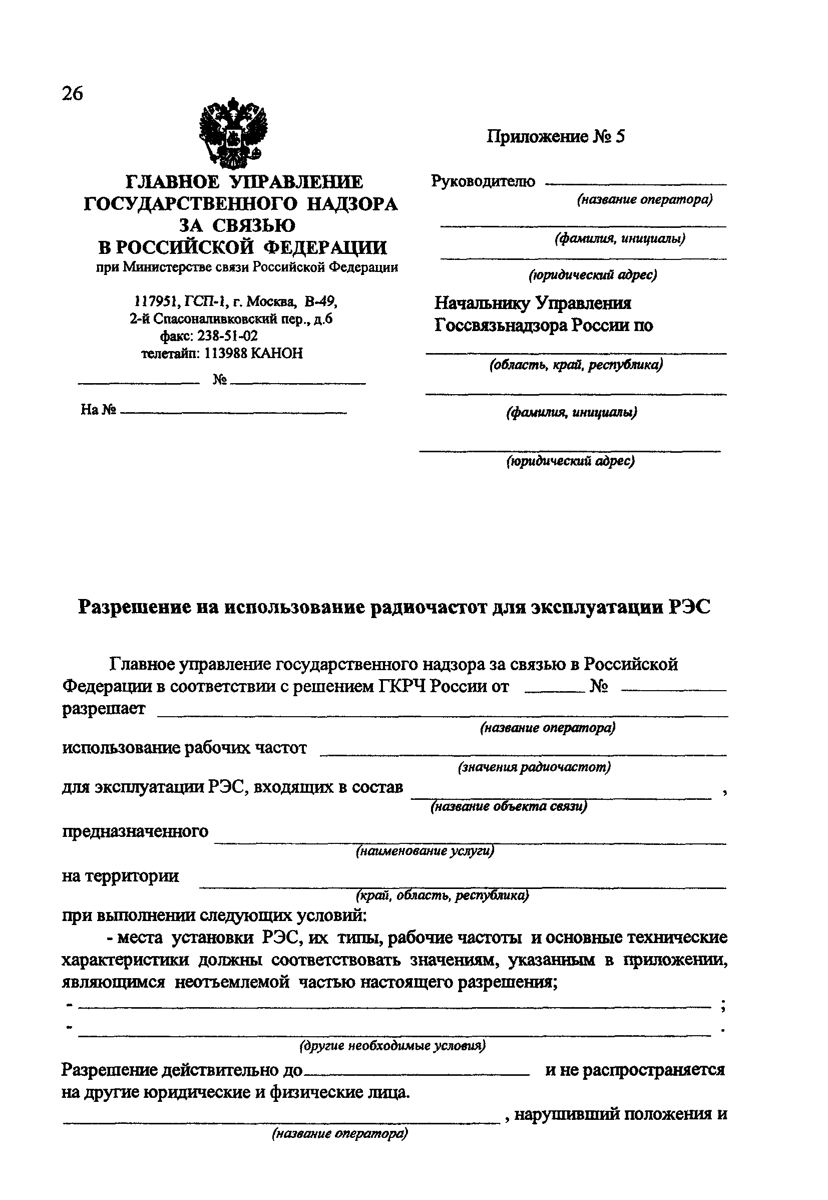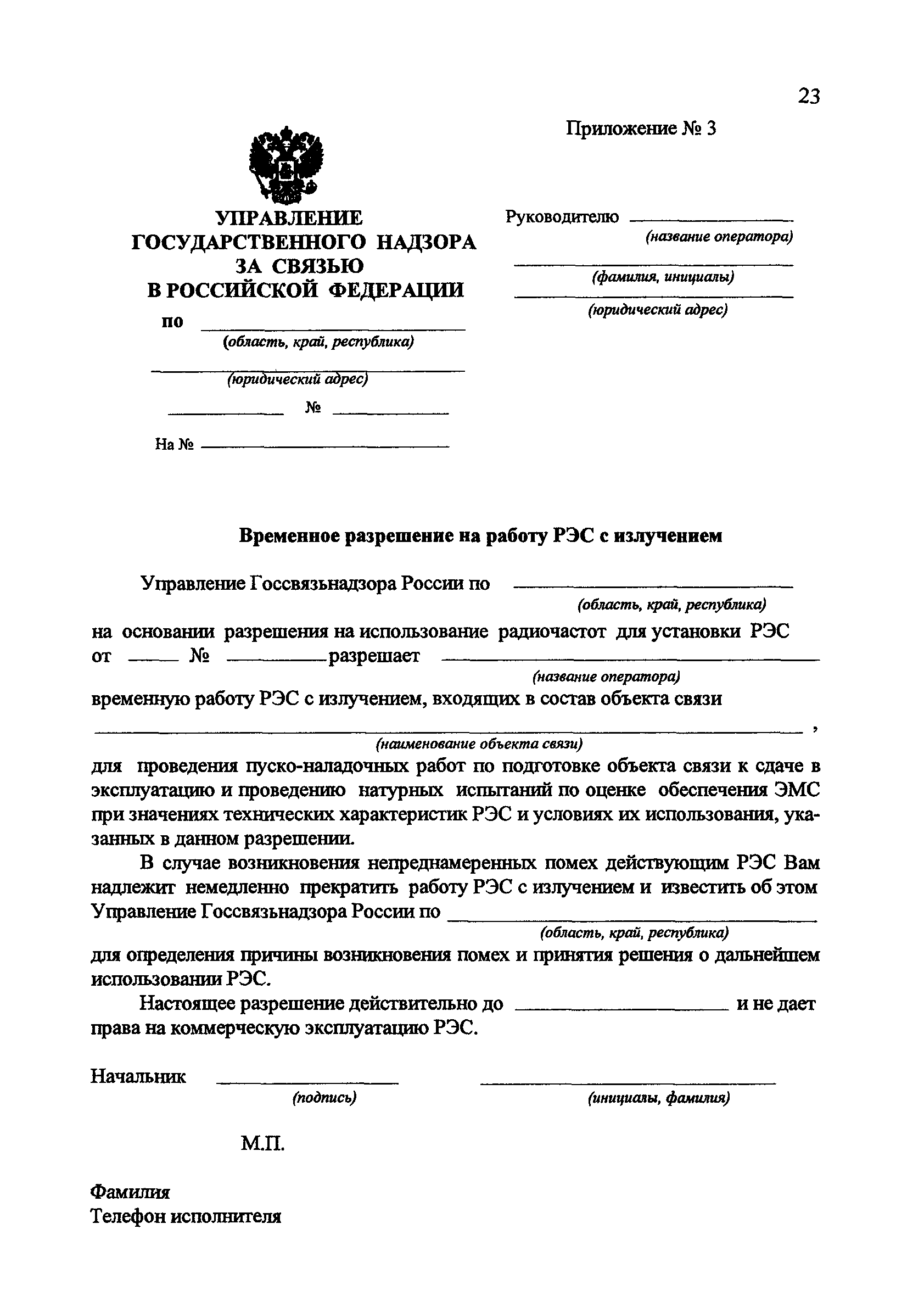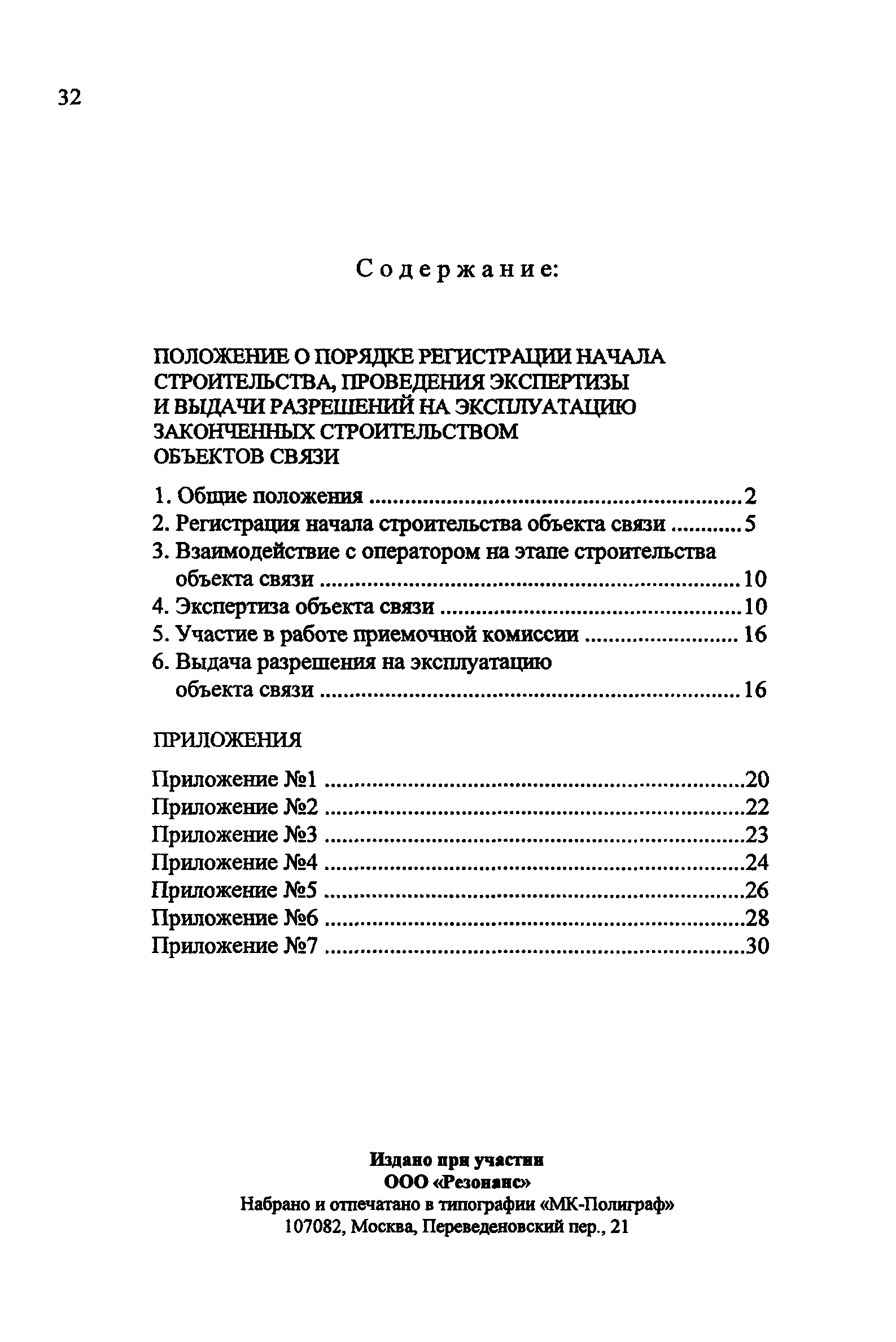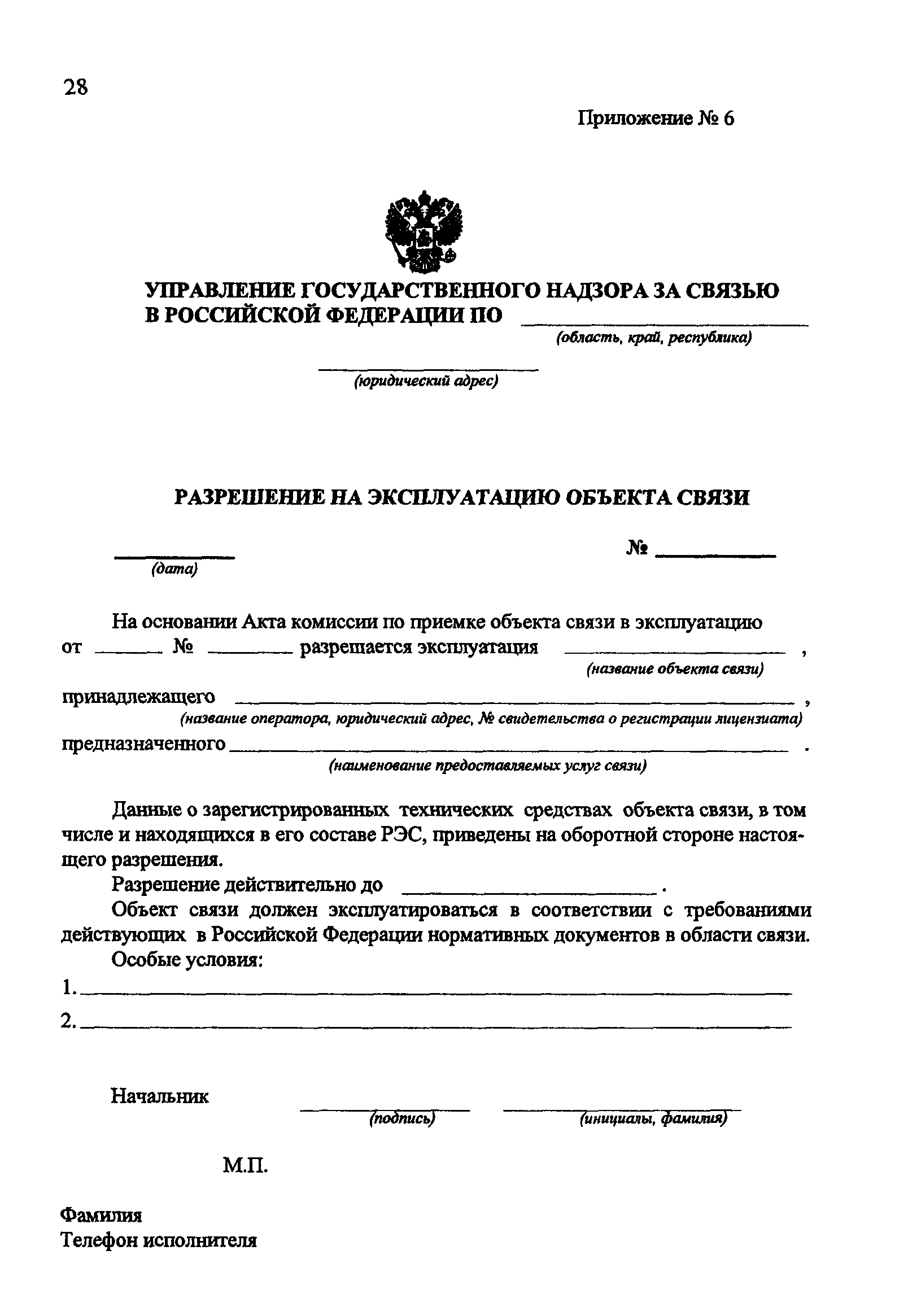 Положение о порядке регистрации начала строительства, проведения экспертизы и выдачи разрешений на эксплуатацию законченных строительством объектов связи| Статус: | действует | | Название рус.: | Положение о порядке регистрации начала строительства, проведения экспертизы и выдачи разрешений на эксплуатацию законченных строительством объектов связи | | Дата добавления в базу: | 01.09.2013 | | Дата актуализации: | 01.01.2021 | | Область применения: | Положение регулирует деятельность органов службы Госсвязьнадзора России по регистрации начала строительства, экспертизе и выдаче разрешений на эксплуатацию объектов связи гражданского применения всех форм собственности (включая новое строительство, реконструкцию, расширение и техническое перевооружение), обеспечивающих лицензируемую деятельность операторов в соответствии с Федеральным законом «О связи». | | Оглавление: | 1 Общие положения 2 Регистрация начала строительства объекта связи 3 Взаимодействие с оператором на этапе строительства объекта связи 4 Экспертиза объекта связи 5 Участие в работе приемочной комиссии 6 Выдача разрешения на эксплуатацию объекта связи Приложение 1 Разрешение на использование радиочастот для установки РЭС Приложение 2 Свидетельство о регистрации начала строительства объекта связи Приложение 3 Временное разрешение на работу РЭС с излучением Приложение 4 Заключение о результатах экспертизы № Приложение 5 Разрешение на использование радиочастот для эксплуатации РЭС Приложение 6 Разрешение на эксплуатацию объекта связи Приложение 7 Разрешение на эксплуатацию радиоэлектронного средства | | Утверждён: | 15.12.1997 Главгоссвязьнадзор России (61)