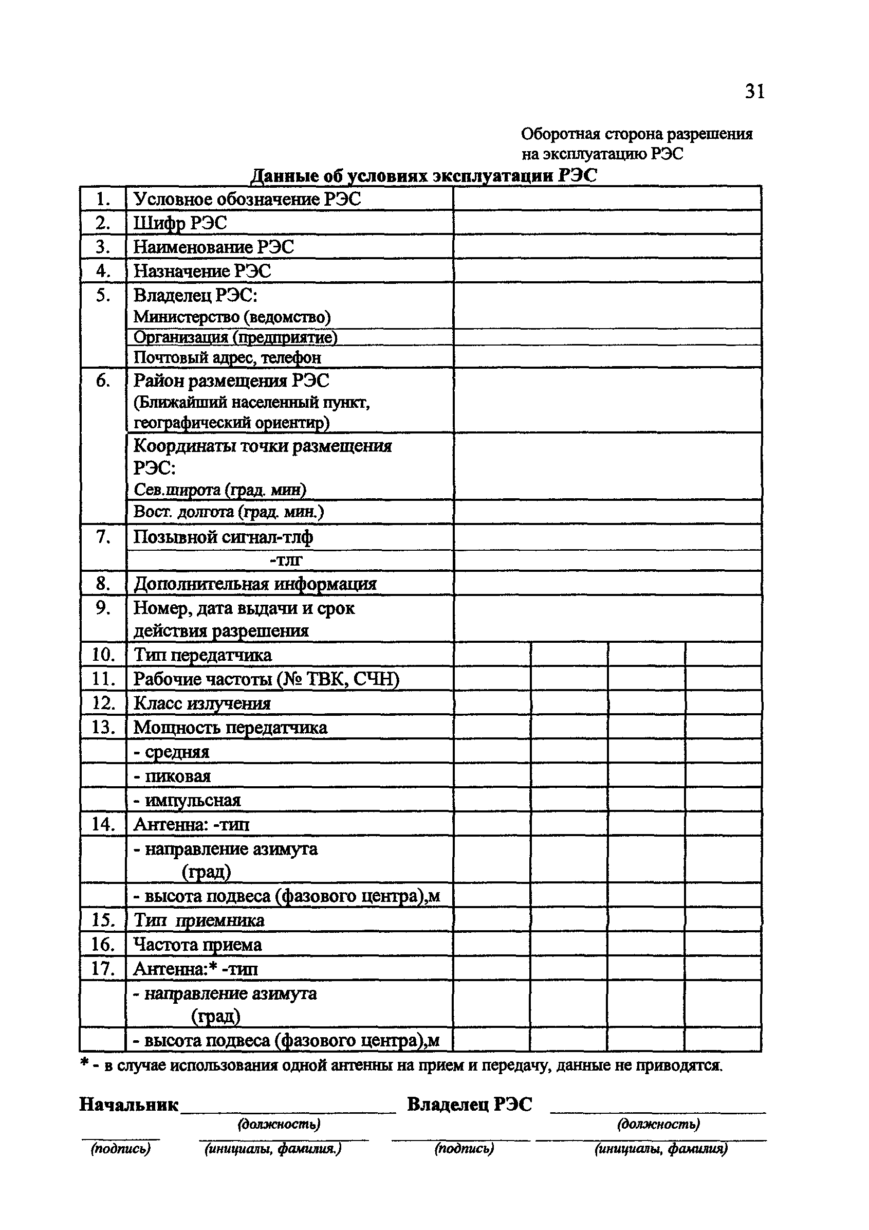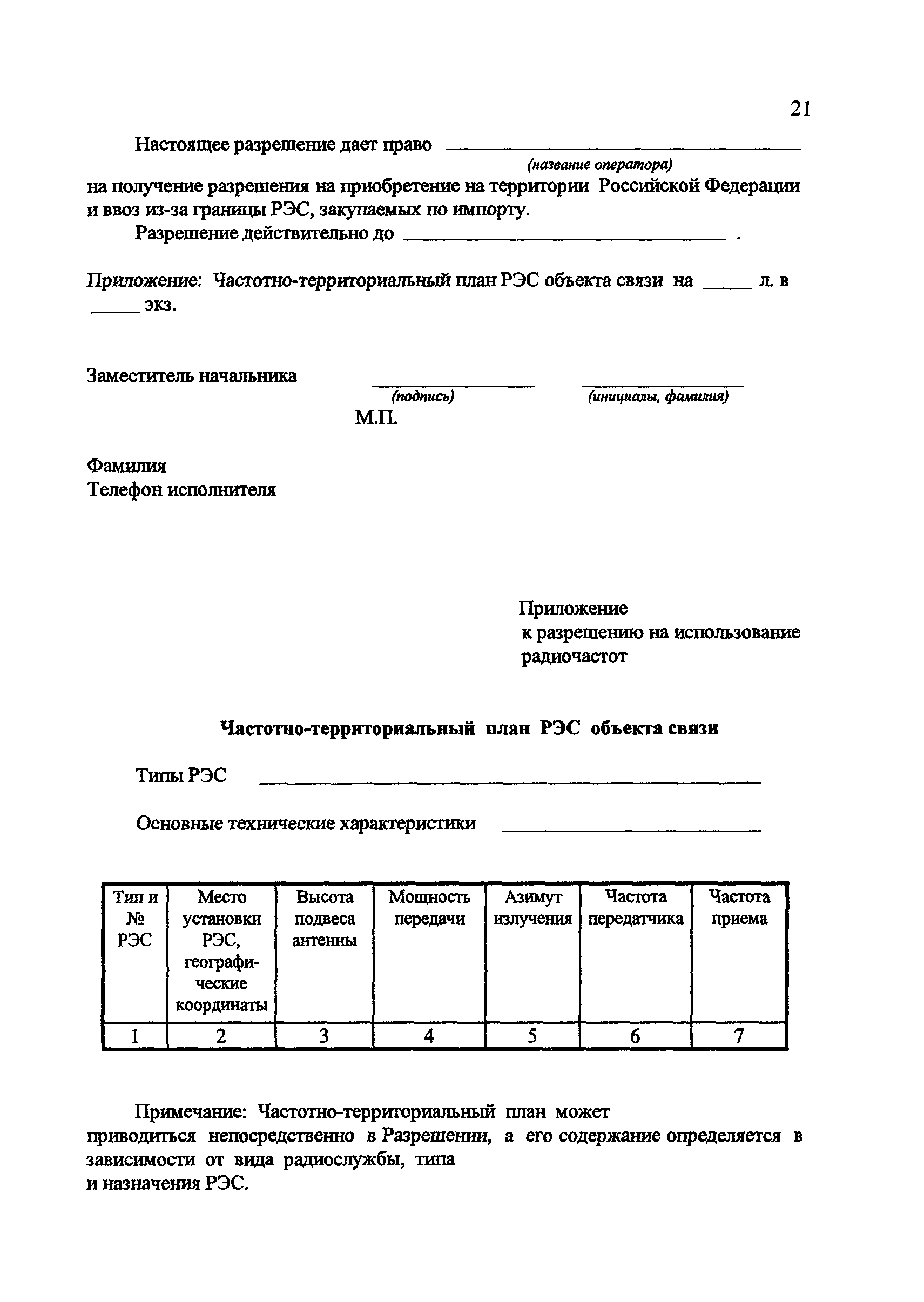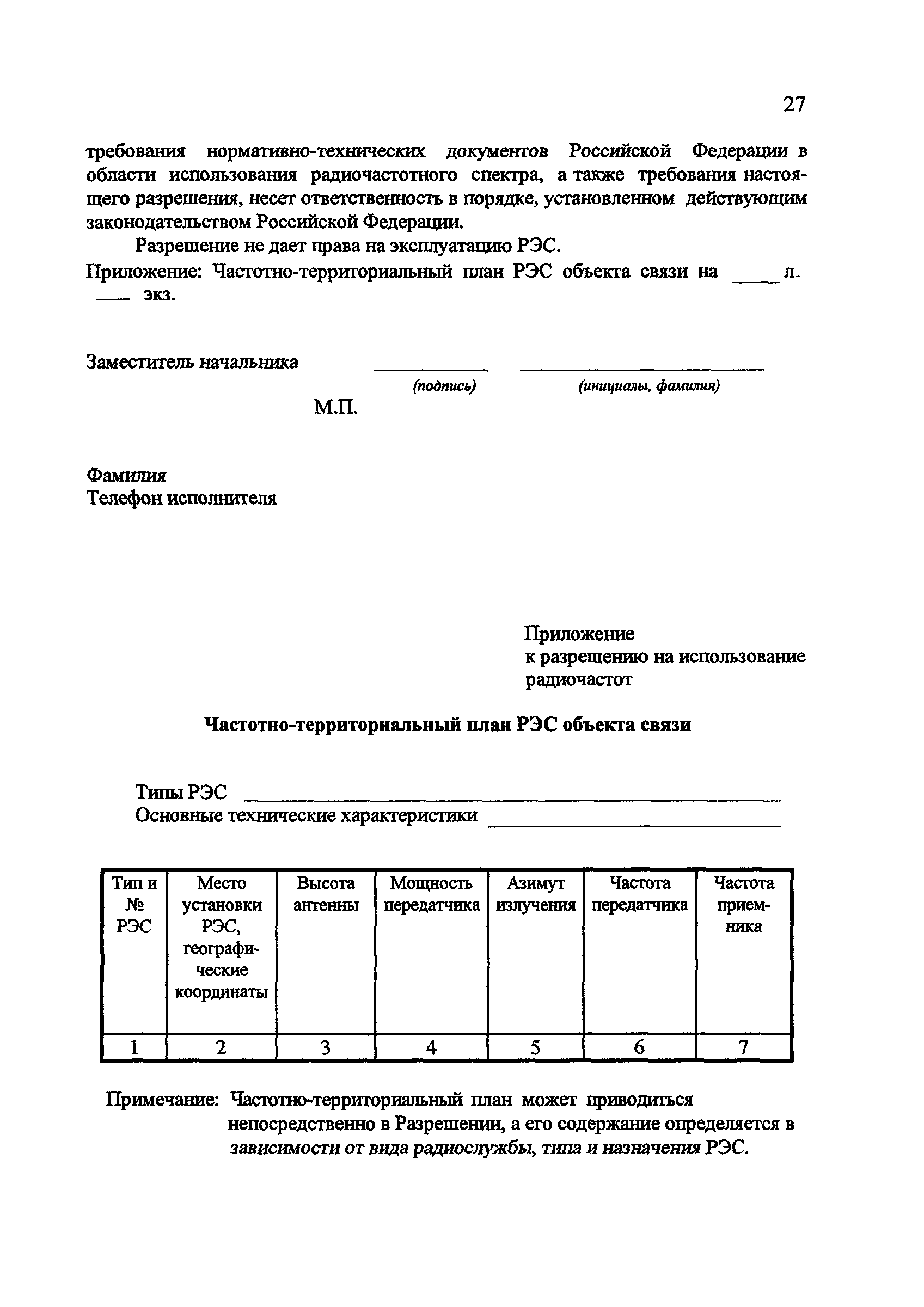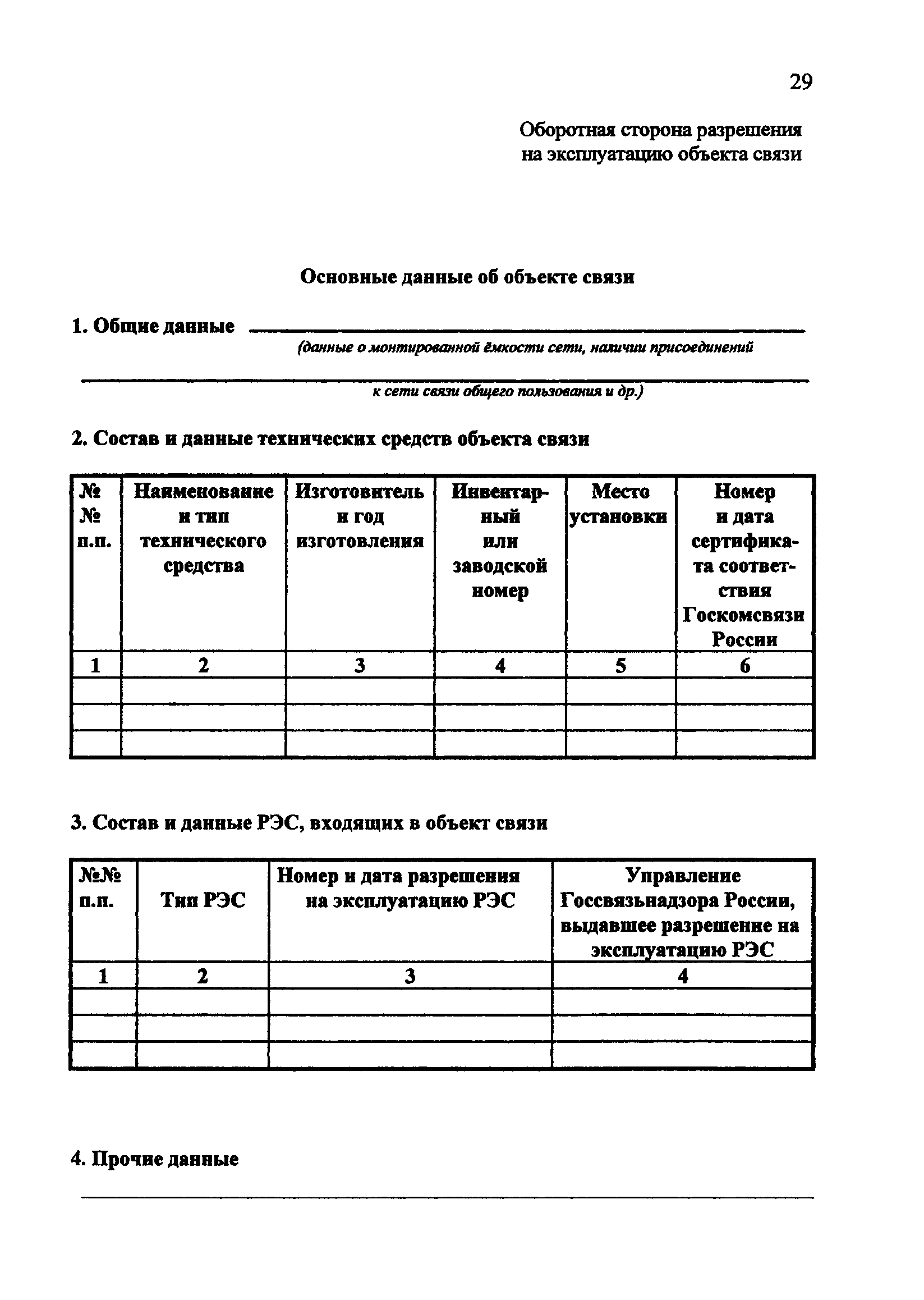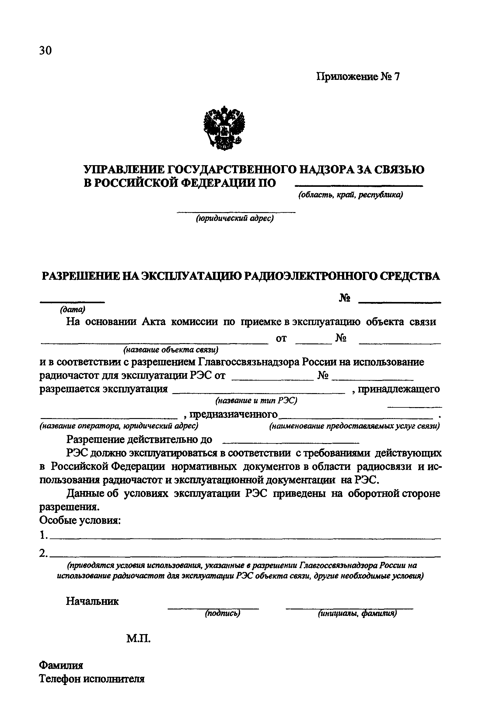Положение о порядке регистрации начала строительства, проведения экспертизы и выдачи разрешений на эксплуатацию законченных строительством объектов связи| Статус: | действует | | Название рус.: | Положение о порядке регистрации начала строительства, проведения экспертизы и выдачи разрешений на эксплуатацию законченных строительством объектов связи | | Дата добавления в базу: | 01.09.2013 | | Дата актуализации: | 01.01.2021 | | Область применения: | Положение регулирует деятельность органов службы Госсвязьнадзора России по регистрации начала строительства, экспертизе и выдаче разрешений на эксплуатацию объектов связи гражданского применения всех форм собственности (включая новое строительство, реконструкцию, расширение и техническое перевооружение), обеспечивающих лицензируемую деятельность операторов в соответствии с Федеральным законом «О связи». | | Оглавление: | 1 Общие положения 2 Регистрация начала строительства объекта связи 3 Взаимодействие с оператором на этапе строительства объекта связи 4 Экспертиза объекта связи 5 Участие в работе приемочной комиссии 6 Выдача разрешения на эксплуатацию объекта связи Приложение 1 Разрешение на использование радиочастот для установки РЭС Приложение 2 Свидетельство о регистрации начала строительства объекта связи Приложение 3 Временное разрешение на работу РЭС с излучением Приложение 4 Заключение о результатах экспертизы № Приложение 5 Разрешение на использование радиочастот для эксплуатации РЭС Приложение 6 Разрешение на эксплуатацию объекта связи Приложение 7 Разрешение на эксплуатацию радиоэлектронного средства | | Утверждён: | 15.12.1997 Главгоссвязьнадзор России (61)