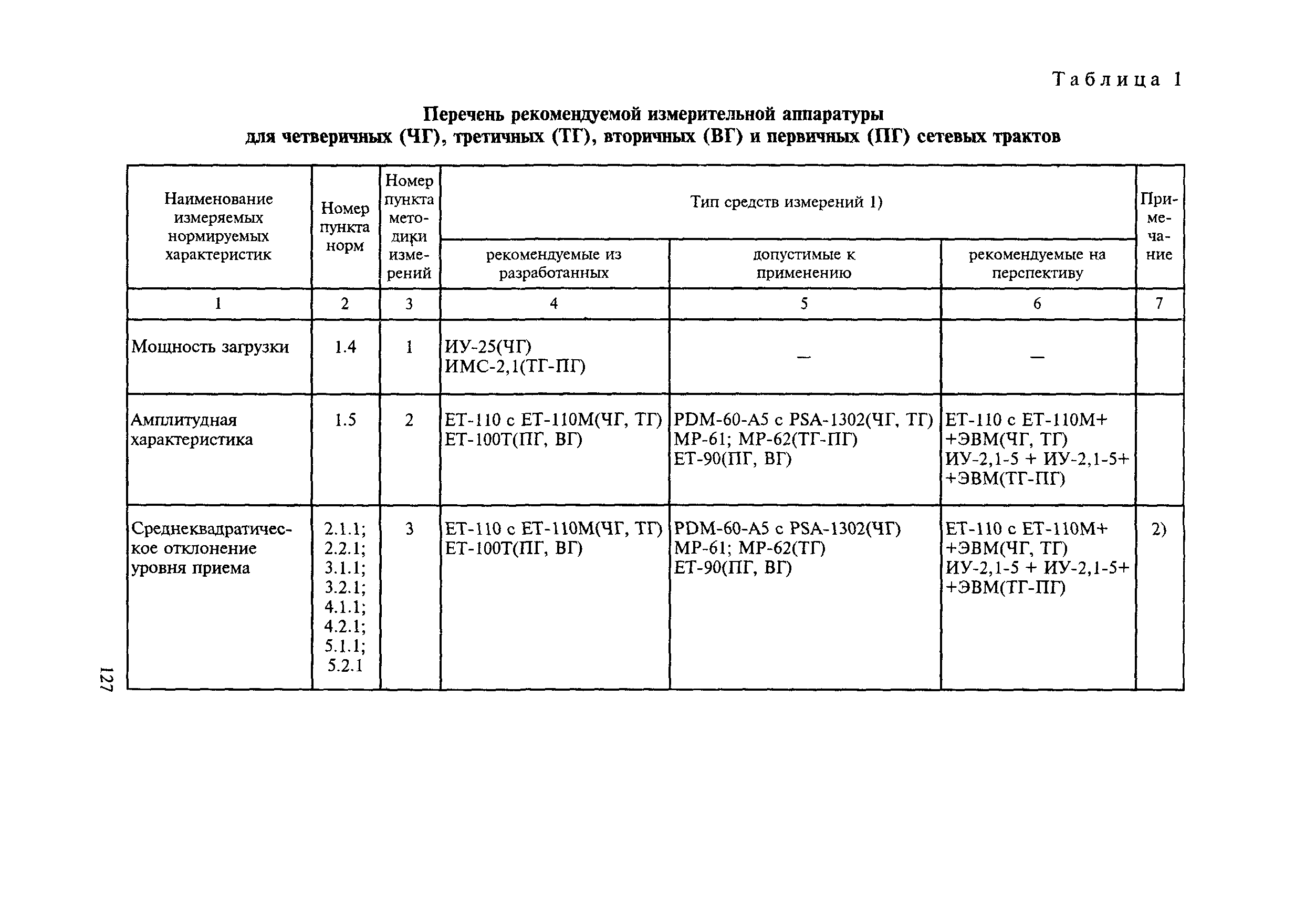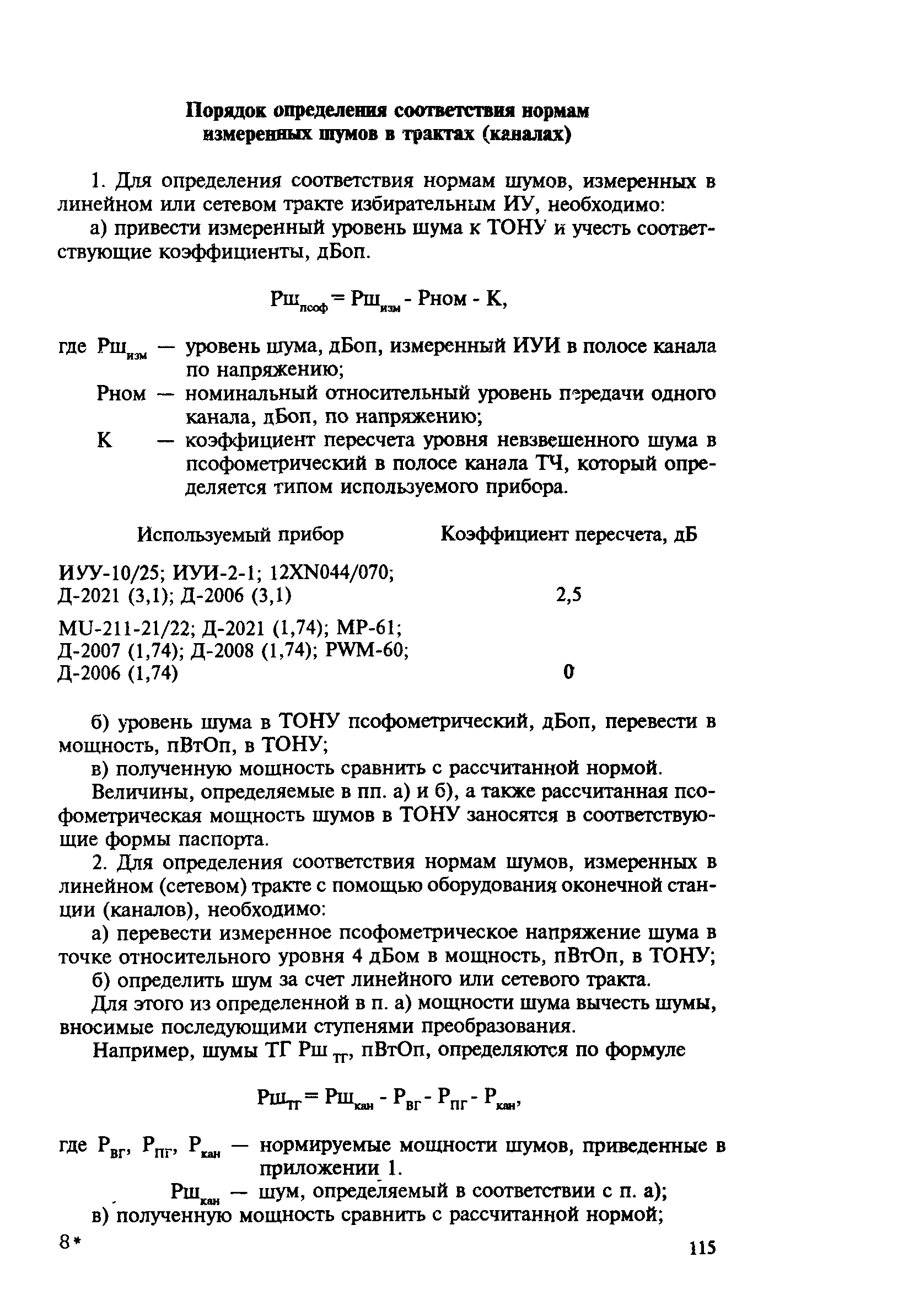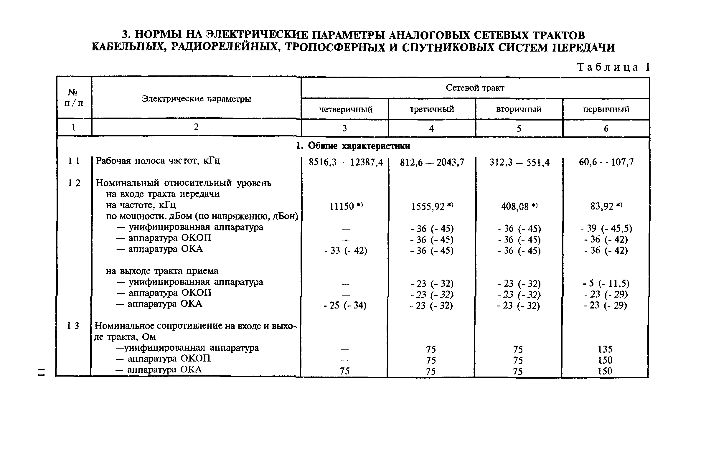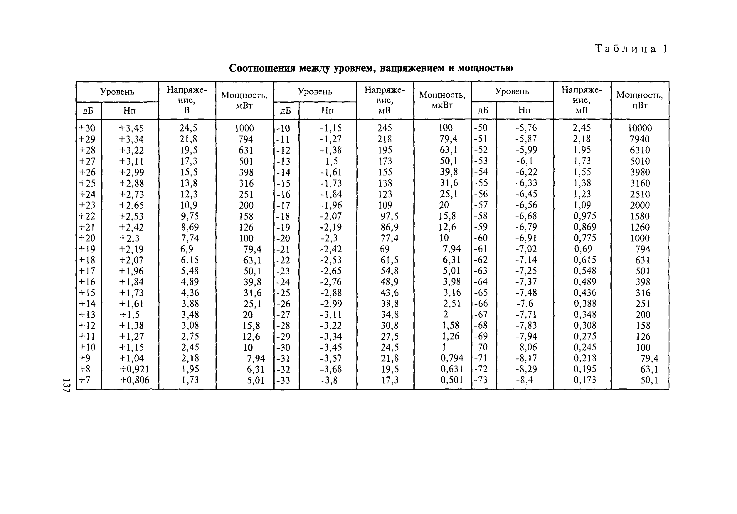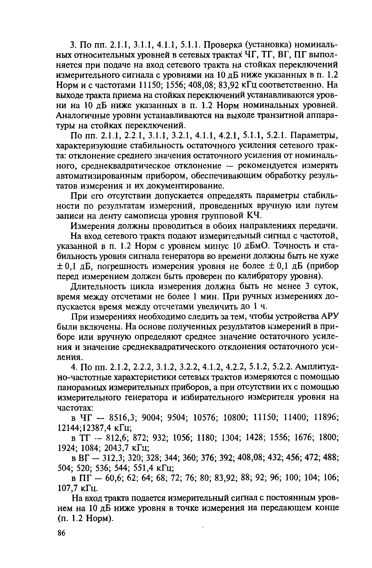 | Оглавление: | 1 Термины и определения 2 Общие указания 3 Нормы на электрические параметры аналоговых сетевых трактов кабельных, радиорелейных, тропосферных и спутниковых систем передачи 4 Методики измерения параме6тров сетевых трактов ЧГ, ТГ, ВГ и ПГ Приложение 1 Среднеминутное значение псофометрической мощности шума линейных трактов различных кабельных и воздушных систем передачи в полосе канала ТЧ Приложение 2 Порядок определения соответствия нормам измеренных шумов в трактах (каналах) Приложение 3 Расчет защищенности между трактами (при сложении уровней) Приложение 4 Перечень ожидаемых частот селективных помех на выходе тракта приема в преобразовательном оборудовании оконечных станций ОКОП и в унифицированной аппаратуре Приложение 5 Перечень рекомендуемой измерительной аппаратуры для четверичных (ЧГ), третичных (ТГ), вторичных (ВГ) и первичных (ПГ) сетевых трактов Приложение 6 Соотношения между уровнем, напряжением и мощностью |